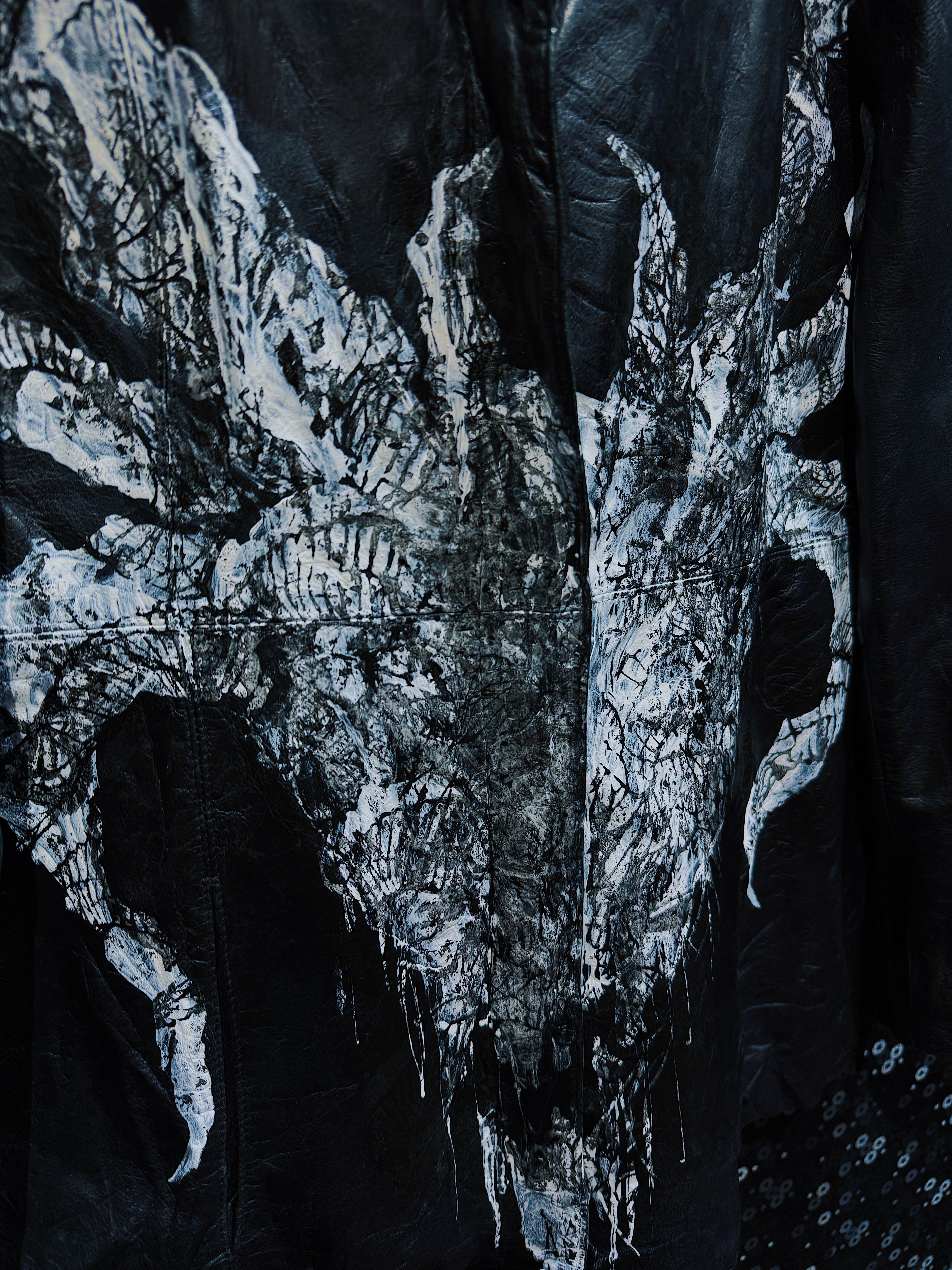 使用されているゴートレザーは、柔らかさと軽さを持ちながらも、深く刻まれたシワと鈍い光沢が特徴。その表情を活かすように、白を基調とした有機的なペイントが中央から放射状に広がり、まるで化石化した植物や遺骸、時間の堆積を写し取ったかのようなビジュアルを形成している。筆致は荒々しさを内包しつつも制御されており、偶発性と構築性が高い次元で共存。