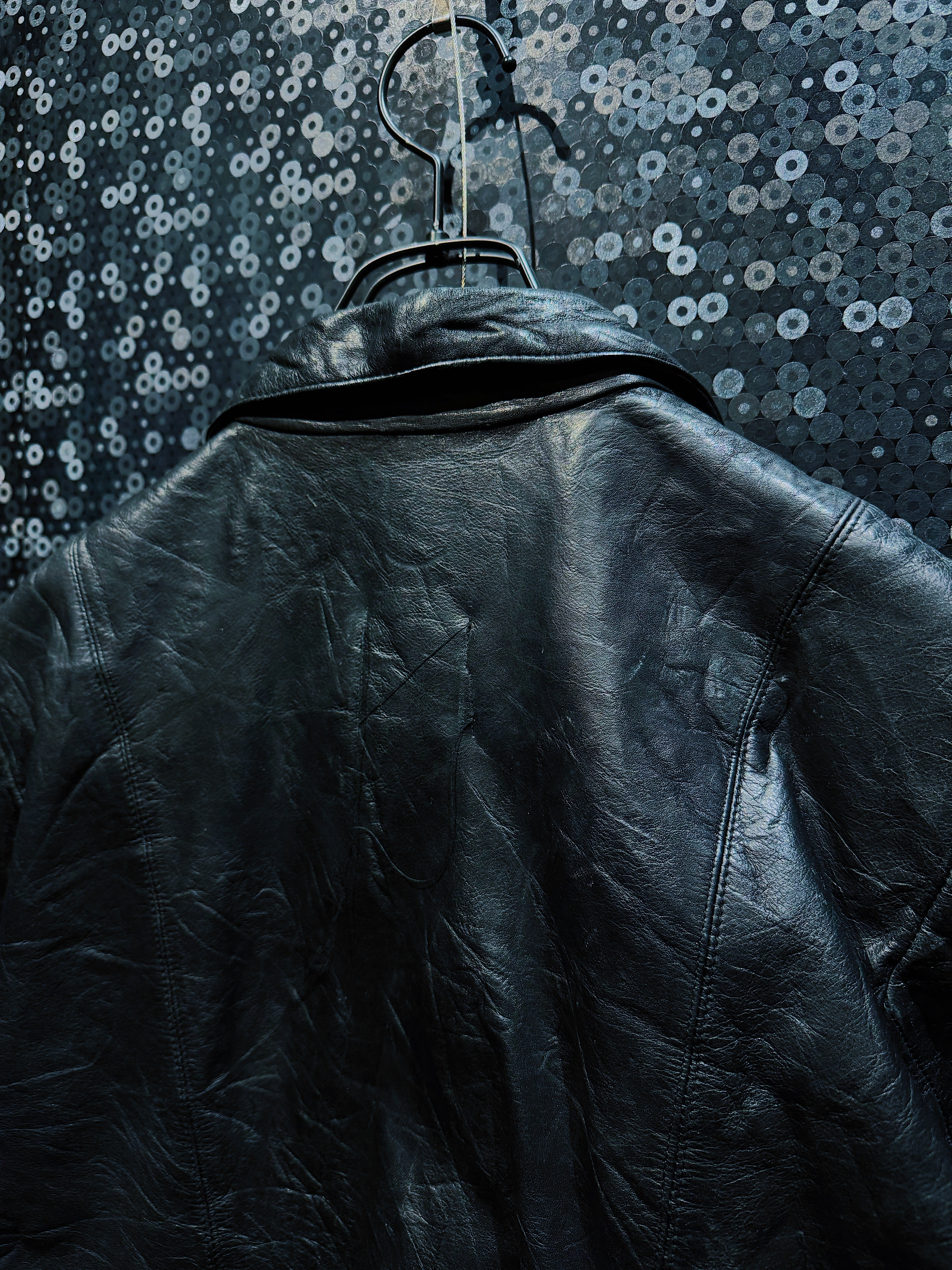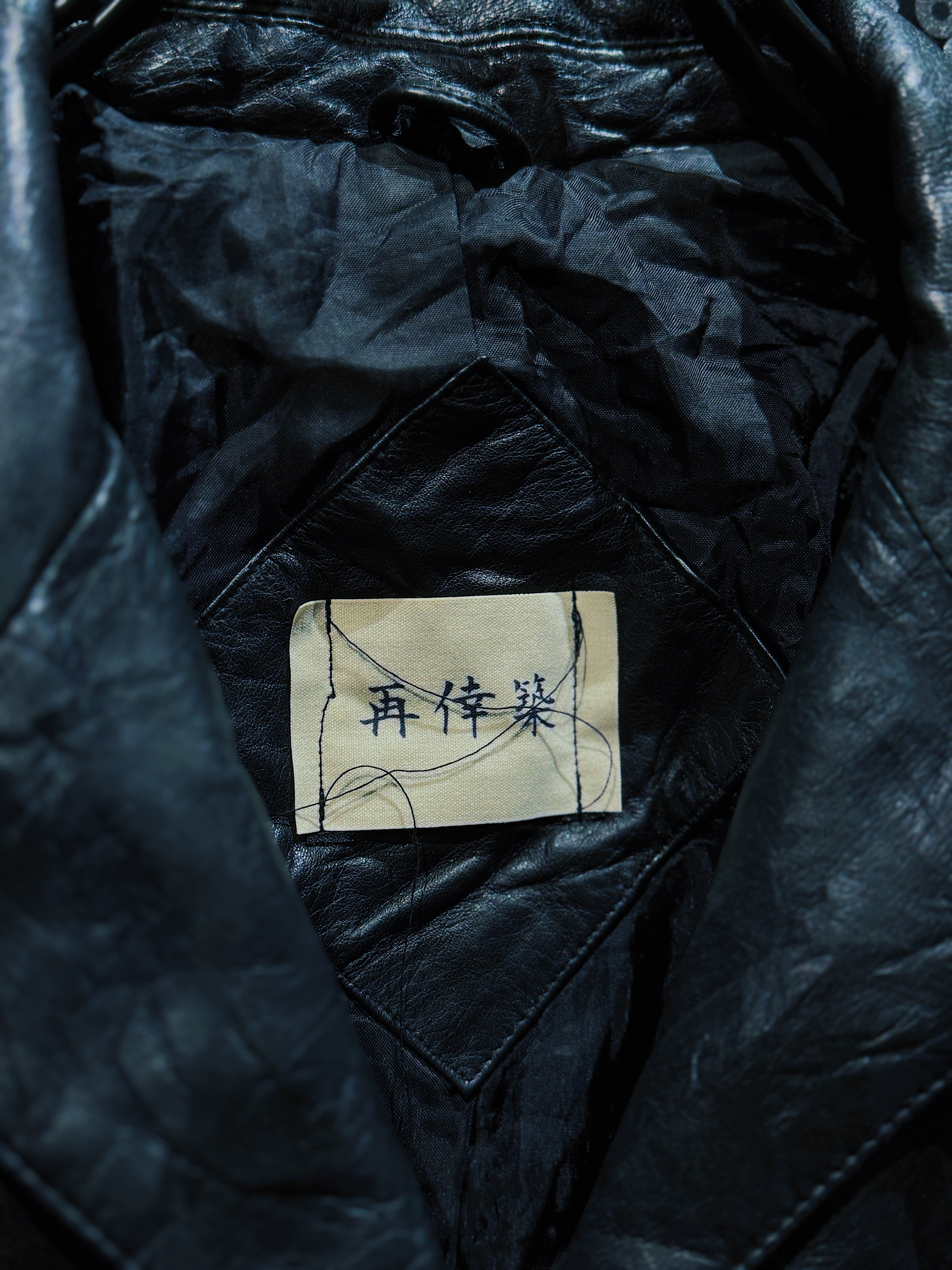 ジップを軸に左右でわずかに異なる流れを持たせることで、着用時の動きによって表情が変化。アートとしての完成度を保ちながら、レザージャケットとしての実用性と存在感も失っていない。主張は強いが騒がしくない、静かに圧を放つ再倖築レザーの到達点とも言える一着。