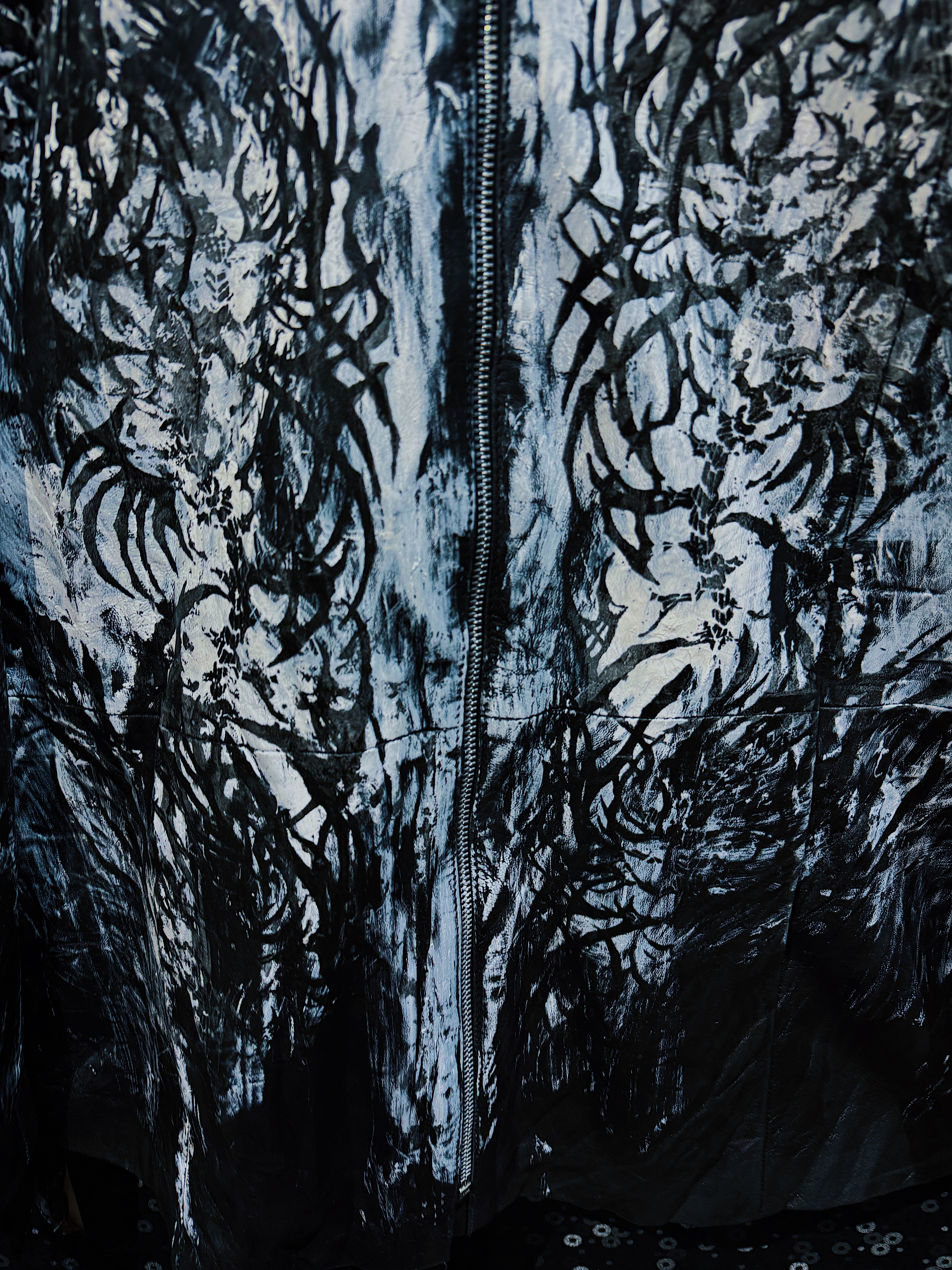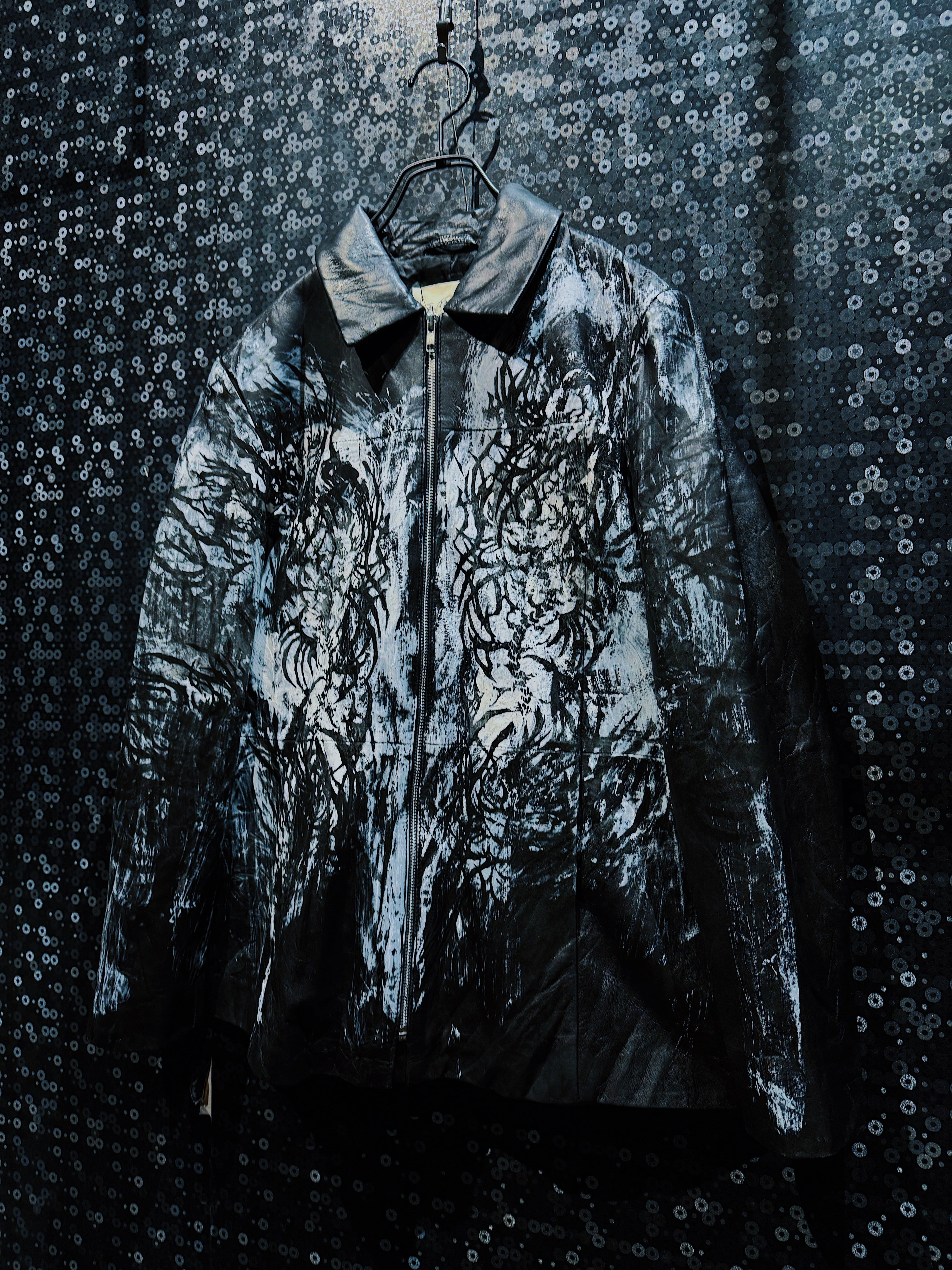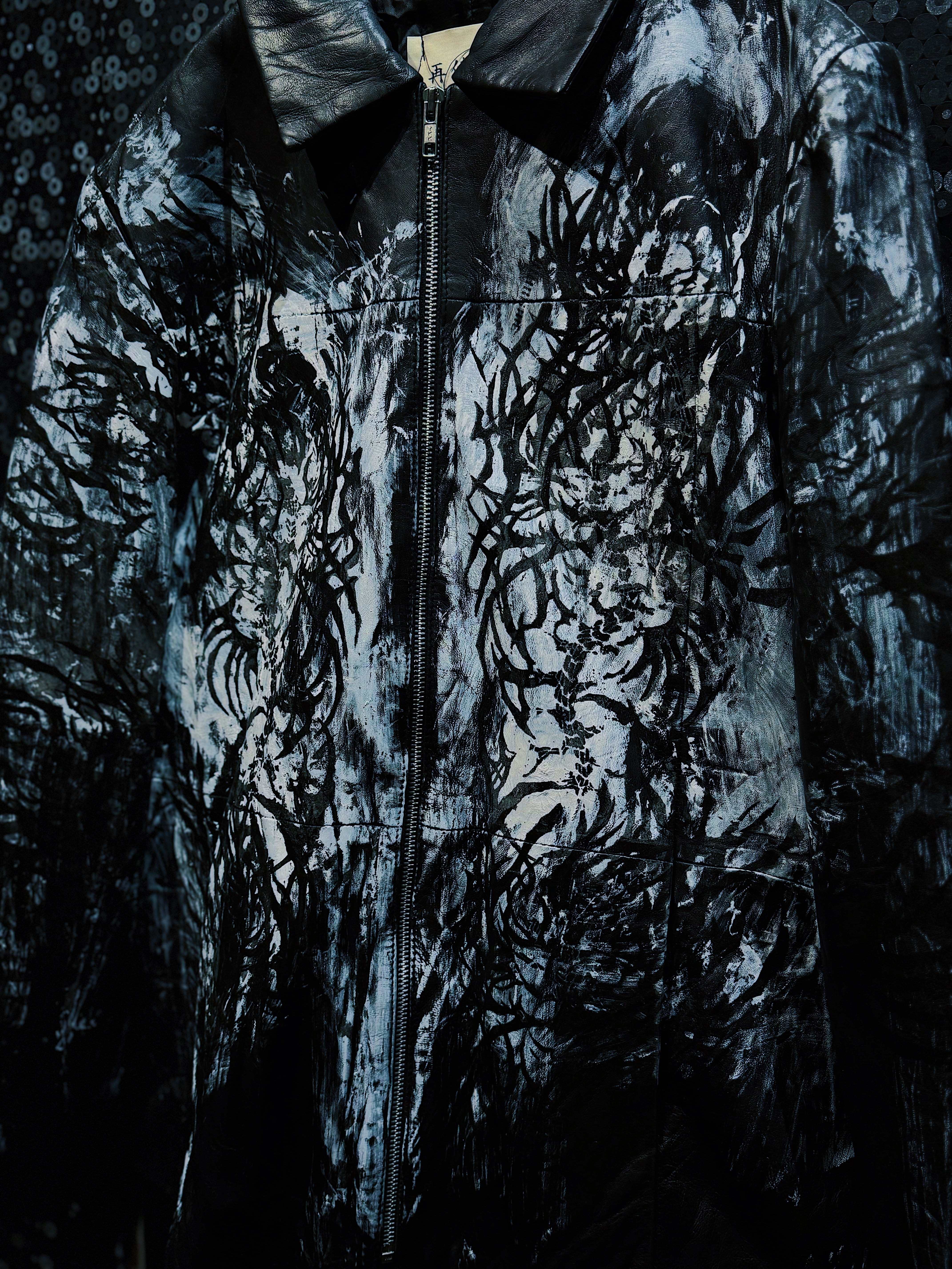 再倖築のレザーをベースに、フロント全体へ再倖築ペイントデザイナー 西澤光太郎 氏によるハンドペイントを施した一点物のレザージャケット。先ほどのアグレッシブなストロークとは対照的に、本作では黒と白を基調とした静謐で有機的な筆致が全面に広がり、まるで樹木や根、あるいは霧の中に溶け込む森の輪郭を思わせる表情を描き出している。