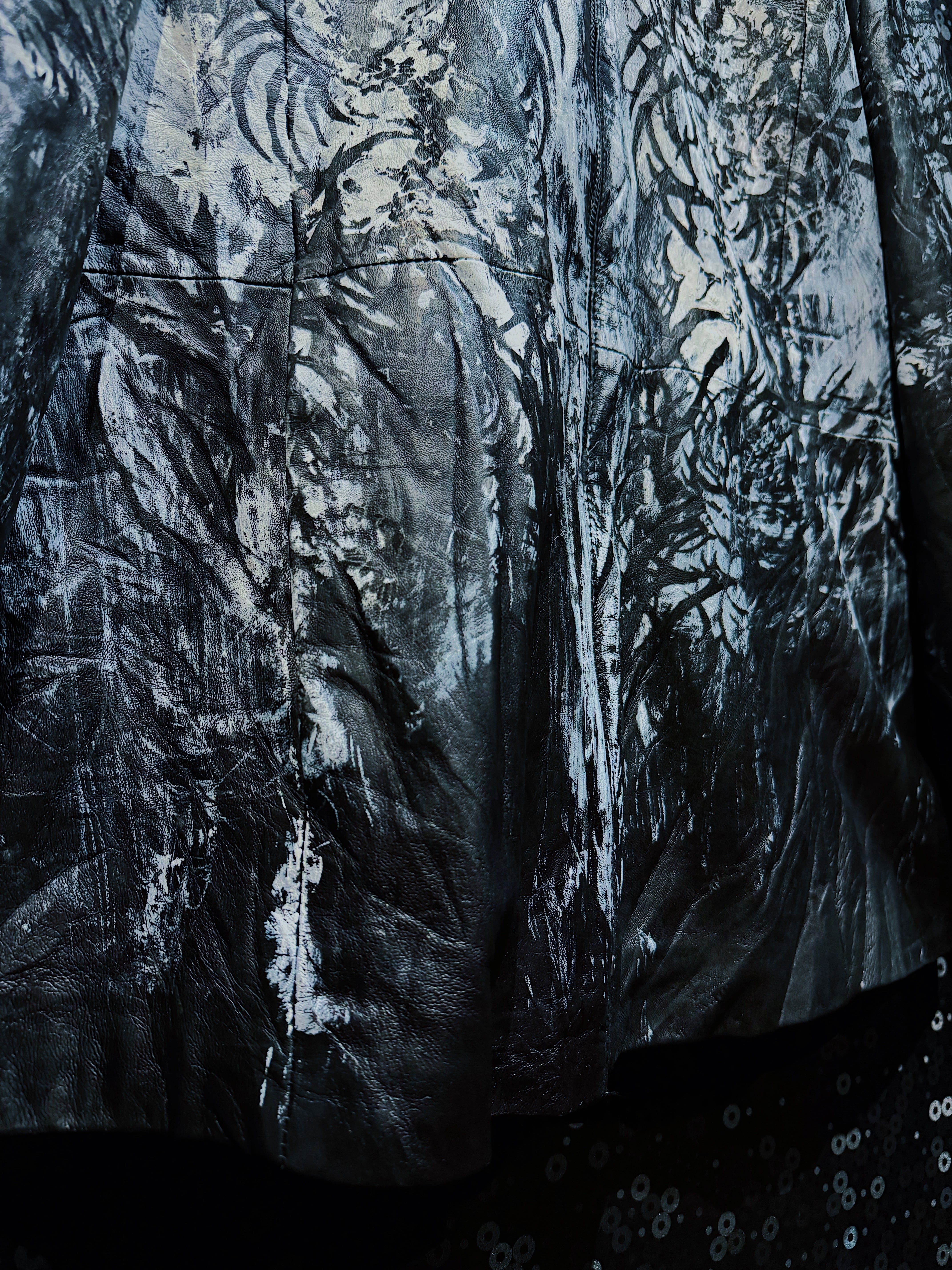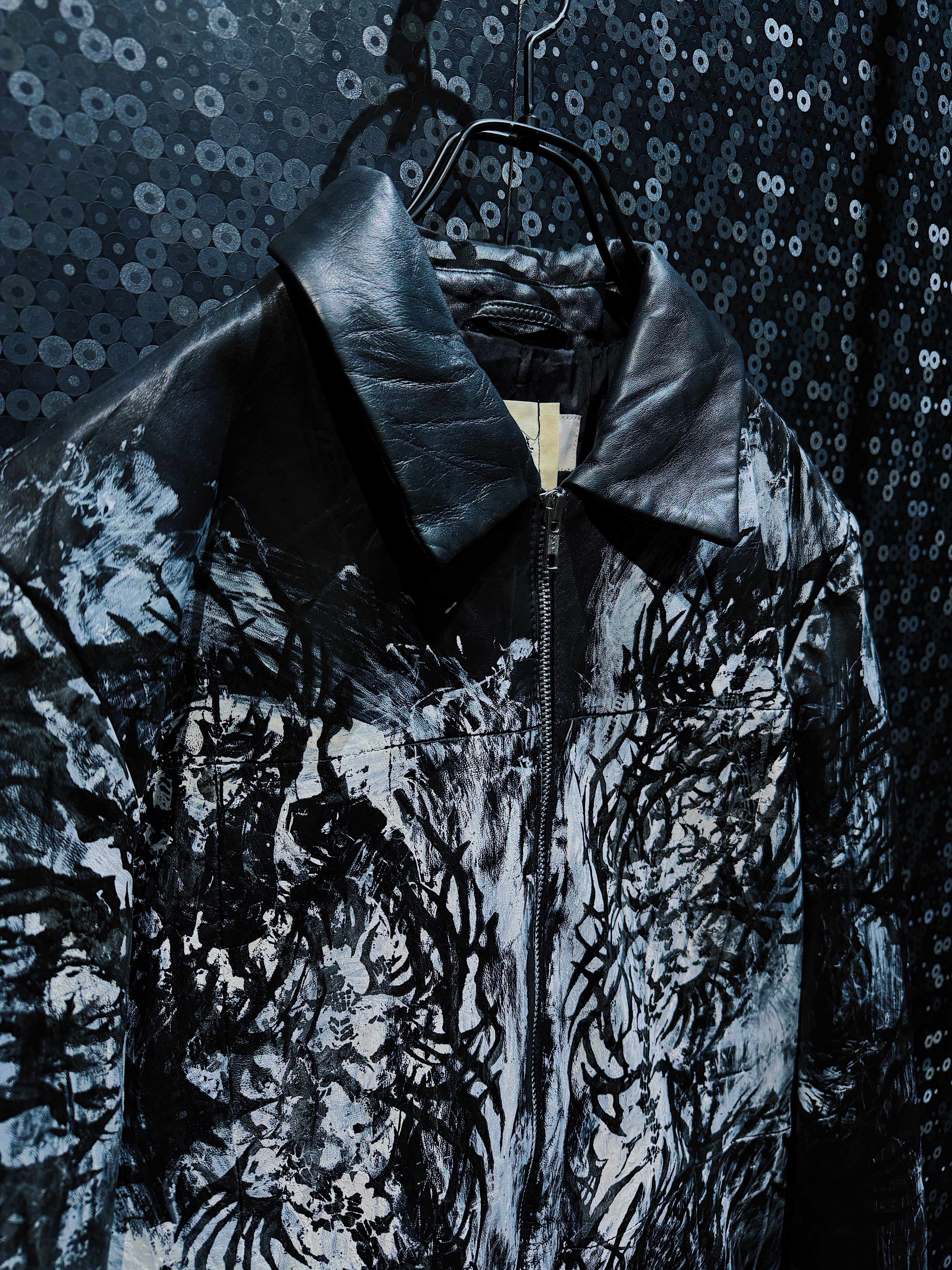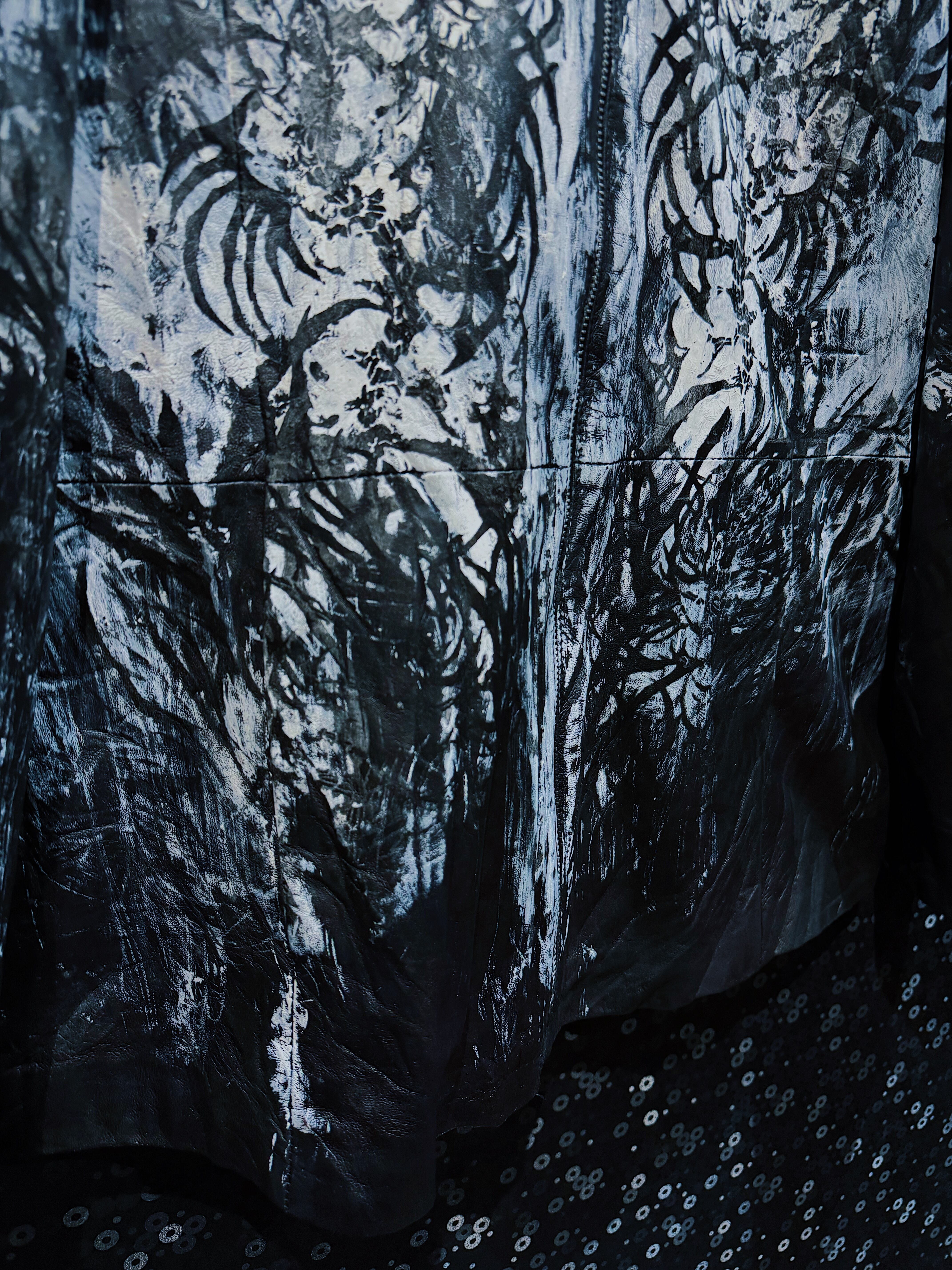 再倖築のレザーをベースに、フロント全体へ再倖築ペイントデザイナー 西澤光太郎 氏によるハンドペイントを施した一点物のレザージャケット。先ほどのアグレッシブなストロークとは対照的に、本作では黒と白を基調とした静謐で有機的な筆致が全面に広がり、まるで樹木や根、あるいは霧の中に溶け込む森の輪郭を思わせる表情を描き出している。