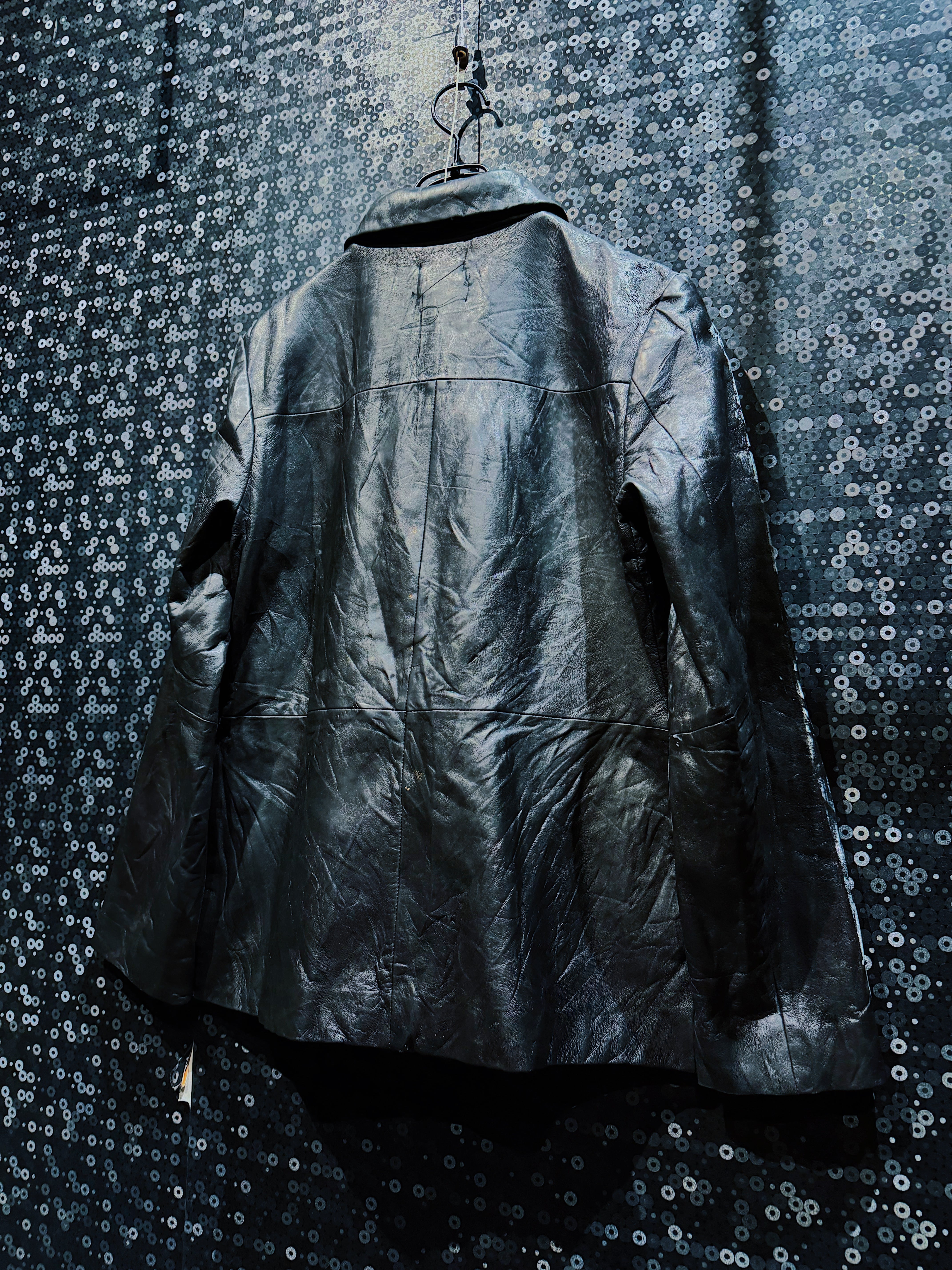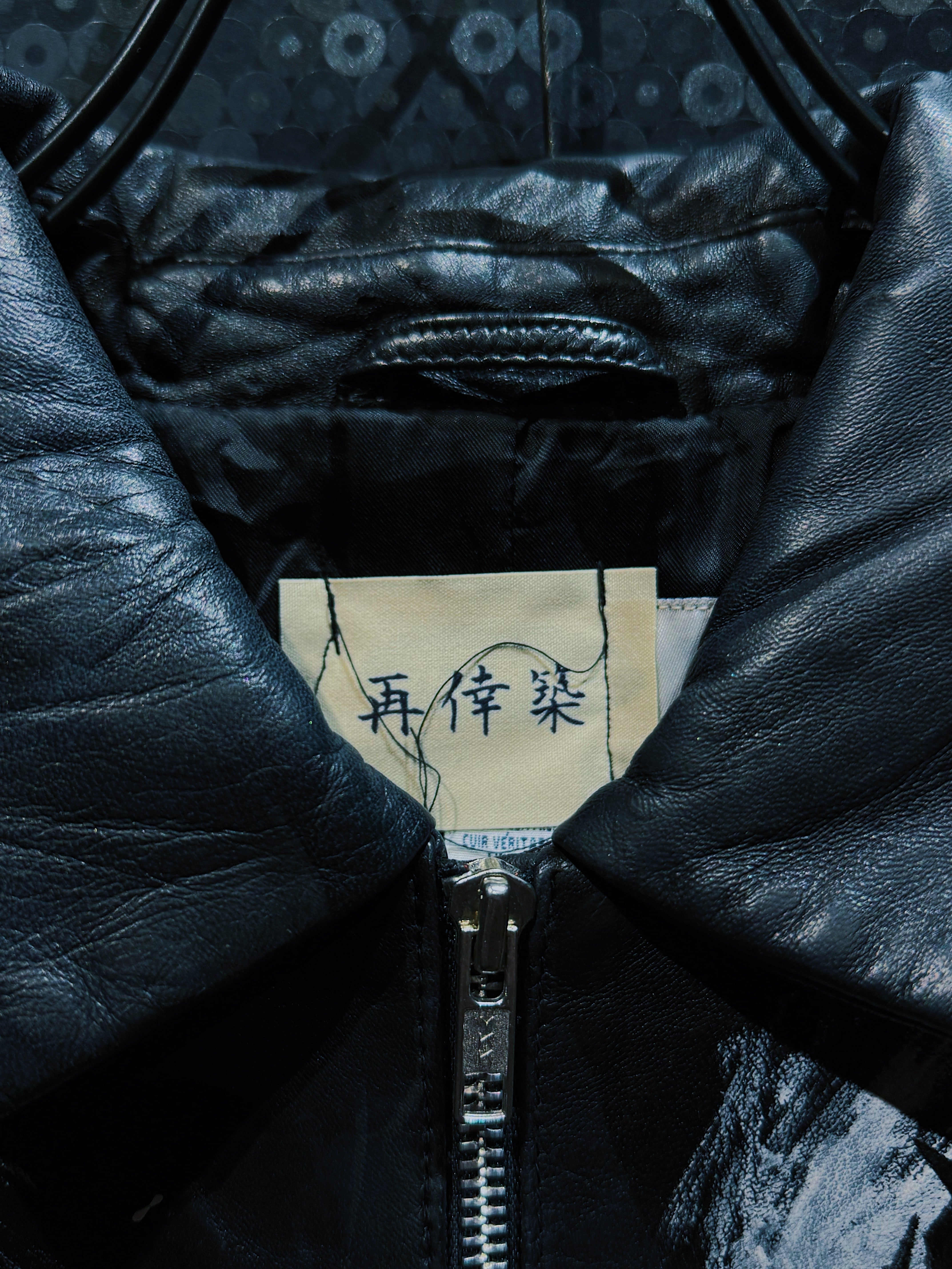 アートピースでありながら主張しすぎず、レザーアウターとしての重厚感と静かな緊張感を内包した一着。視線を奪うのではなく、じわりと惹き込むタイプの再倖築レザーであり、日常と表現の境界を曖昧に溶かす存在となっている。