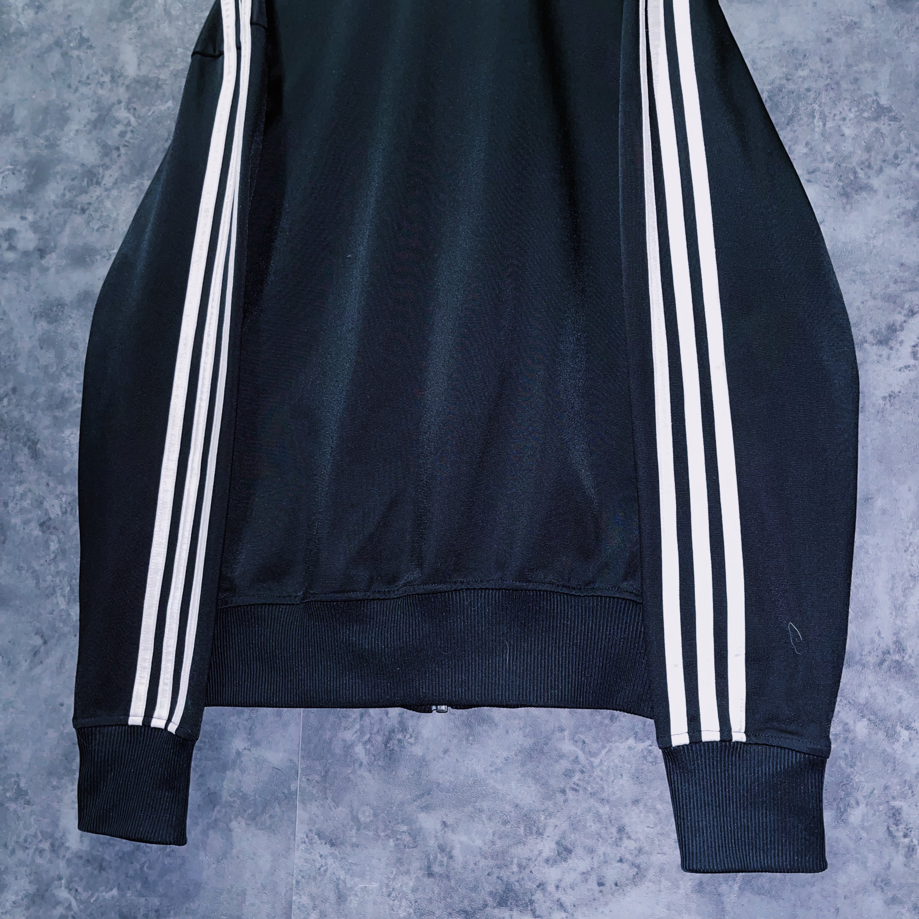 光沢あるブラックカラーの生地に、ホワイトカラーでスリーストライプとホワイトトレフォイルロゴを施した一枚。
