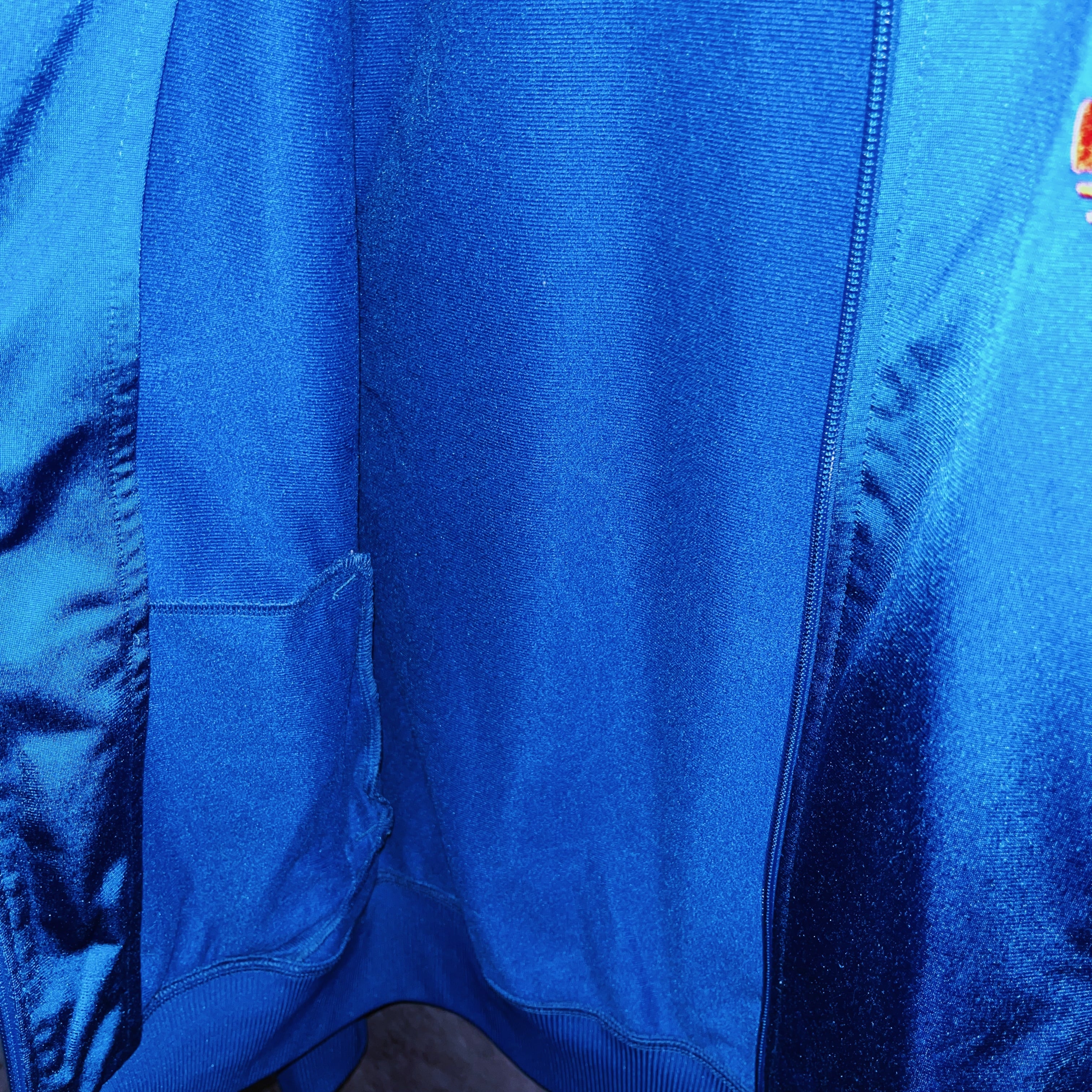 鮮やかなコバルトブルーカラーの生地に、スカーレットカラーでスリーストライプとトレフォイルロゴを施した一枚。