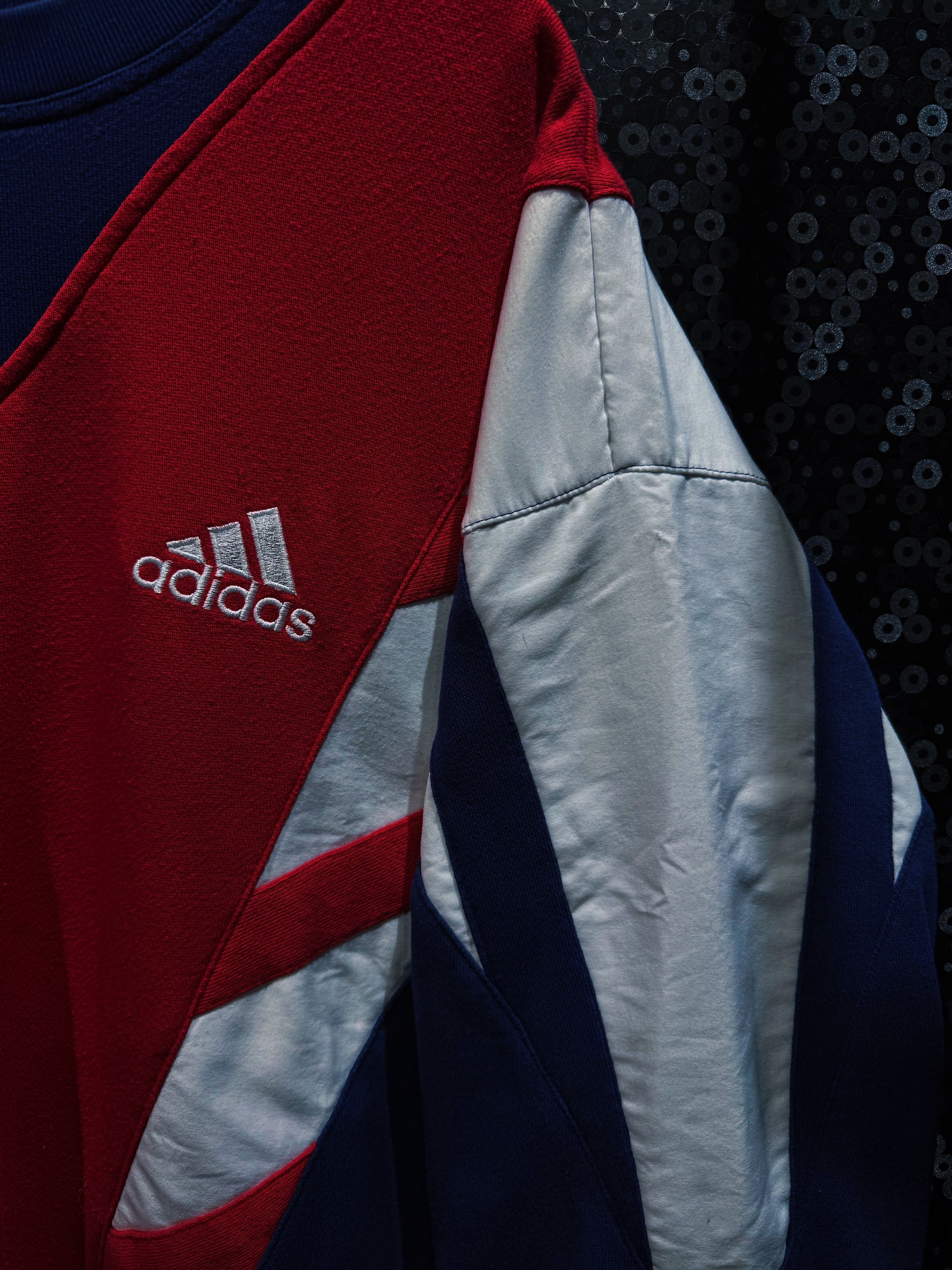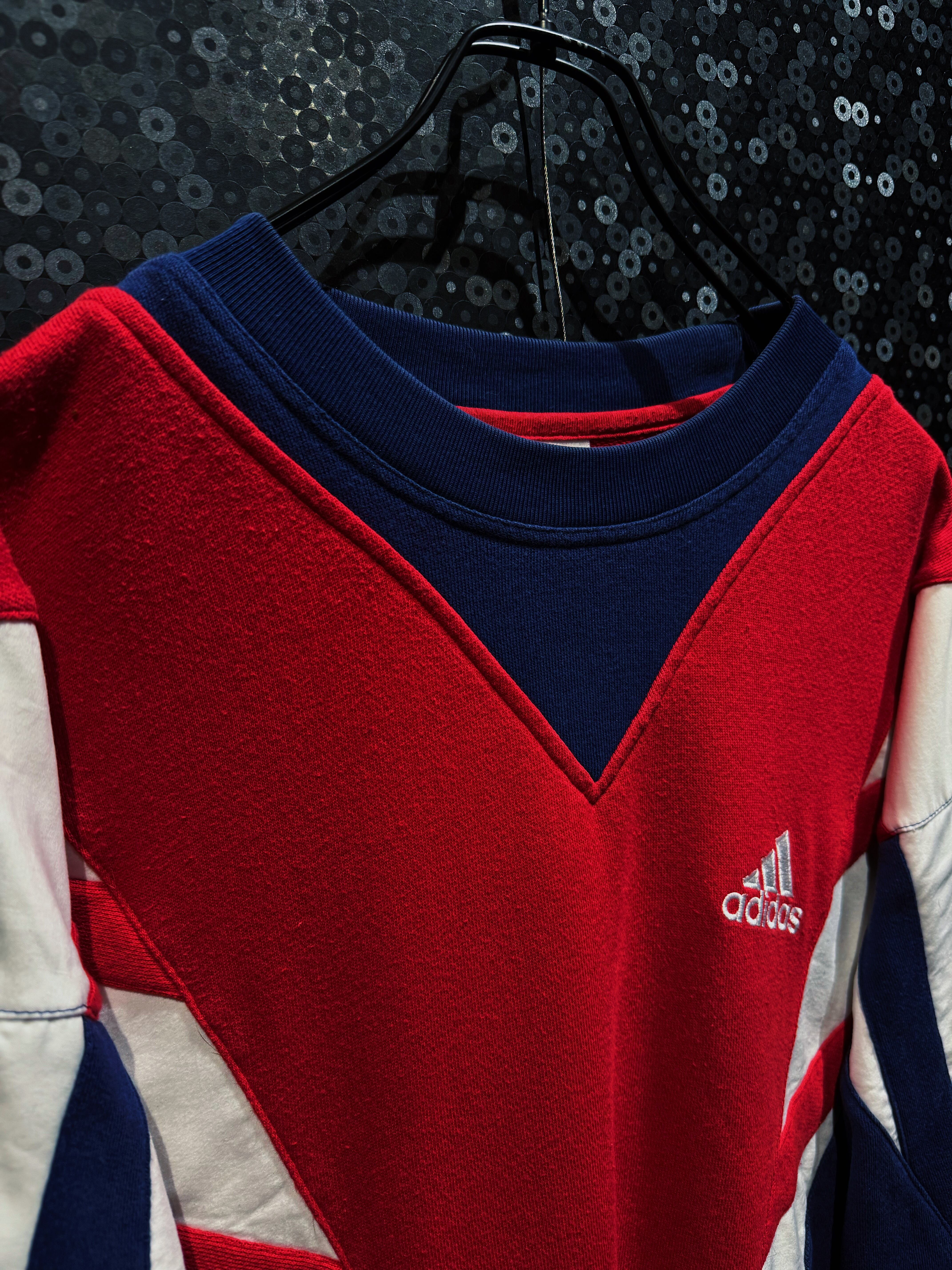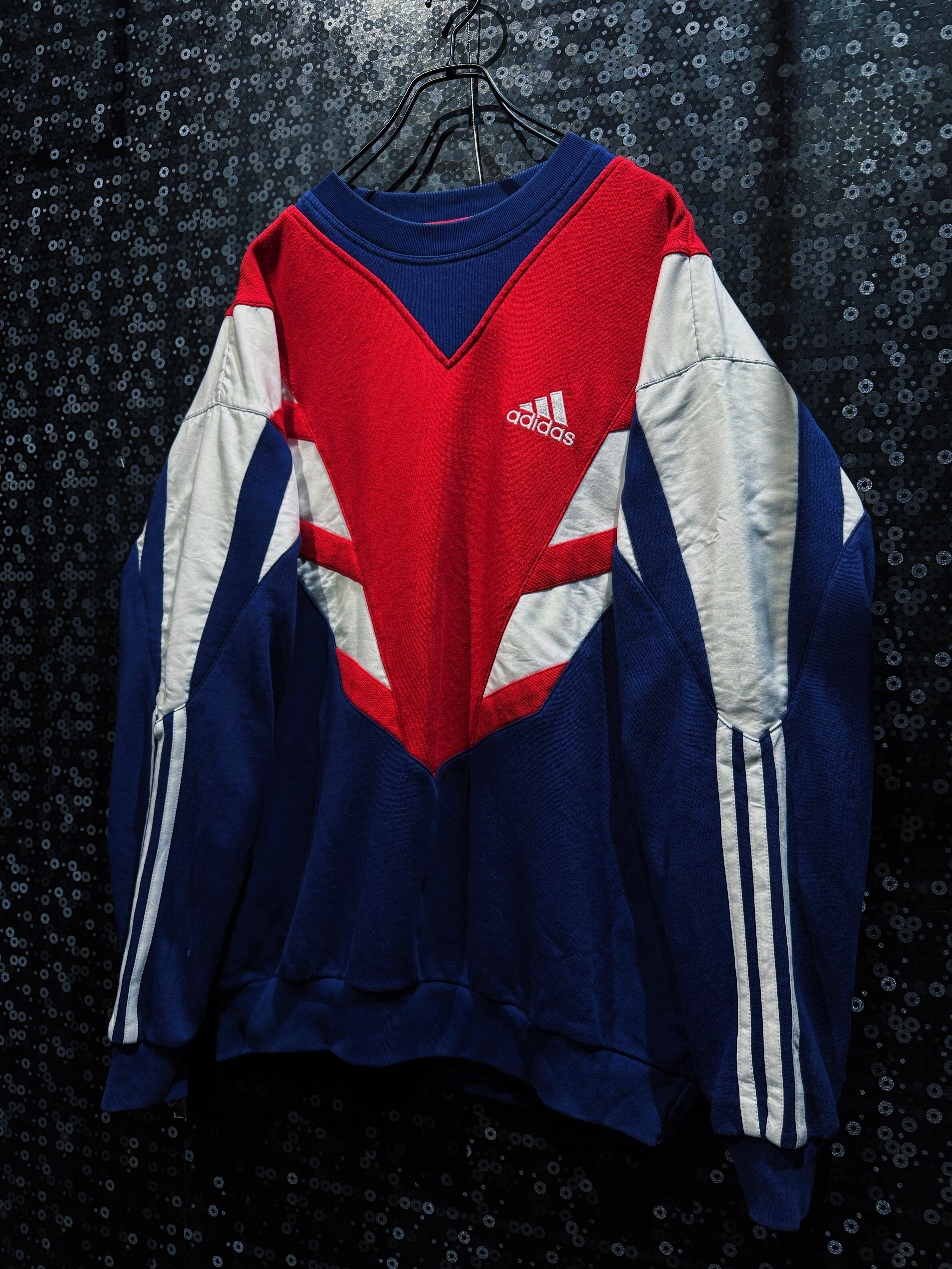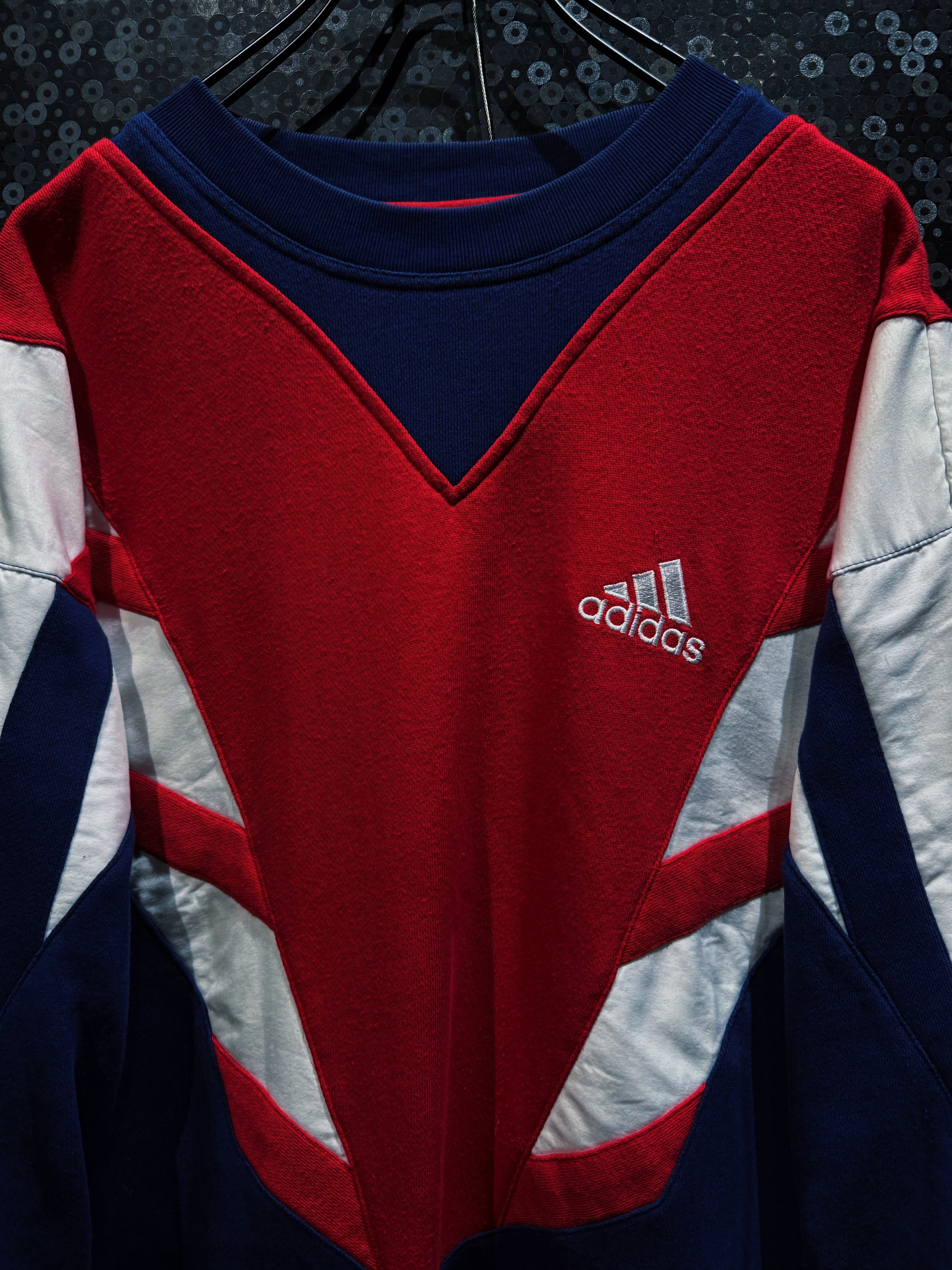 90年代adidasらしさが爆発した、攻撃的なV字切替が印象的なスウェットプルオーバー。フロント中央を大胆に走るレッドのVパネルは、まるでアーマーのような立体的デザインを構築し、そこにネイビーとホワイトを掛け合わせることでクラシックかつスポーティな存在感を完成させている一着。