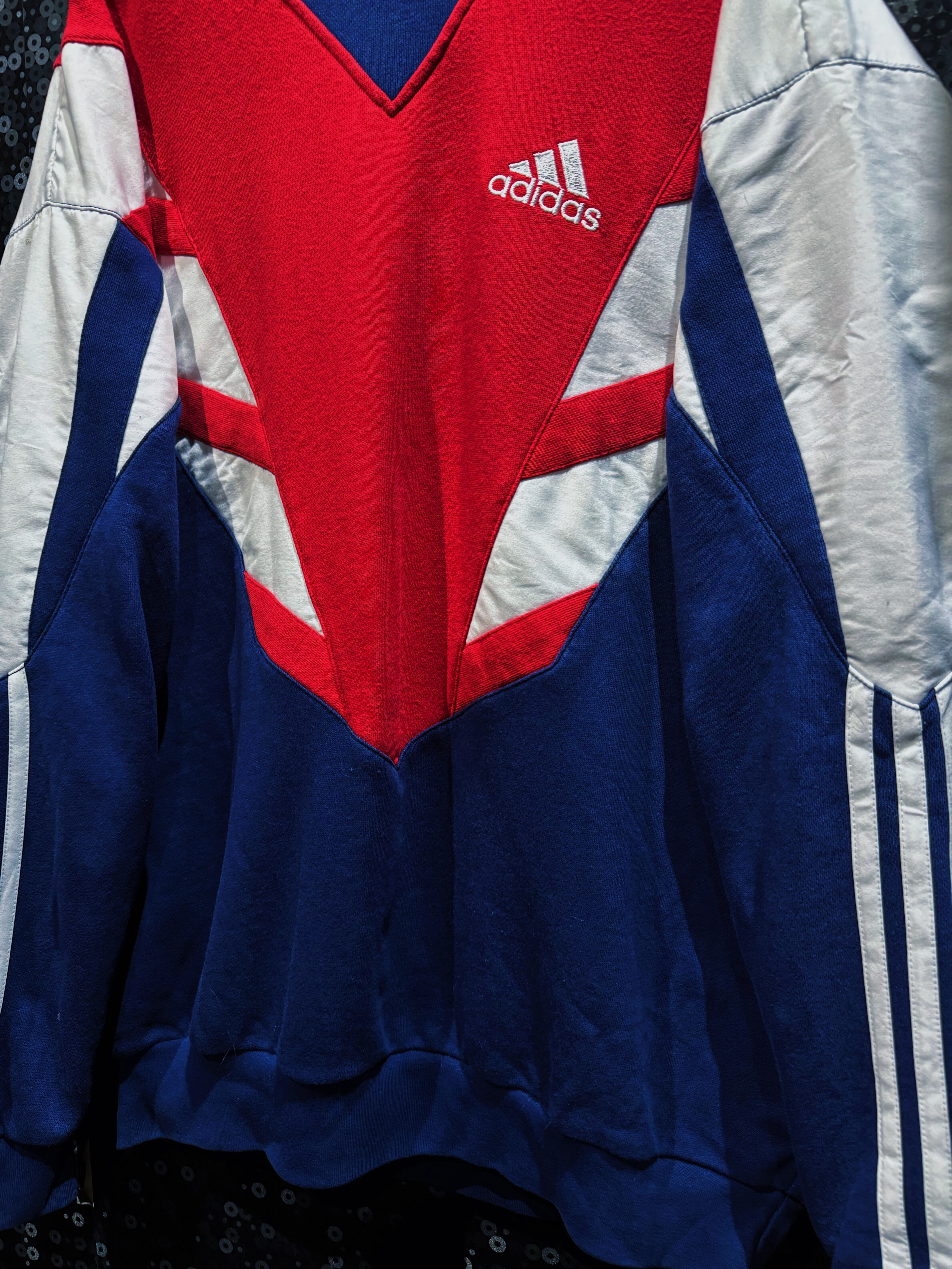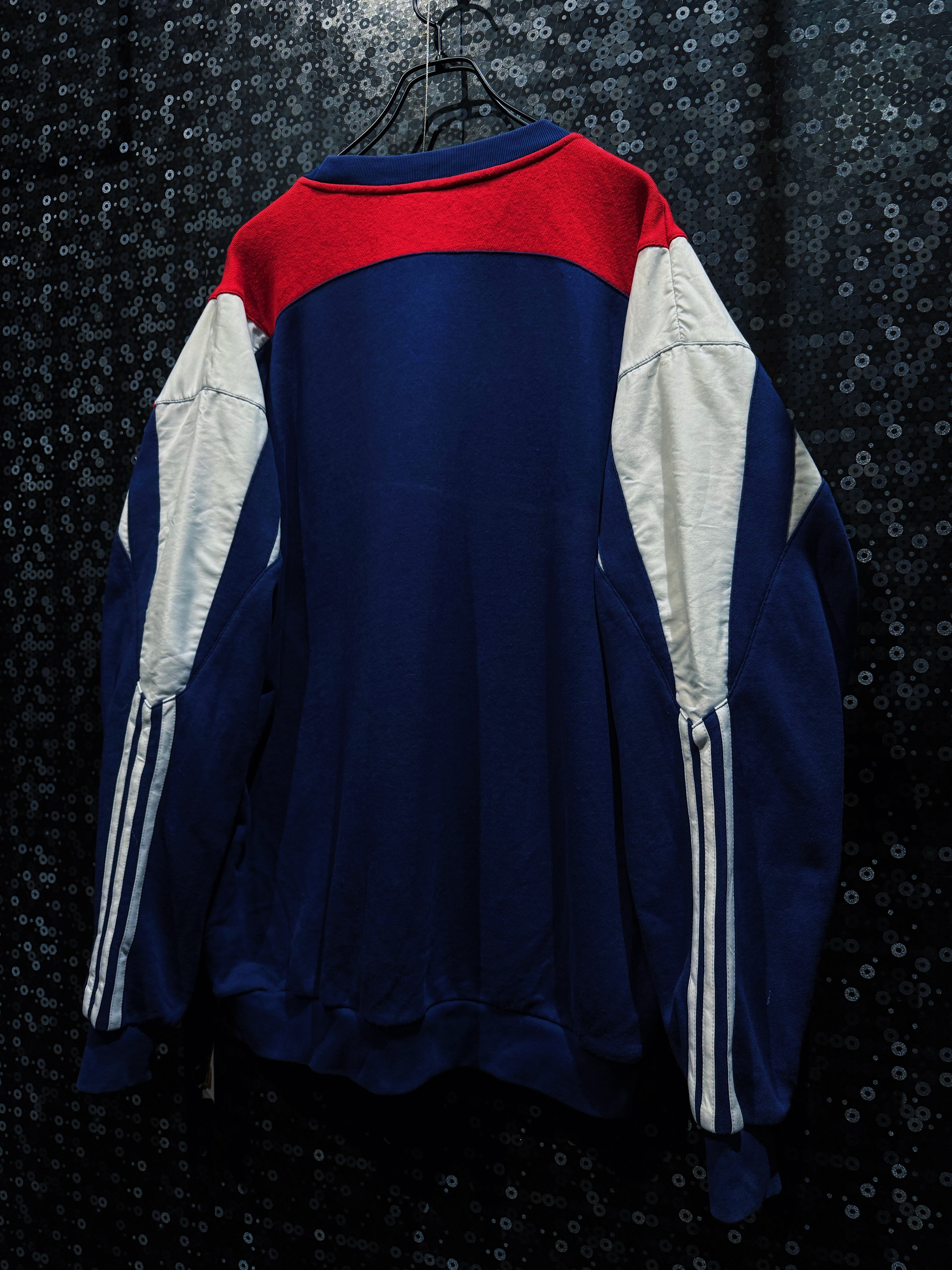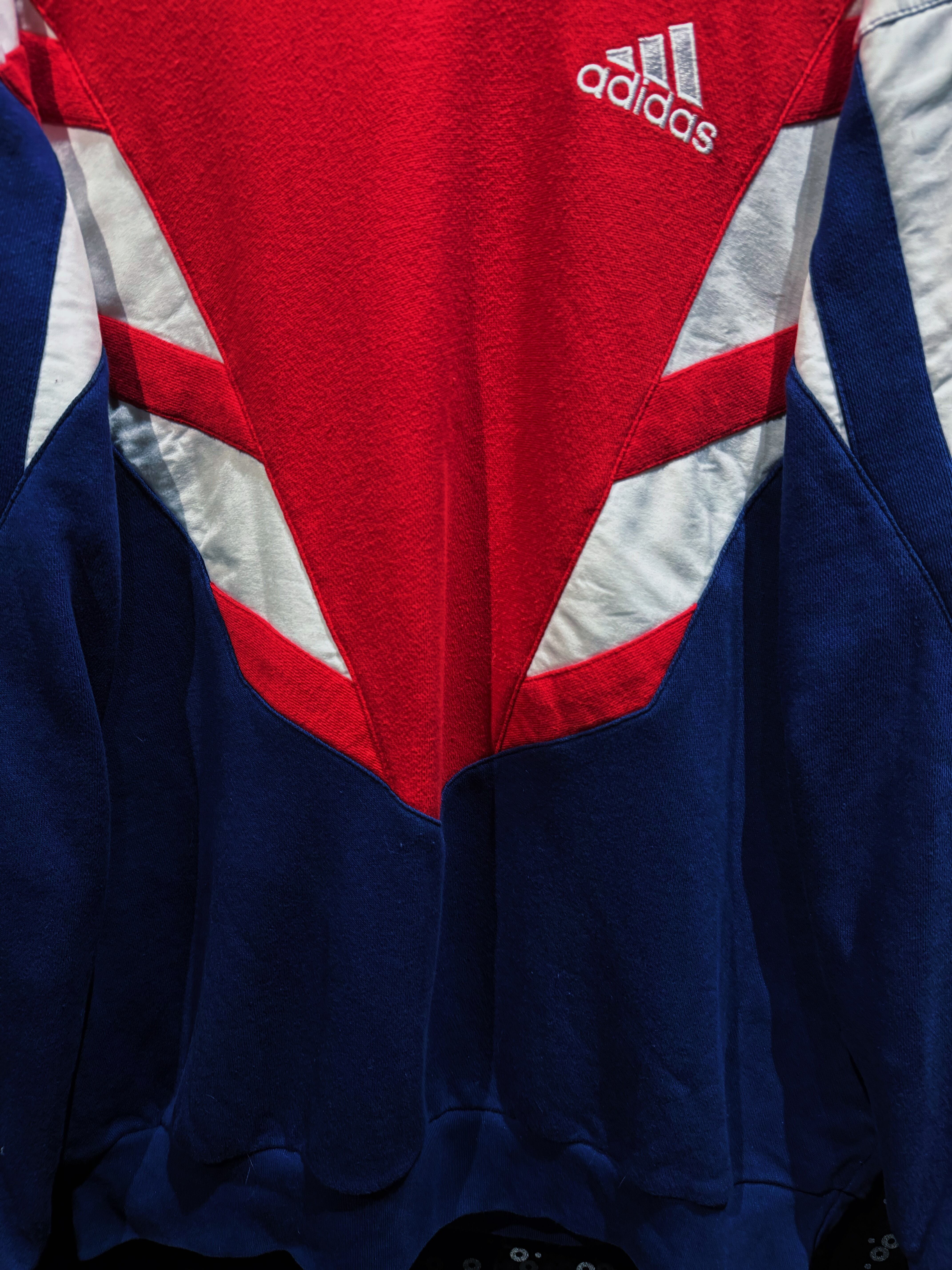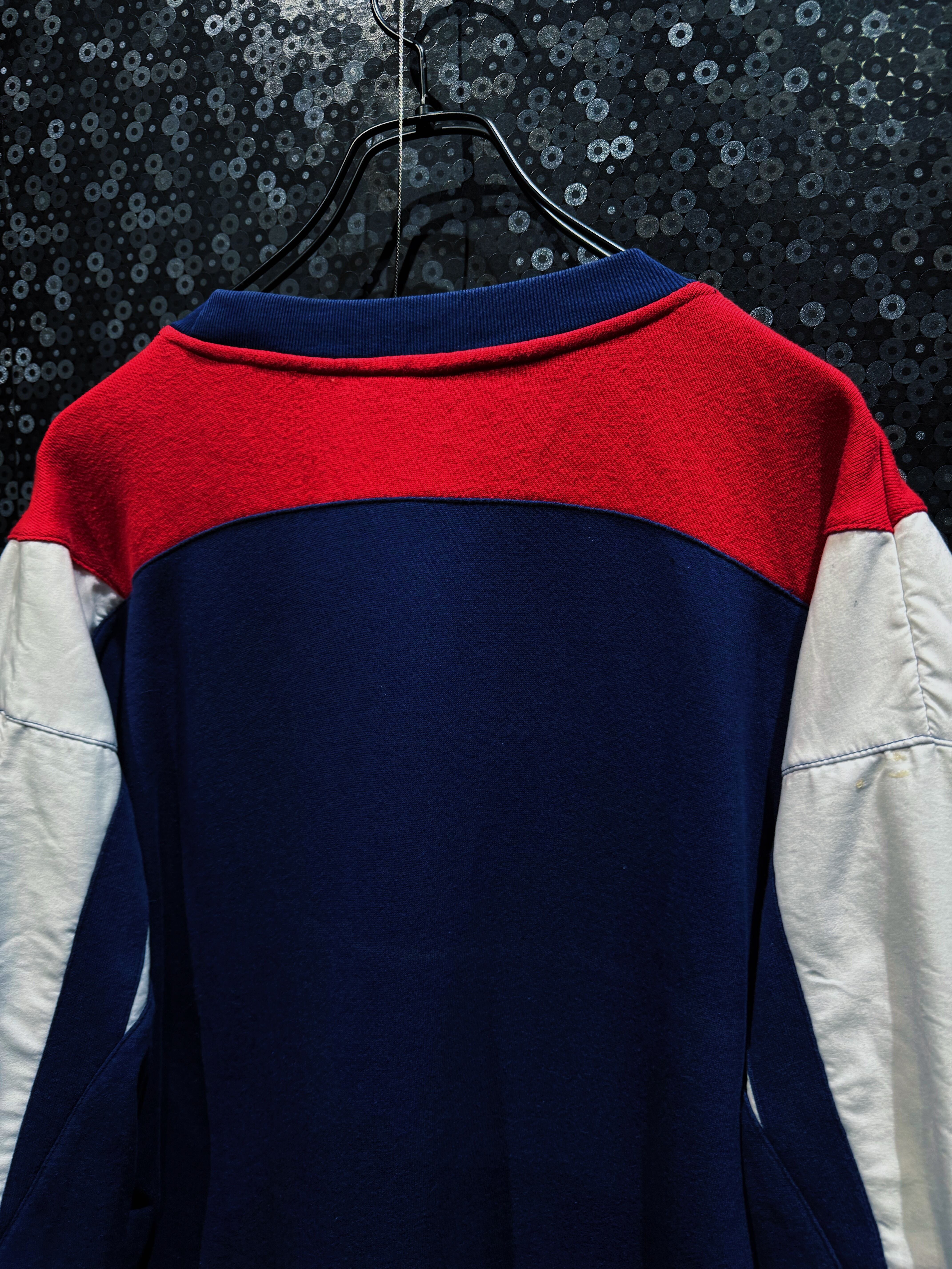 90年代adidasらしさが爆発した、攻撃的なV字切替が印象的なスウェットプルオーバー。フロント中央を大胆に走るレッドのVパネルは、まるでアーマーのような立体的デザインを構築し、そこにネイビーとホワイトを掛け合わせることでクラシックかつスポーティな存在感を完成させている一着。