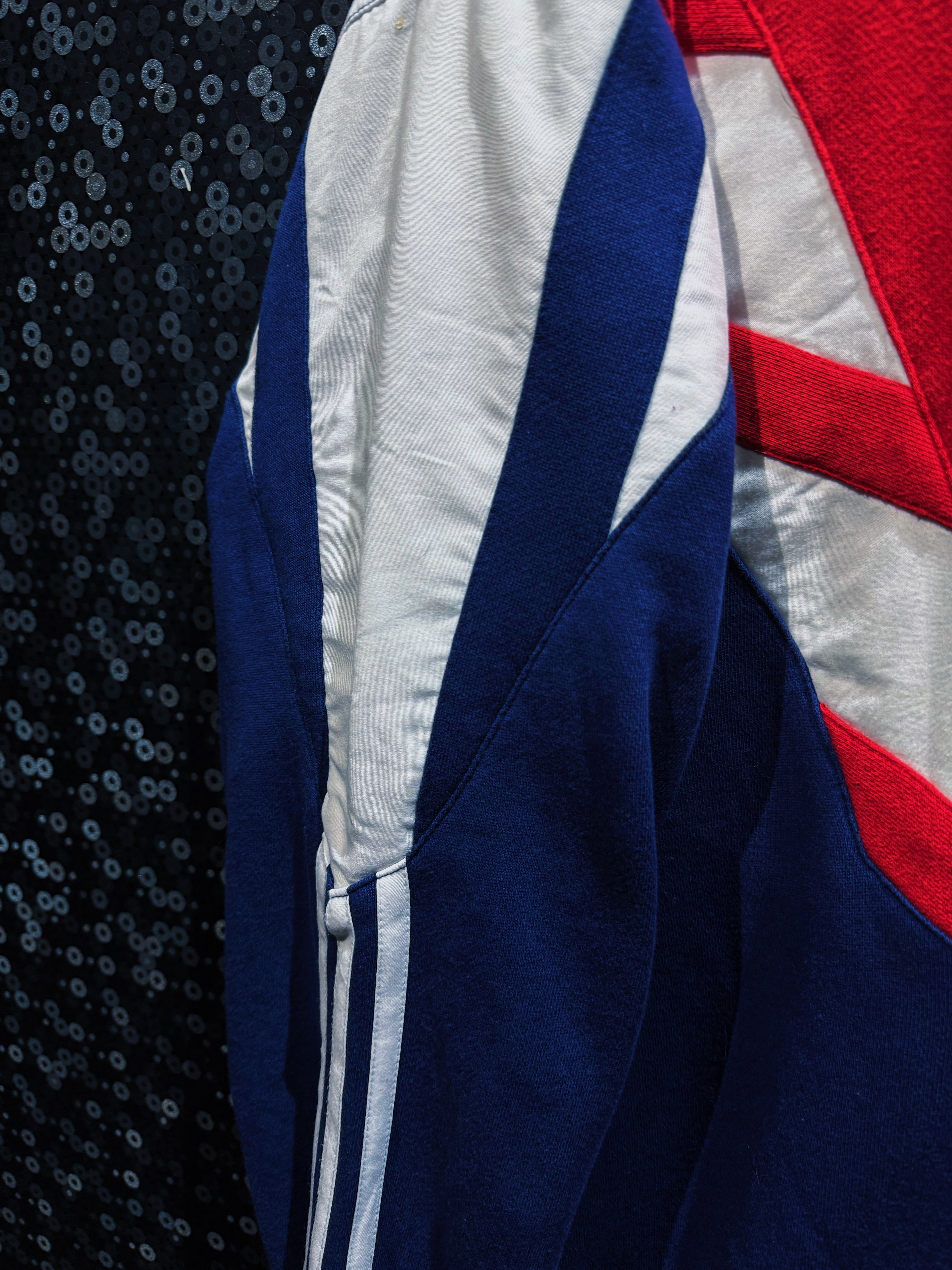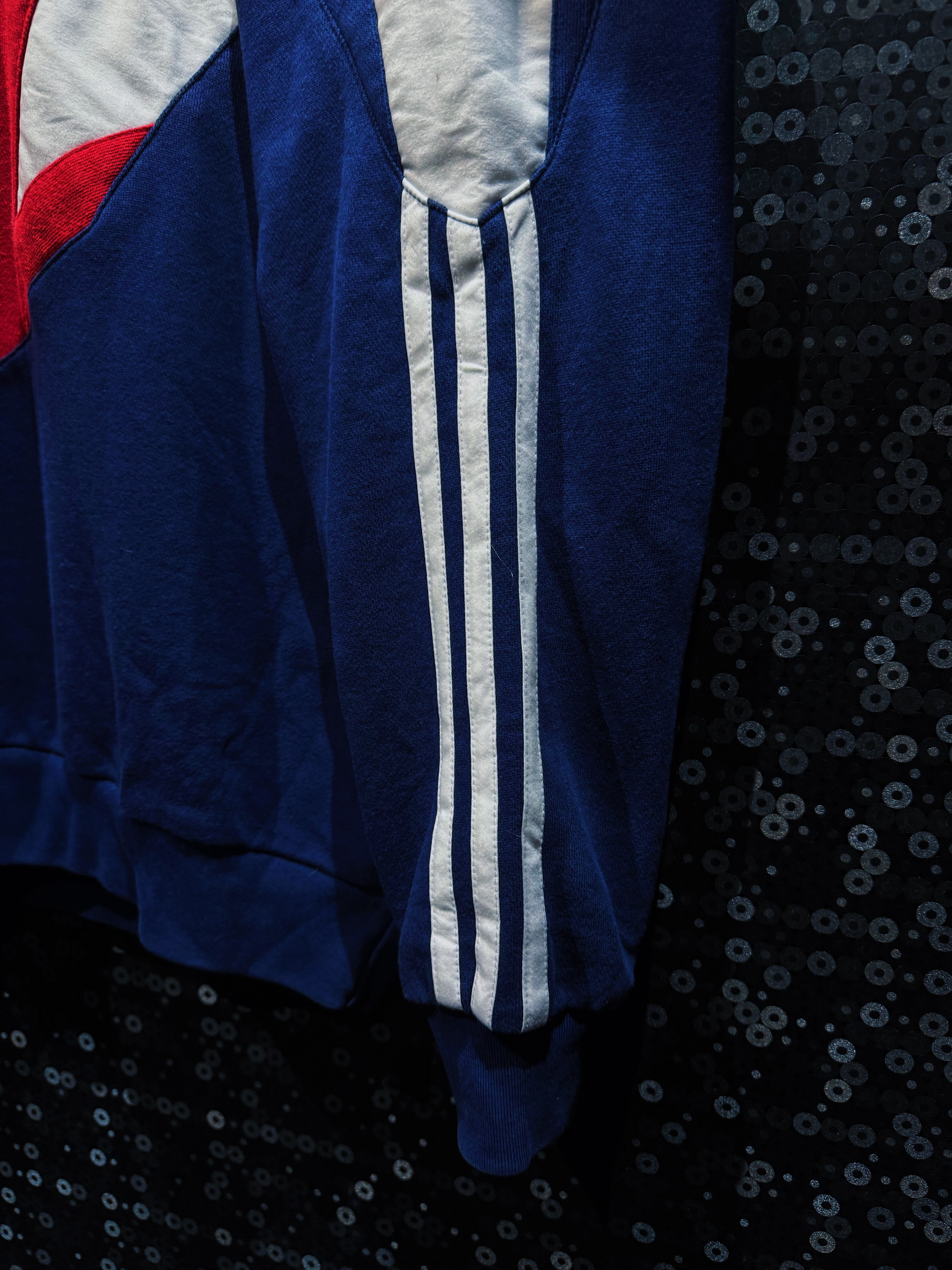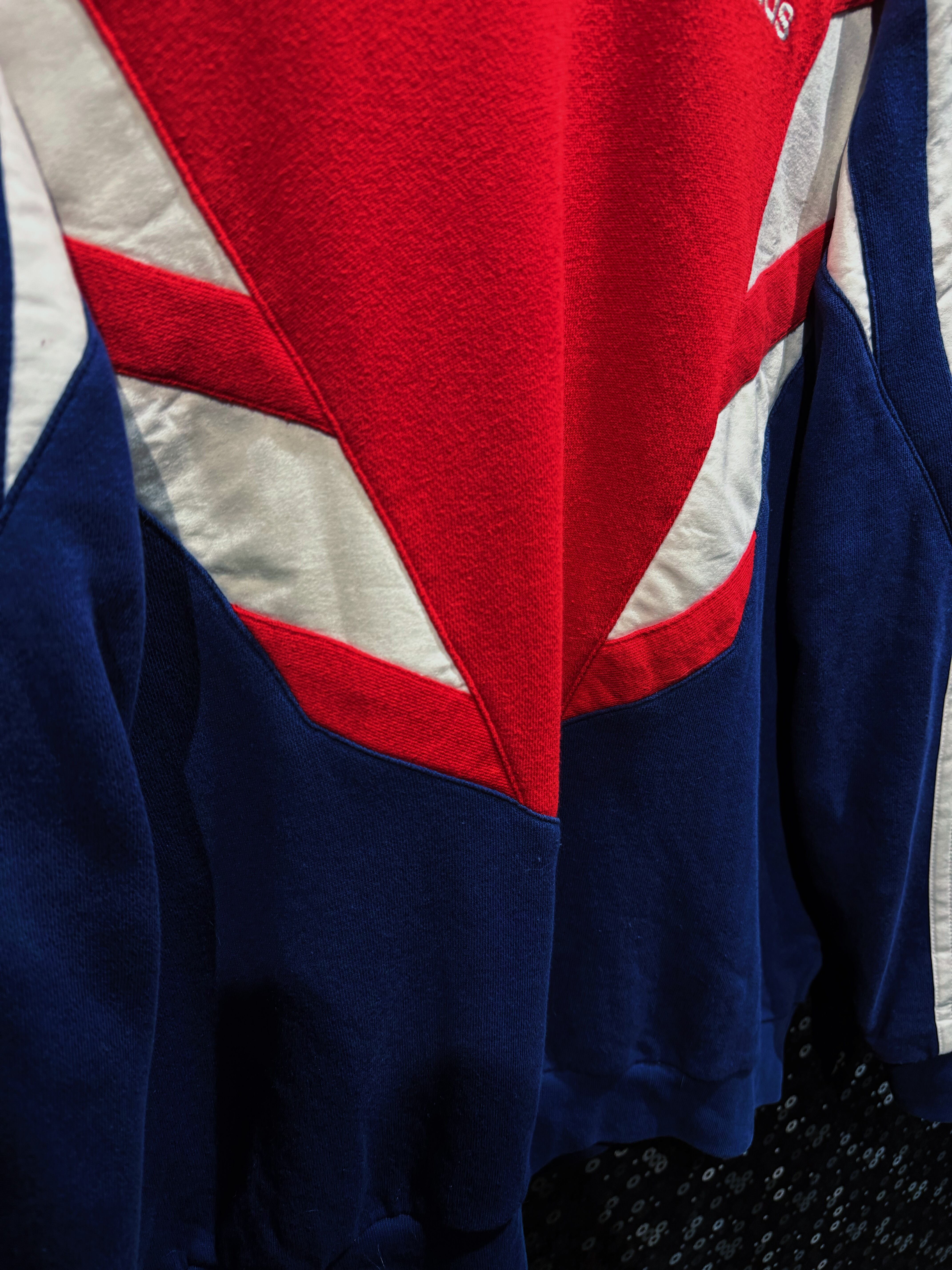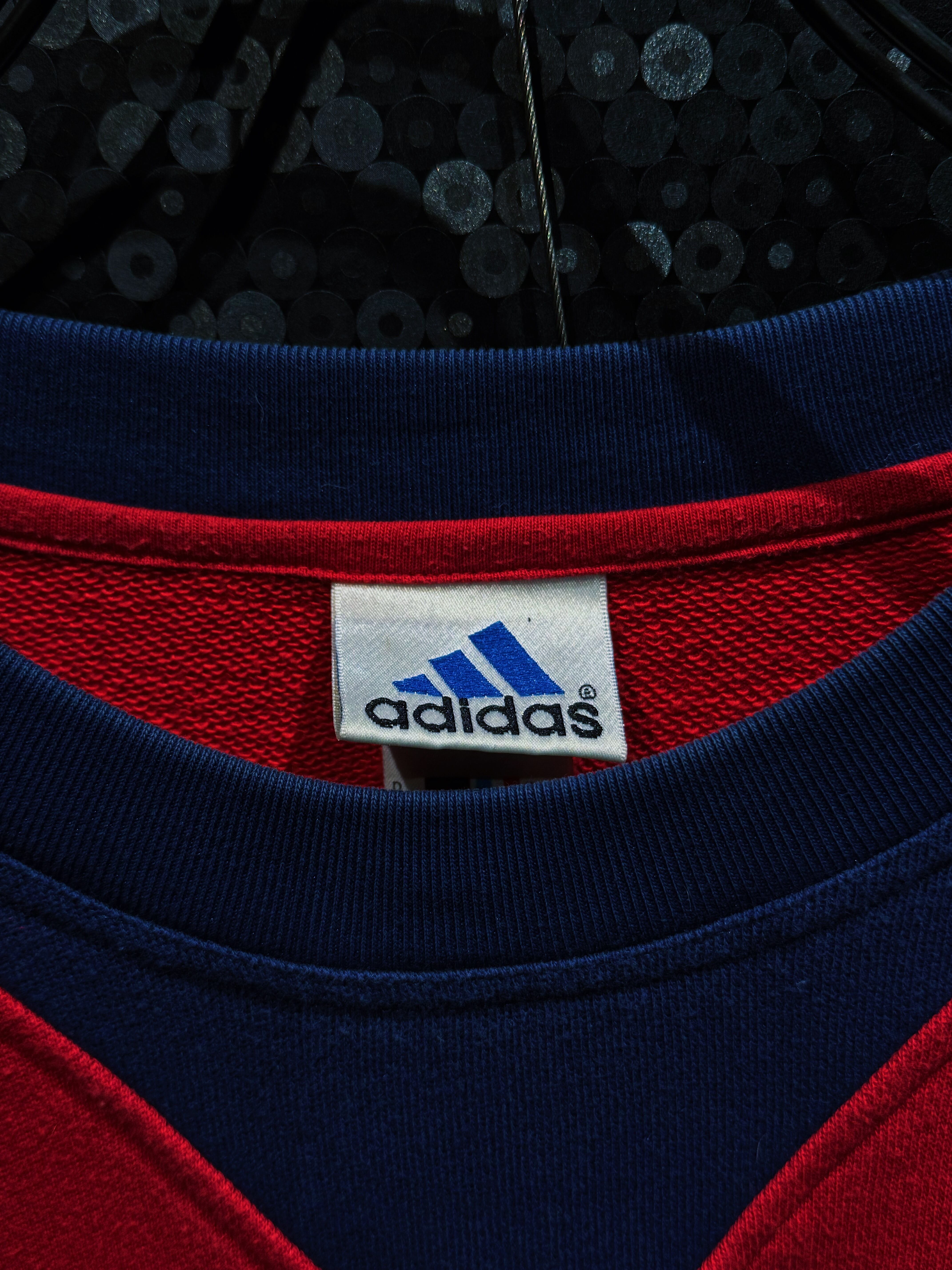90年代adidasらしさが爆発した、攻撃的なV字切替が印象的なスウェットプルオーバー。フロント中央を大胆に走るレッドのVパネルは、まるでアーマーのような立体的デザインを構築し、そこにネイビーとホワイトを掛け合わせることでクラシックかつスポーティな存在感を完成させている一着。