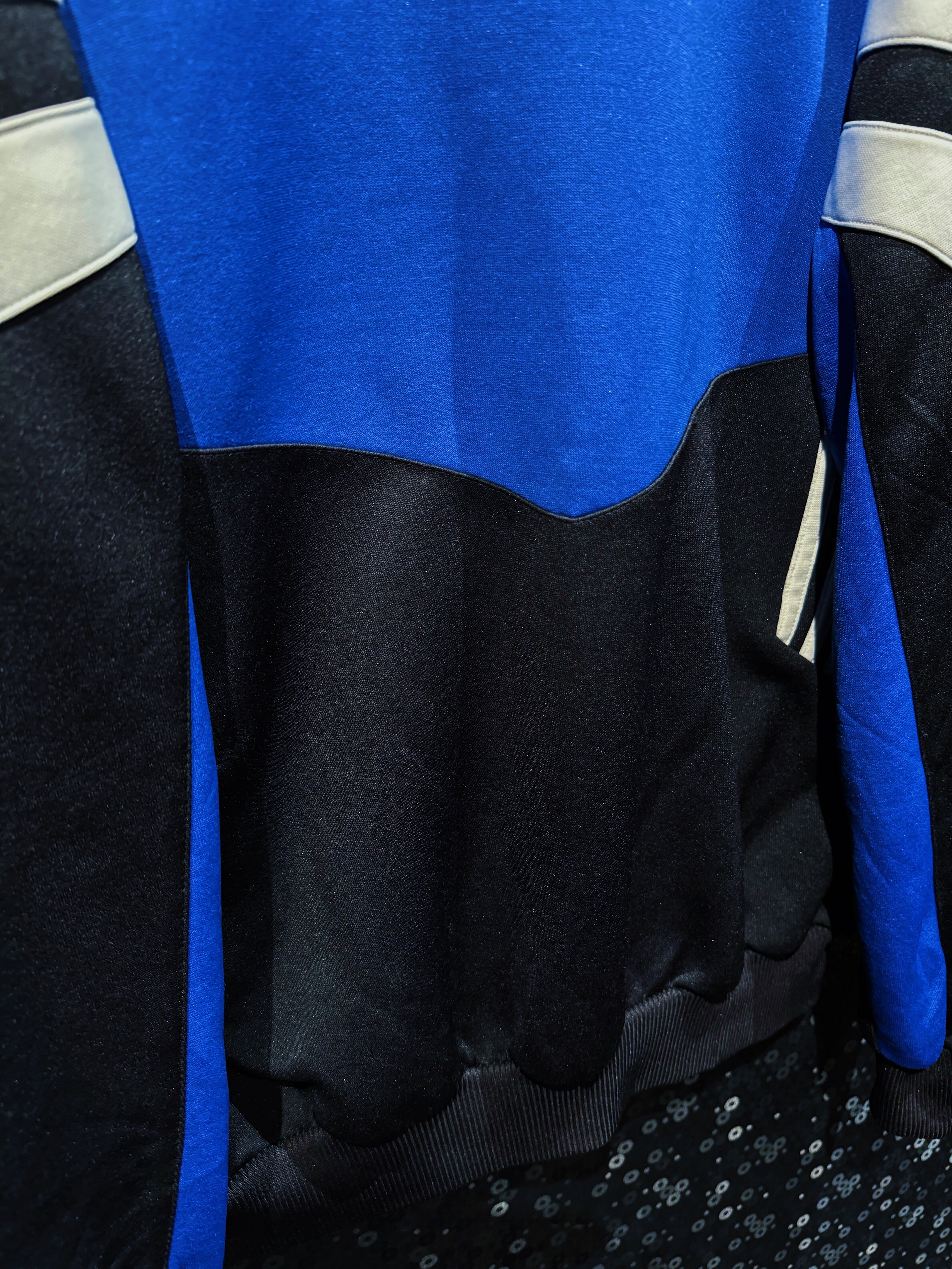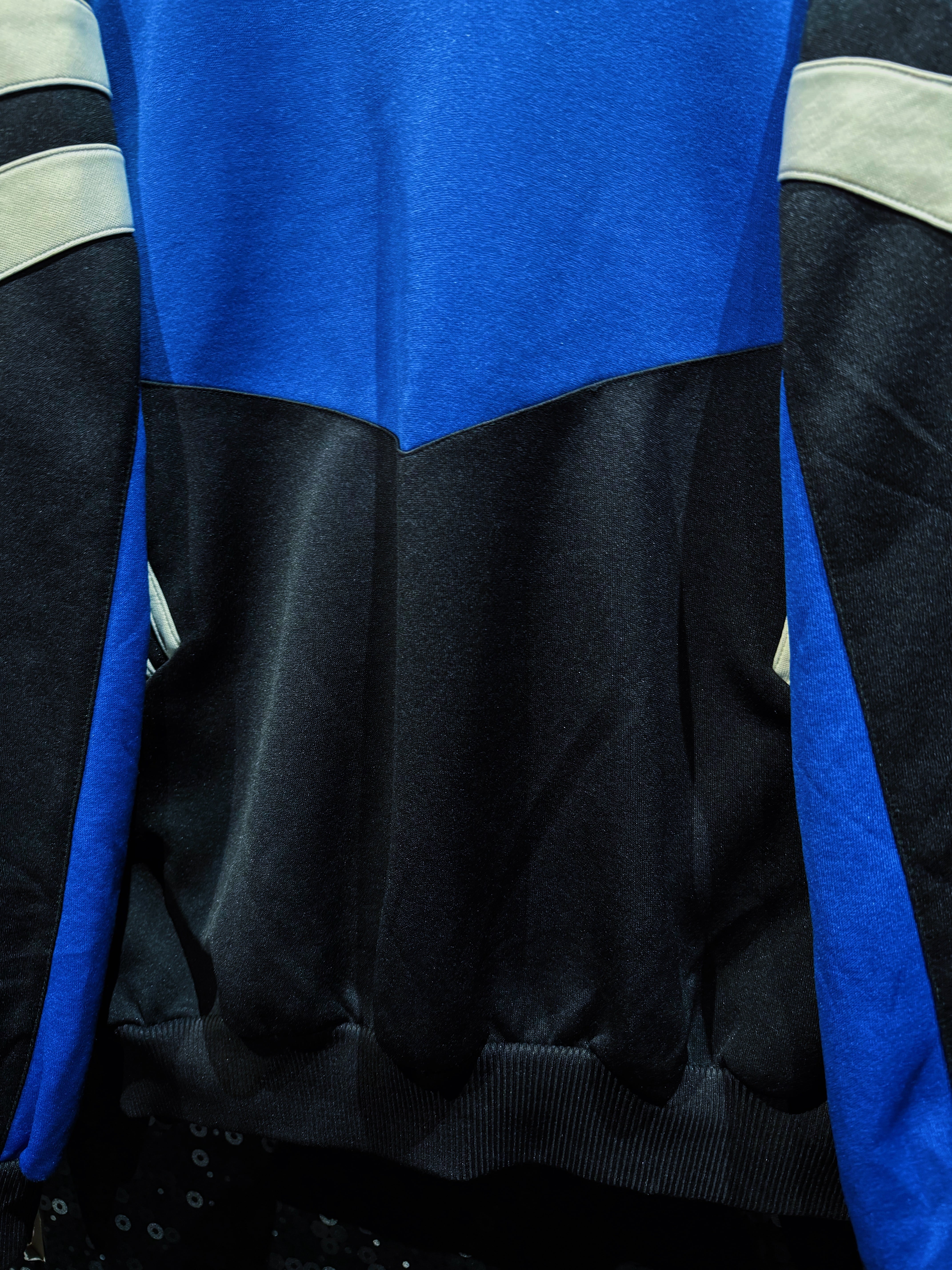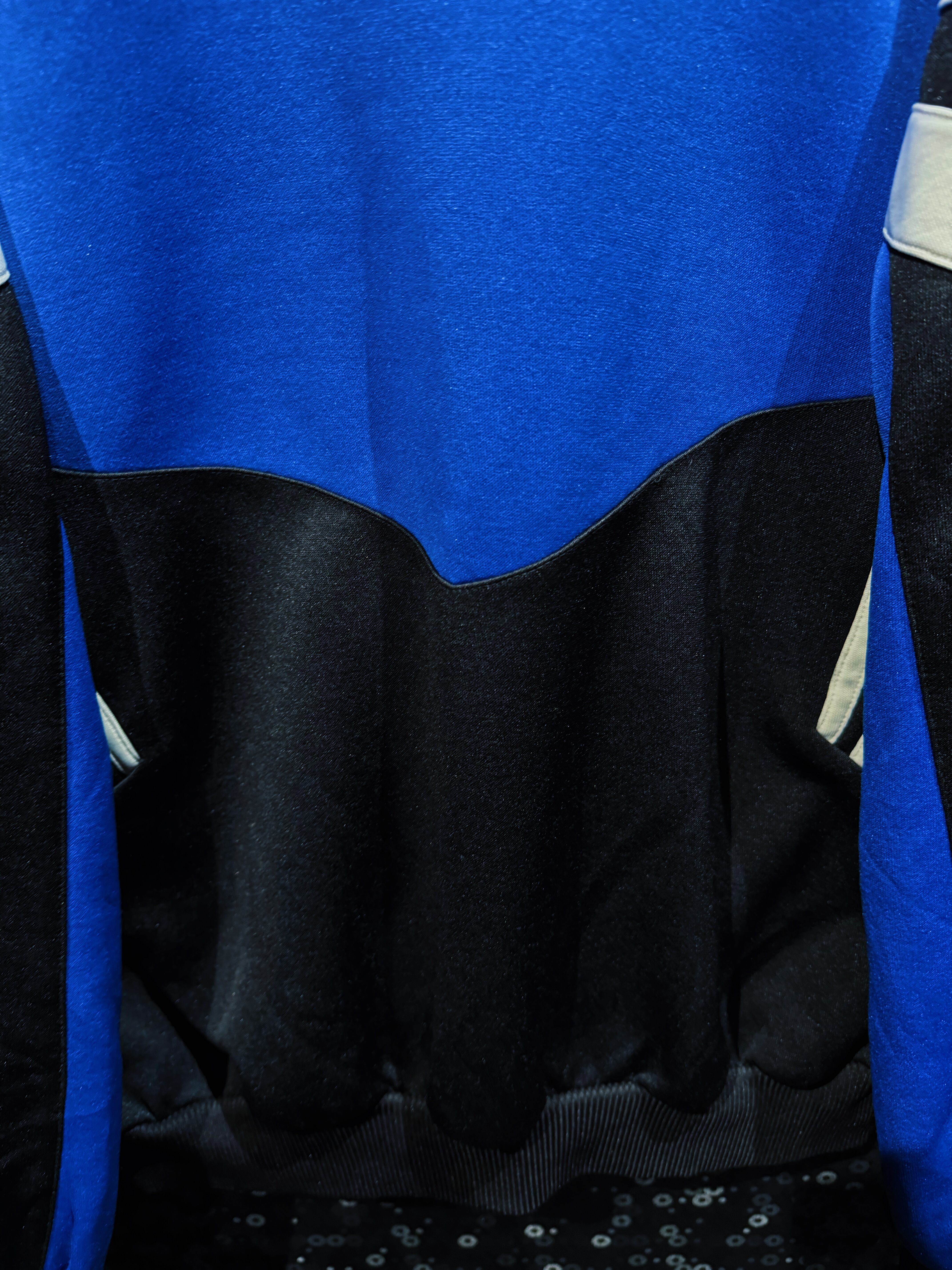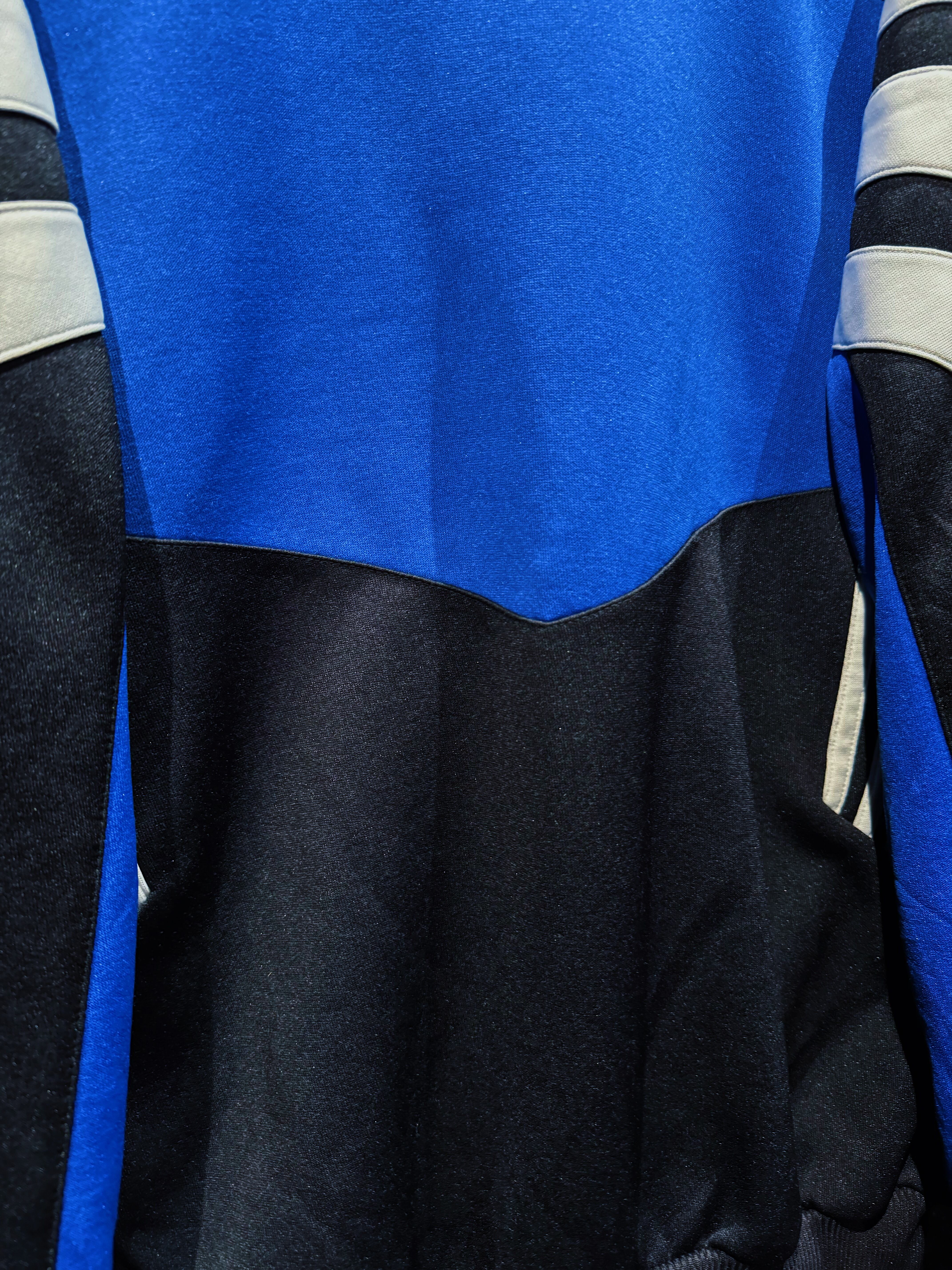 ブラックをベースに、胸元へ大胆に入るロイヤルブルーのV字パネル。そこへホワイト刺繍の“adidas”ロゴが鎮座する王道かつ完成度の高い一着。