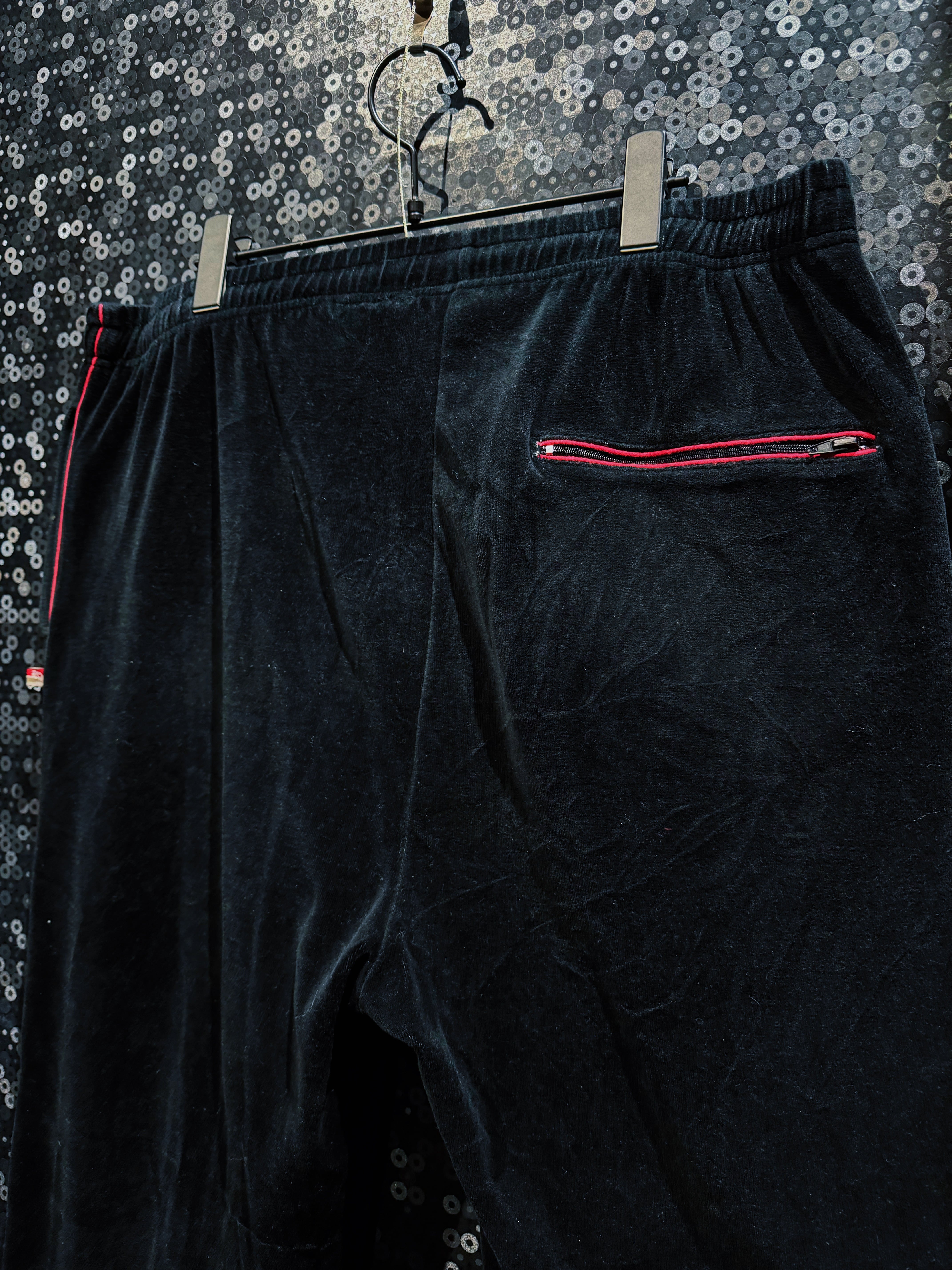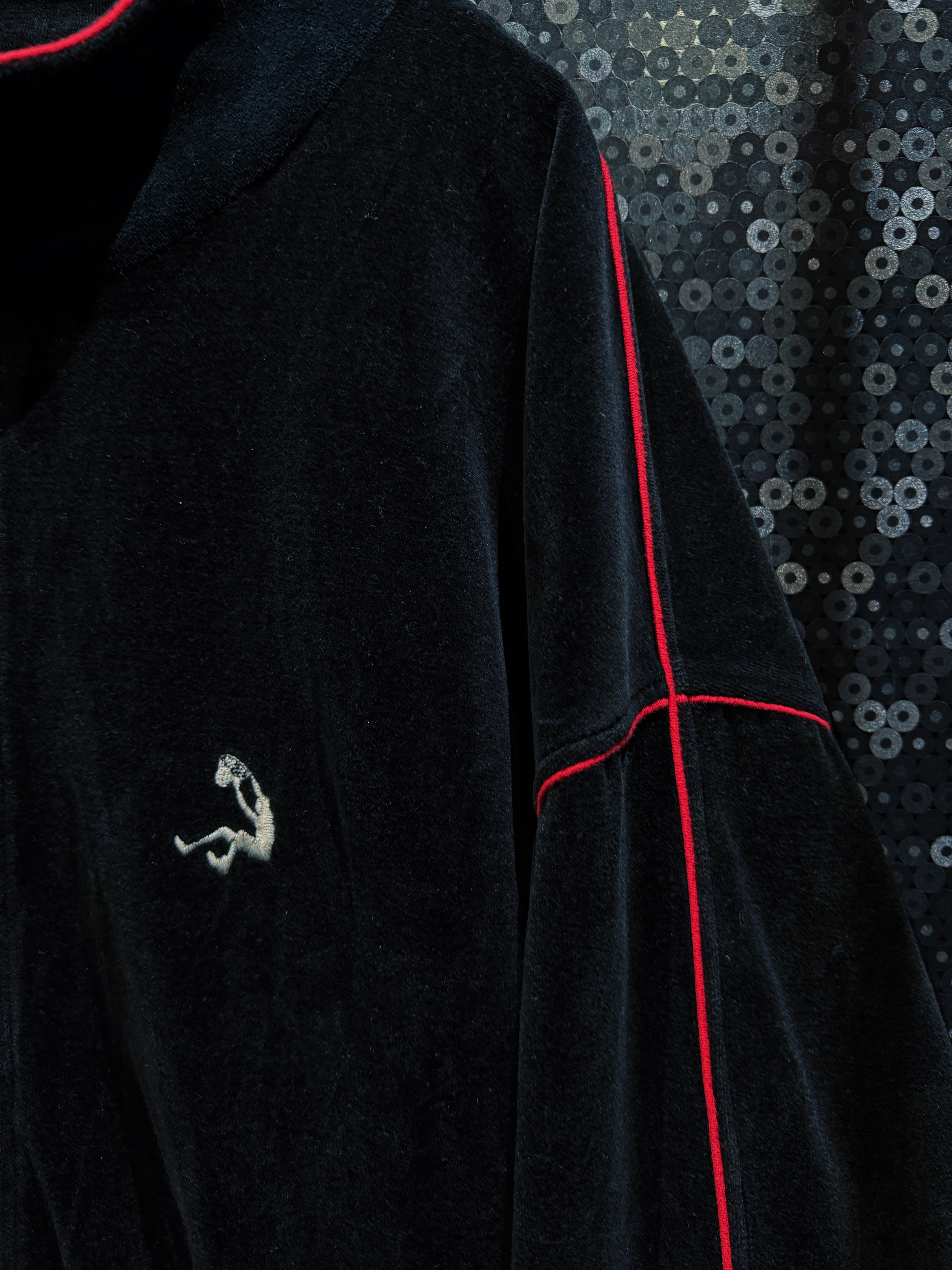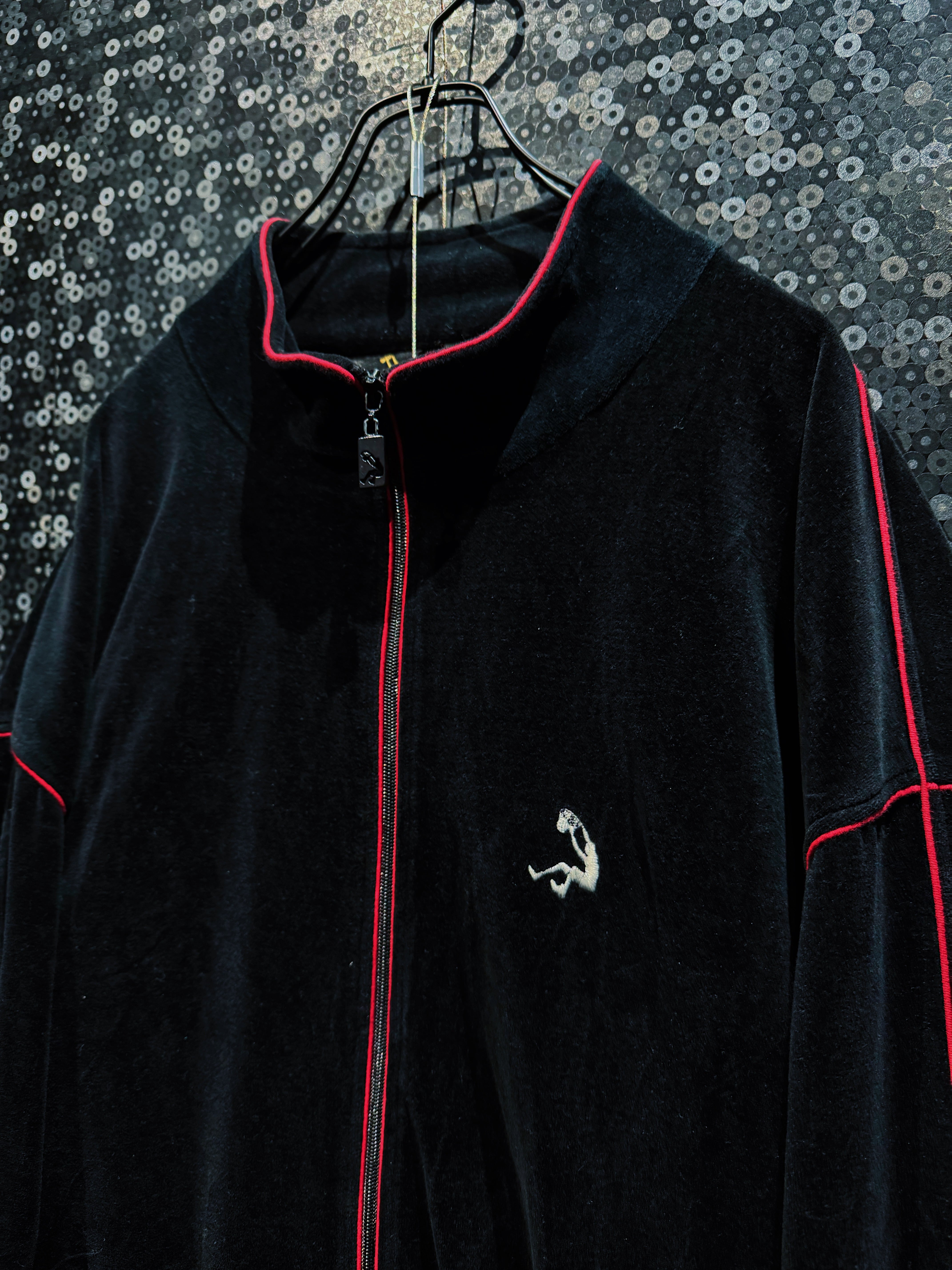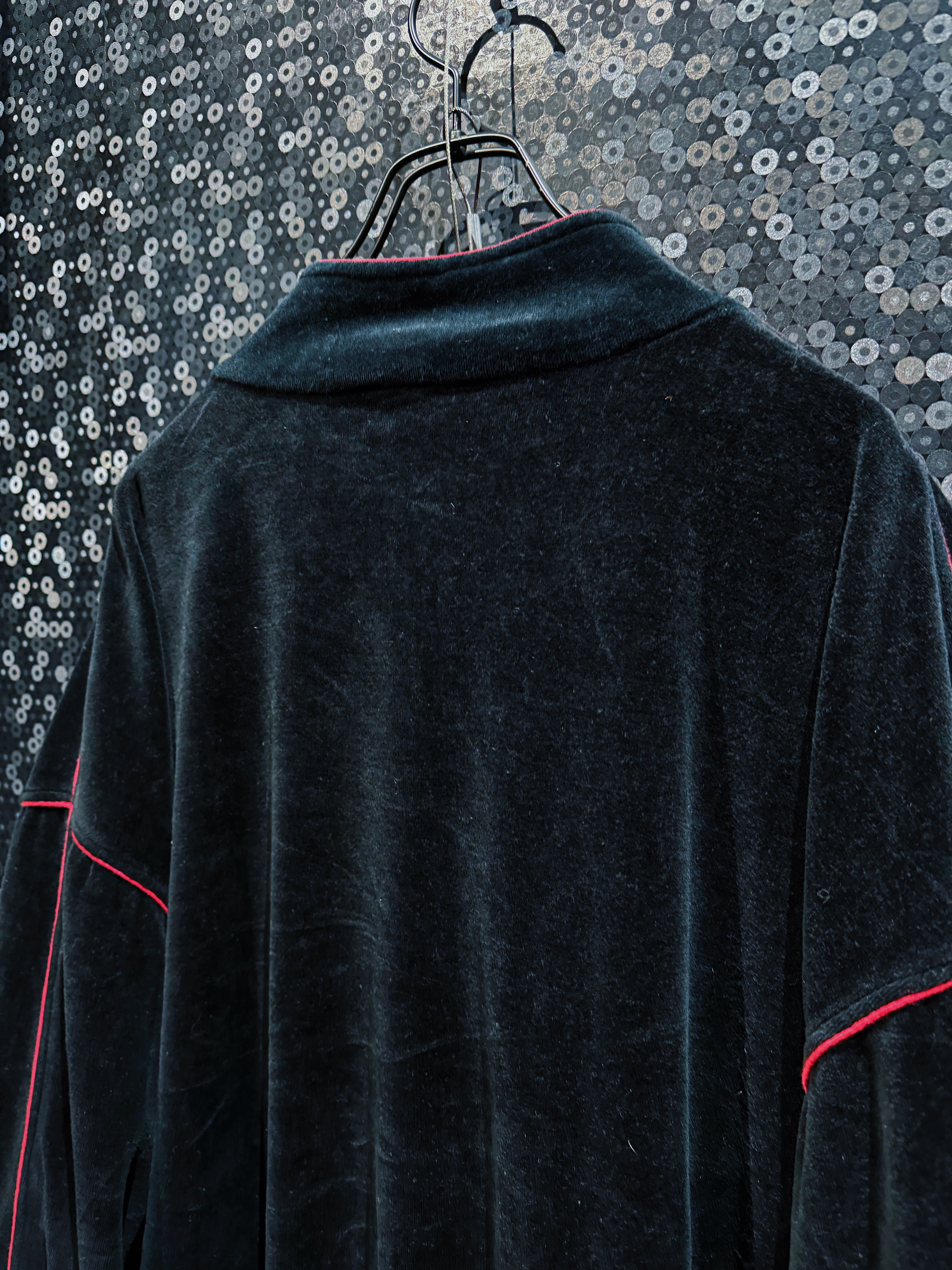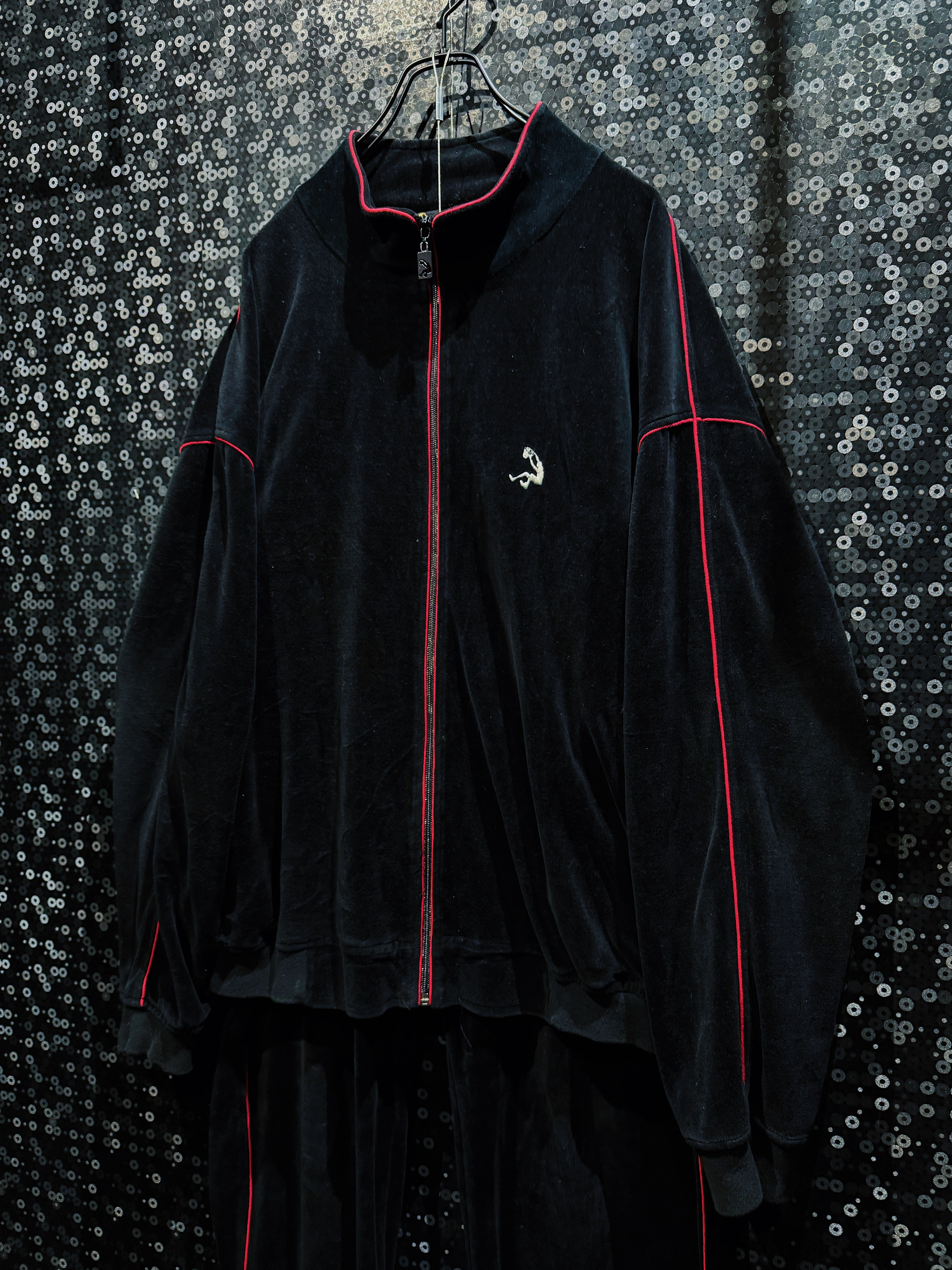 LAストリートの定番ブランド“PRO CLUB”による、重厚ブラックベロアのヴィンテージトラックセットアップ。肉厚で滑らかなベロアボディに、鋭く走るレッドパイピング。無骨さと色気を併せ持つ、まさに“黒の説得力”を体現した一着。