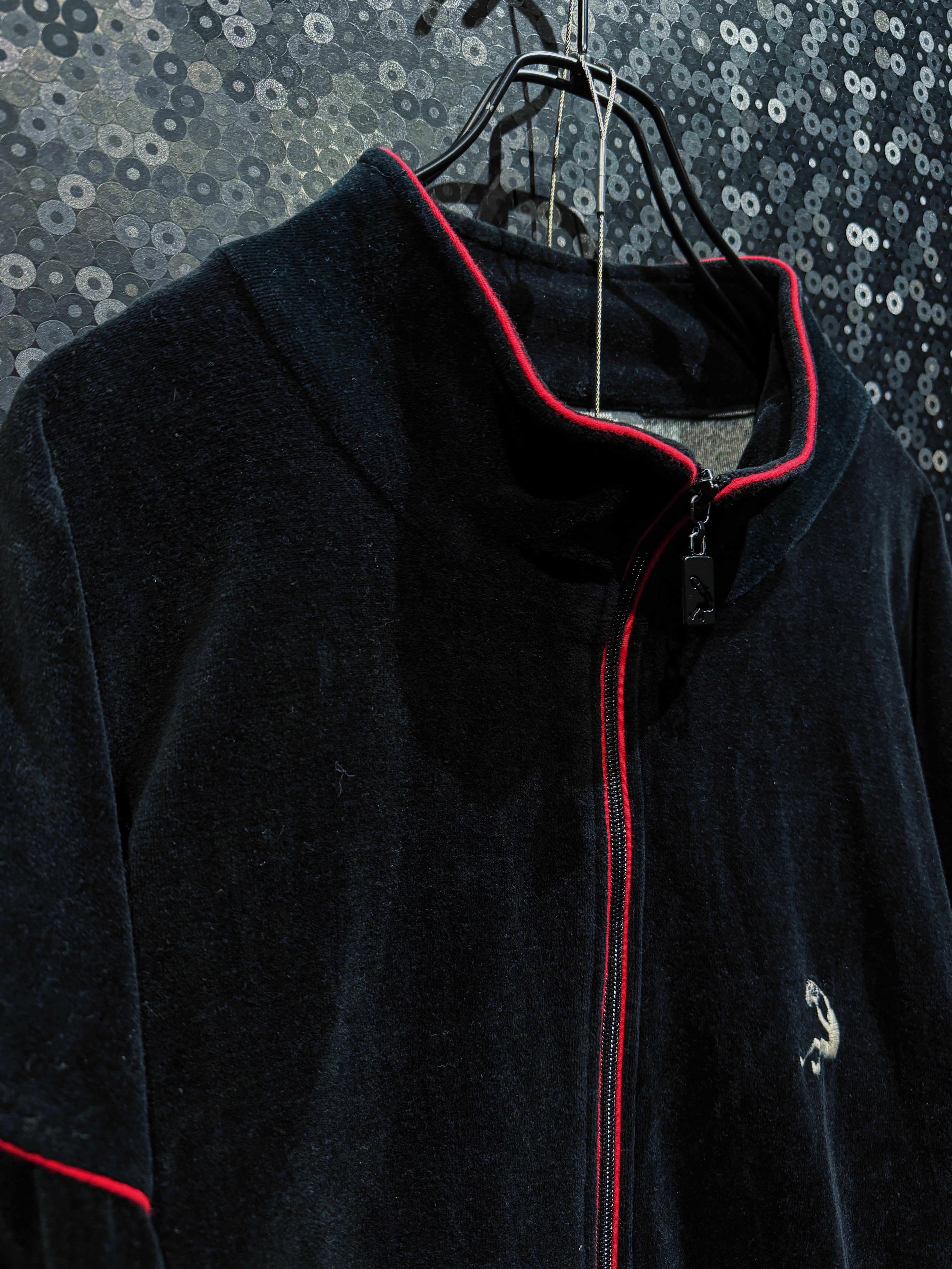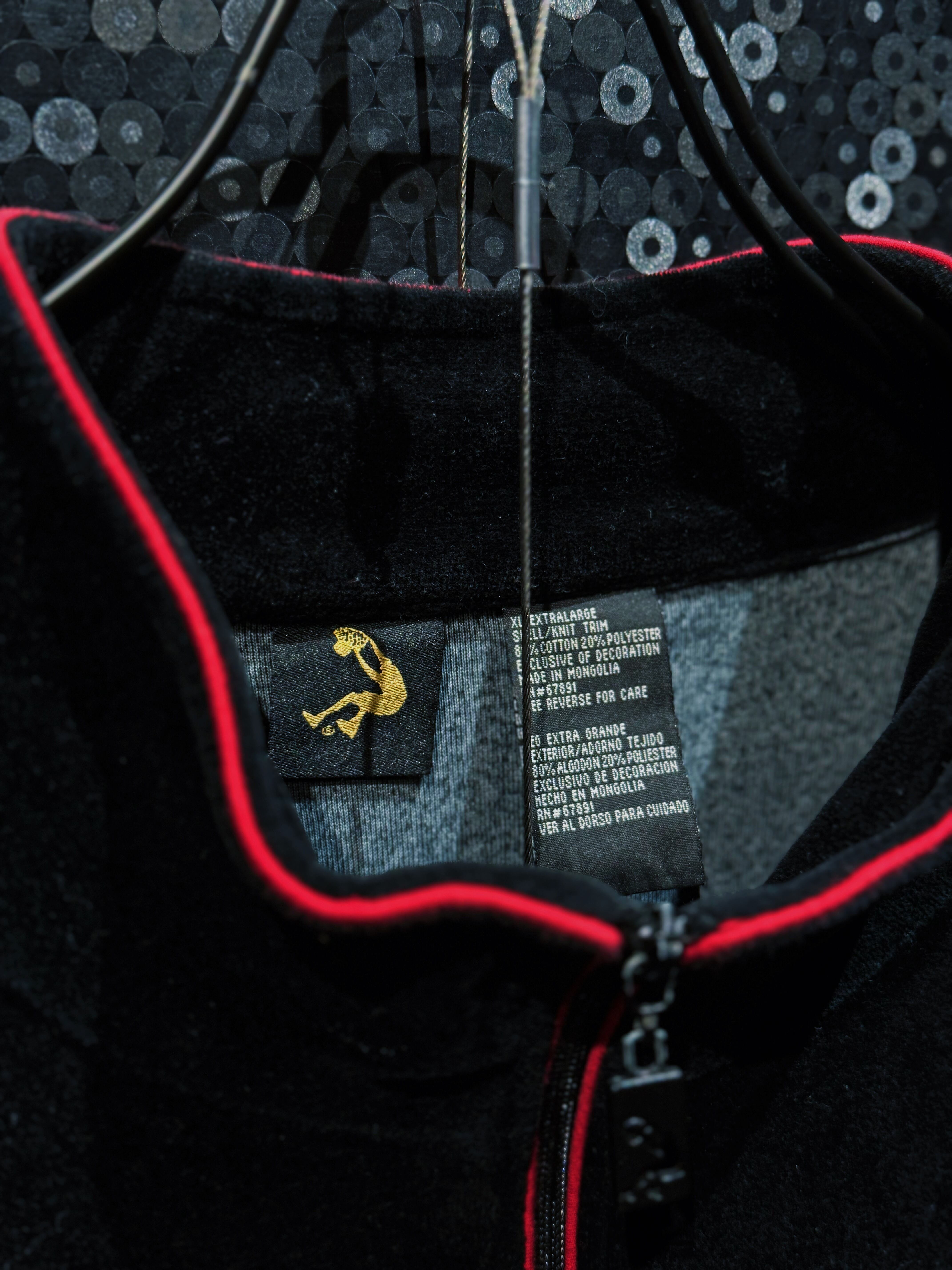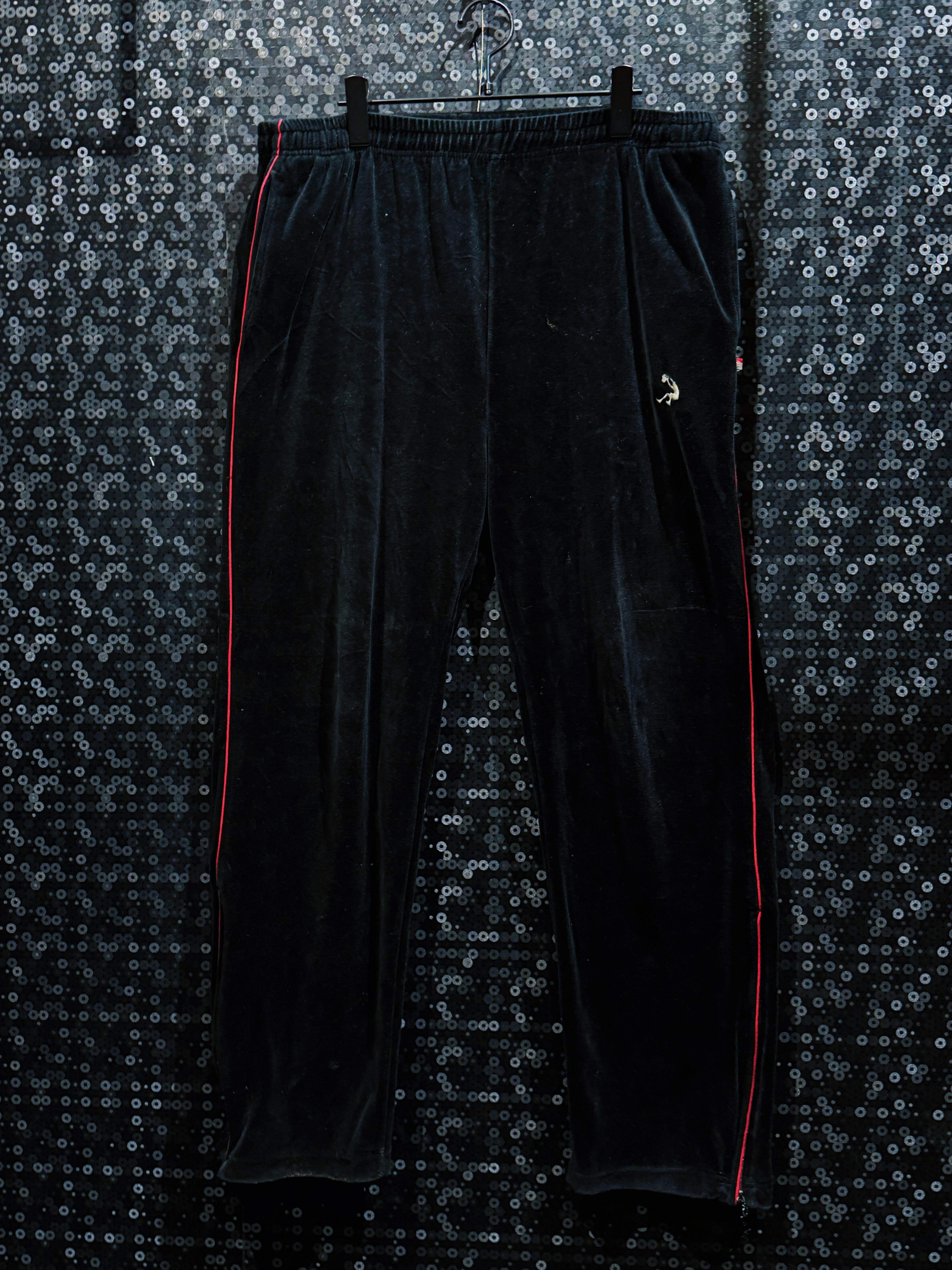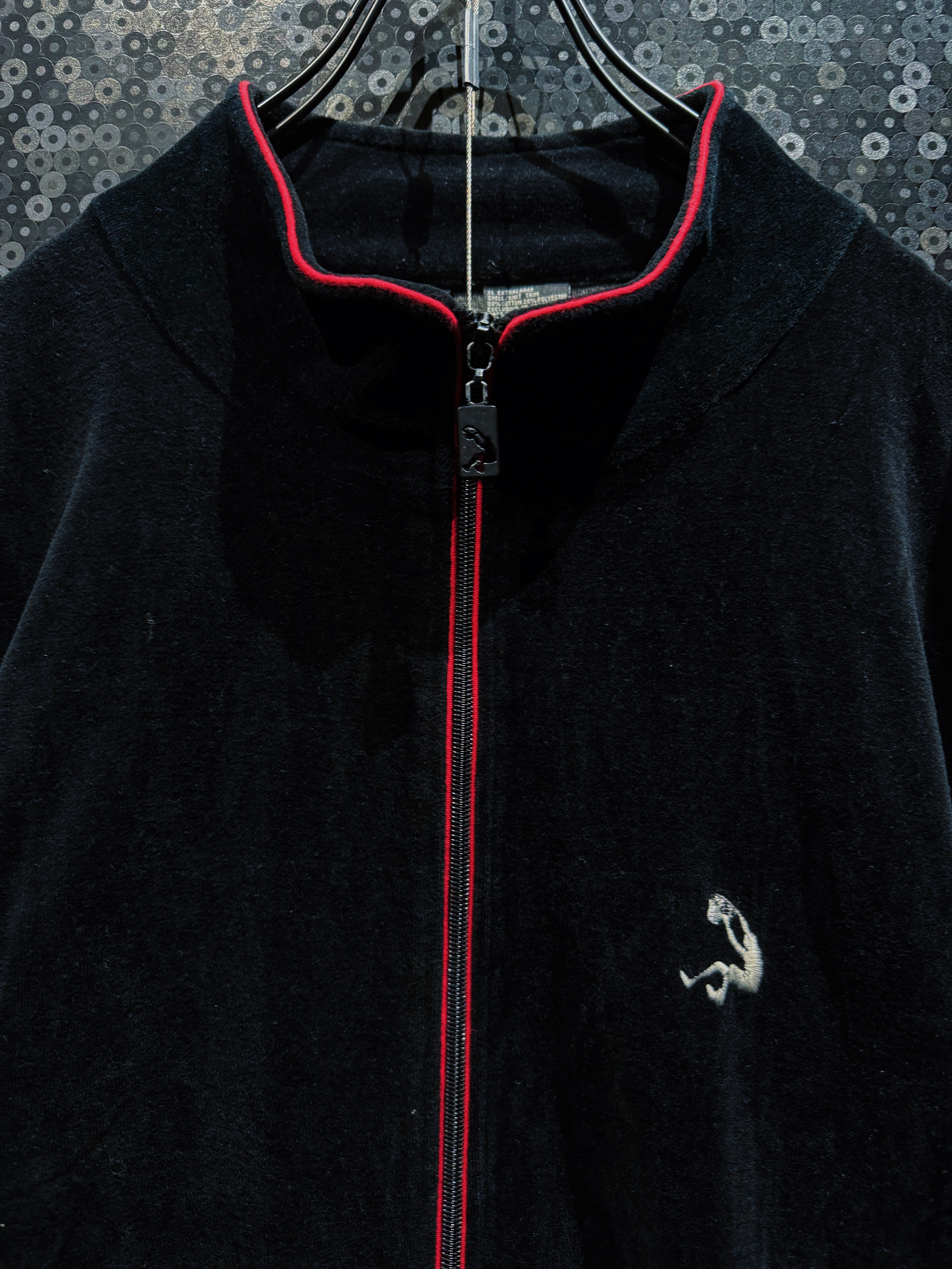 LAストリートの定番ブランド“PRO CLUB”による、重厚ブラックベロアのヴィンテージトラックセットアップ。肉厚で滑らかなベロアボディに、鋭く走るレッドパイピング。無骨さと色気を併せ持つ、まさに“黒の説得力”を体現した一着。