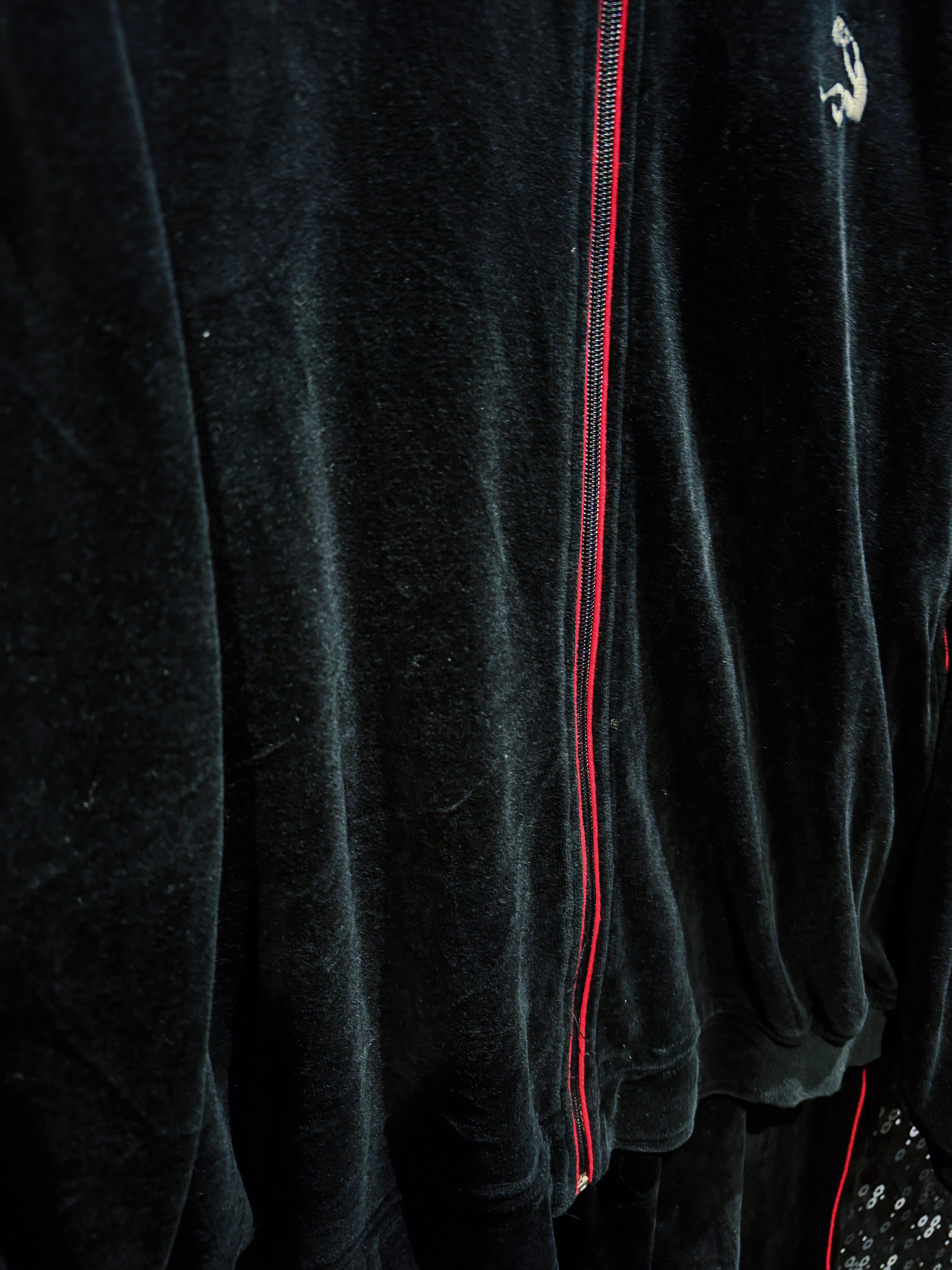 フルジップ仕様のトップスはスタンドネックに赤トリムを施し、閉めた際のミニマルな佇まいも抜群。胸元にはゴールドのサッカーモチーフ刺繍。シンプルなボディに対して、さりげなくも確実に視線を奪うアクセントとして機能している。肩から袖へ、そして身頃へと切り替わるパイピングラインが立体感を生み、ベロア特有の艶と相まって奥行きある表情を作り出す。