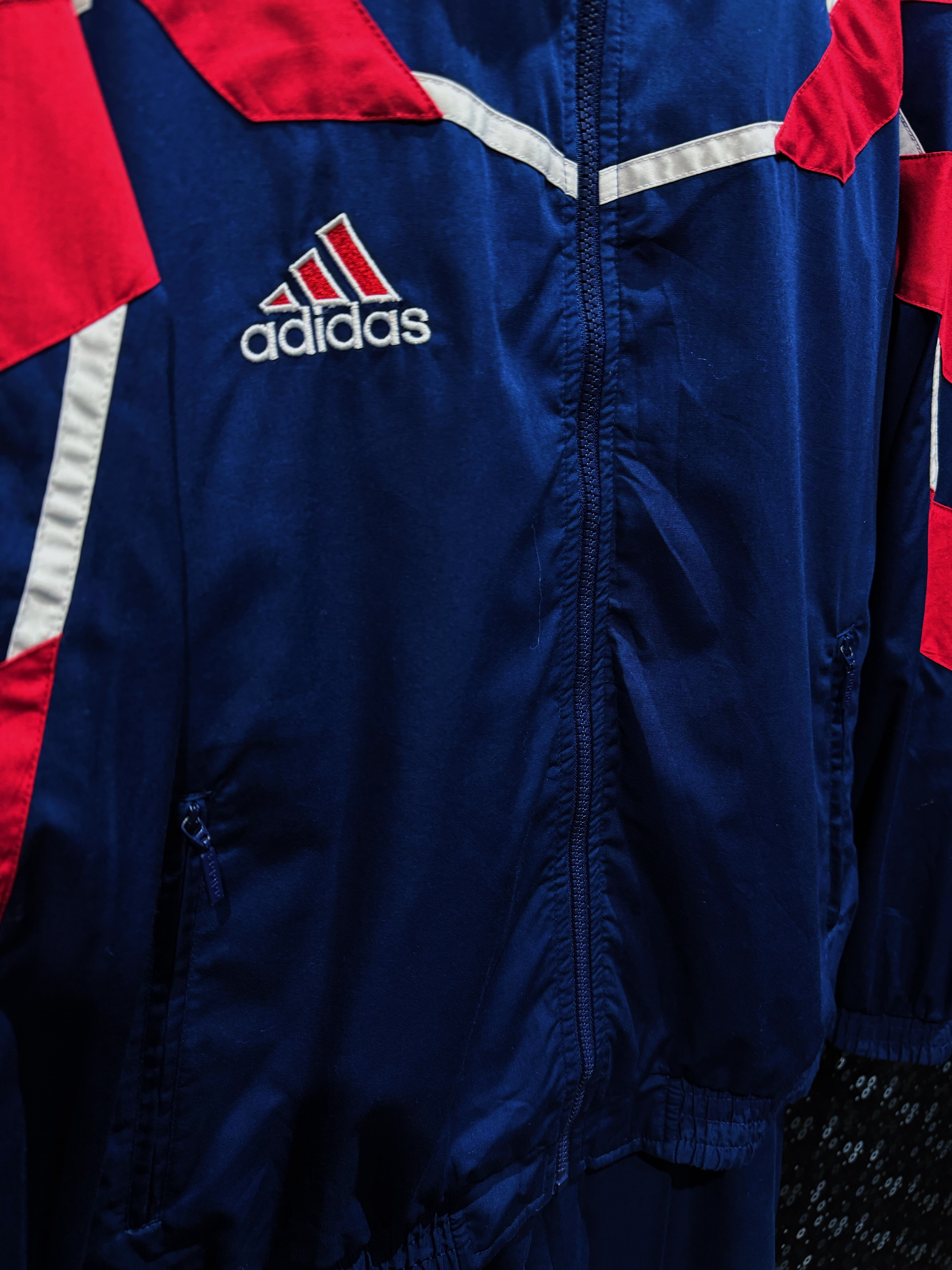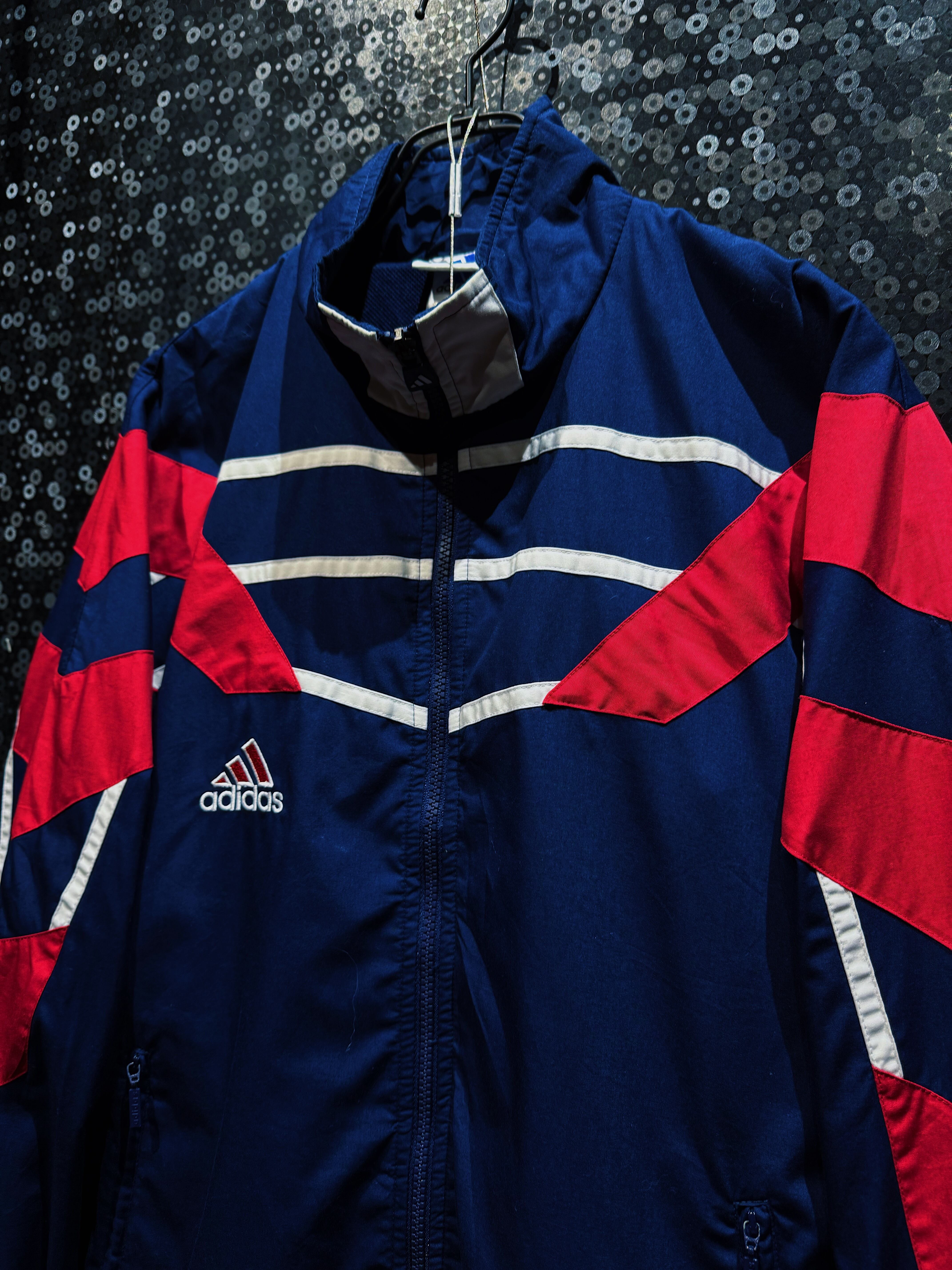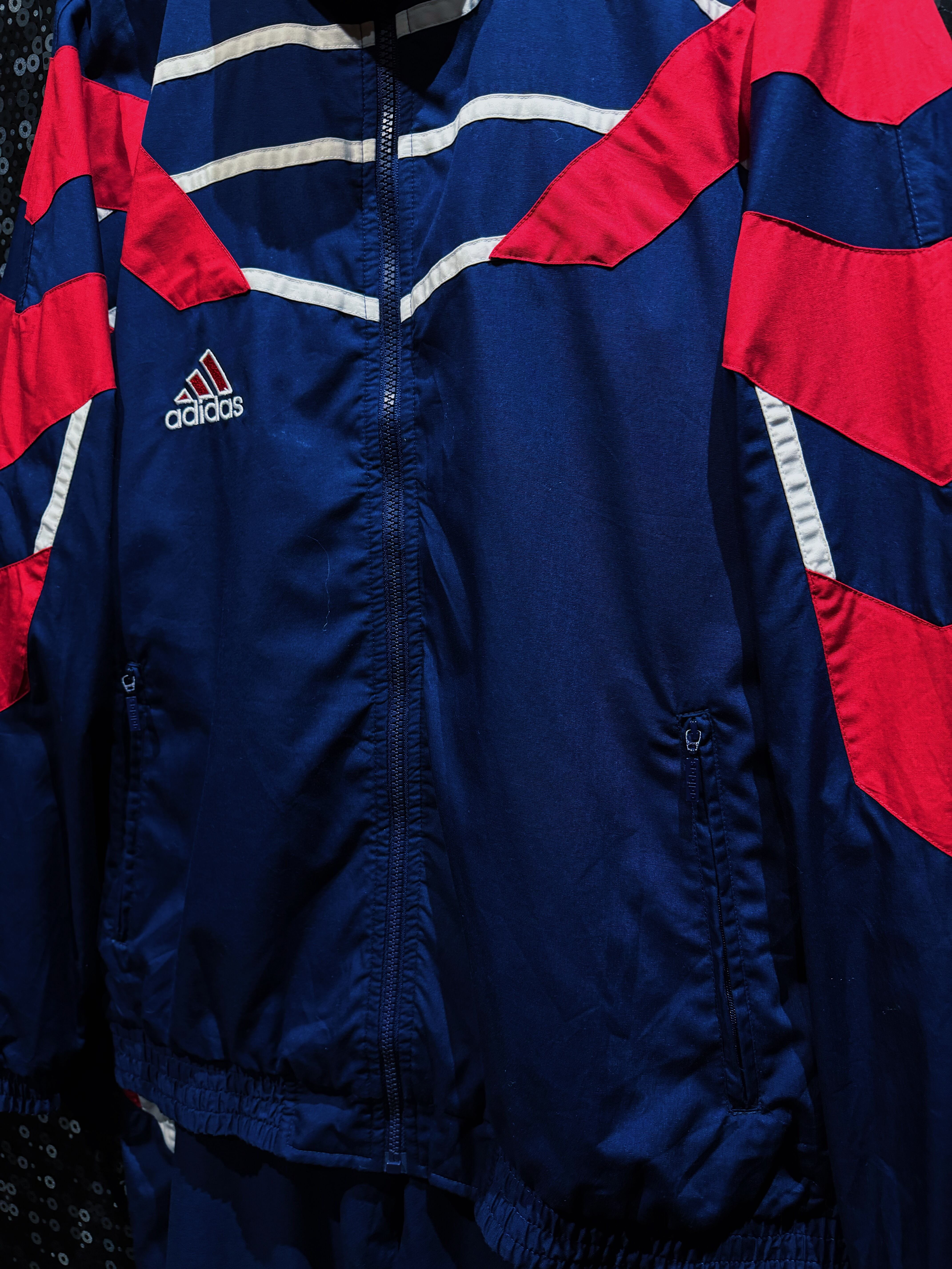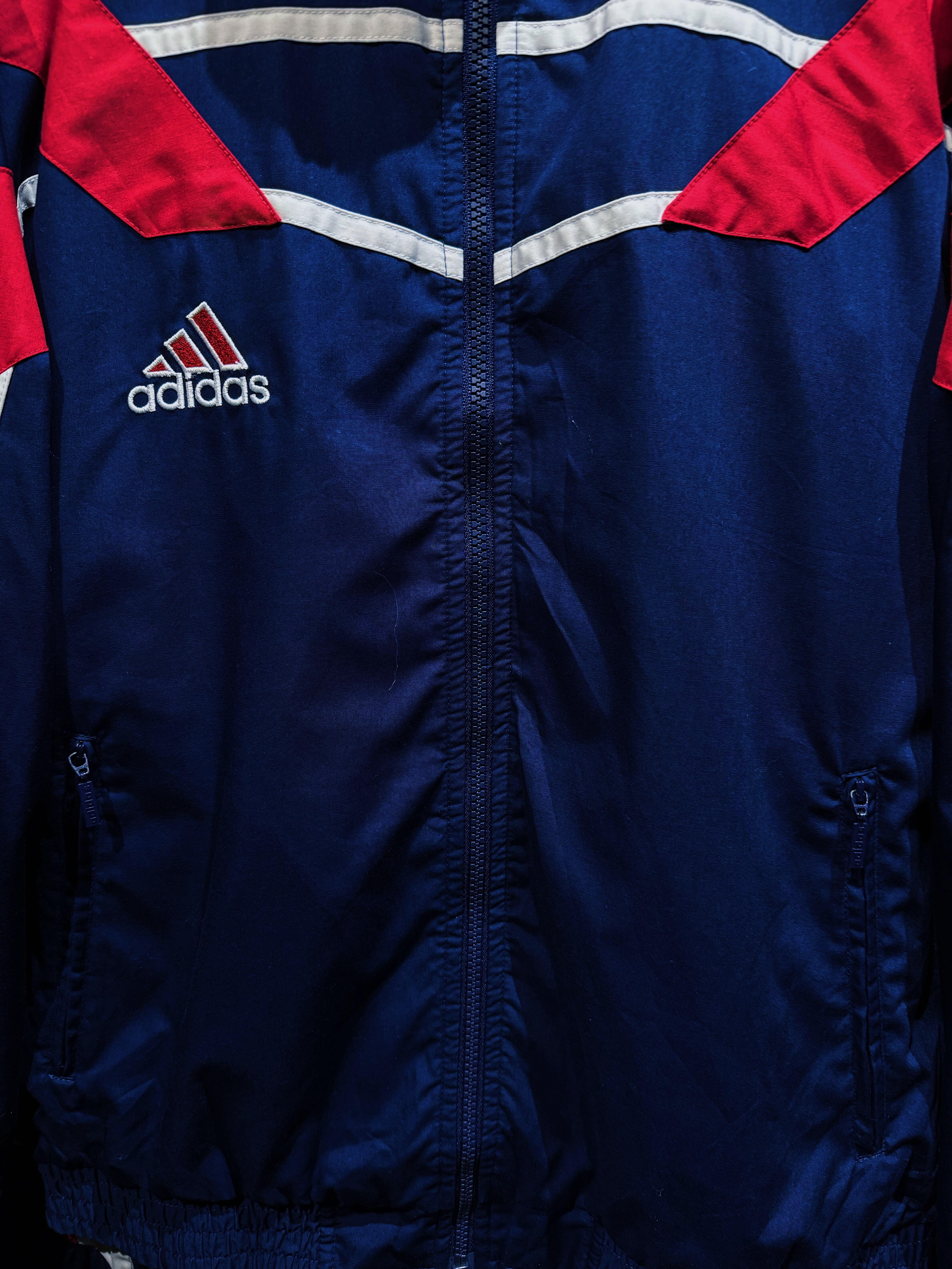 ネイビーを基調に、レッドとホワイトの切り替えを大胆に配置したadidasのナイロンセットアップ。