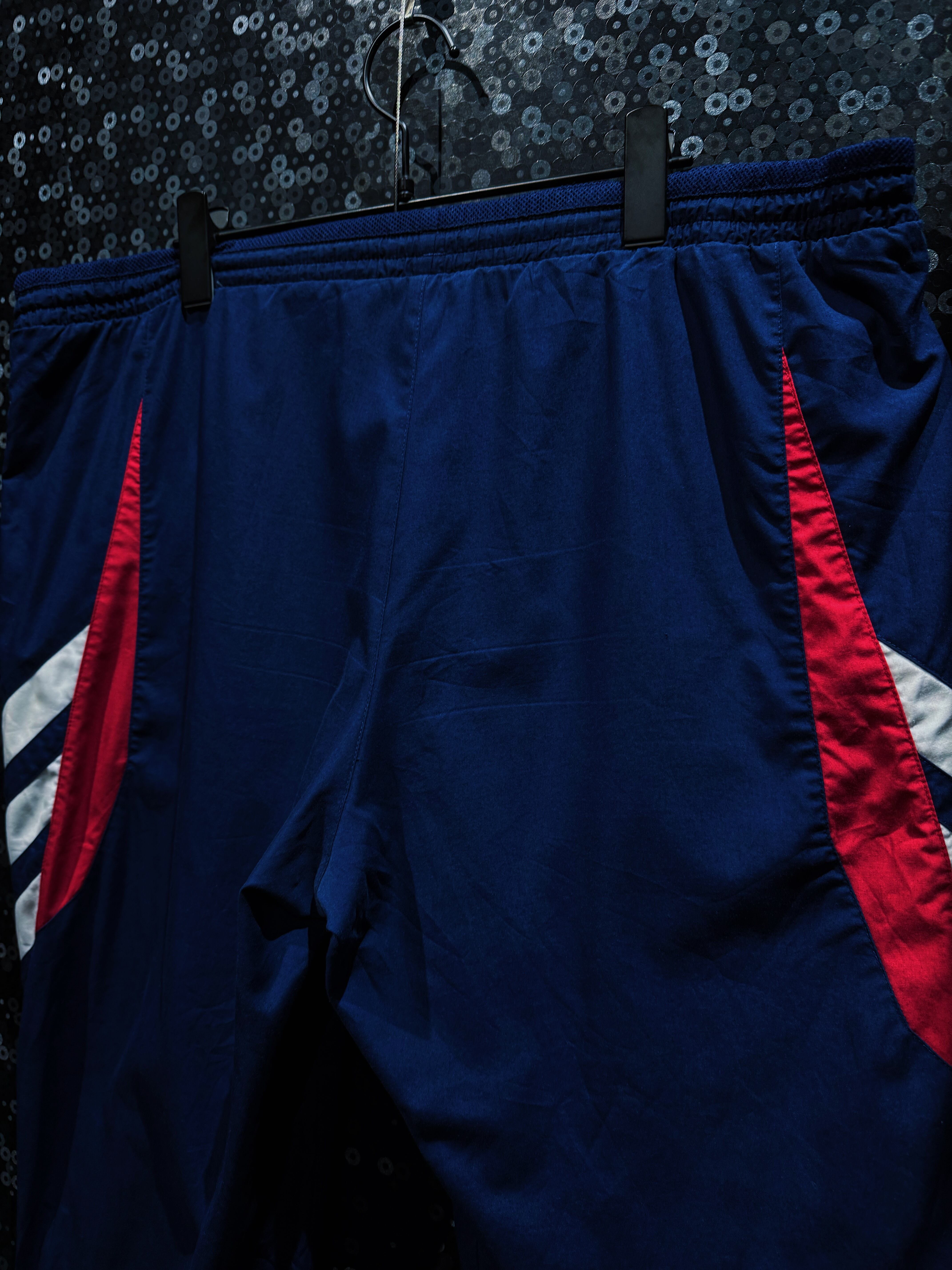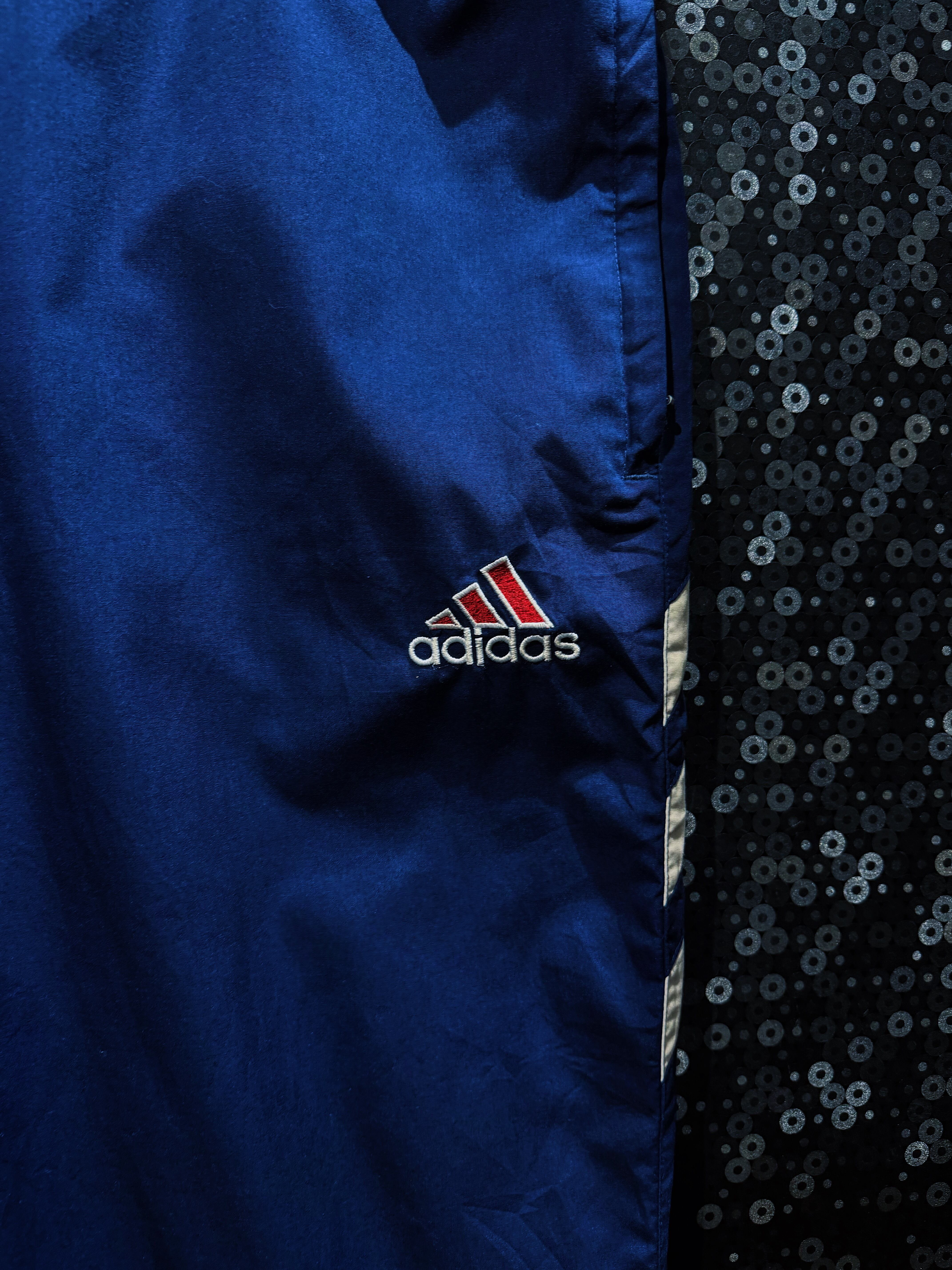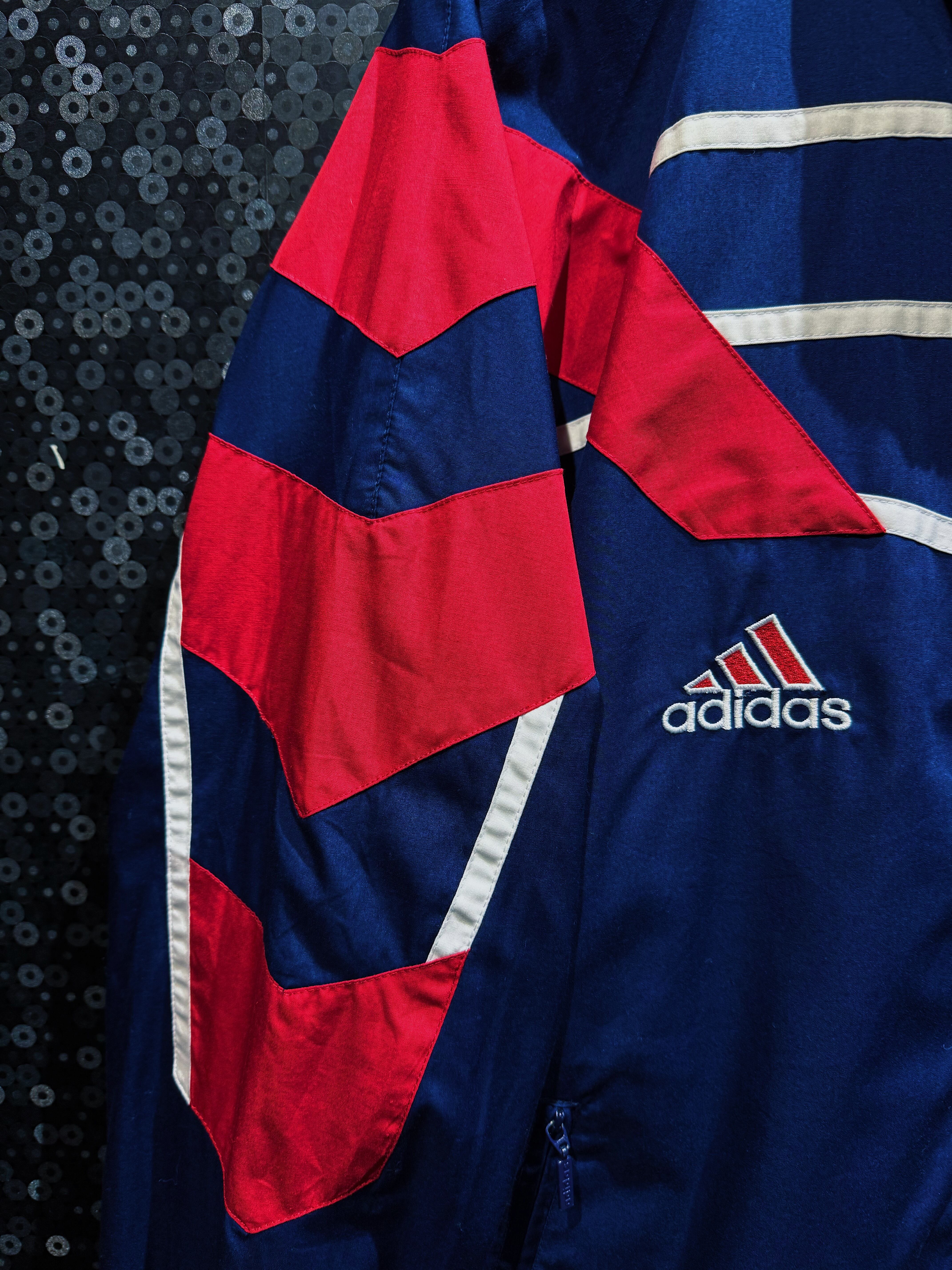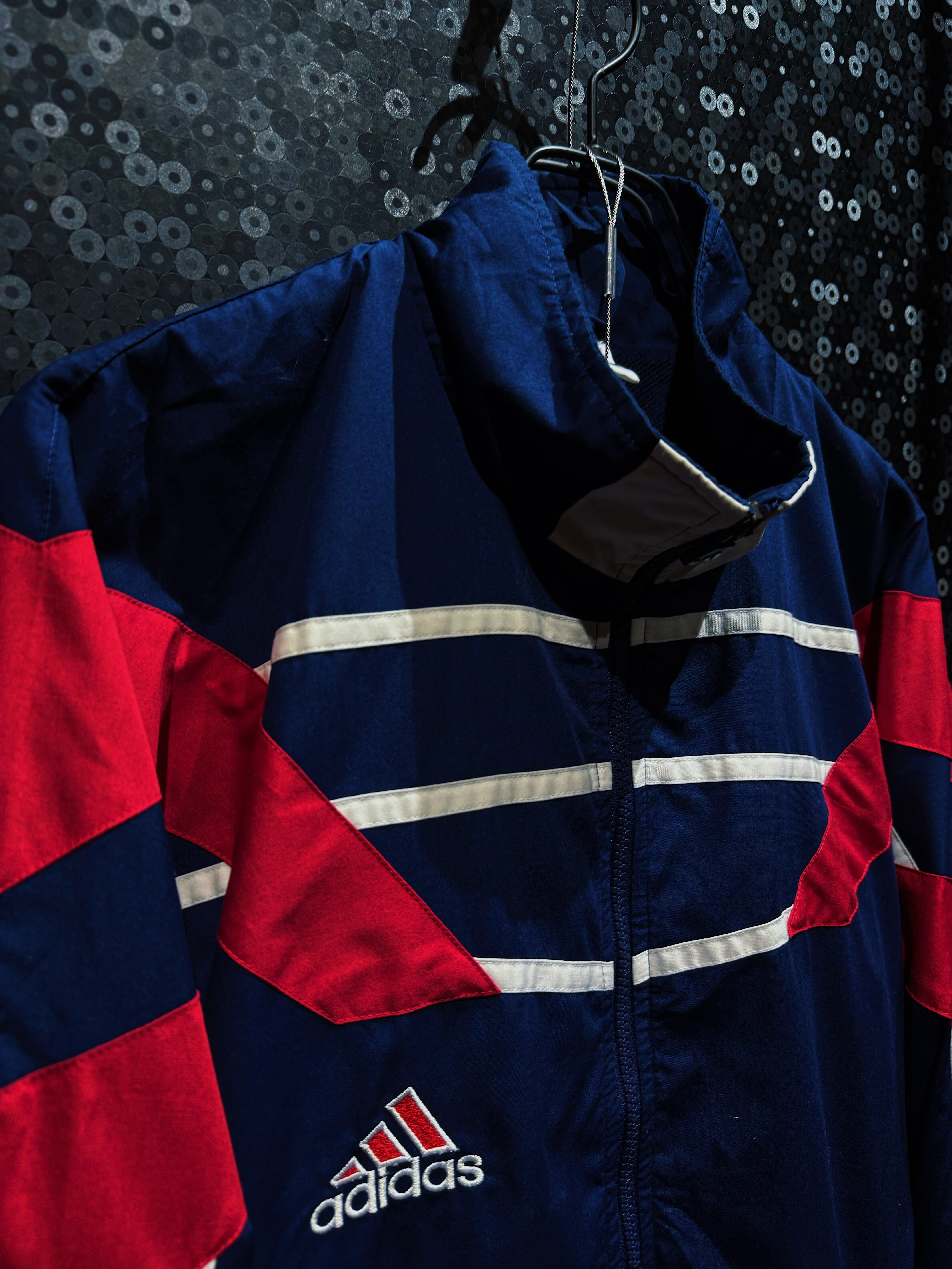 ネイビーを基調に、レッドとホワイトの切り替えを大胆に配置したadidasのナイロンセットアップ。