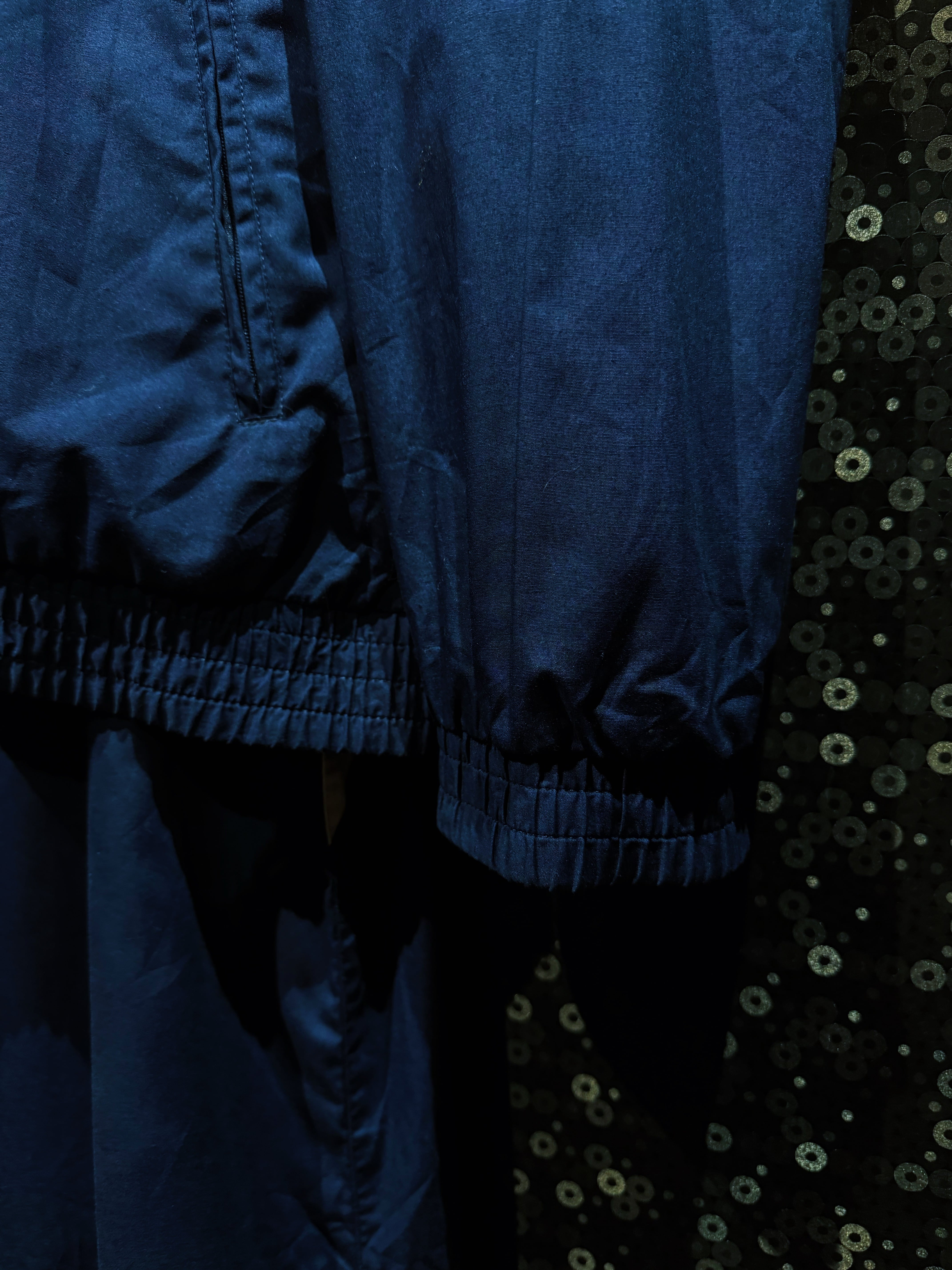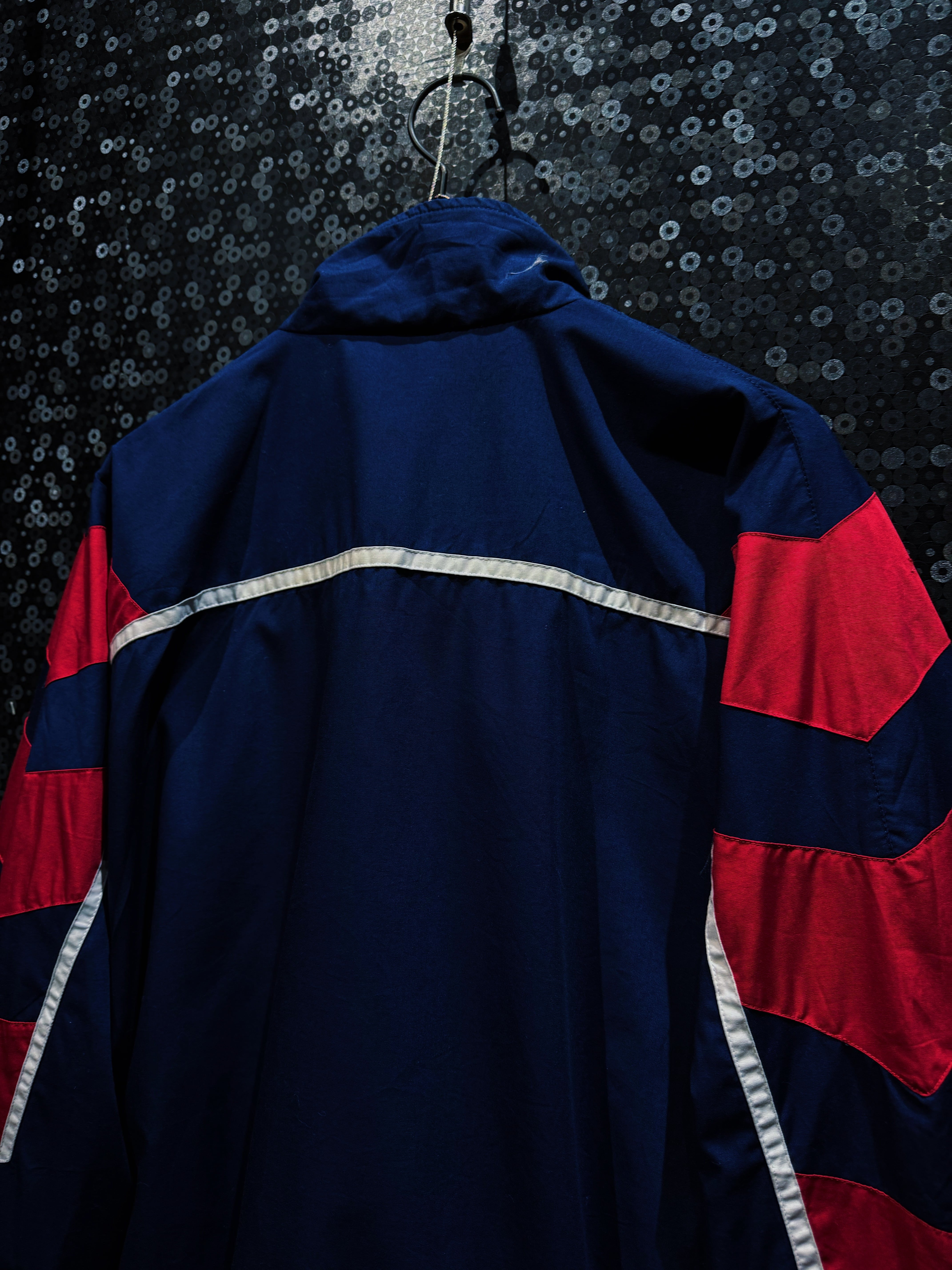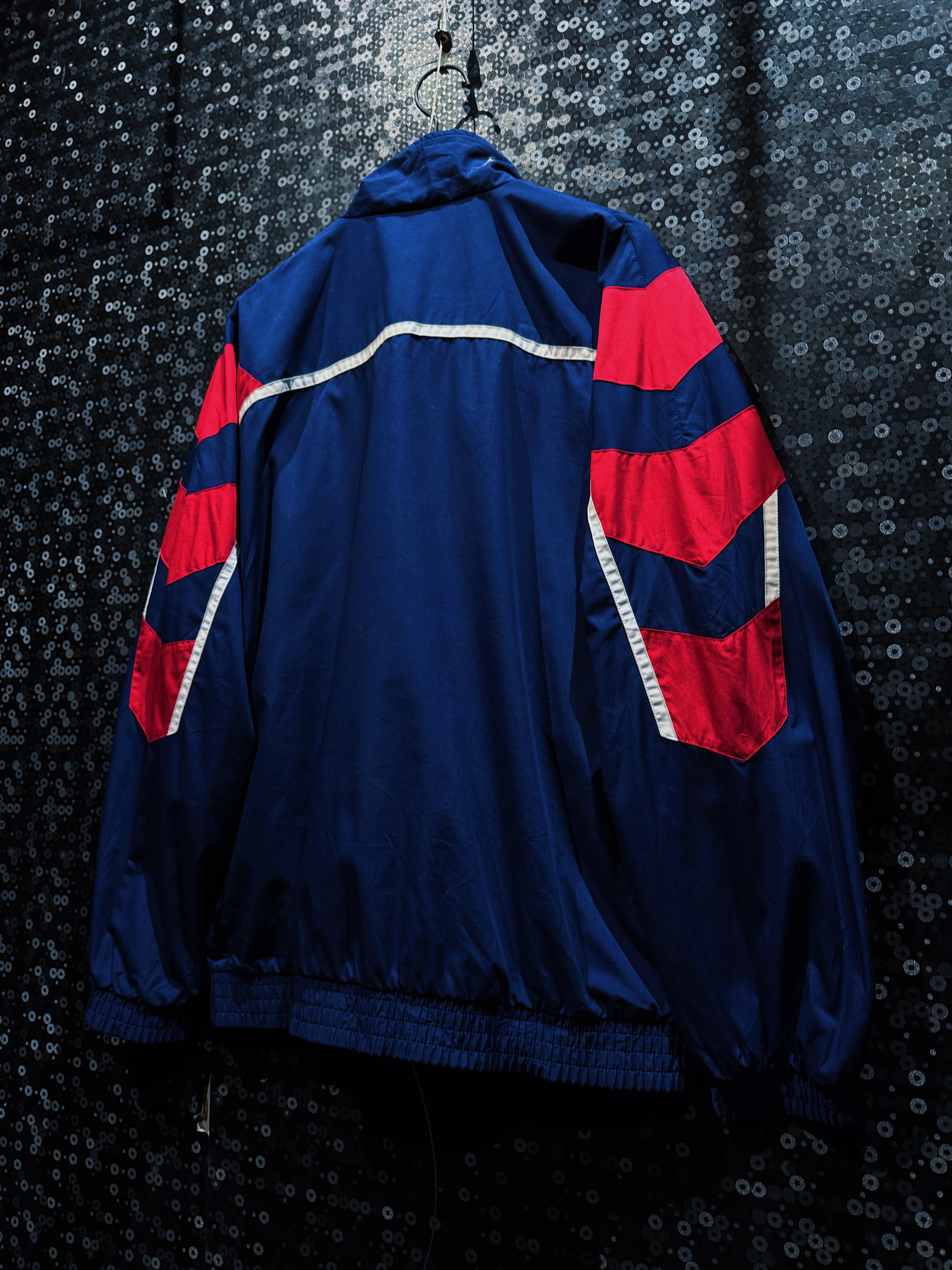 軽量なナイロン素材に、裏地付きの構造。風を受けても形が崩れにくく、当時のトレーニングウェアとしての実用性も高い仕様。