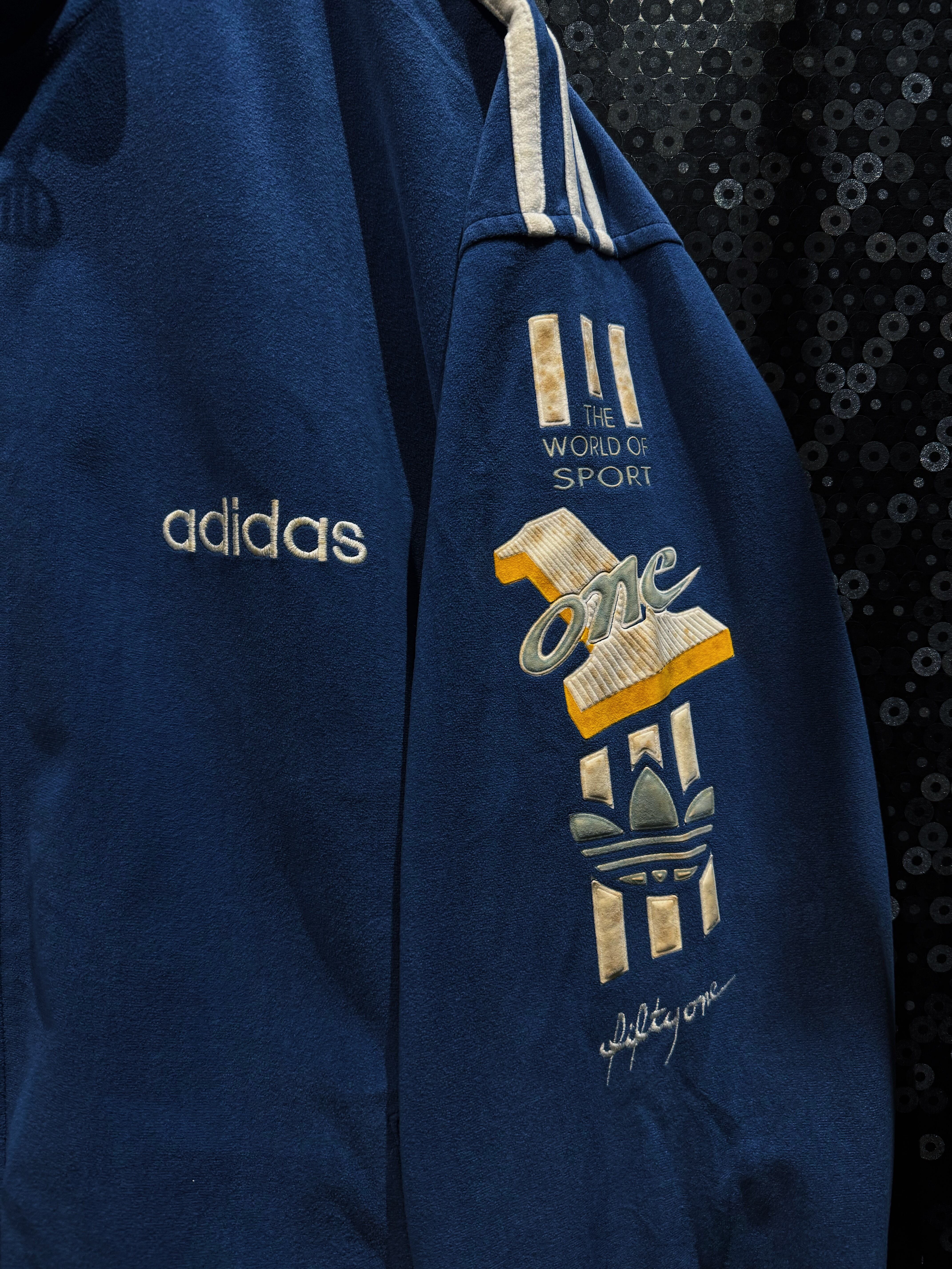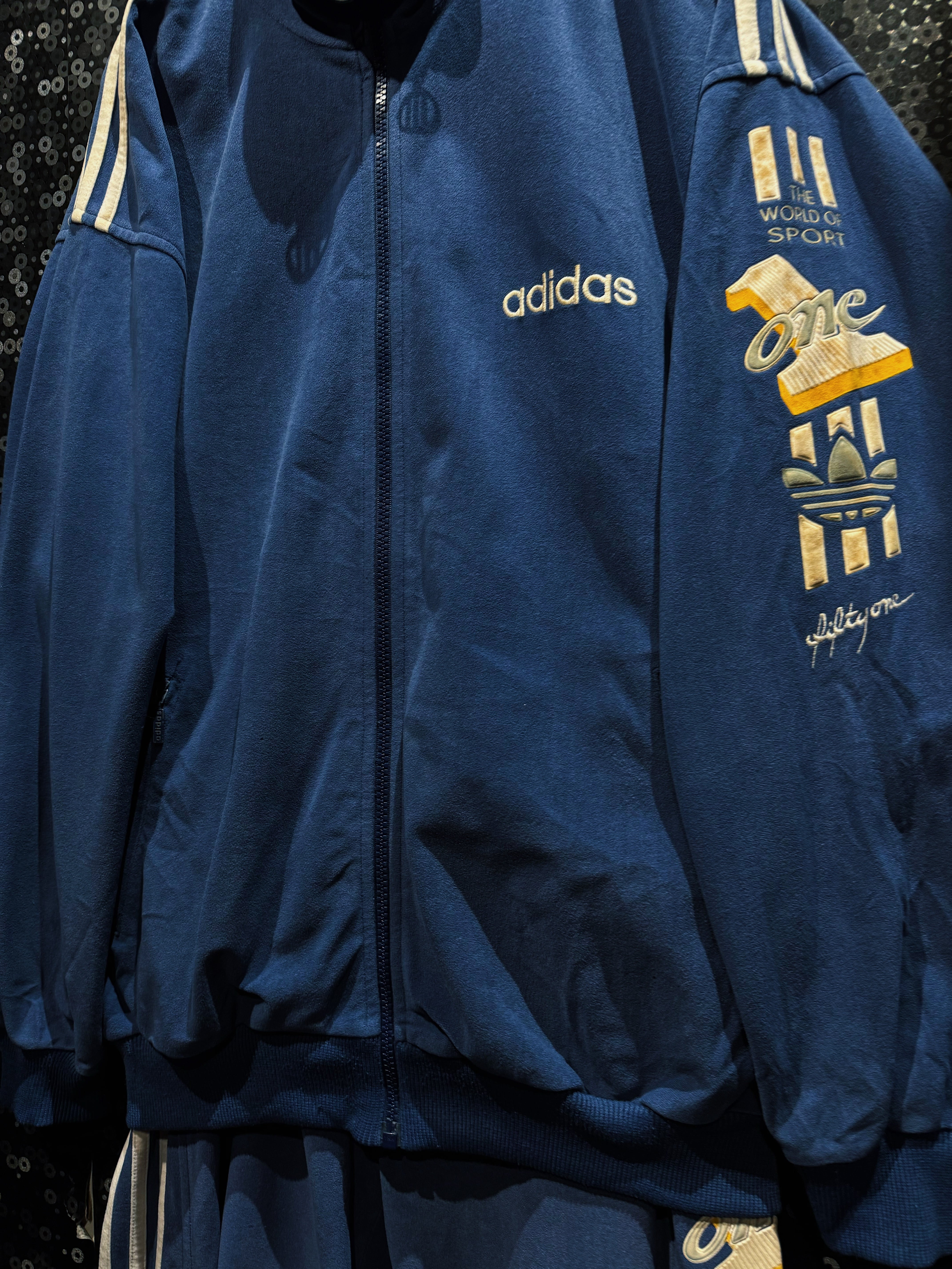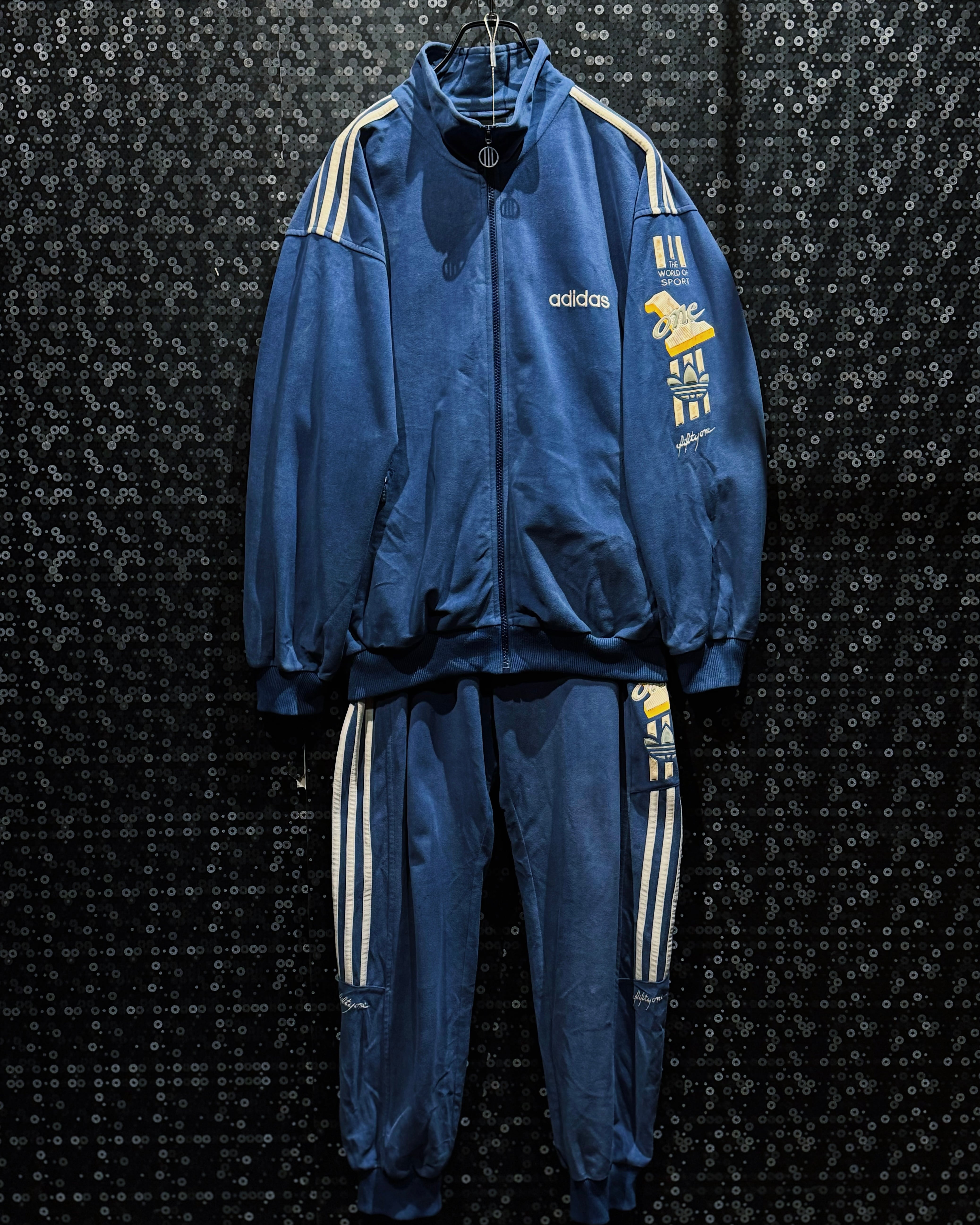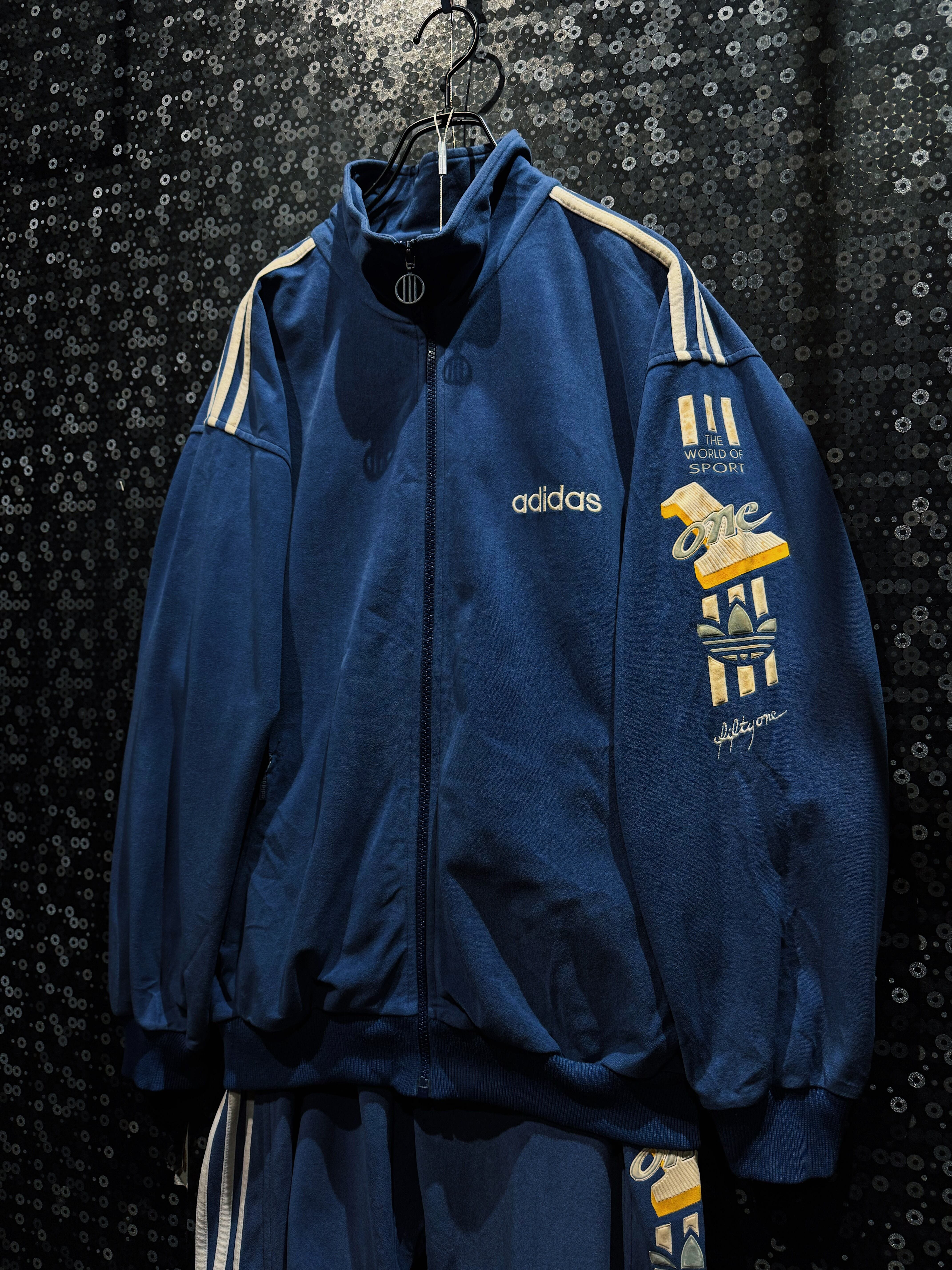 最大の特徴は、ジャケット・パンツ双方に施された「THE WORLD OF SPORT」「ONE」の立体刺繍グラフィックで、80〜90年代adidasらしいアスリート讃歌的なメッセージ性が色濃く表れている一着。