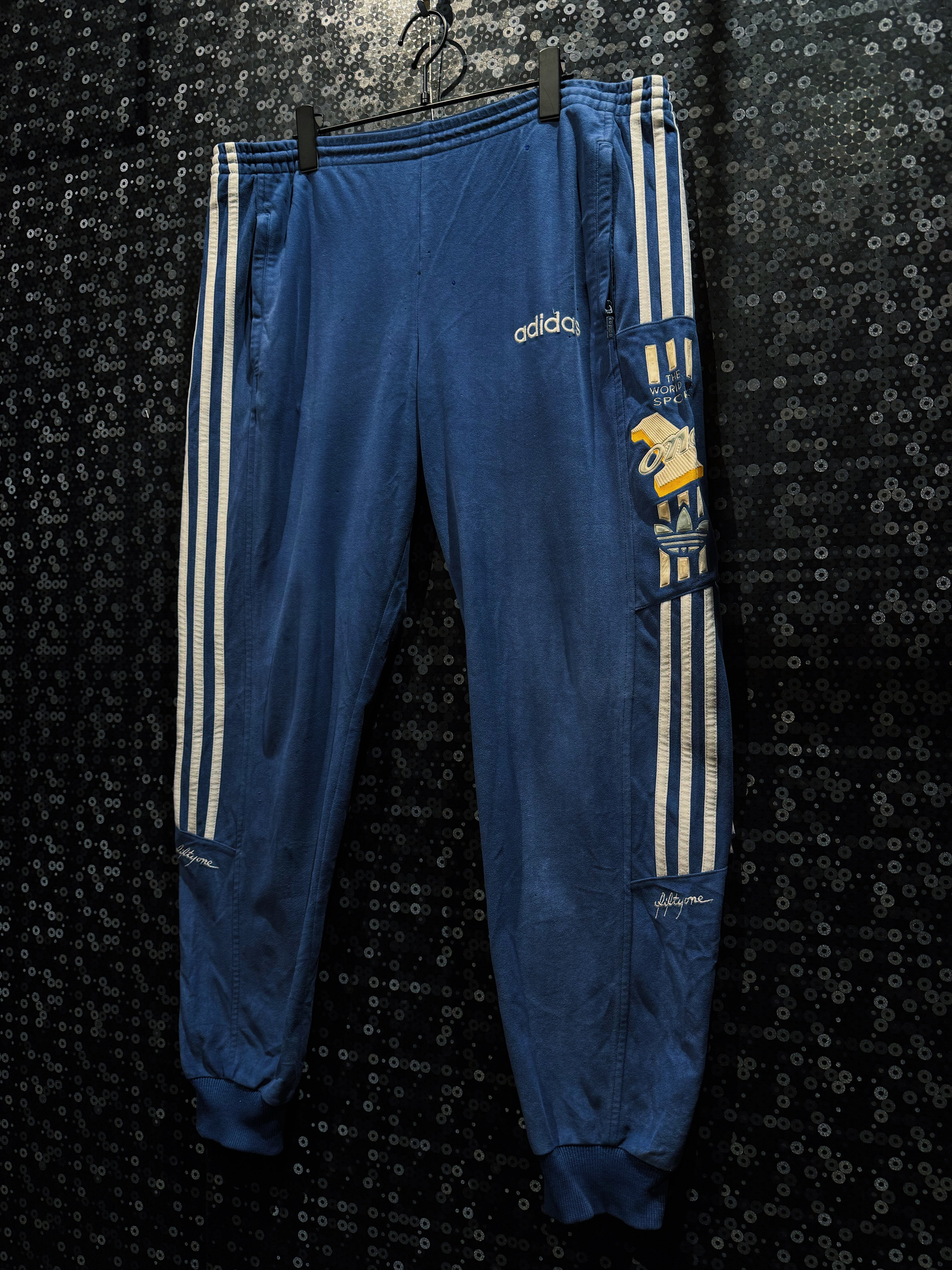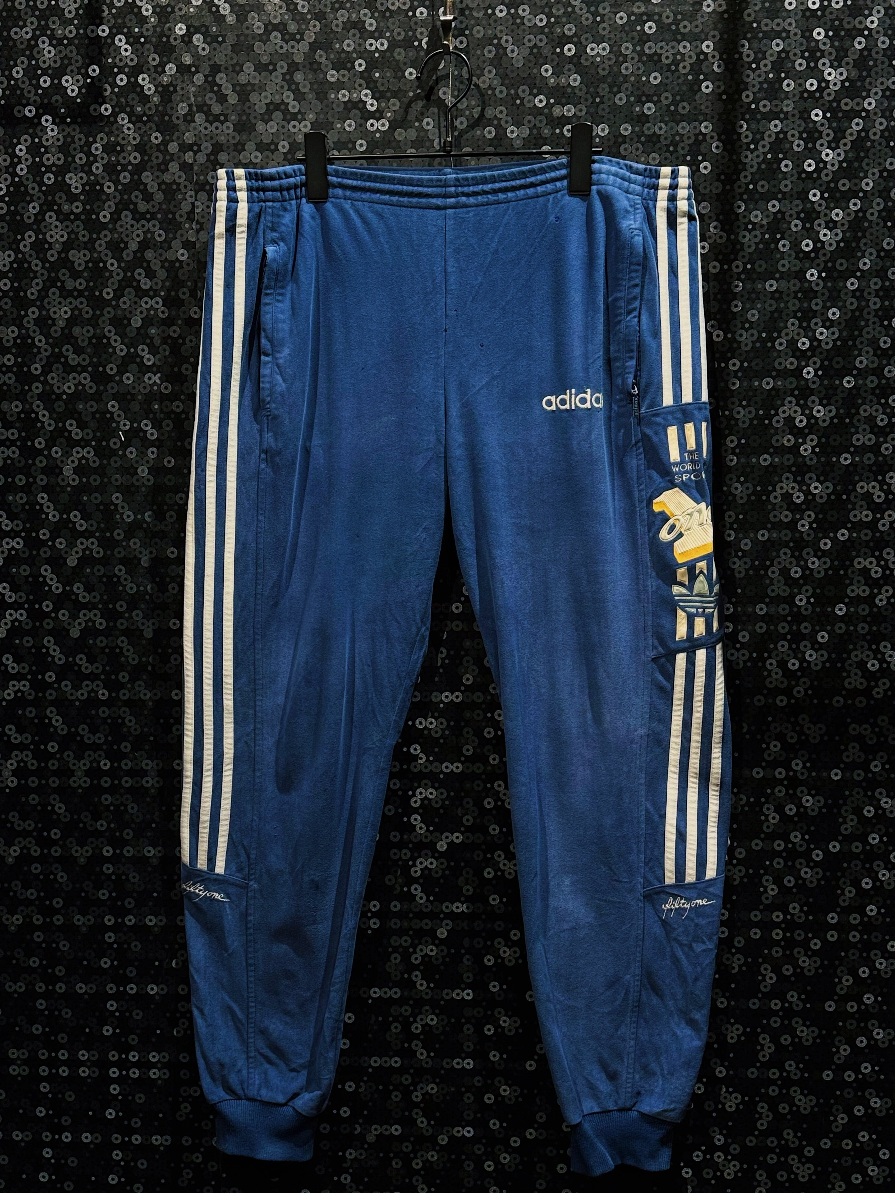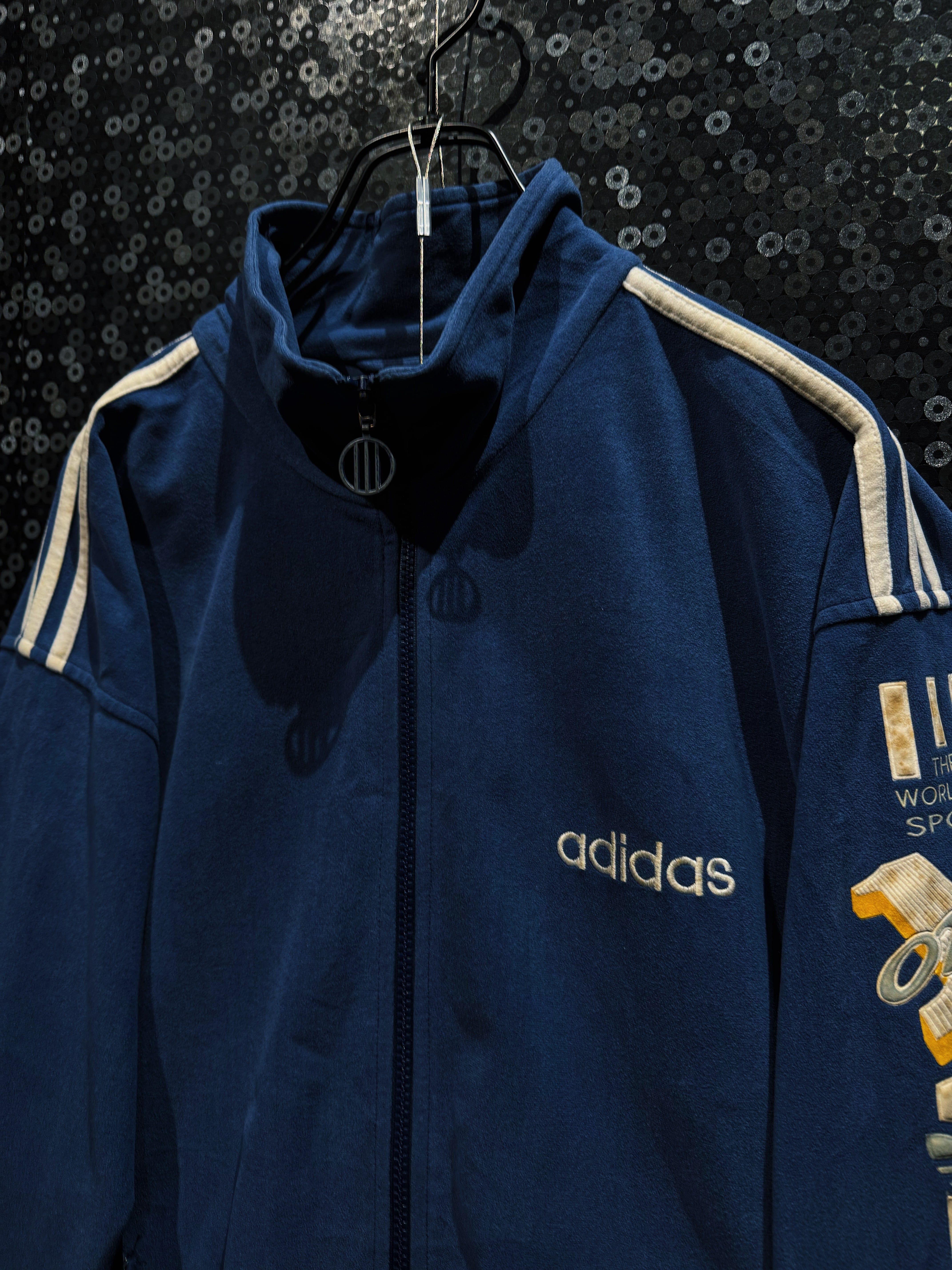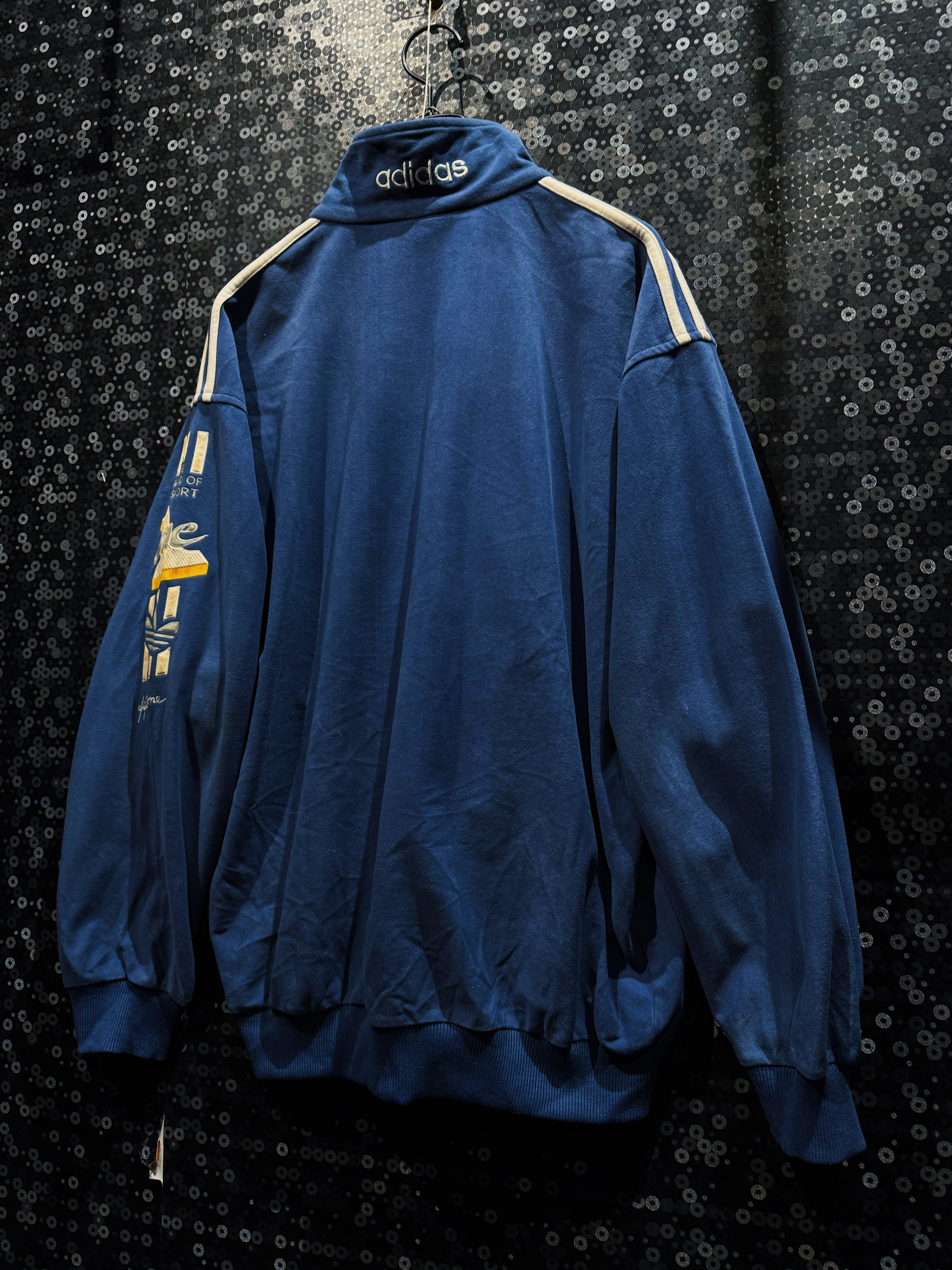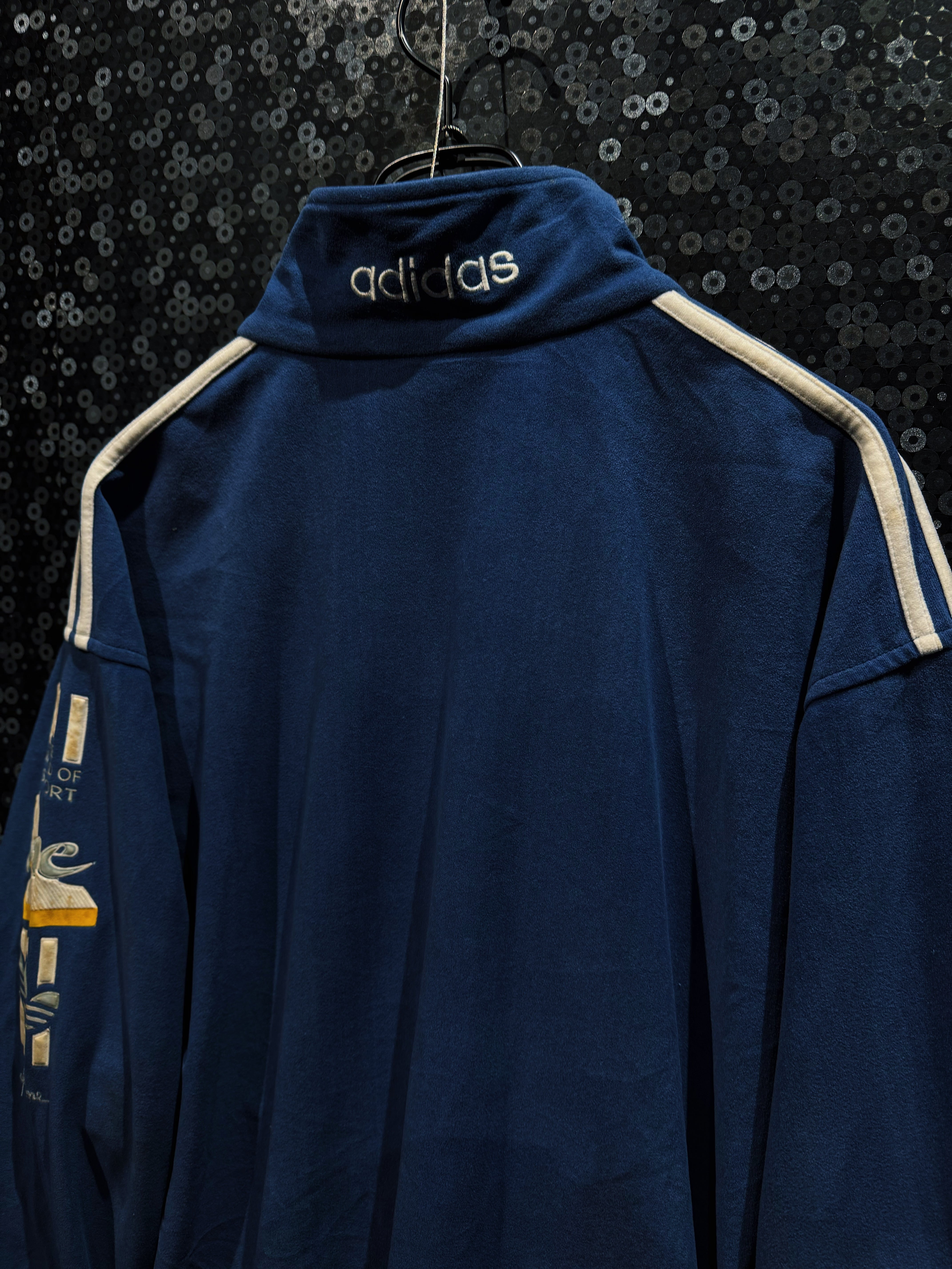 最大の特徴は、ジャケット・パンツ双方に施された「THE WORLD OF SPORT」「ONE」の立体刺繍グラフィックで、80〜90年代adidasらしいアスリート讃歌的なメッセージ性が色濃く表れている一着。