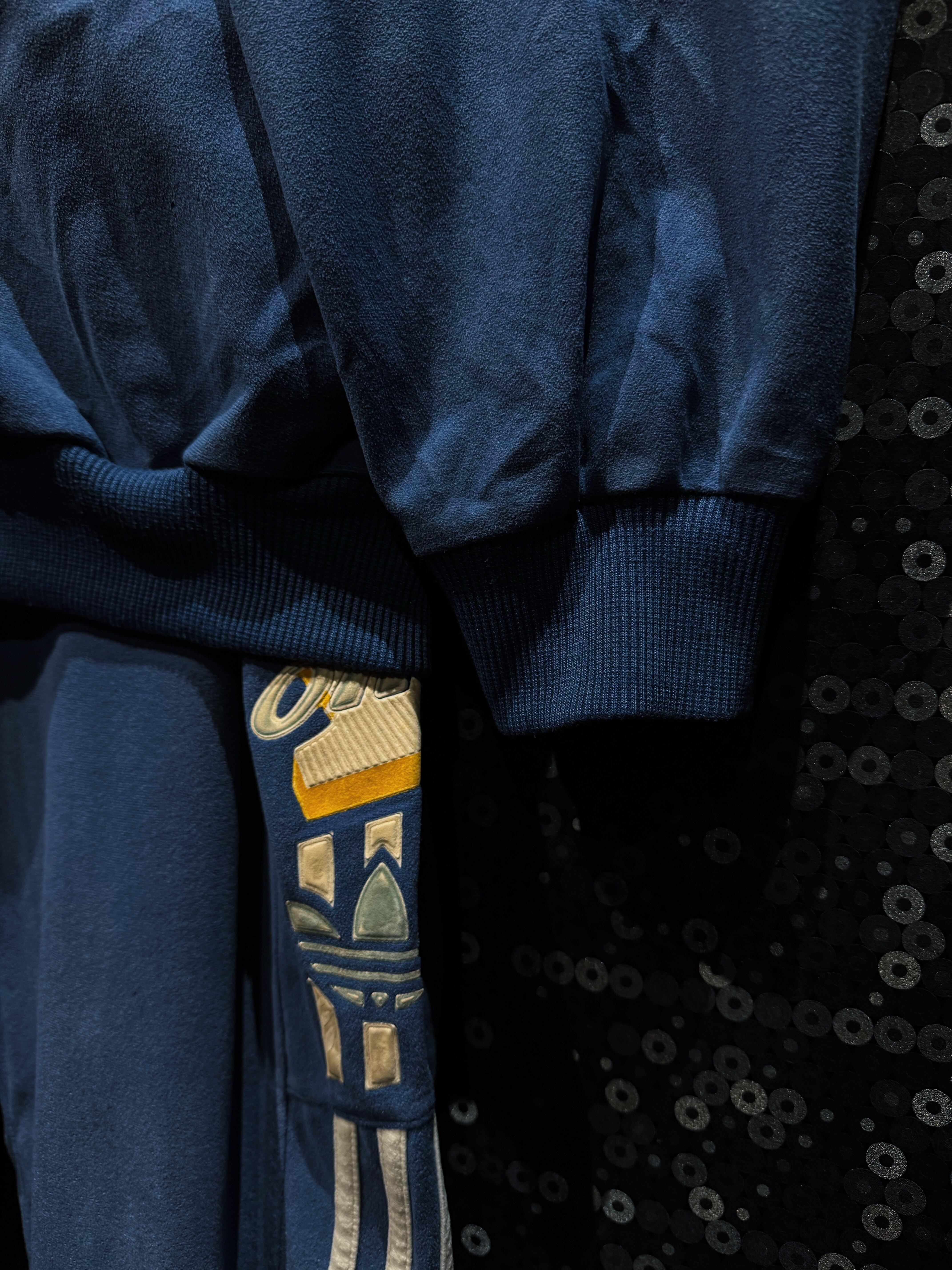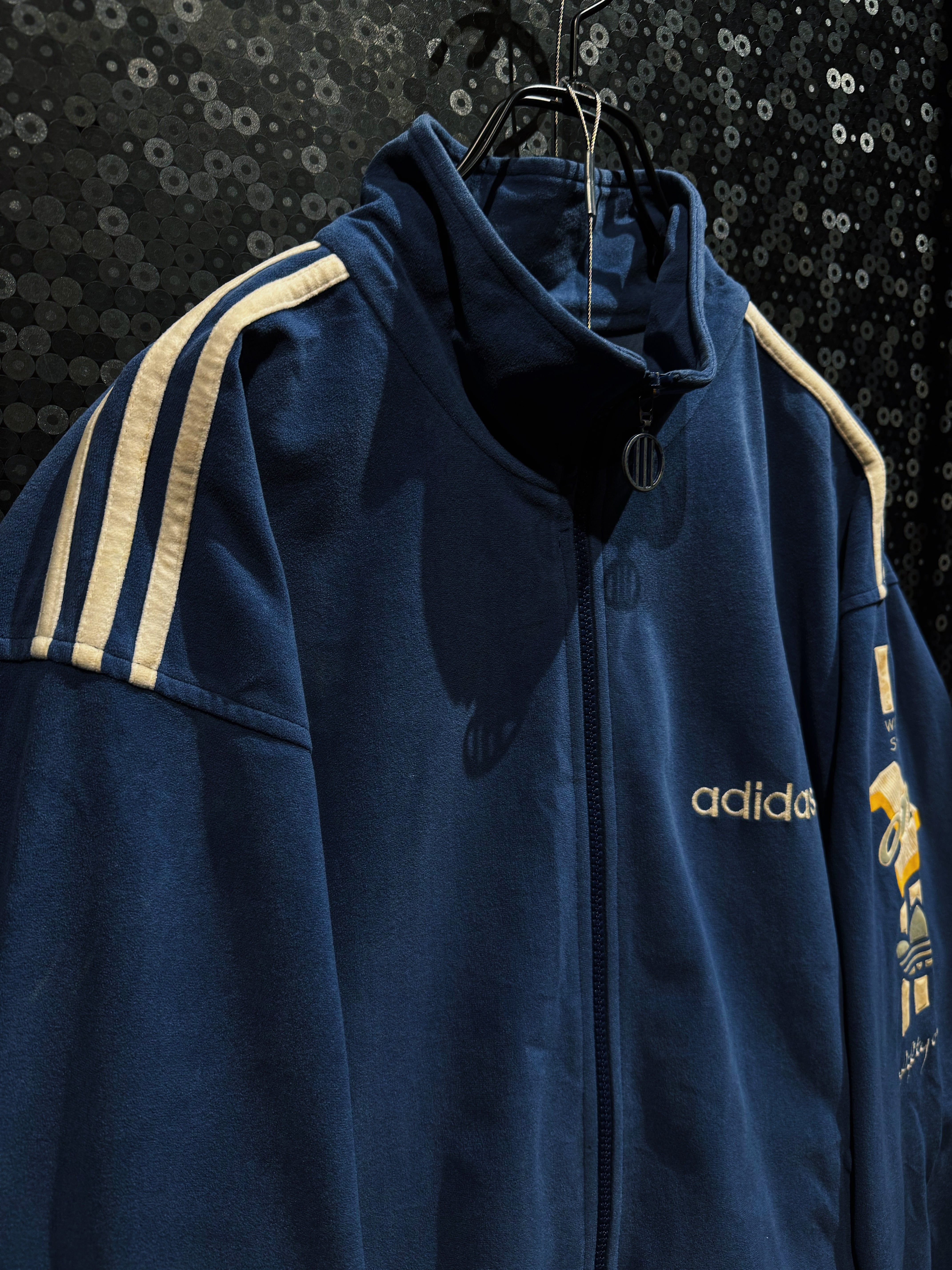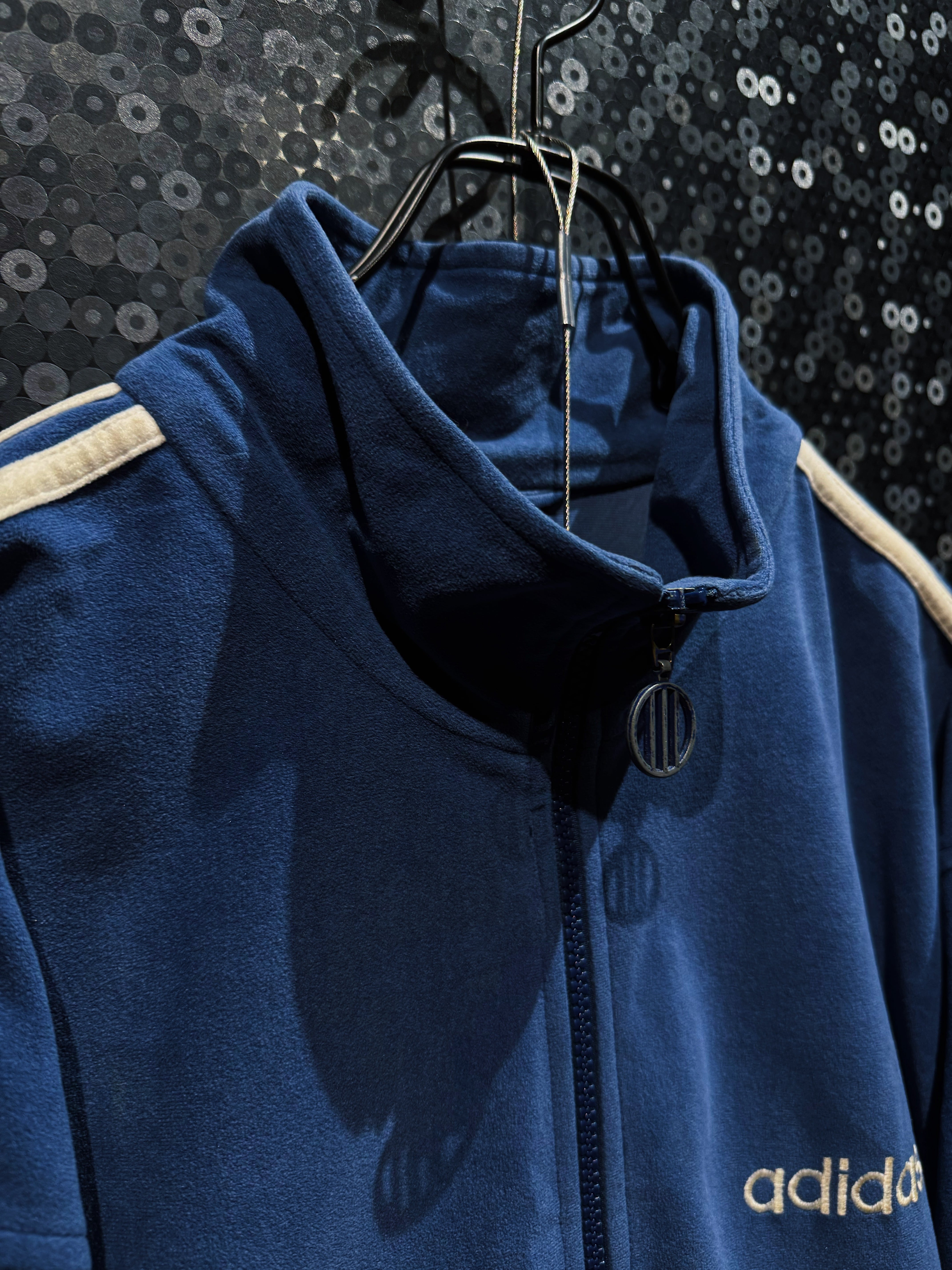 深みのあるネイビーブルーを基調に、クラシックなベロア素材で構成されたadidasのヴィンテージセットアップ。