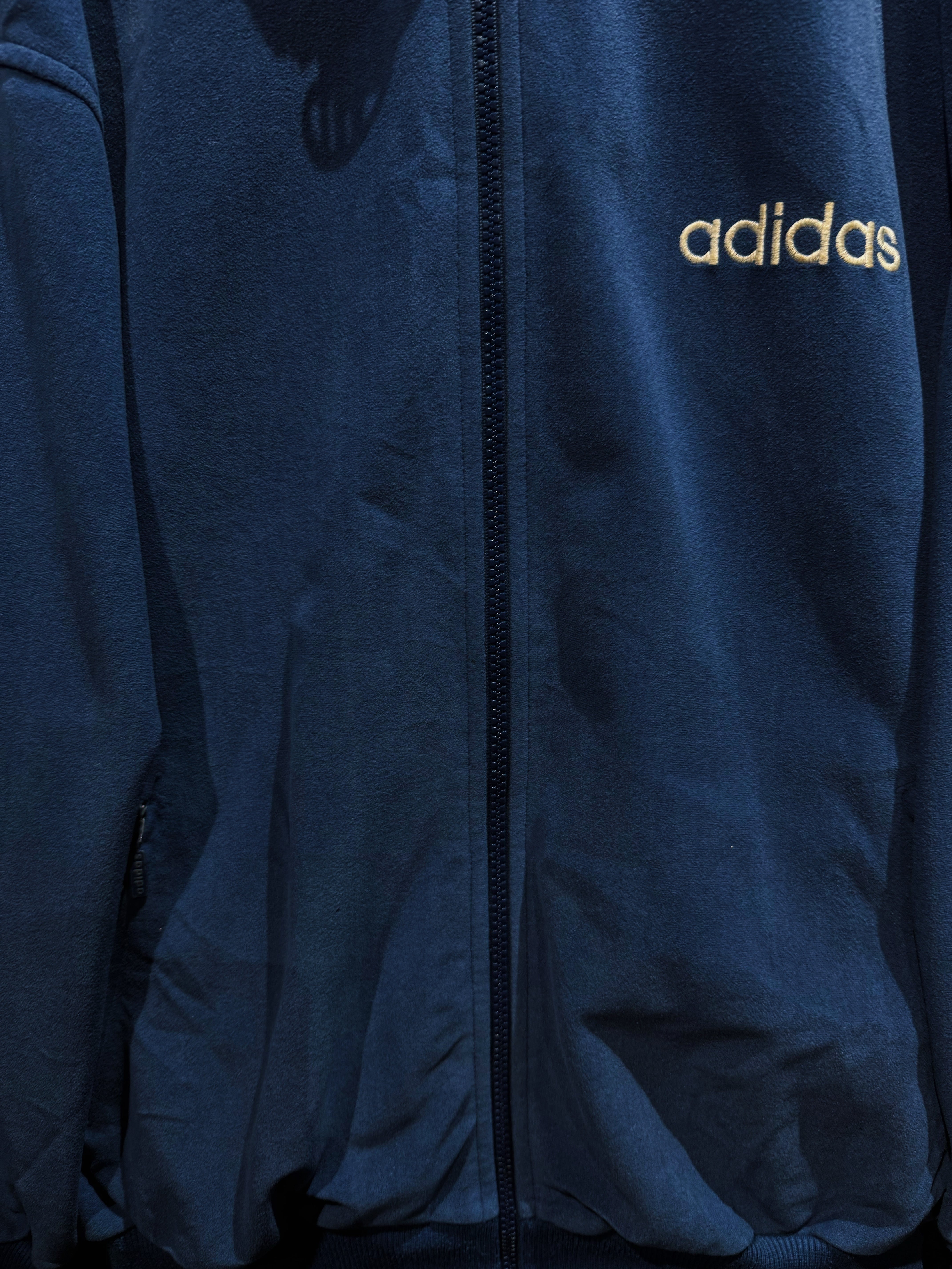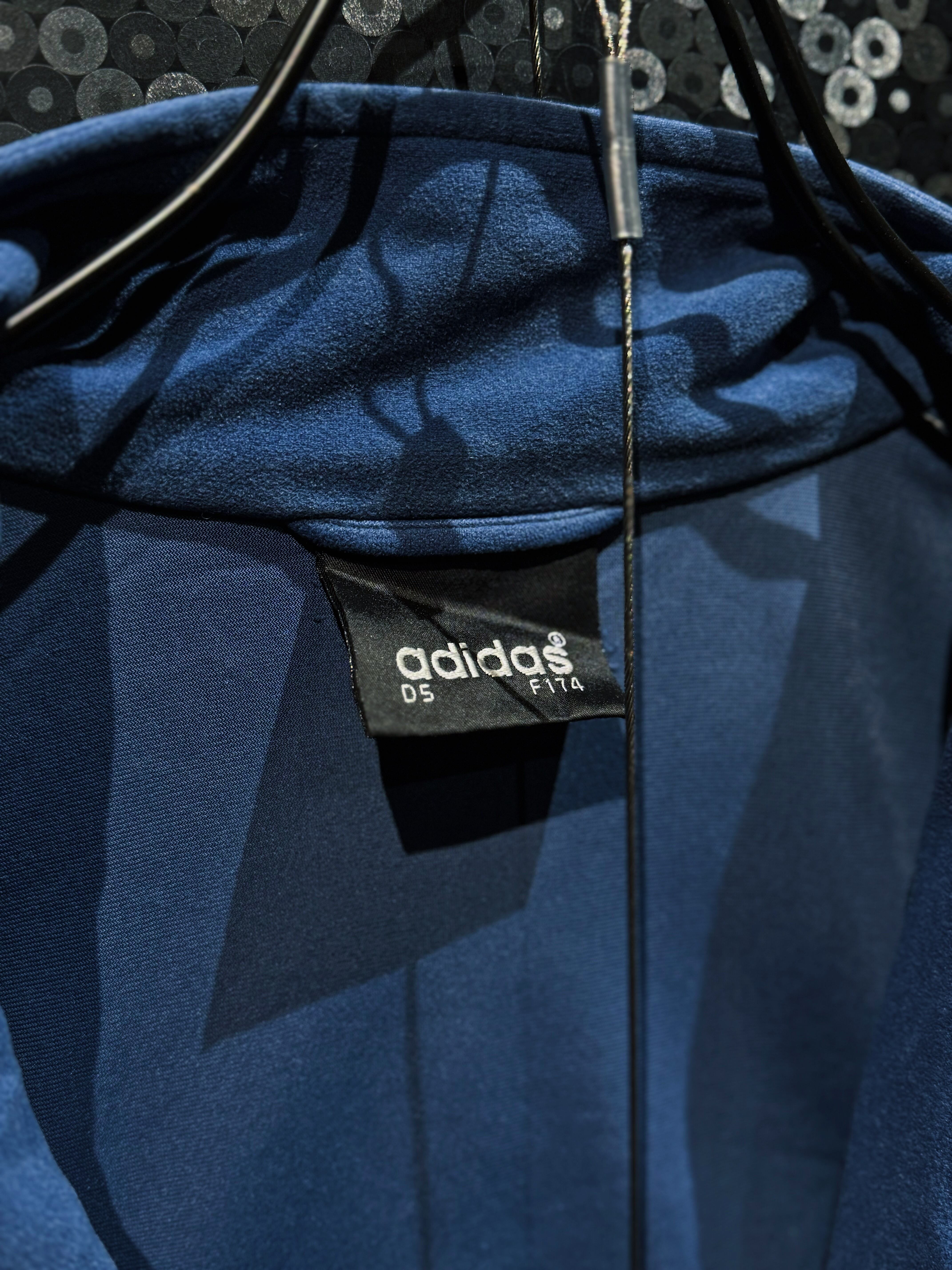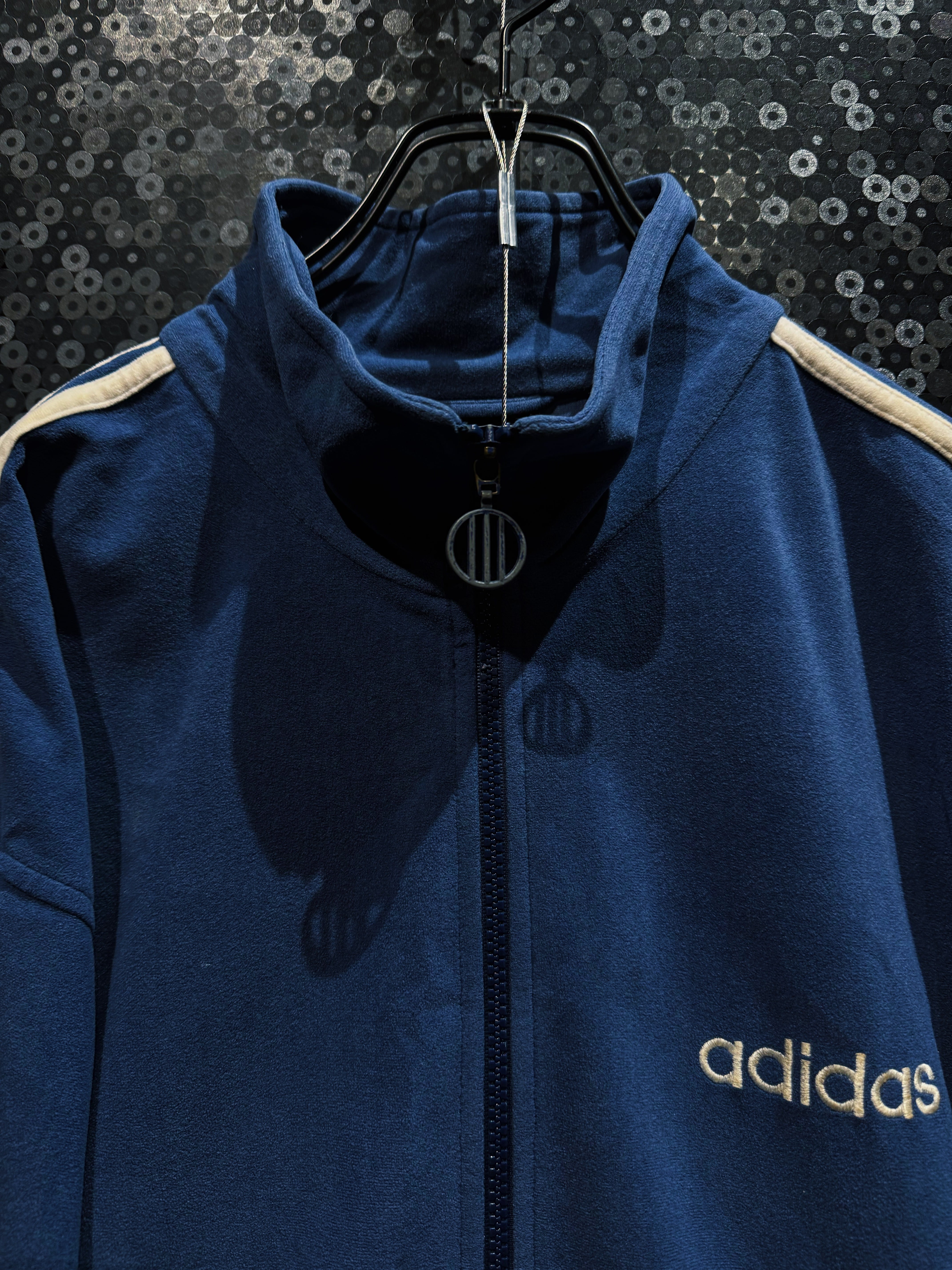 深みのあるネイビーブルーを基調に、クラシックなベロア素材で構成されたadidasのヴィンテージセットアップ。