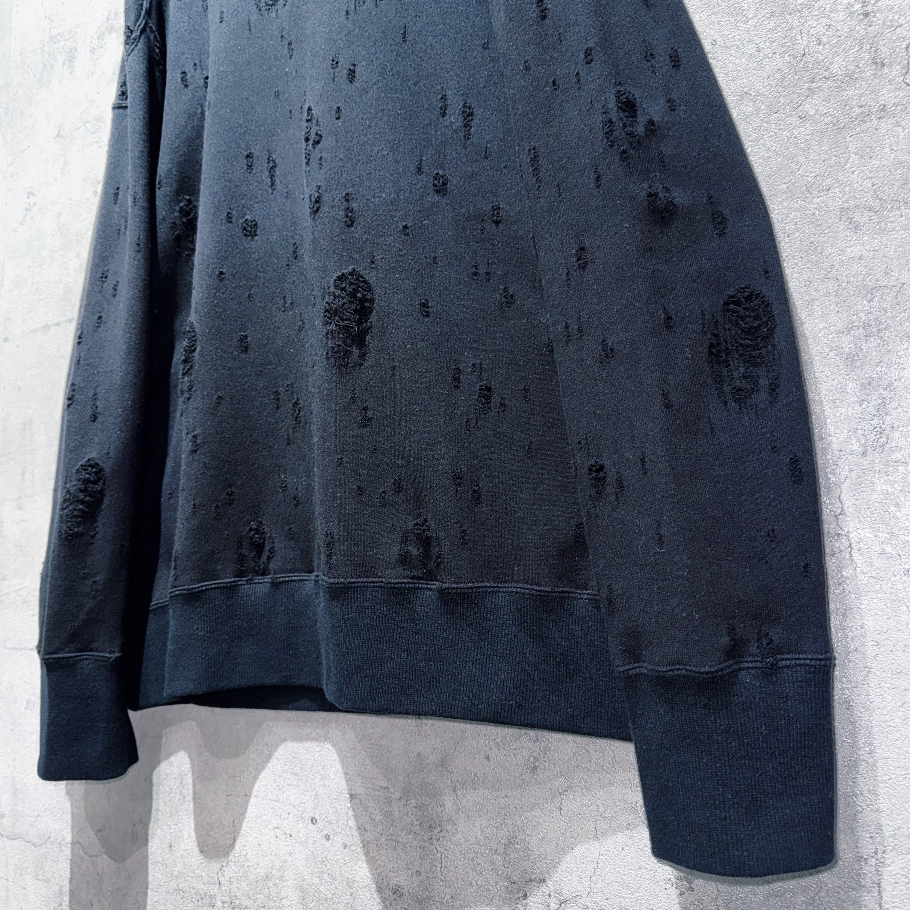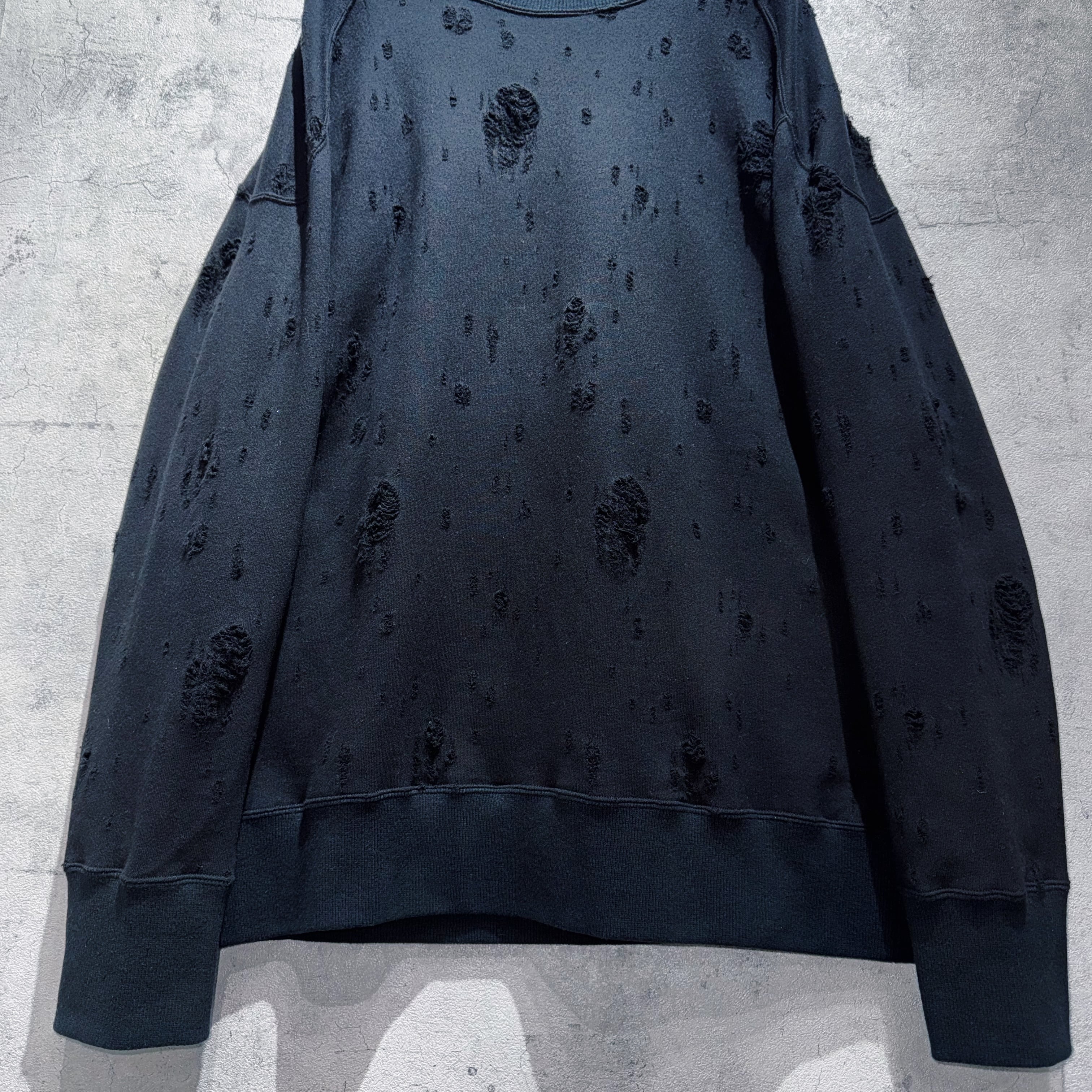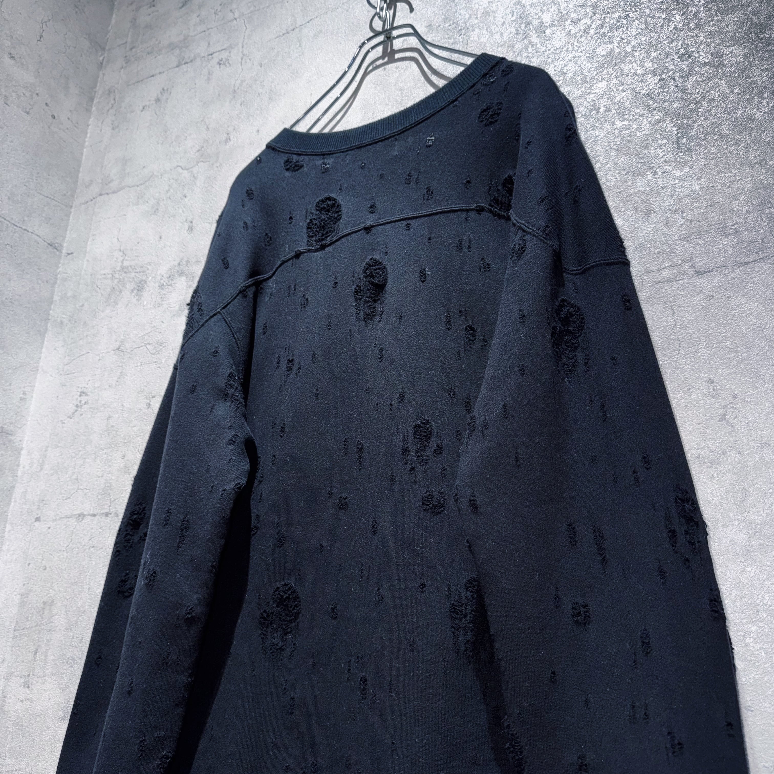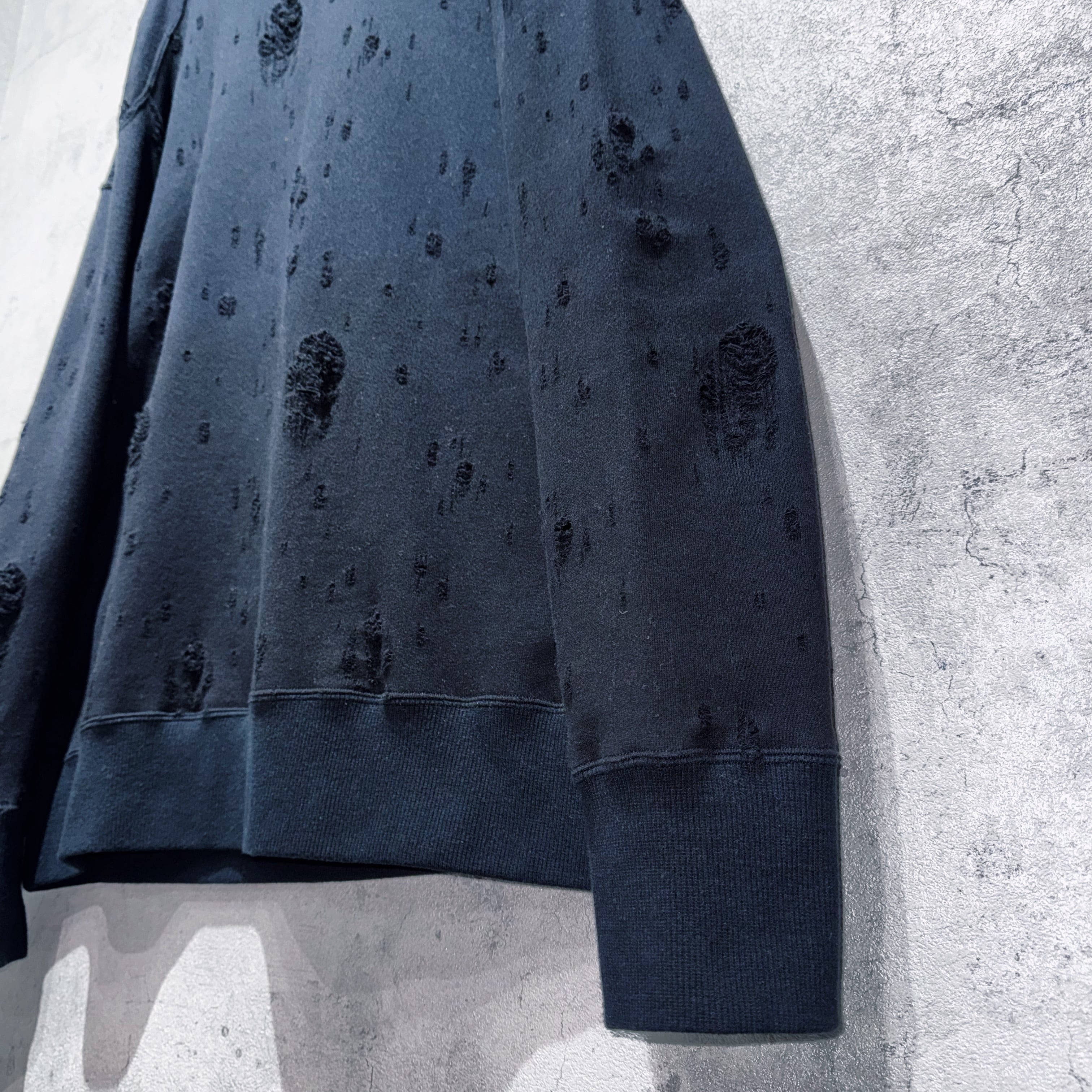 削ぎ落とされたブラック。そこに刻まれる、無数の“欠落”。ミニマルなクルーネックスウェットをベースに、全体へランダムに施されたダメージ加工が特徴。