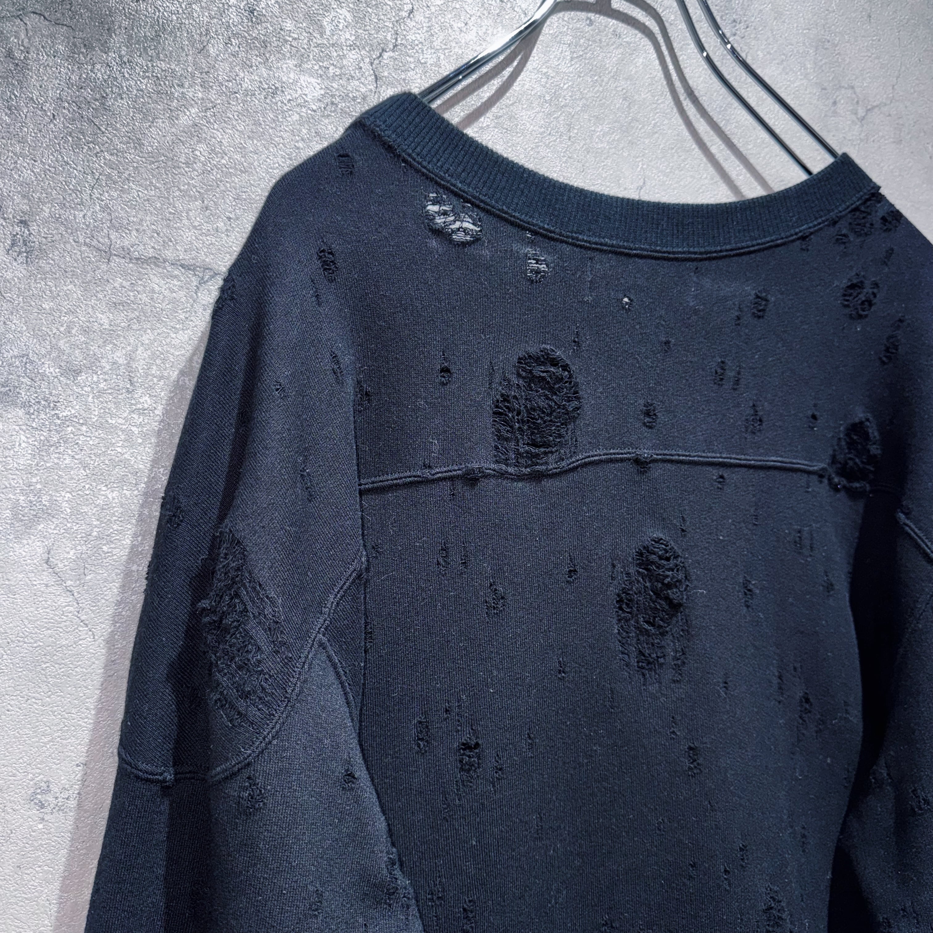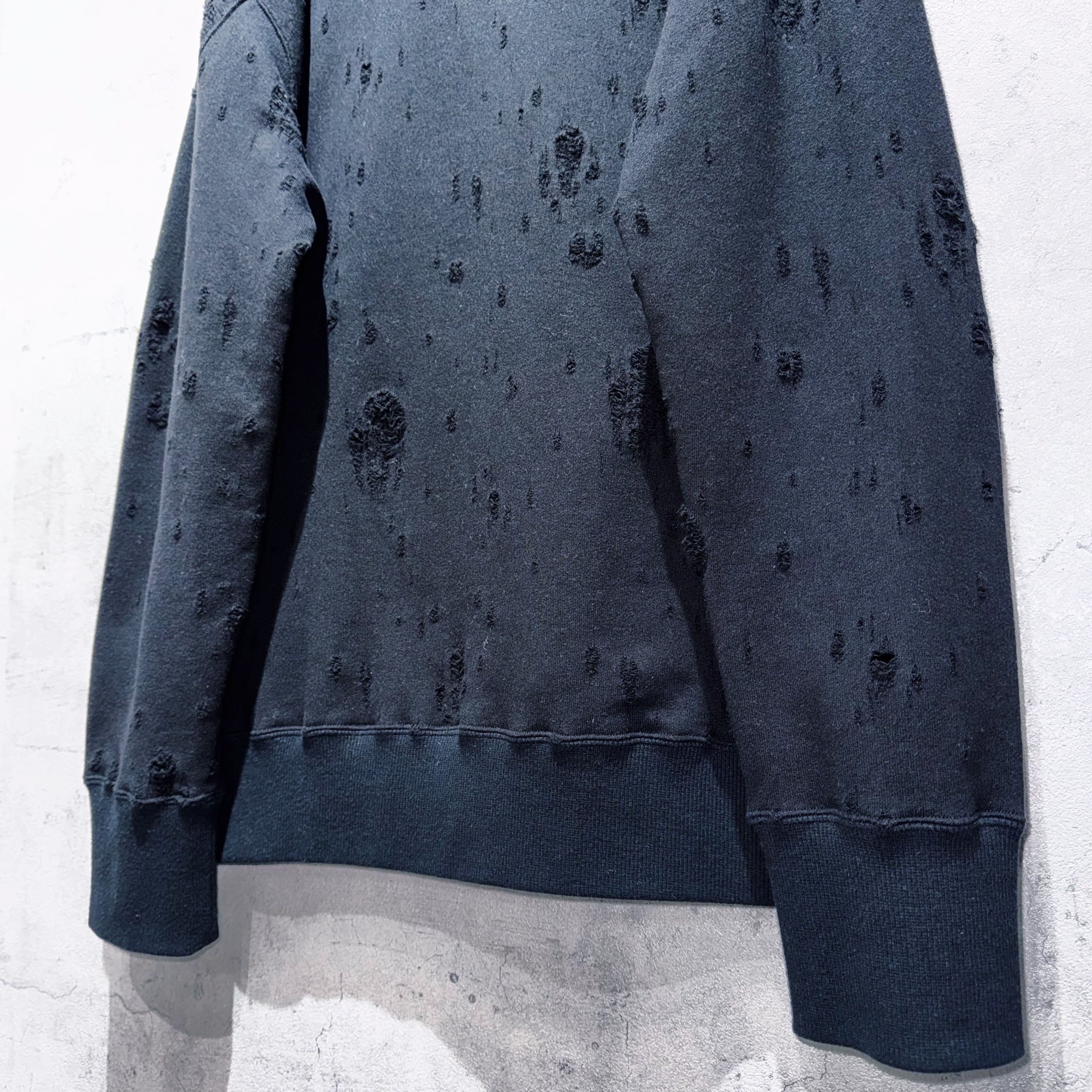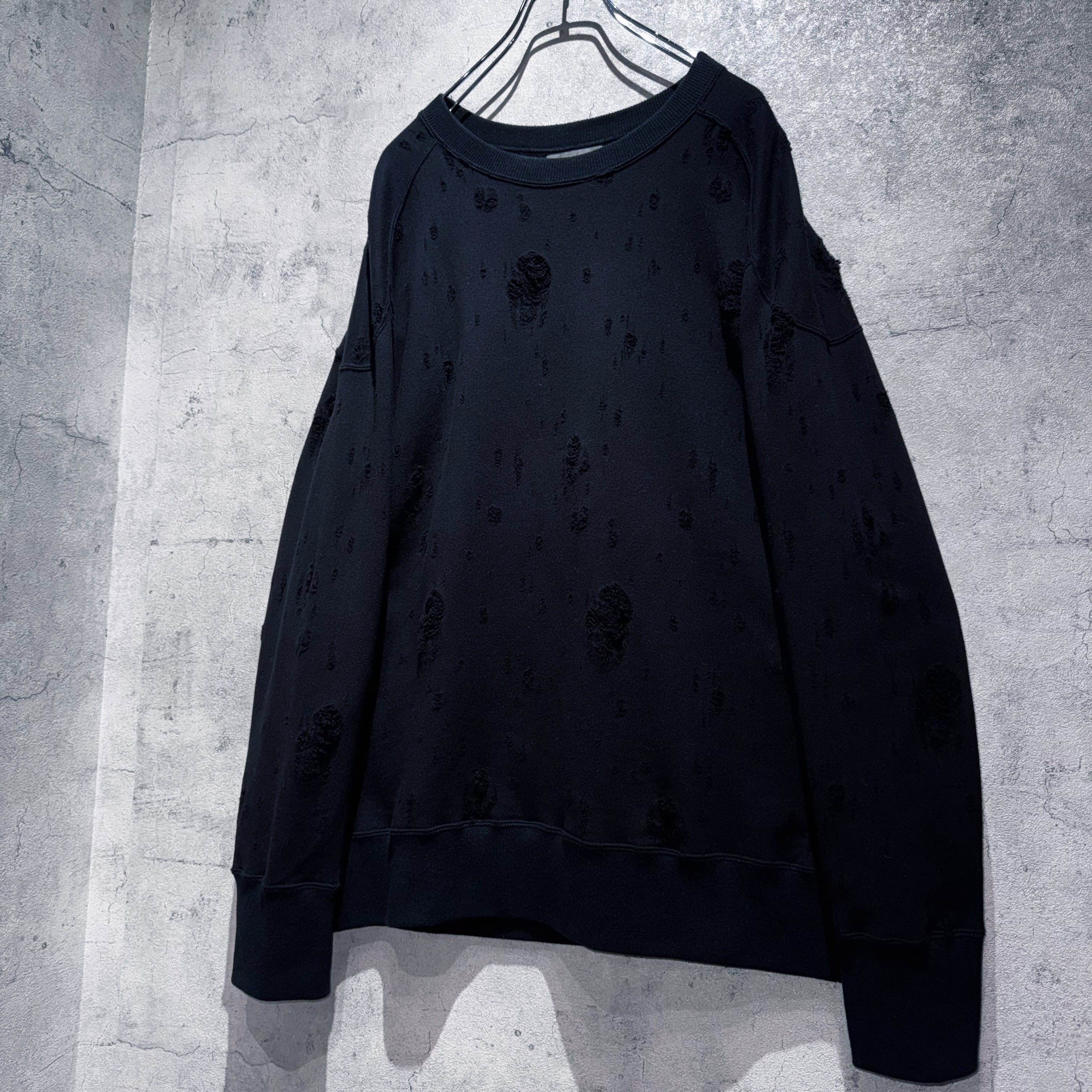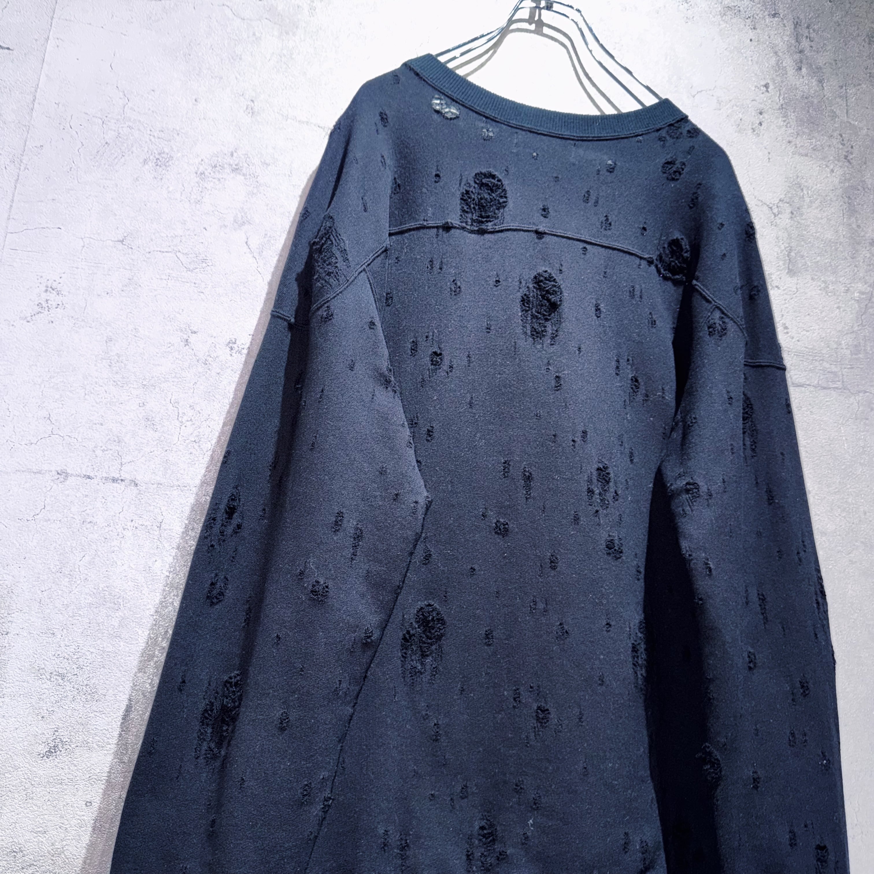 削ぎ落とされたブラック。そこに刻まれる、無数の“欠落”。ミニマルなクルーネックスウェットをベースに、全体へランダムに施されたダメージ加工が特徴。