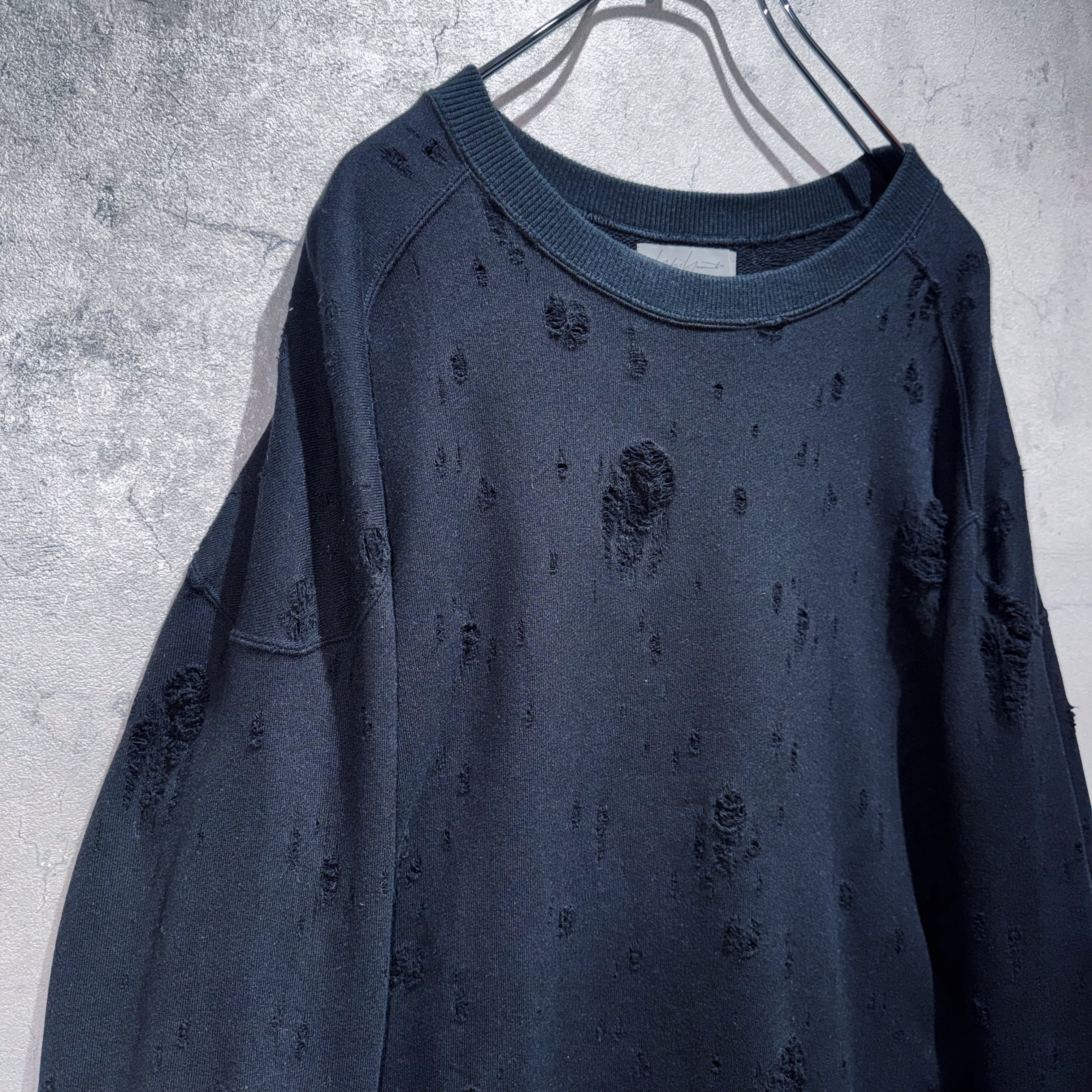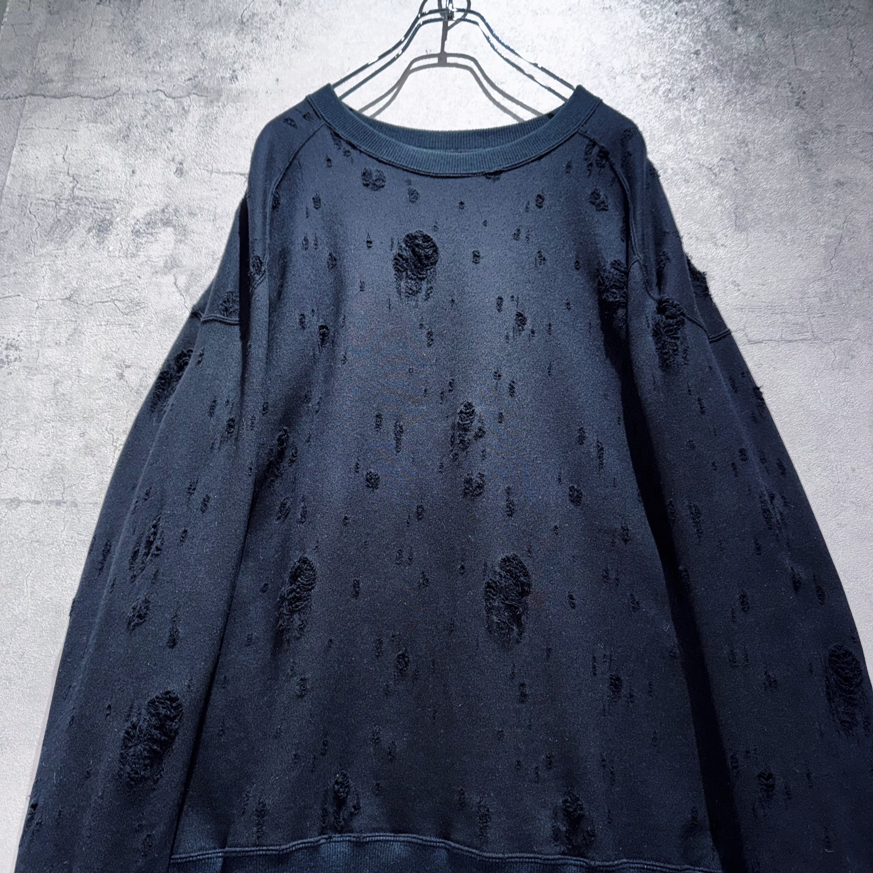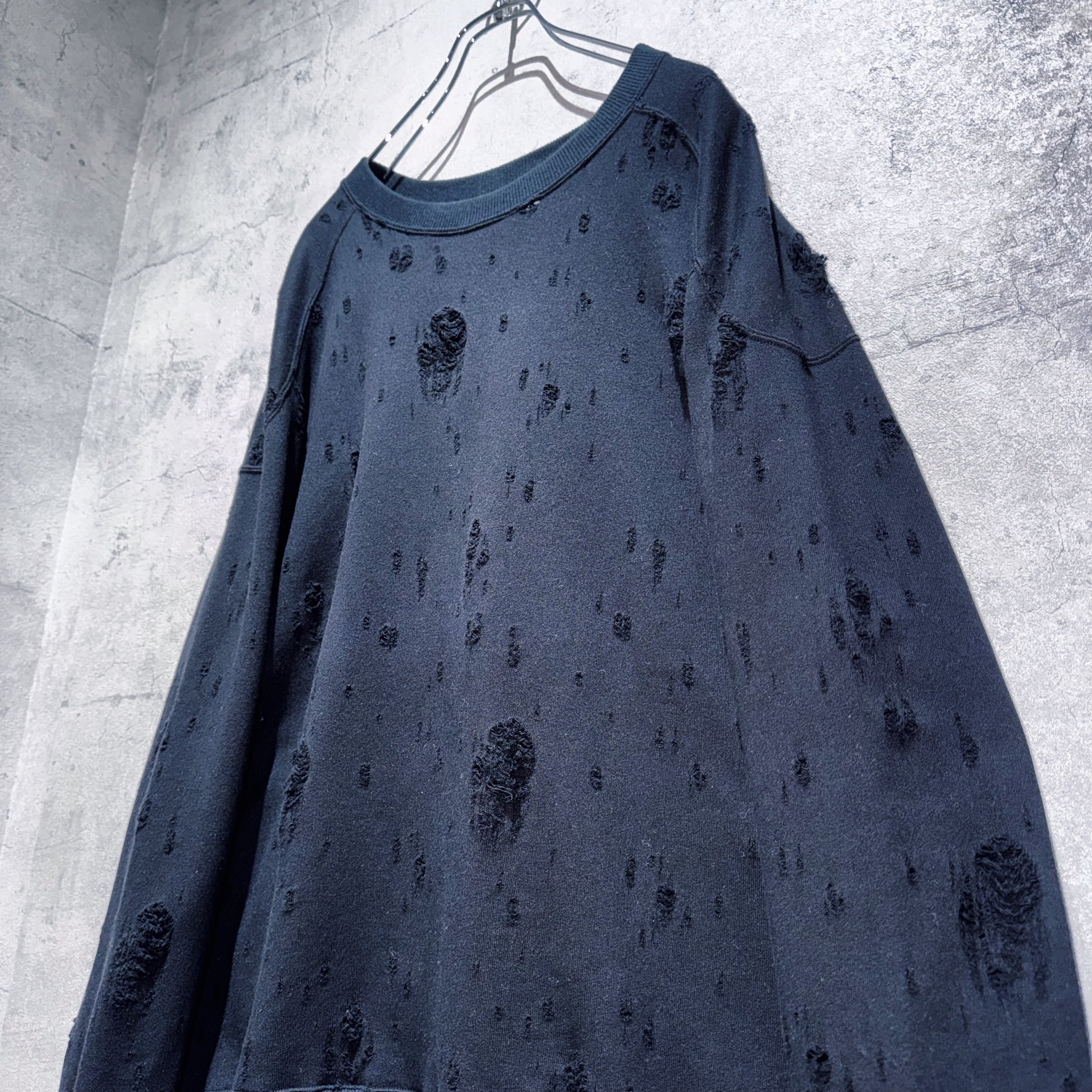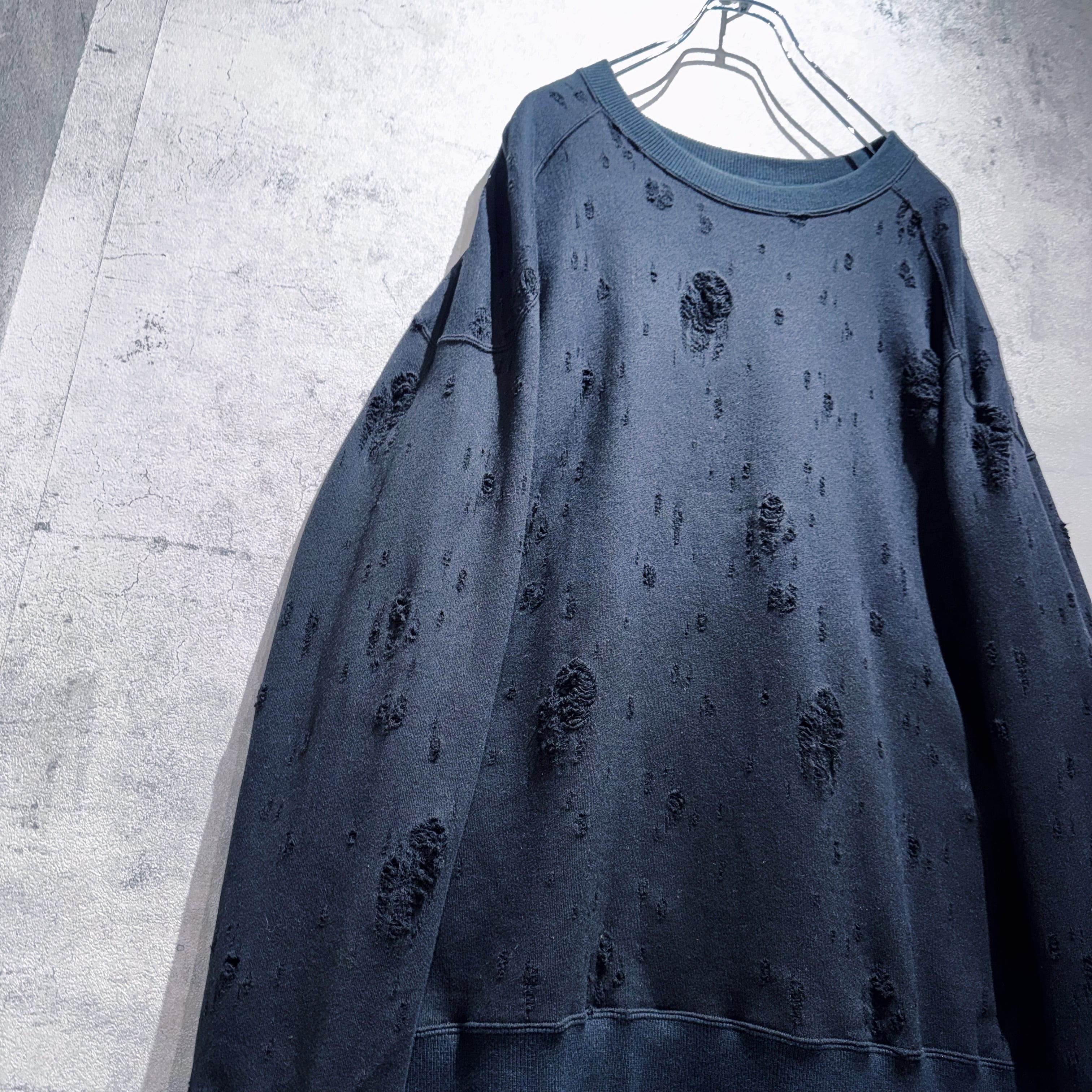 削ぎ落とされたブラック。そこに刻まれる、無数の“欠落”。ミニマルなクルーネックスウェットをベースに、全体へランダムに施されたダメージ加工が特徴。
