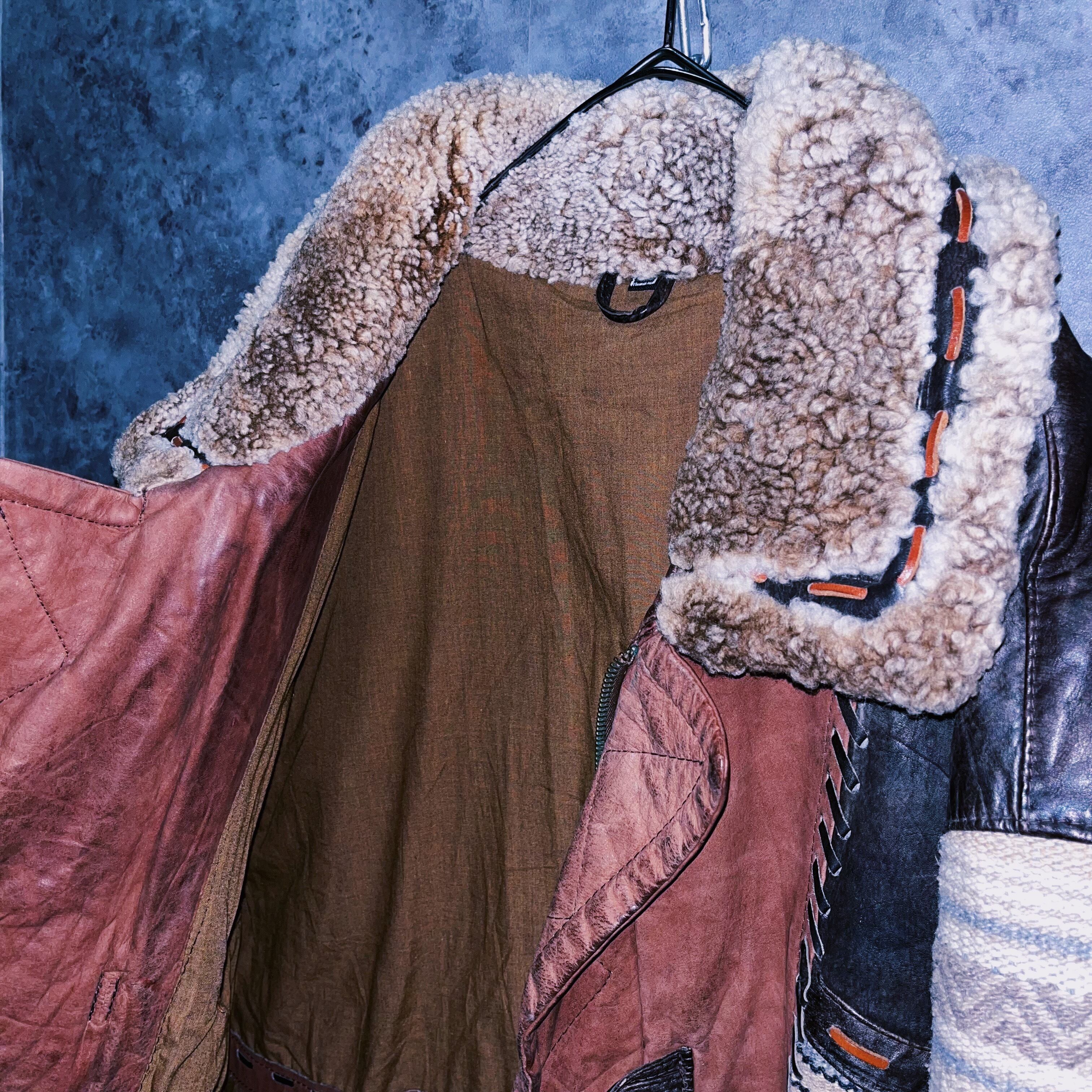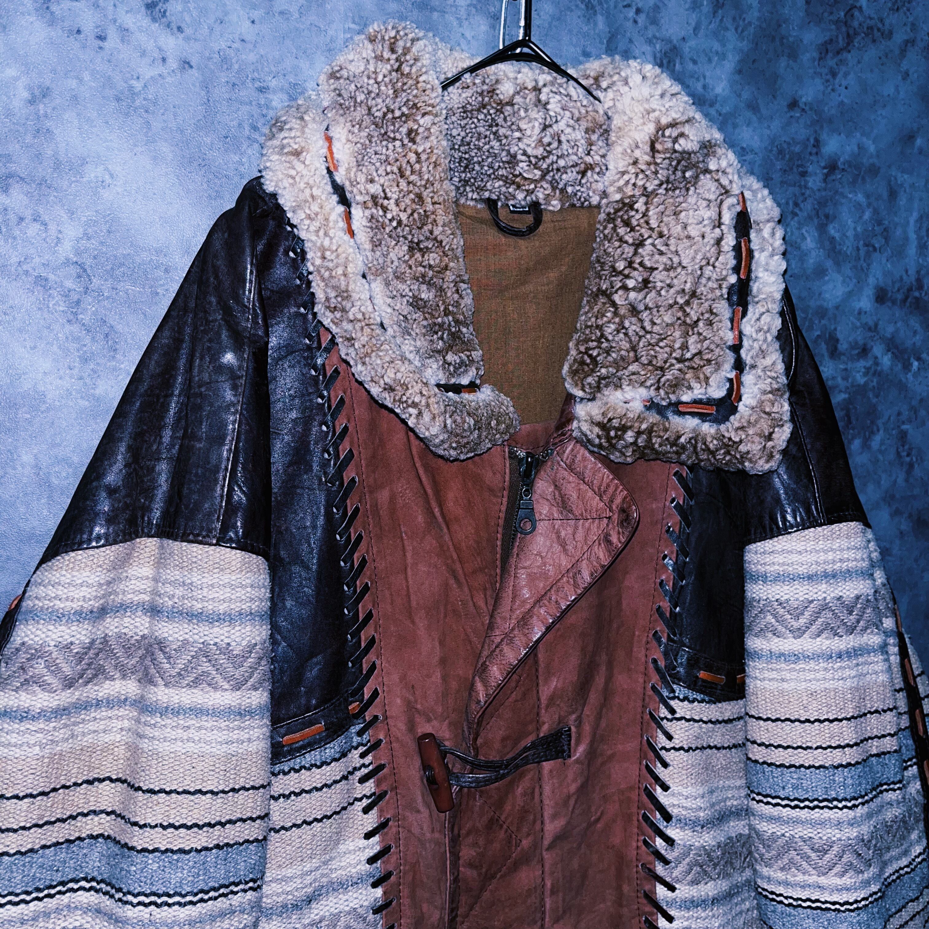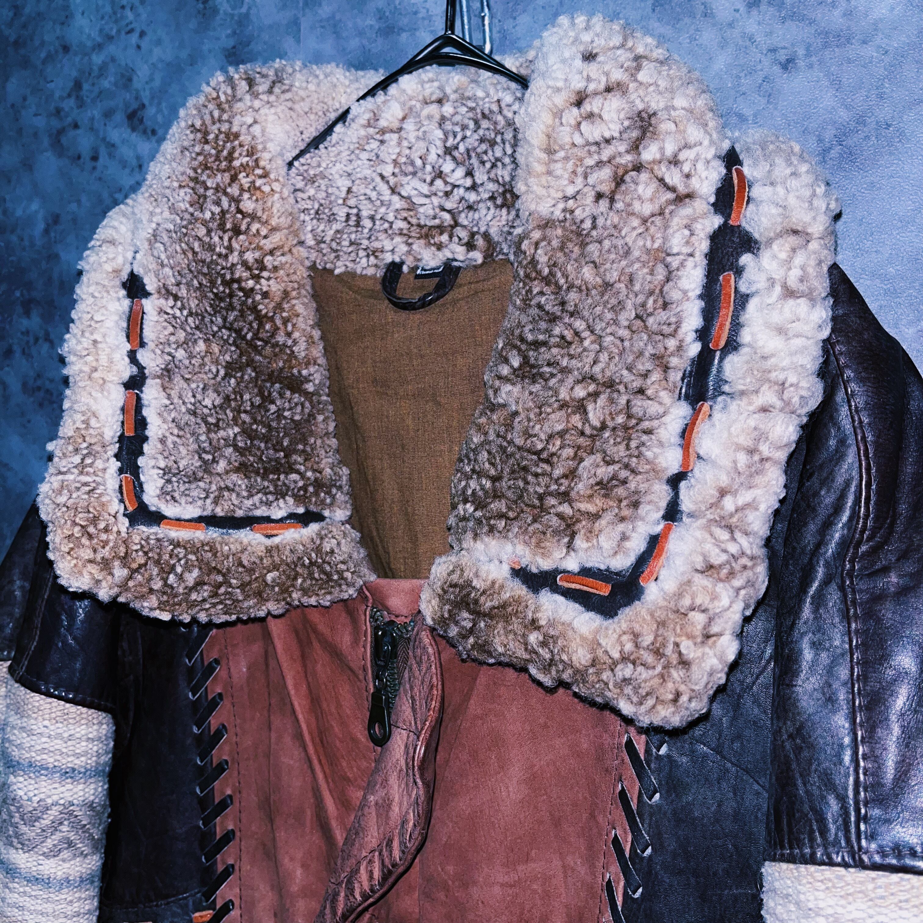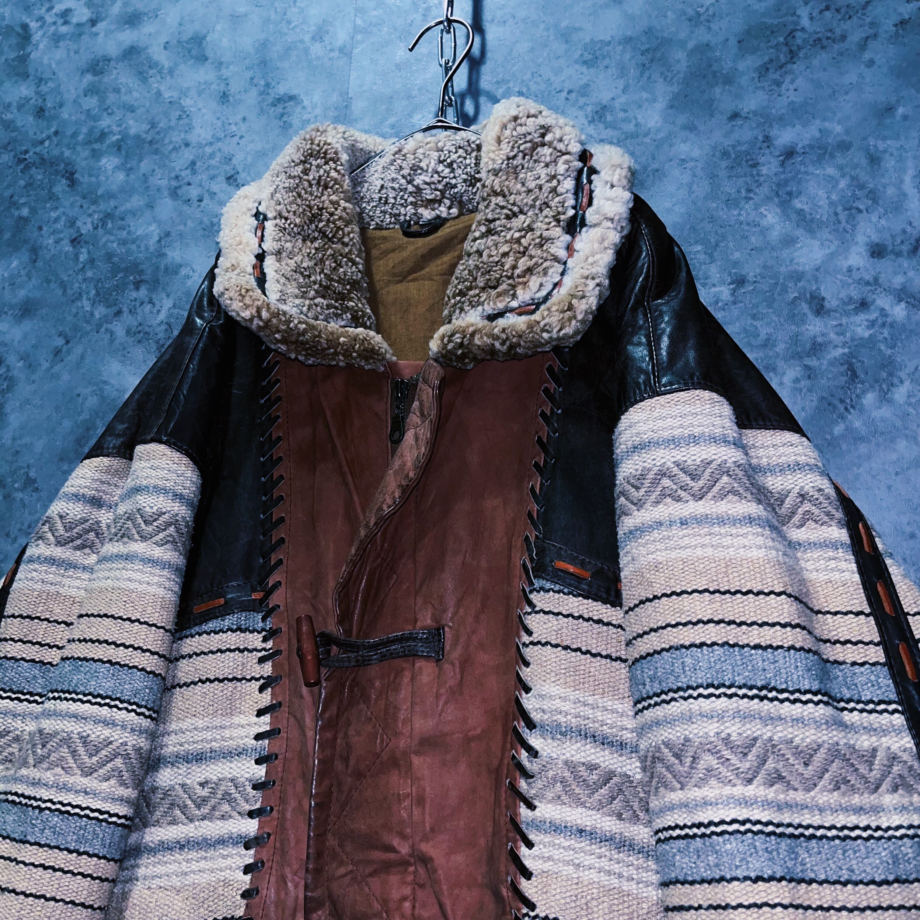 【doppio】Euro vintage native pattern brown leather boa jacket