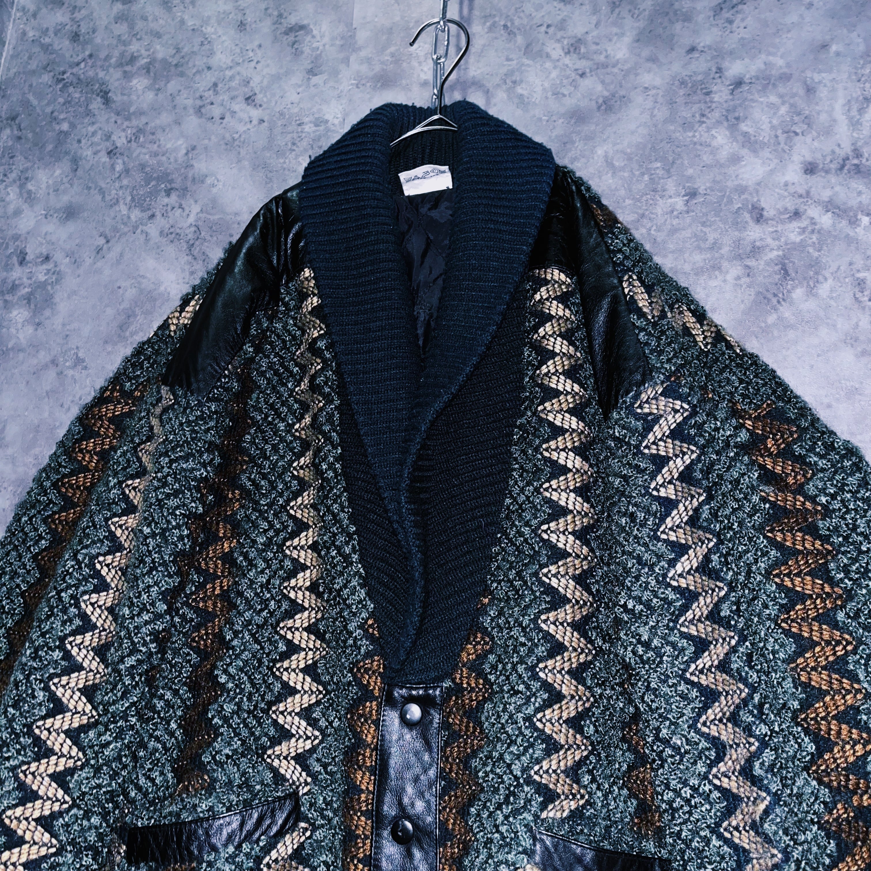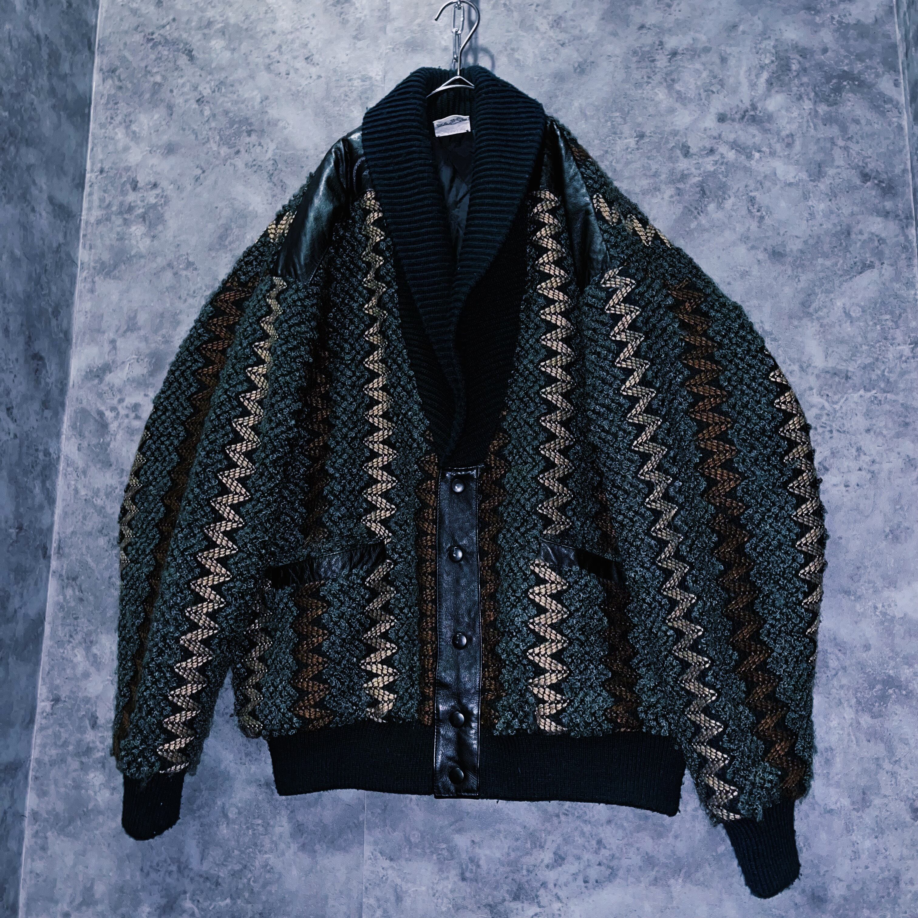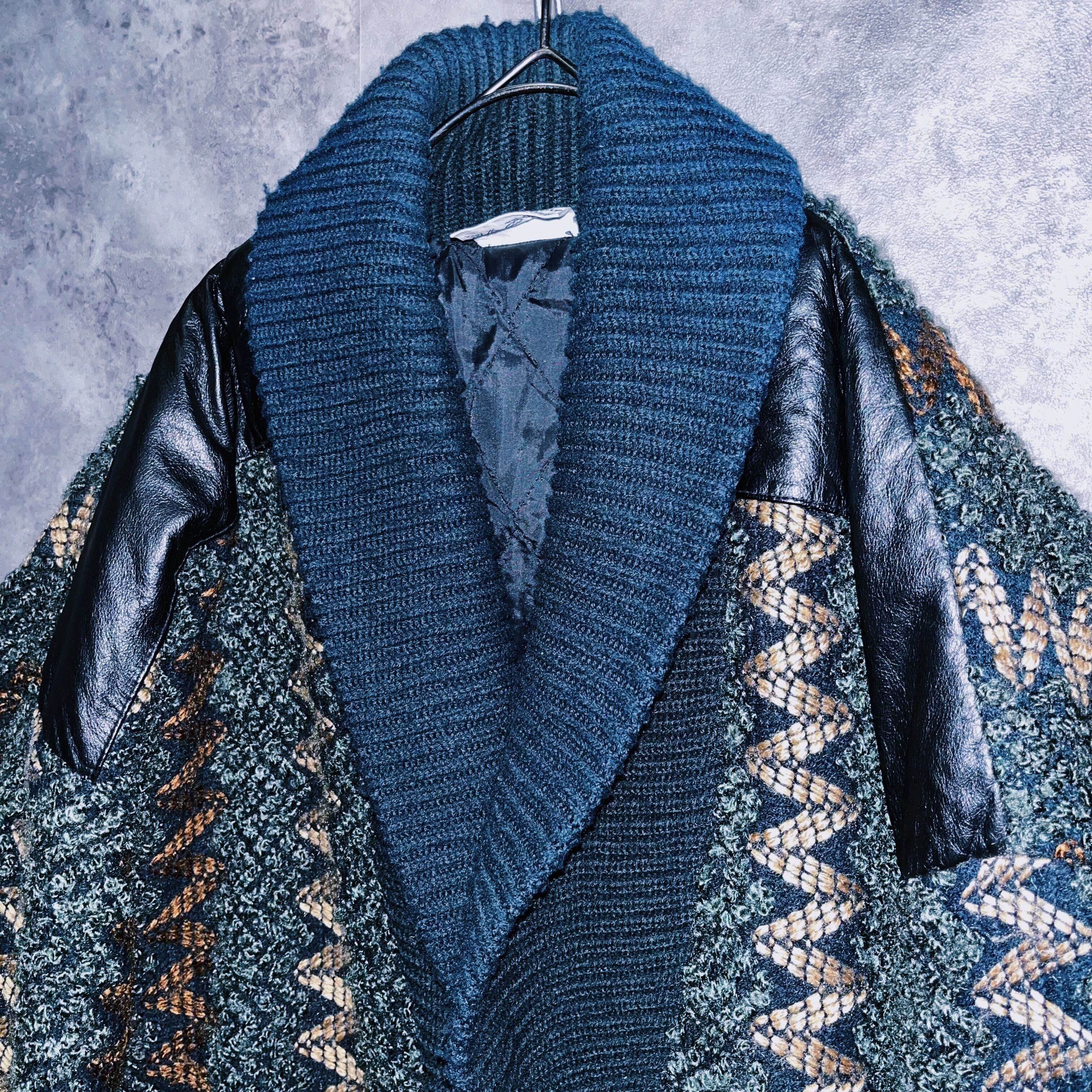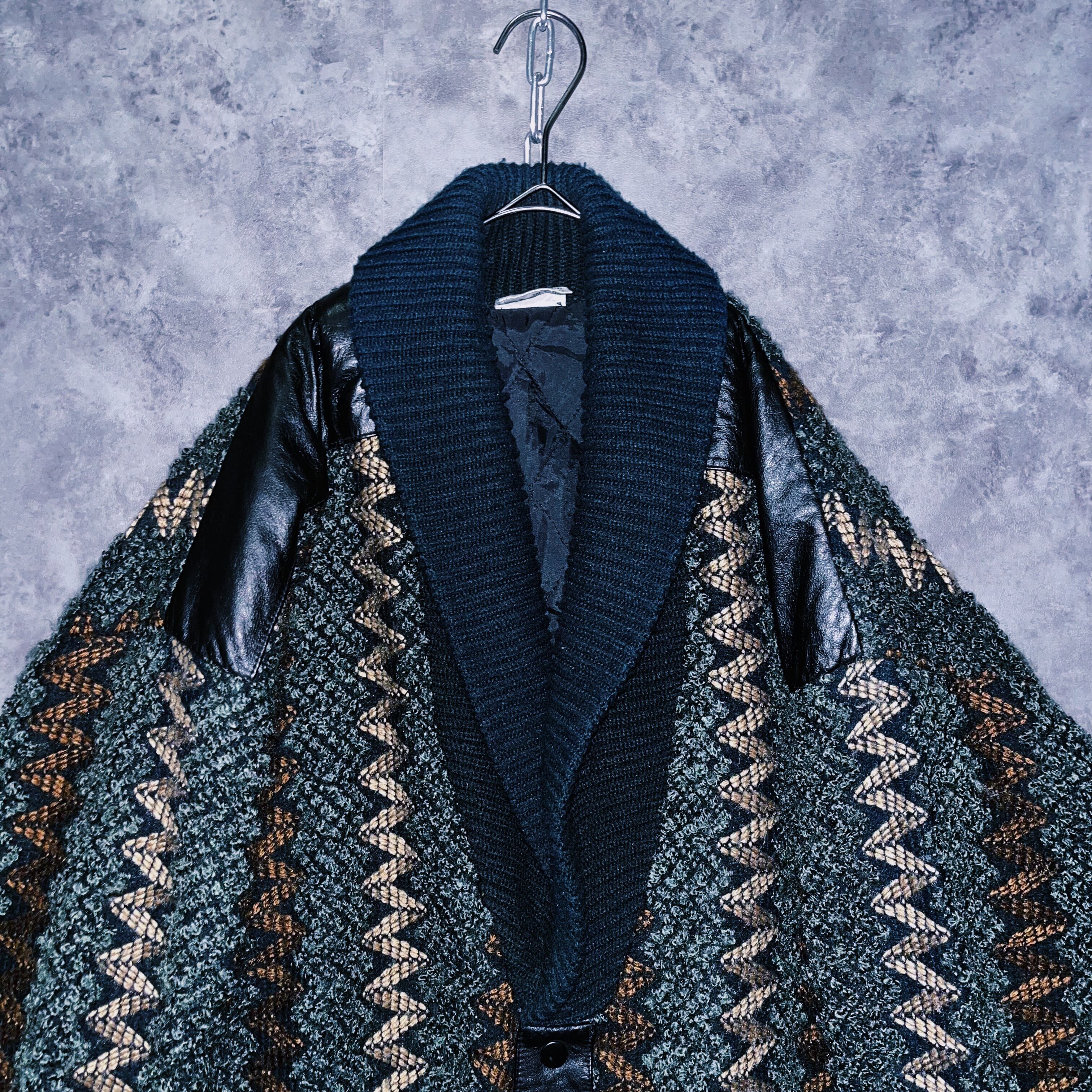 ヴィンテージレザー×ニットスイッチングショールカラーカーディガン