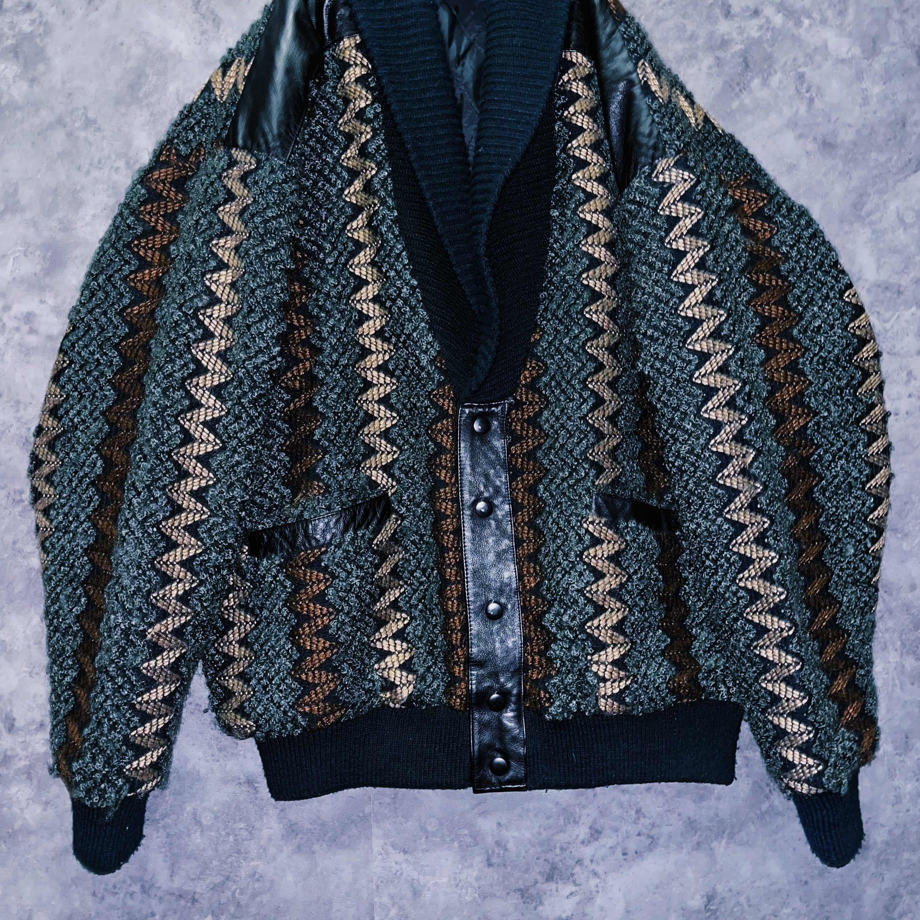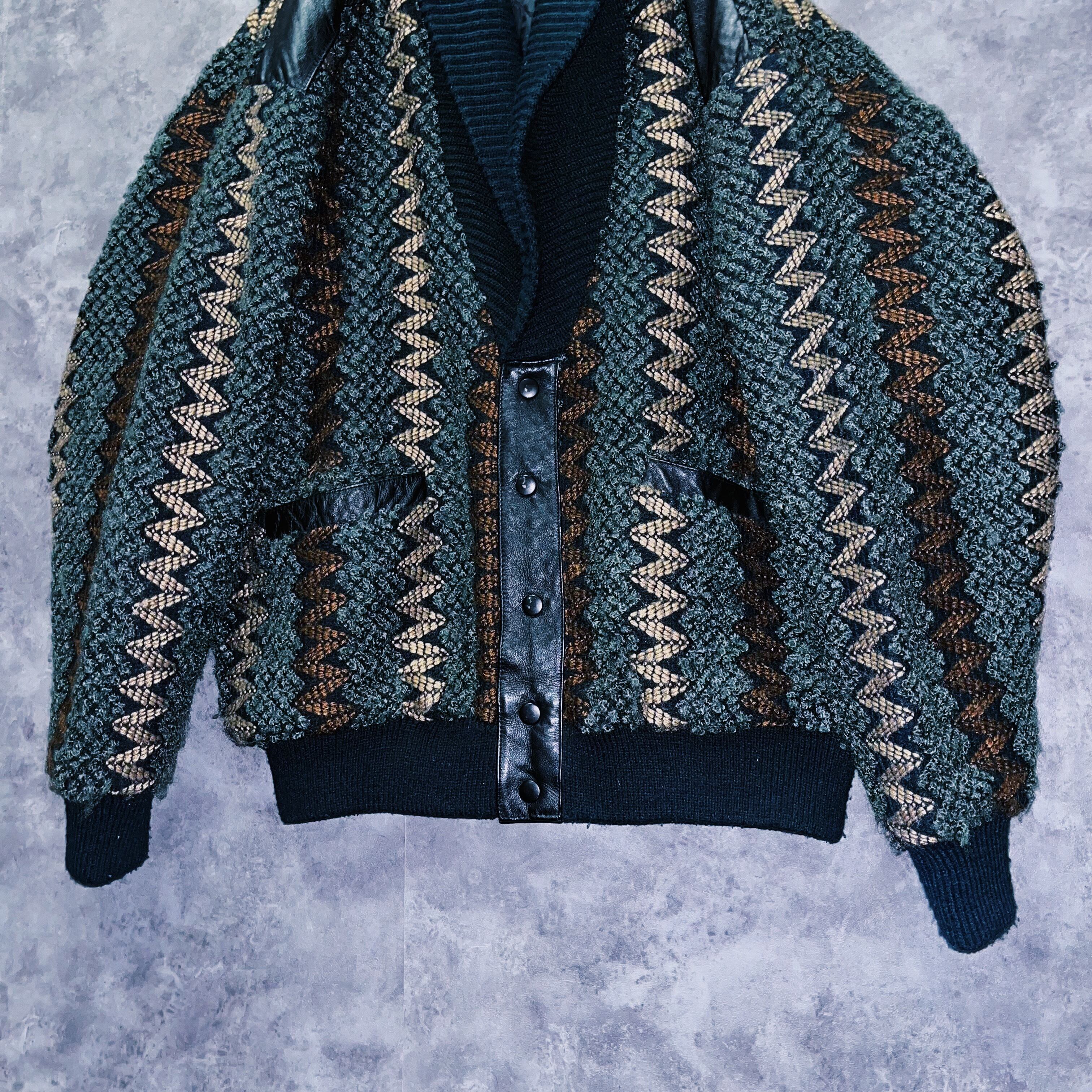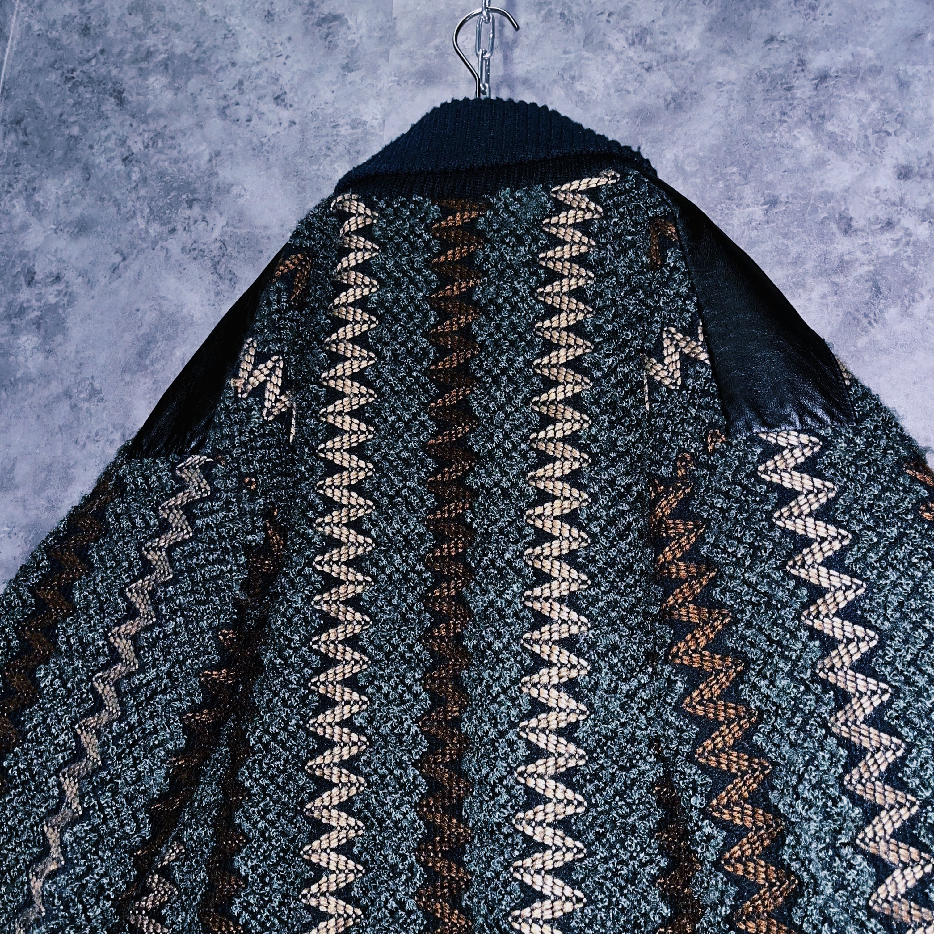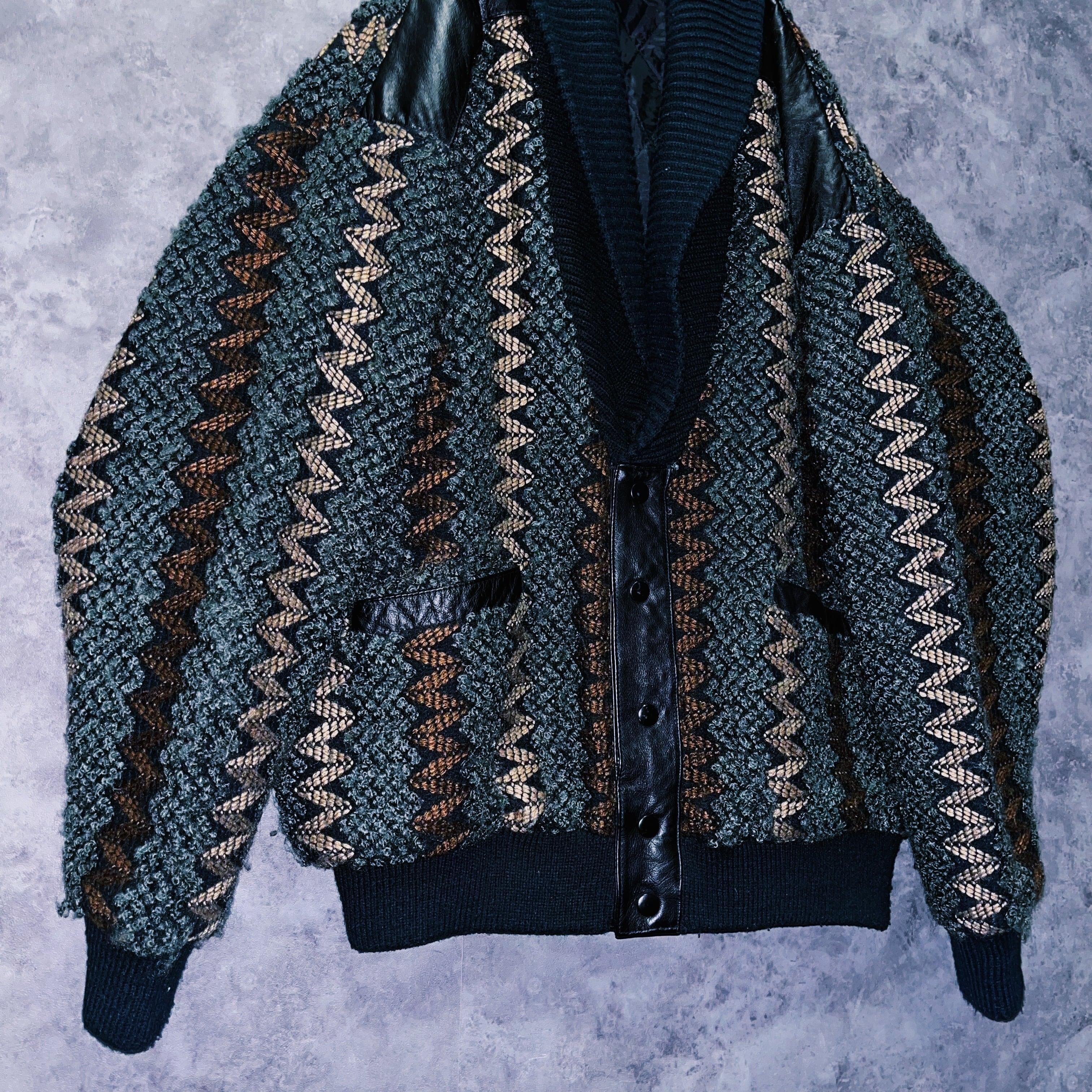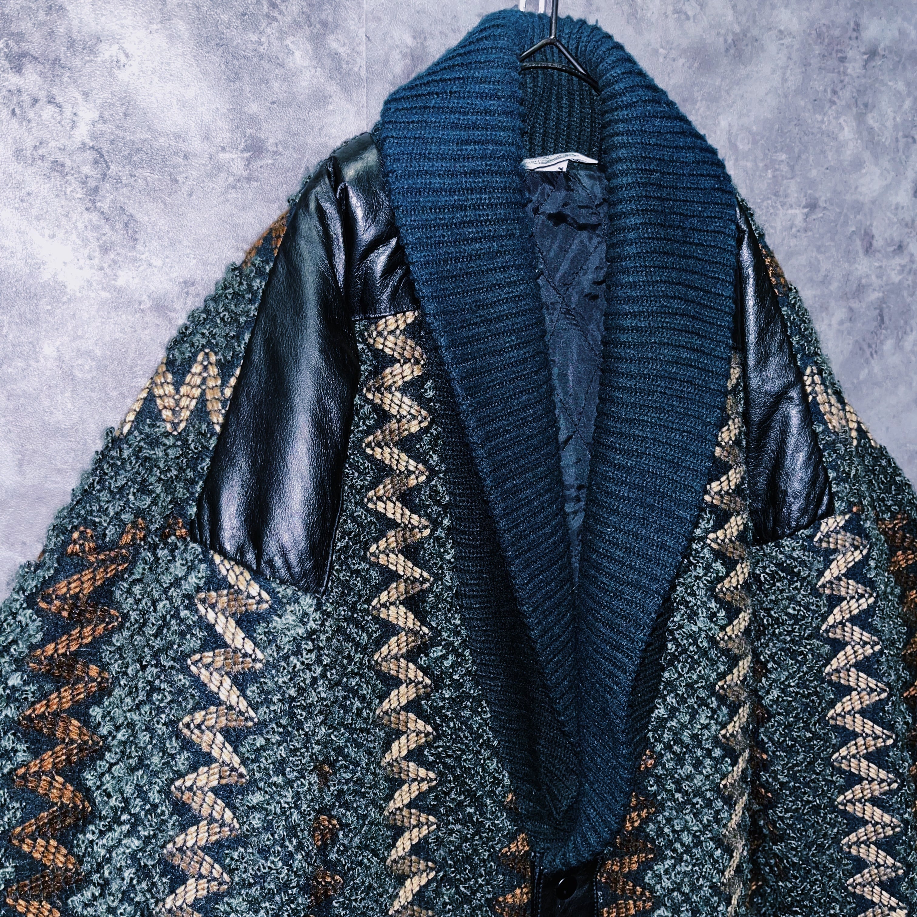 ヴィンテージレザー×ニットスイッチングショールカラーカーディガン