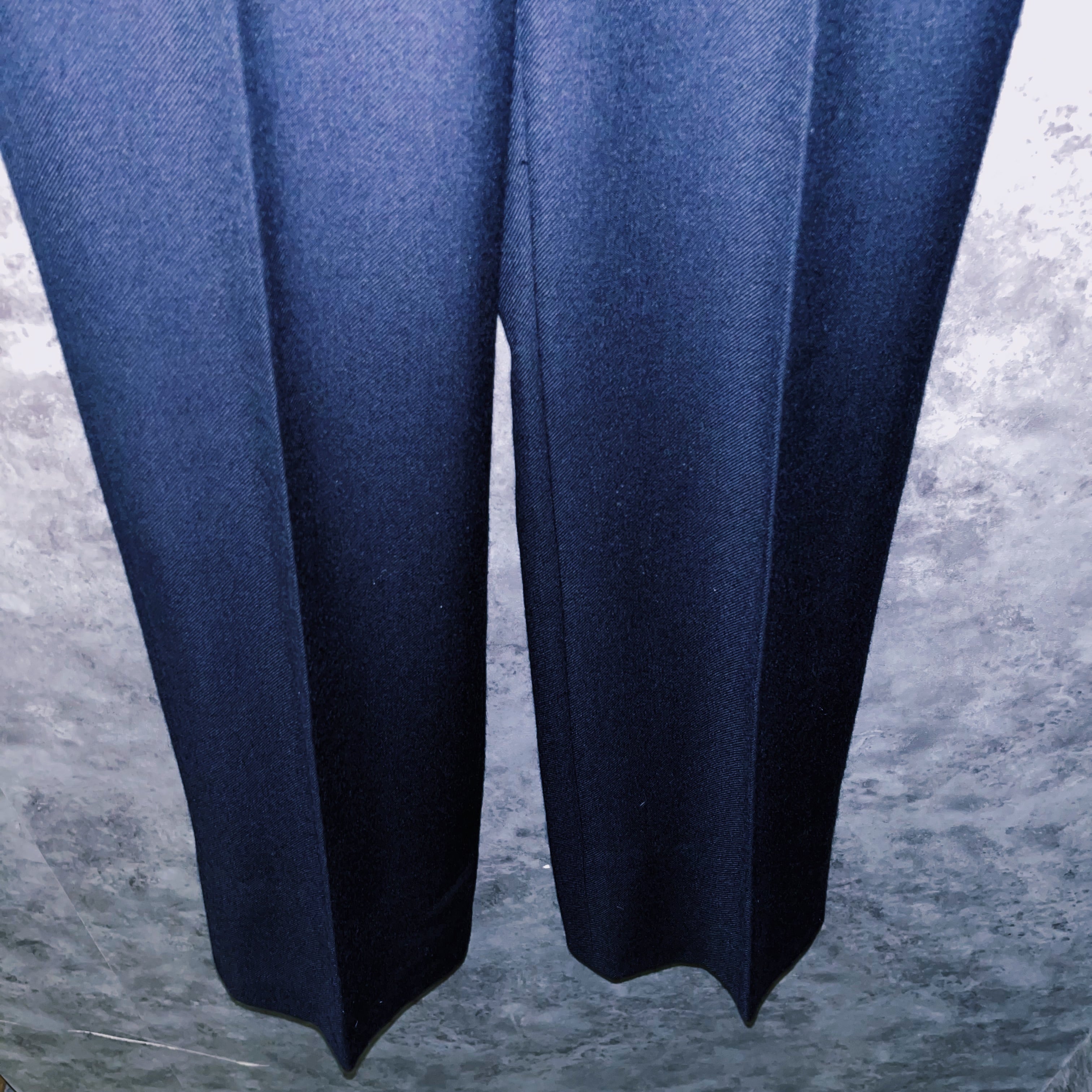 深いネイビーのシンプルなカラーながら、今回特筆すべきはパンツのシルエット。細身のウエストから放たれた裾は膝下から大きく広がり、釣り鐘(ベル型)に広がったシルエット。