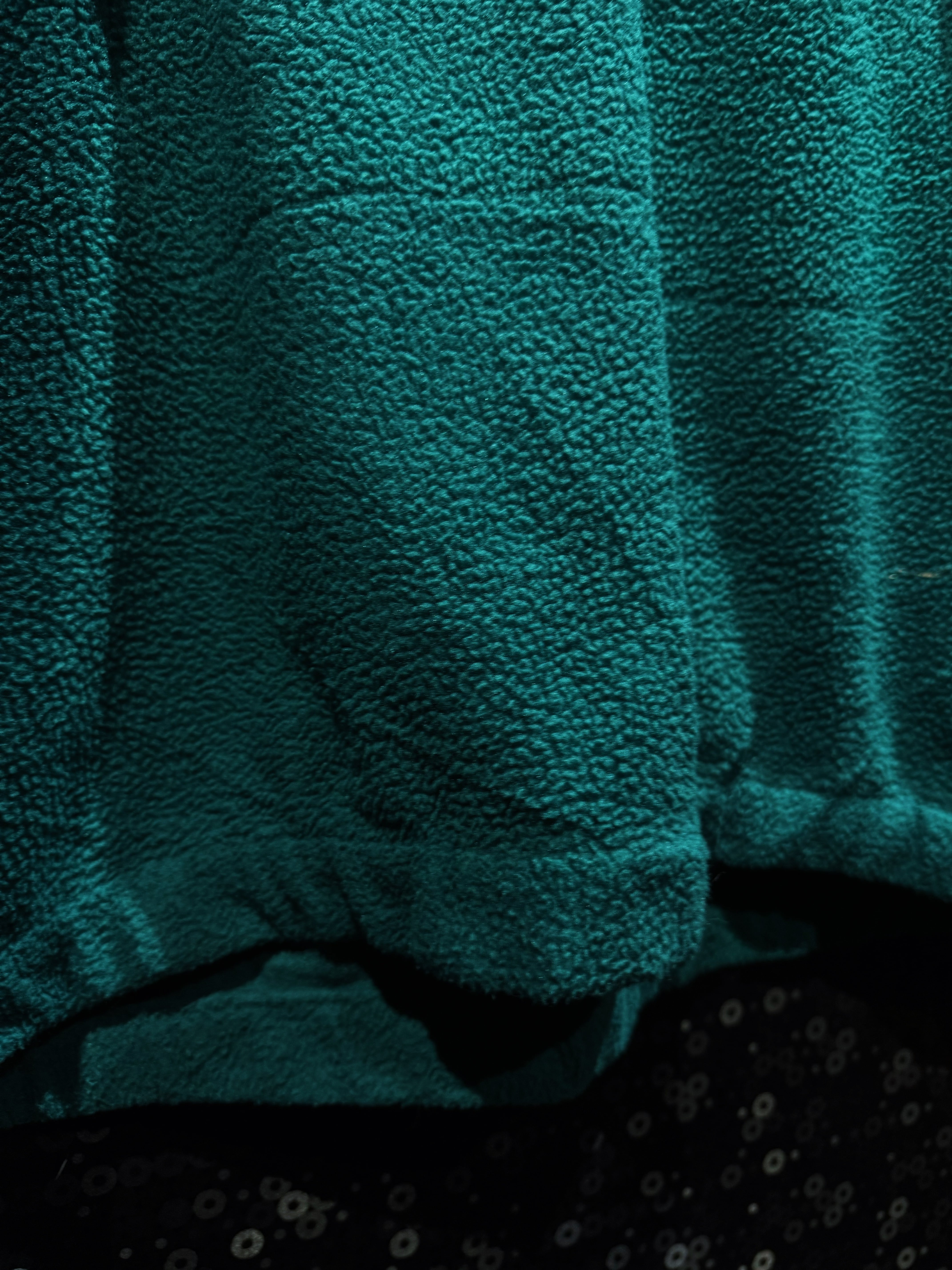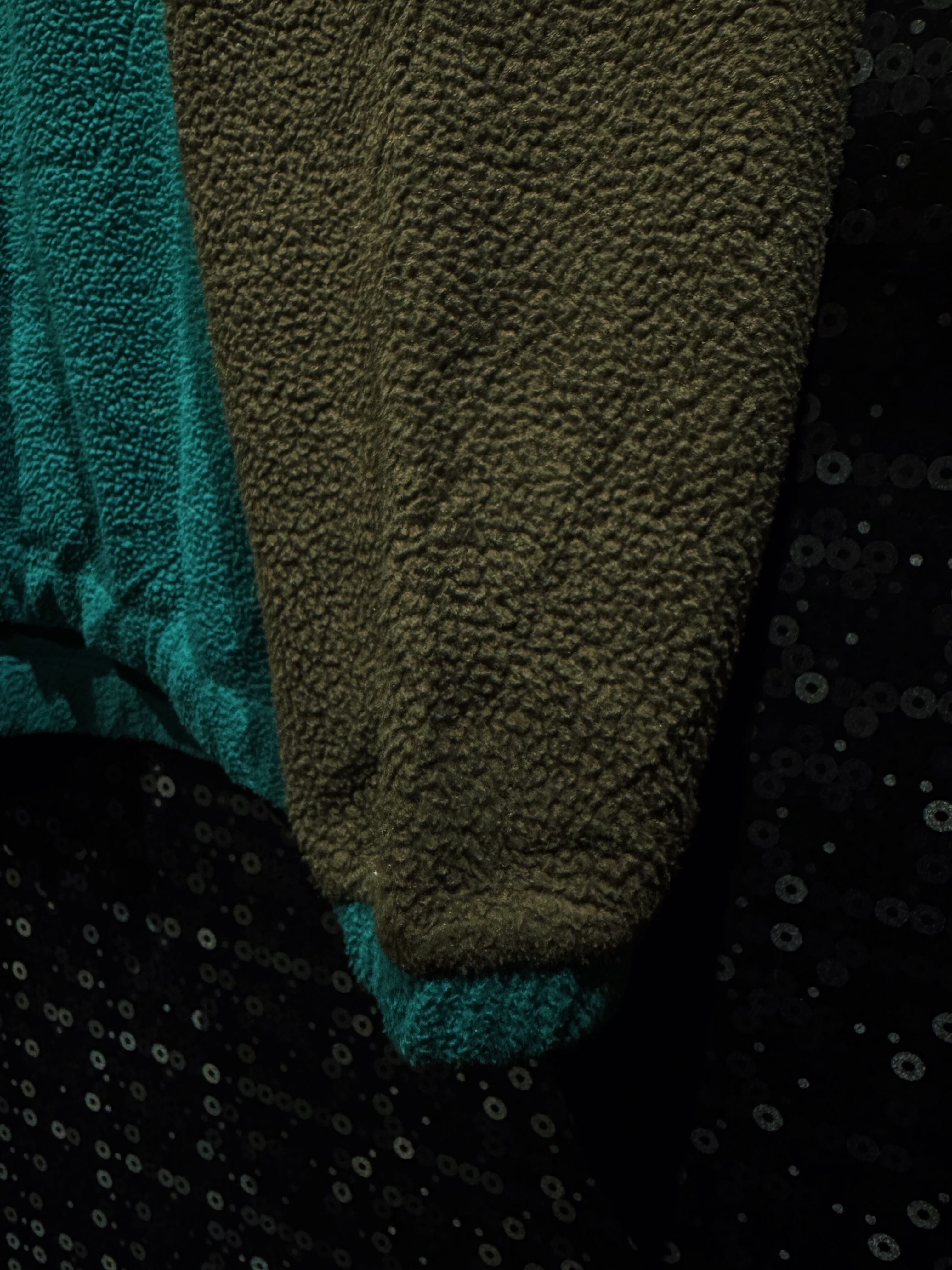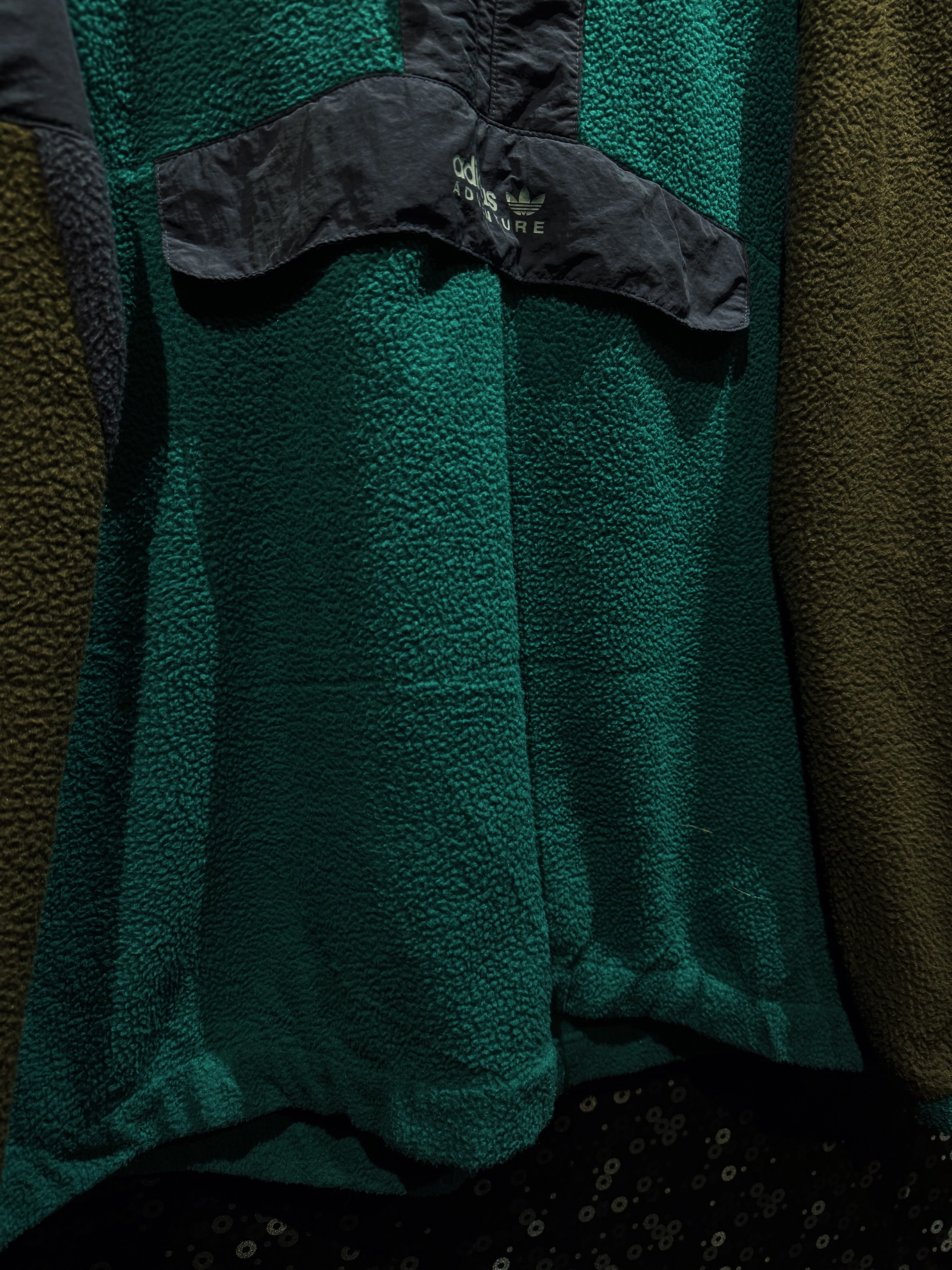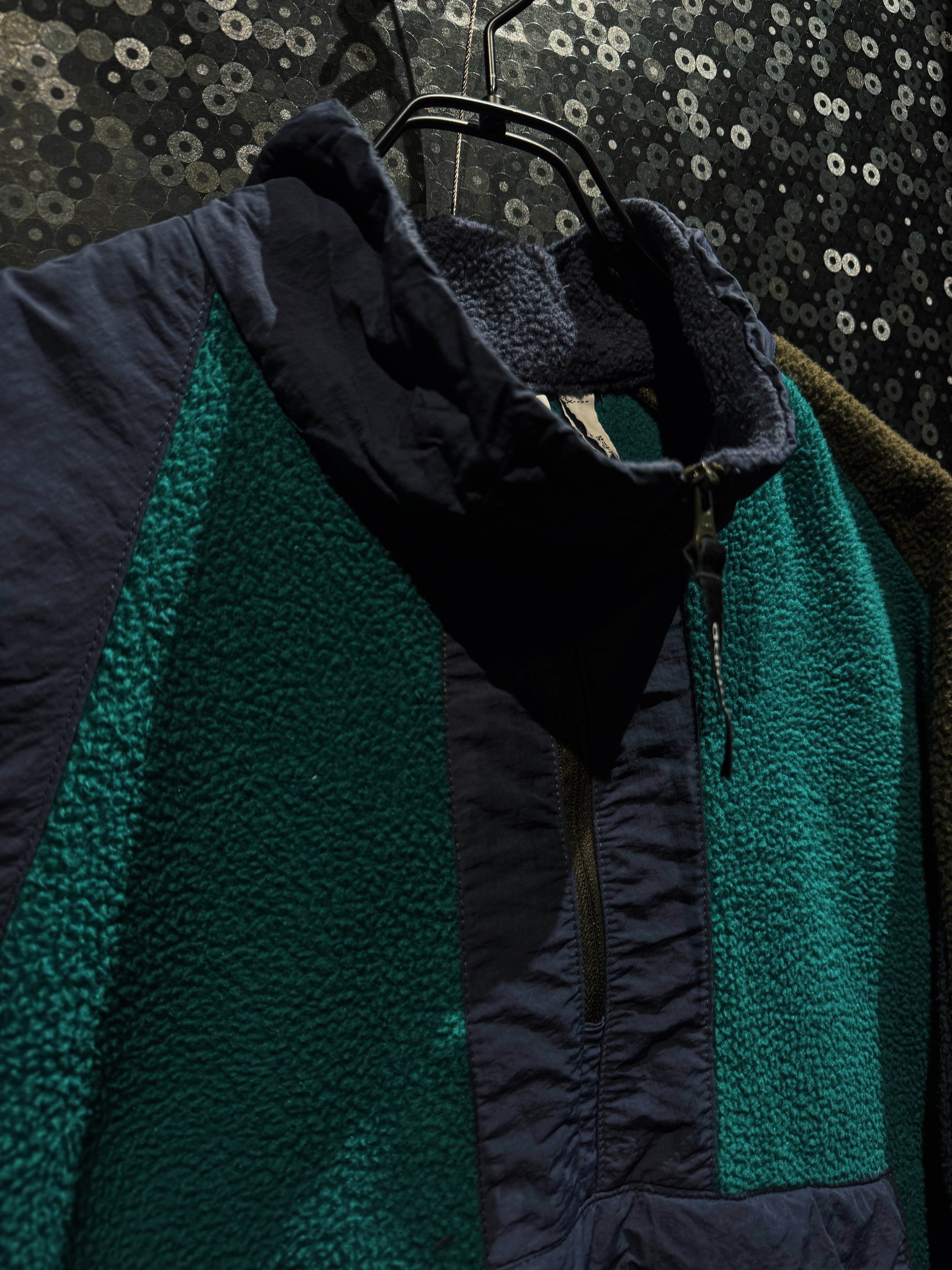ボディ中央は深みのあるグリーンのボアフリース。両袖はオリーブ寄りカーキのシェルパフリース。さらに肩とセンターパネルはネイビーナイロン。
