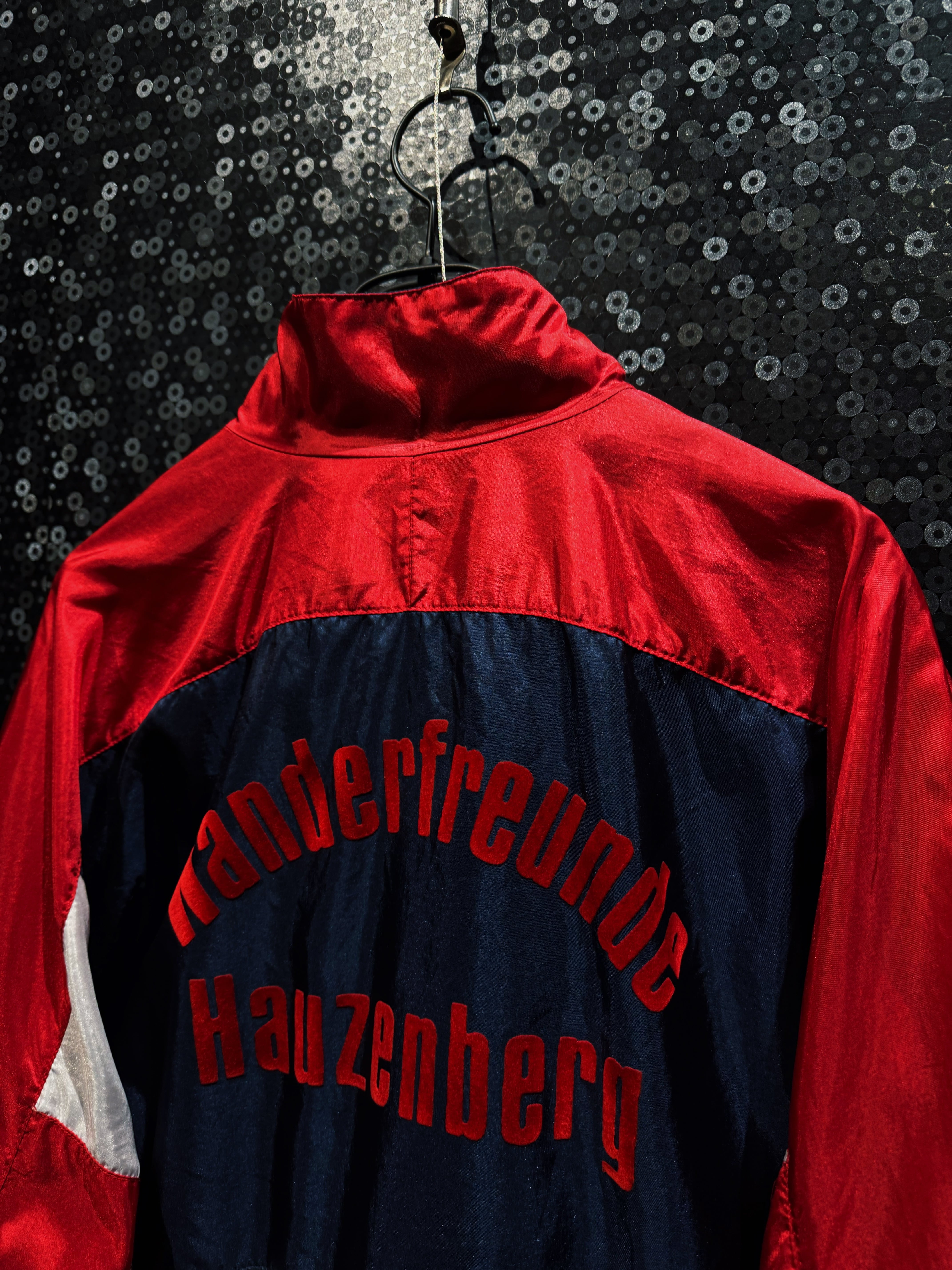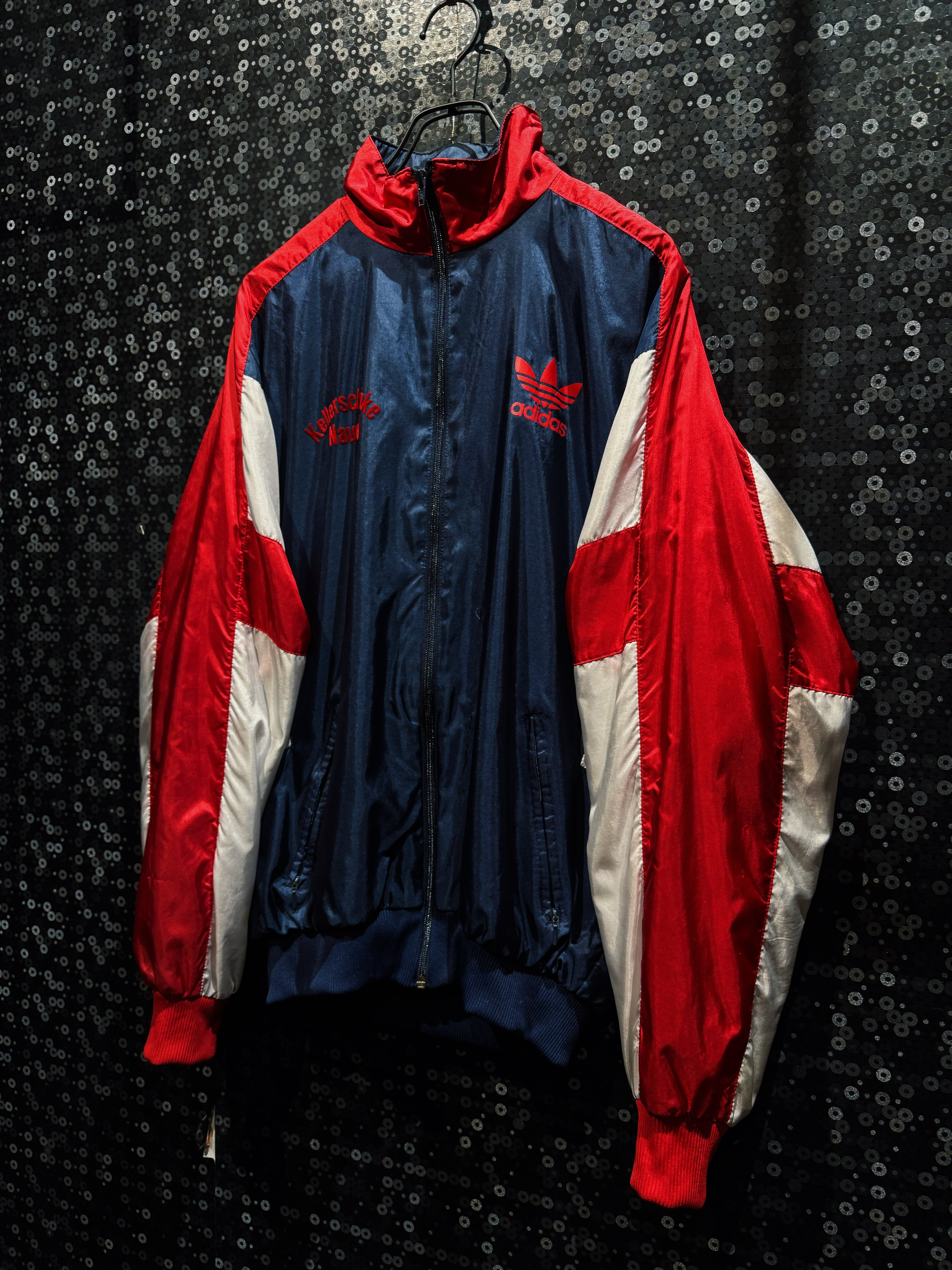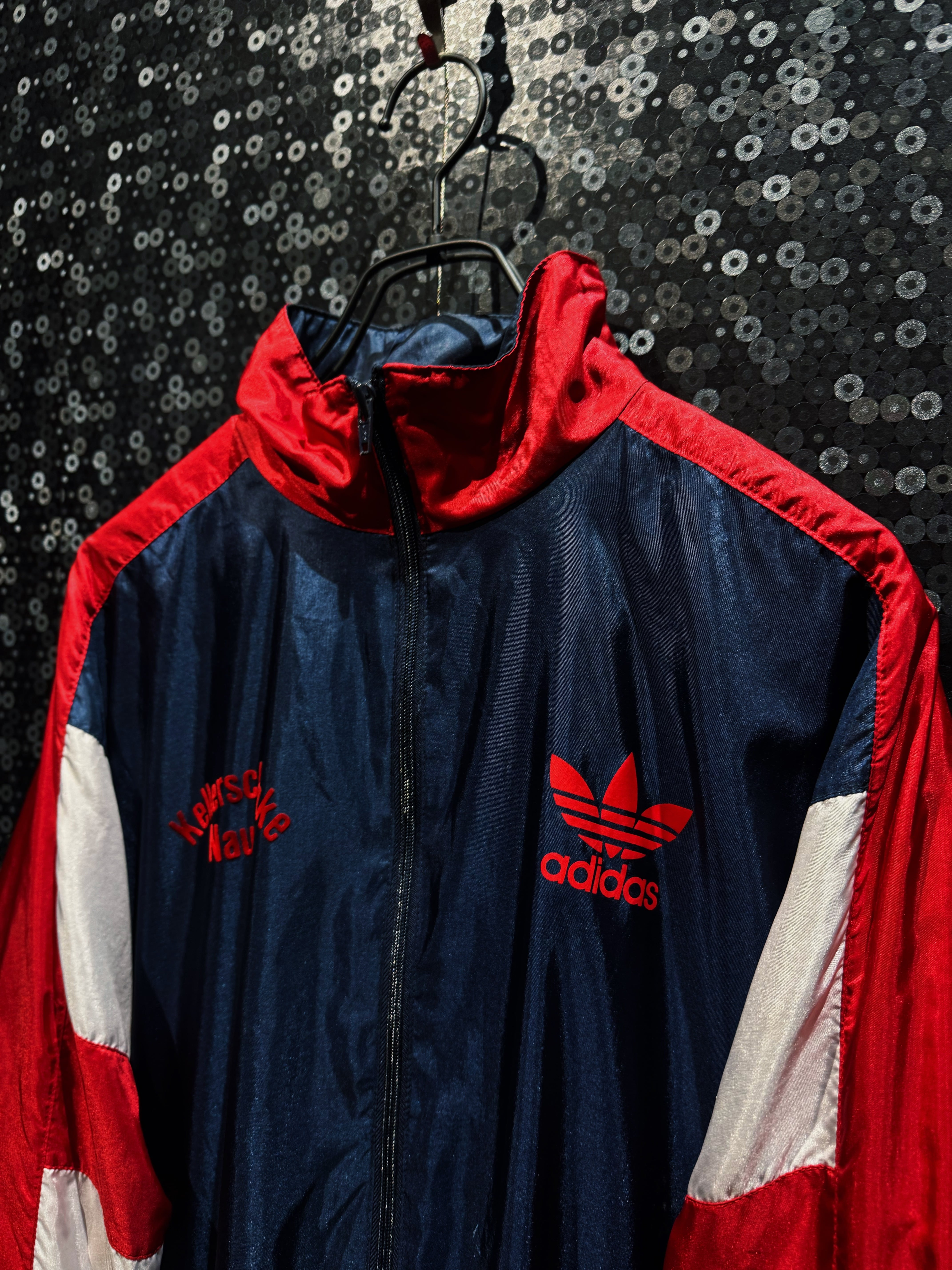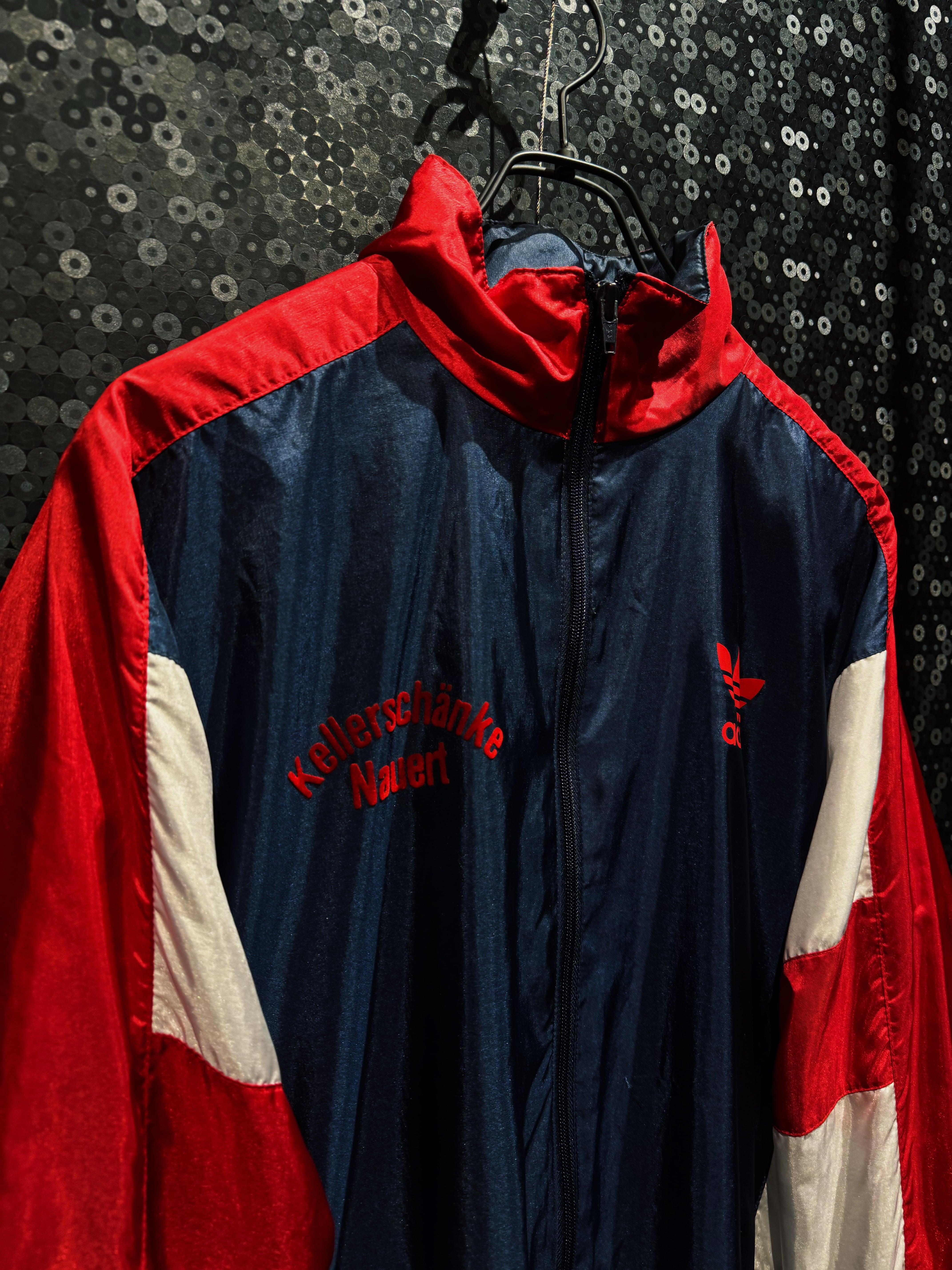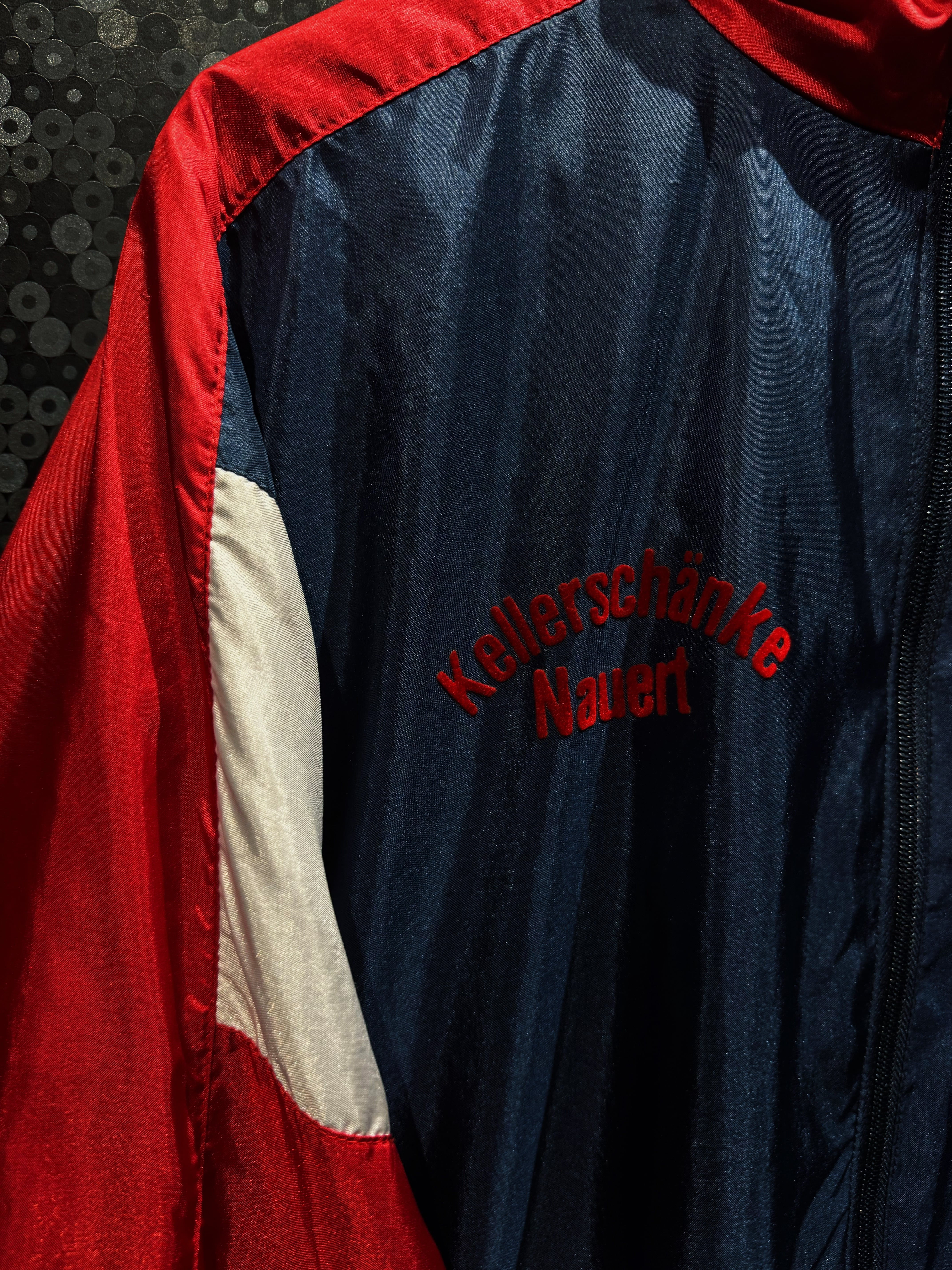 光沢感のあるナイロン素材は、当時らしいシャリ感と鈍い艶を持ち、ストリートにもスポーツにも振れる万能な質感。フロントにはレッドのトレフォイルロゴプリント。さらに胸元には“Kelerschänke Nauen”の立体フロッキーロゴ。