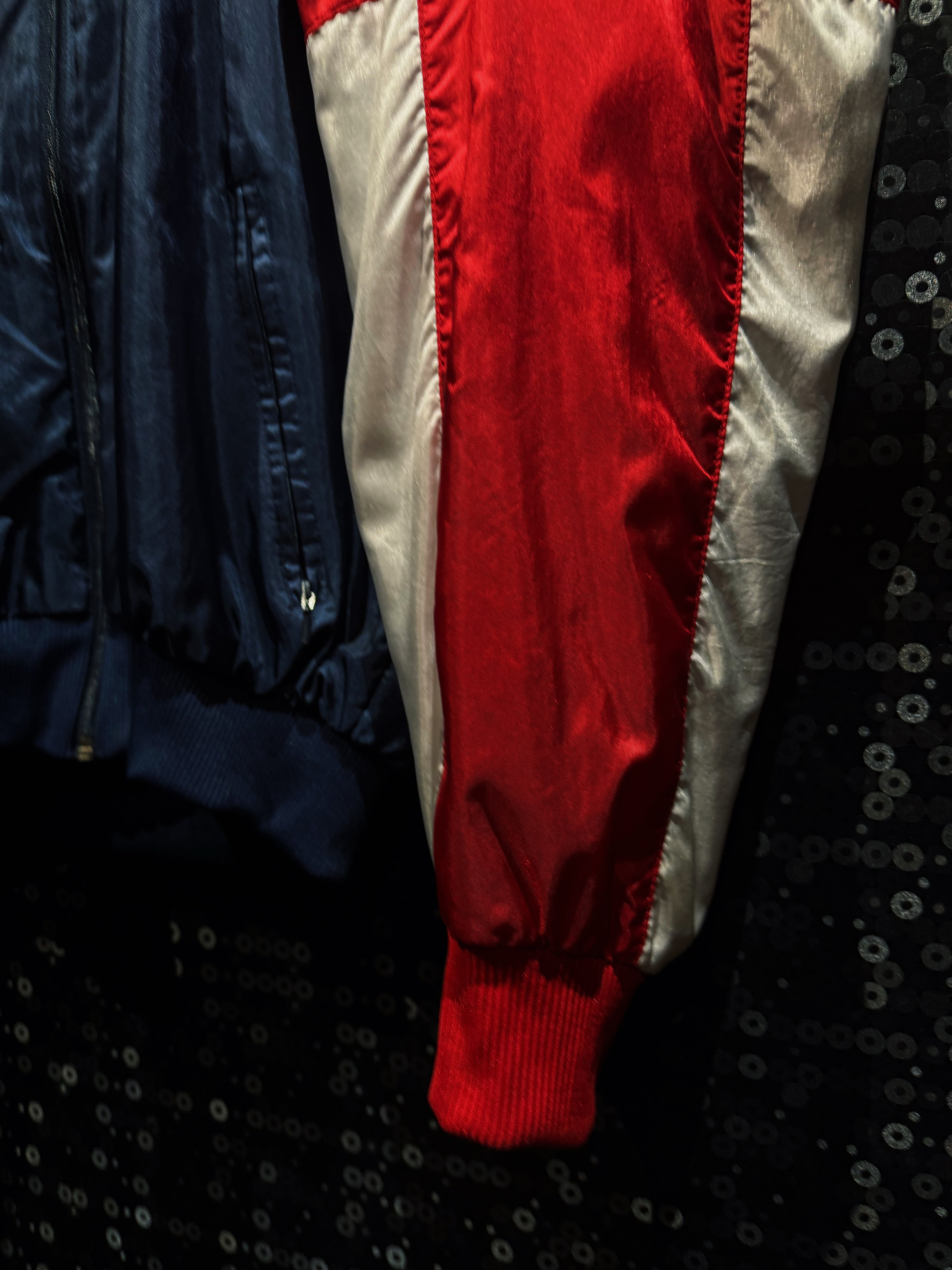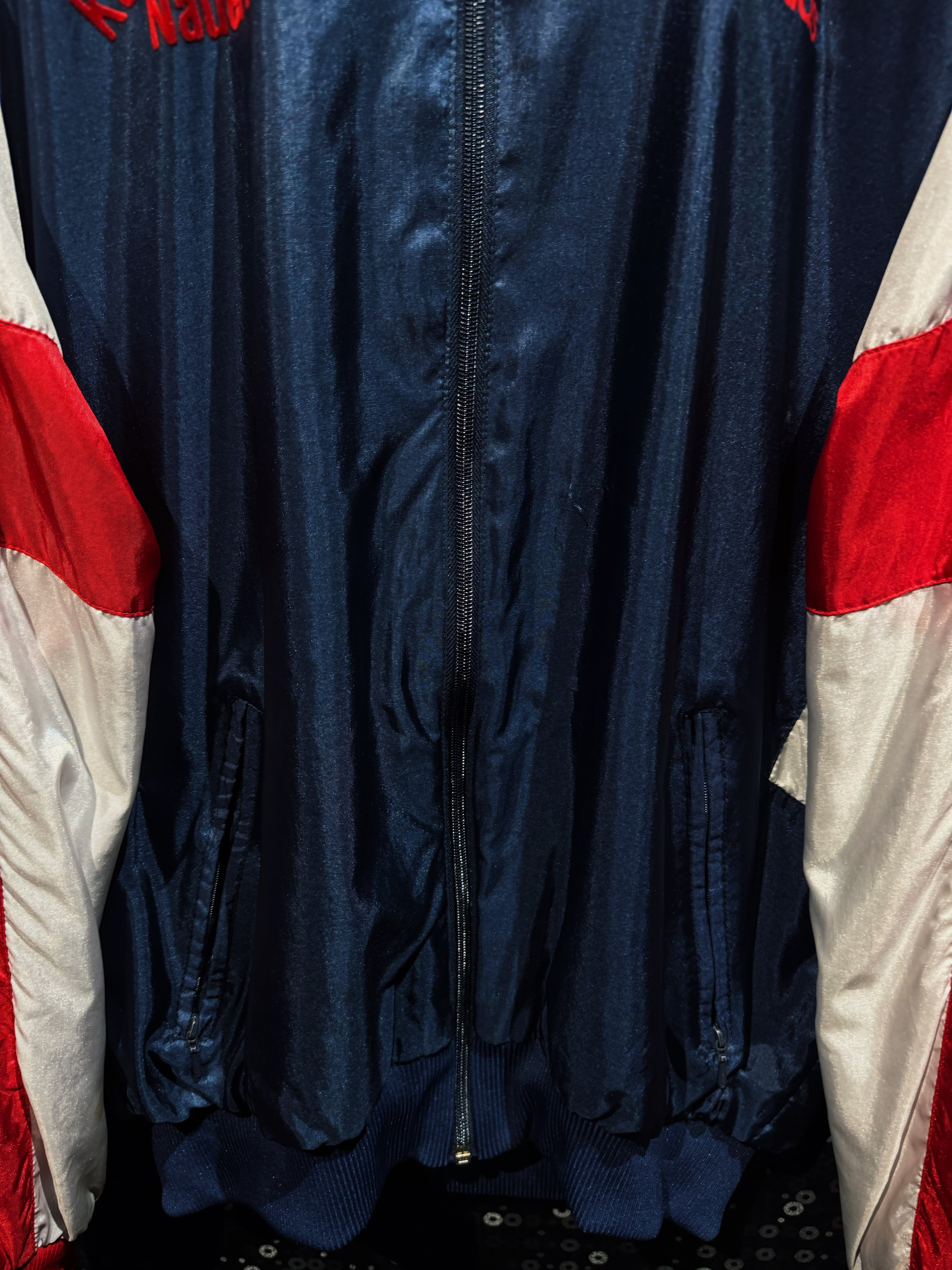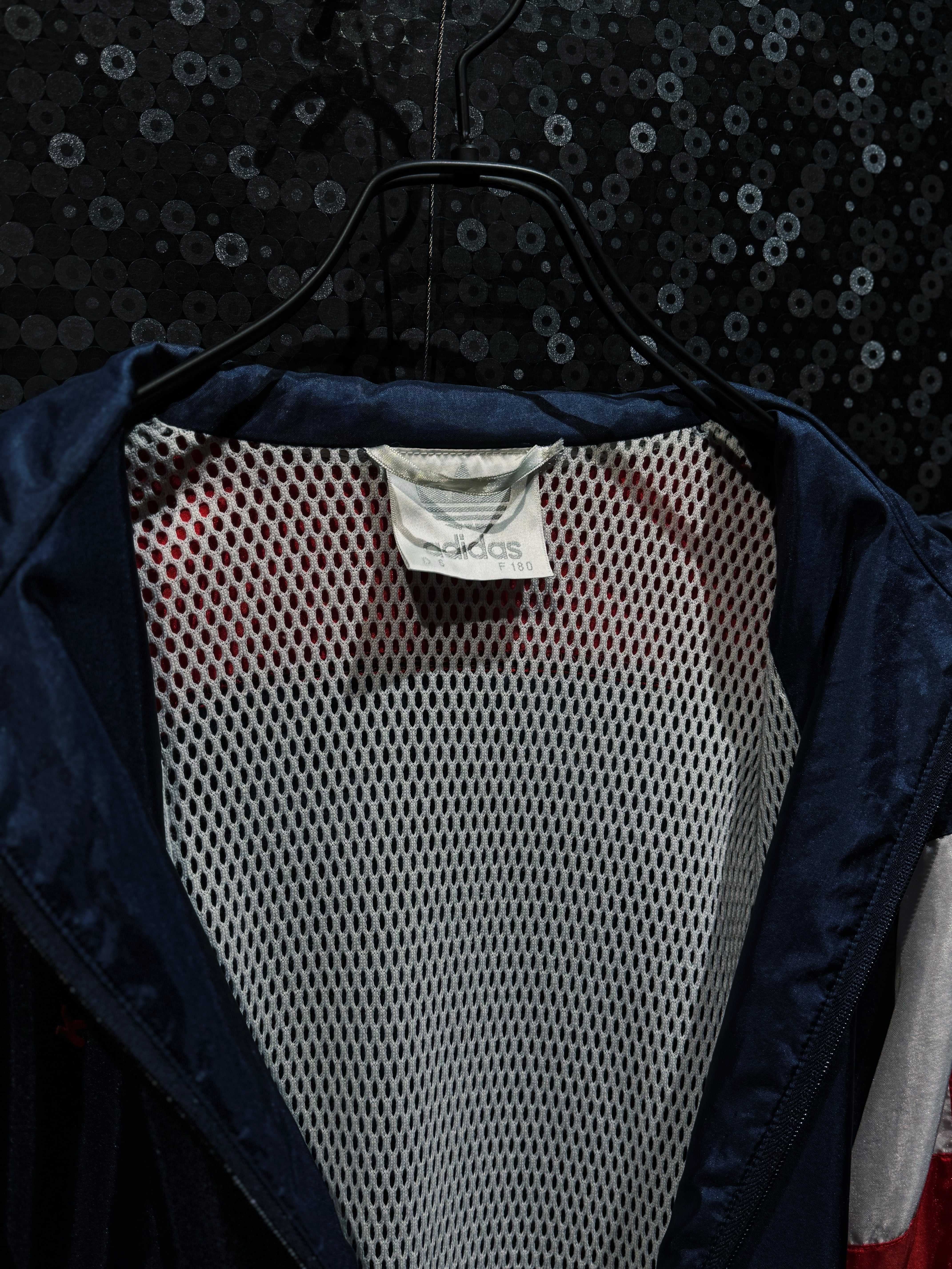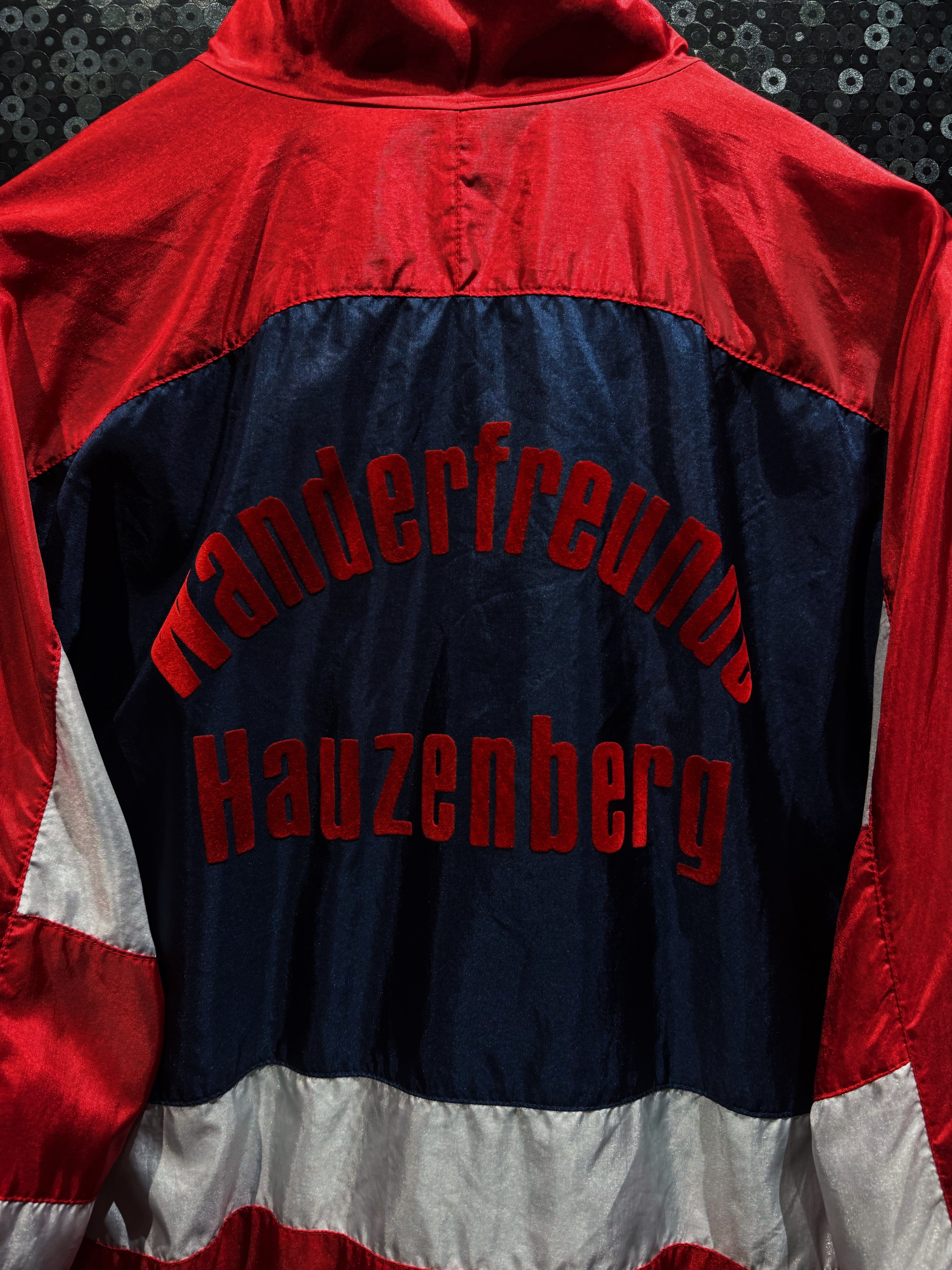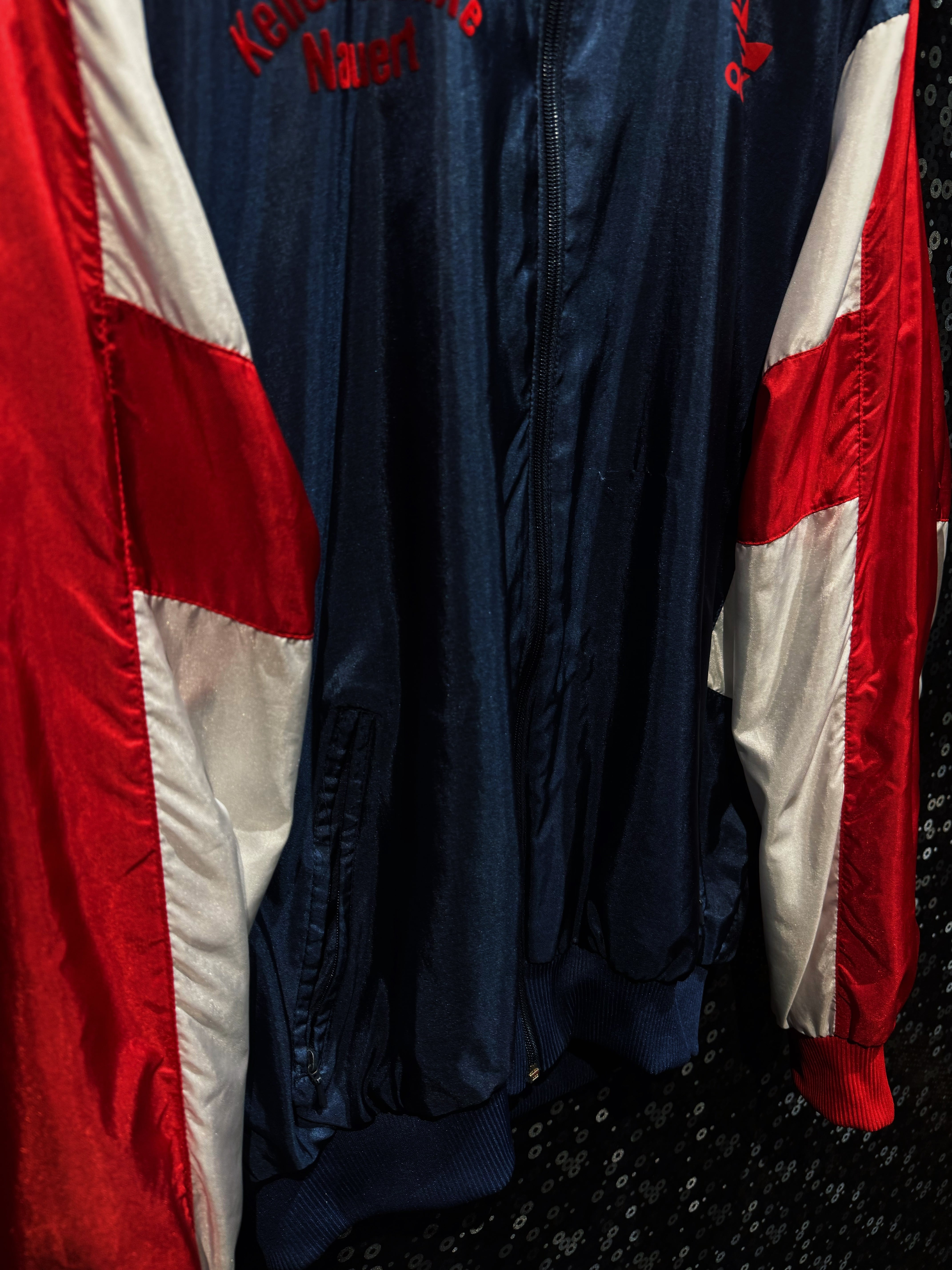 光沢感のあるナイロン素材は、当時らしいシャリ感と鈍い艶を持ち、ストリートにもスポーツにも振れる万能な質感。フロントにはレッドのトレフォイルロゴプリント。さらに胸元には“Kelerschänke Nauen”の立体フロッキーロゴ。