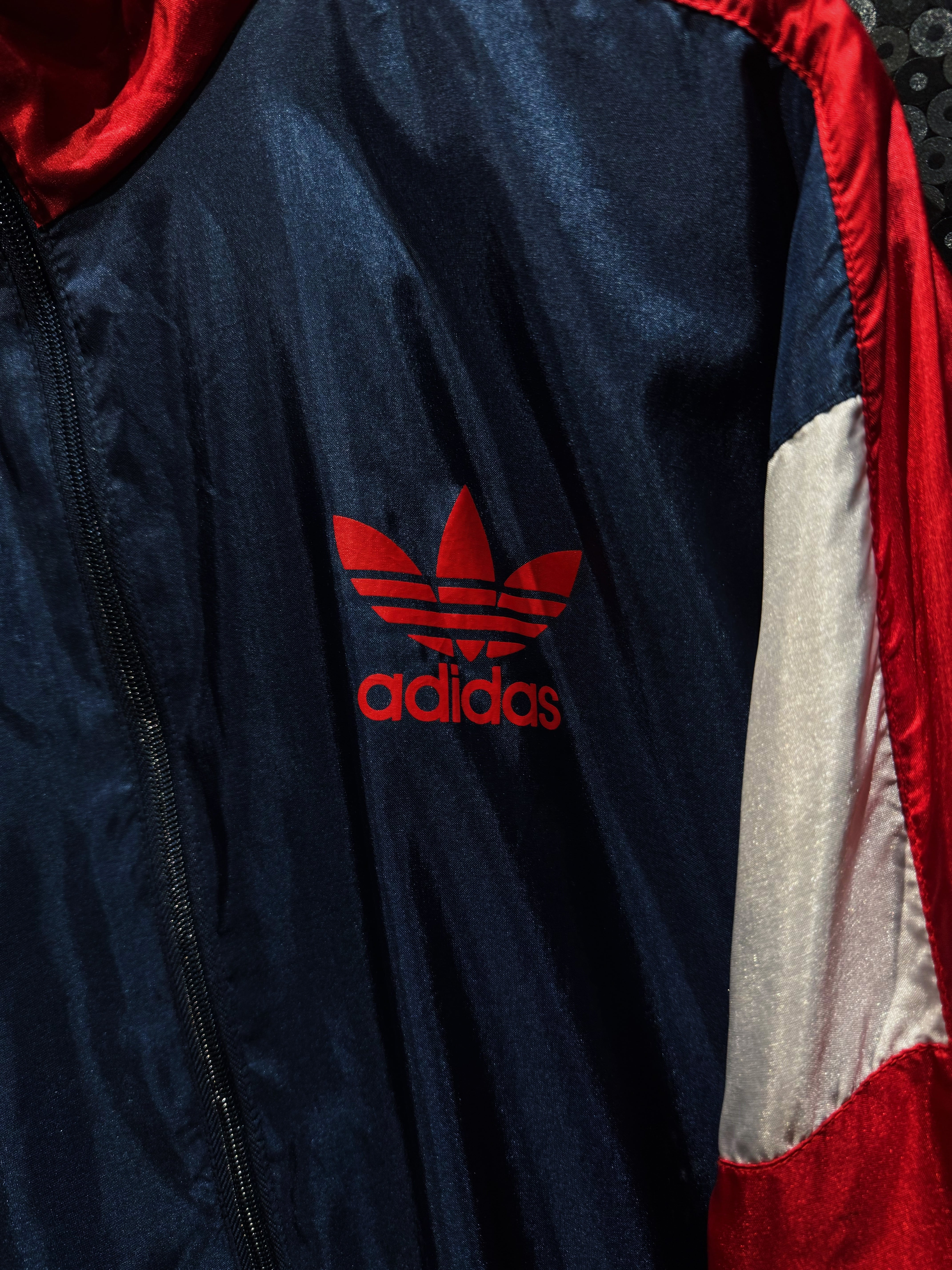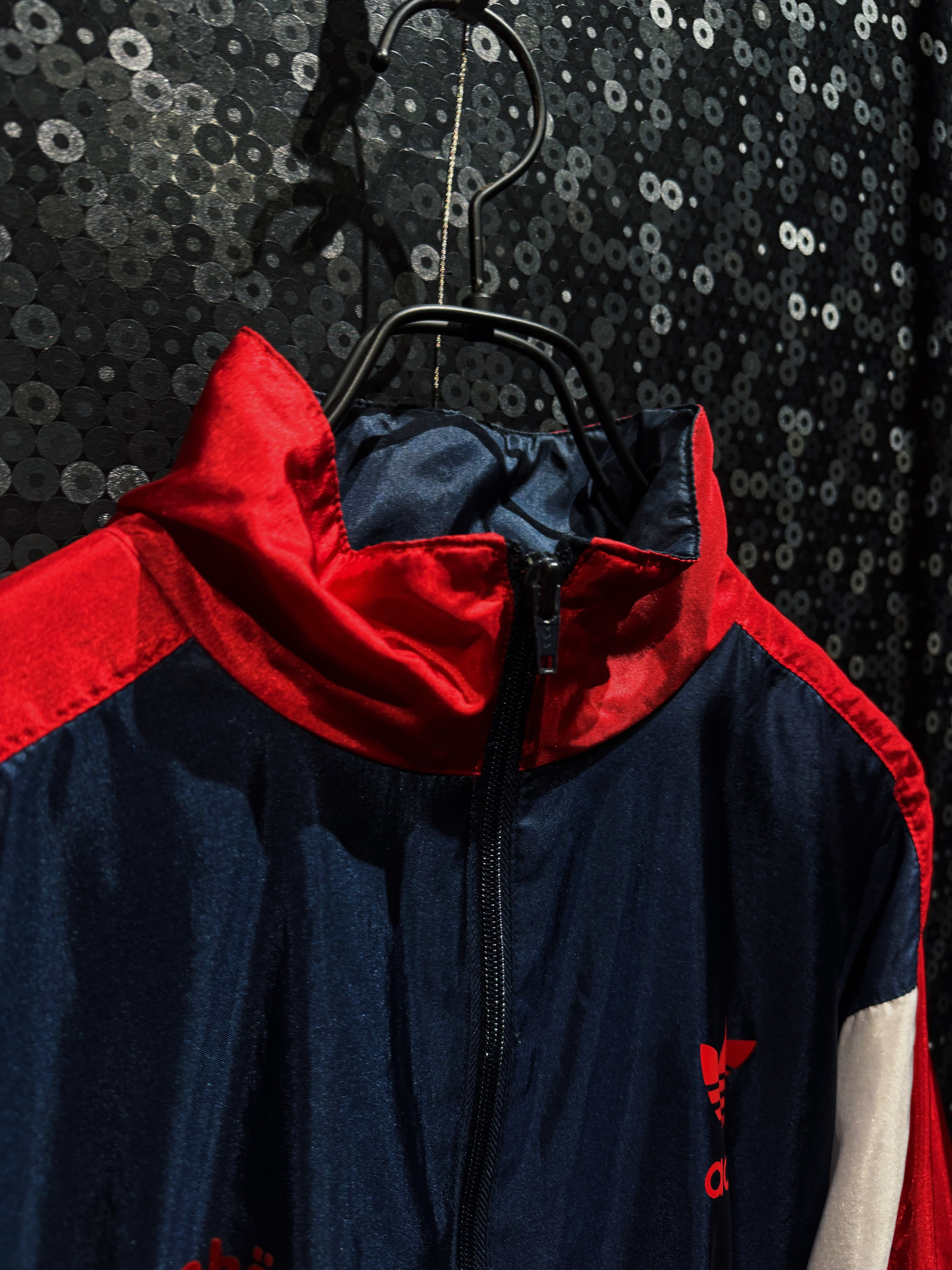 90s特有の大胆なカラーブロッキングが一瞬で目を奪う、adidas originalsナイロントラックジャケット。