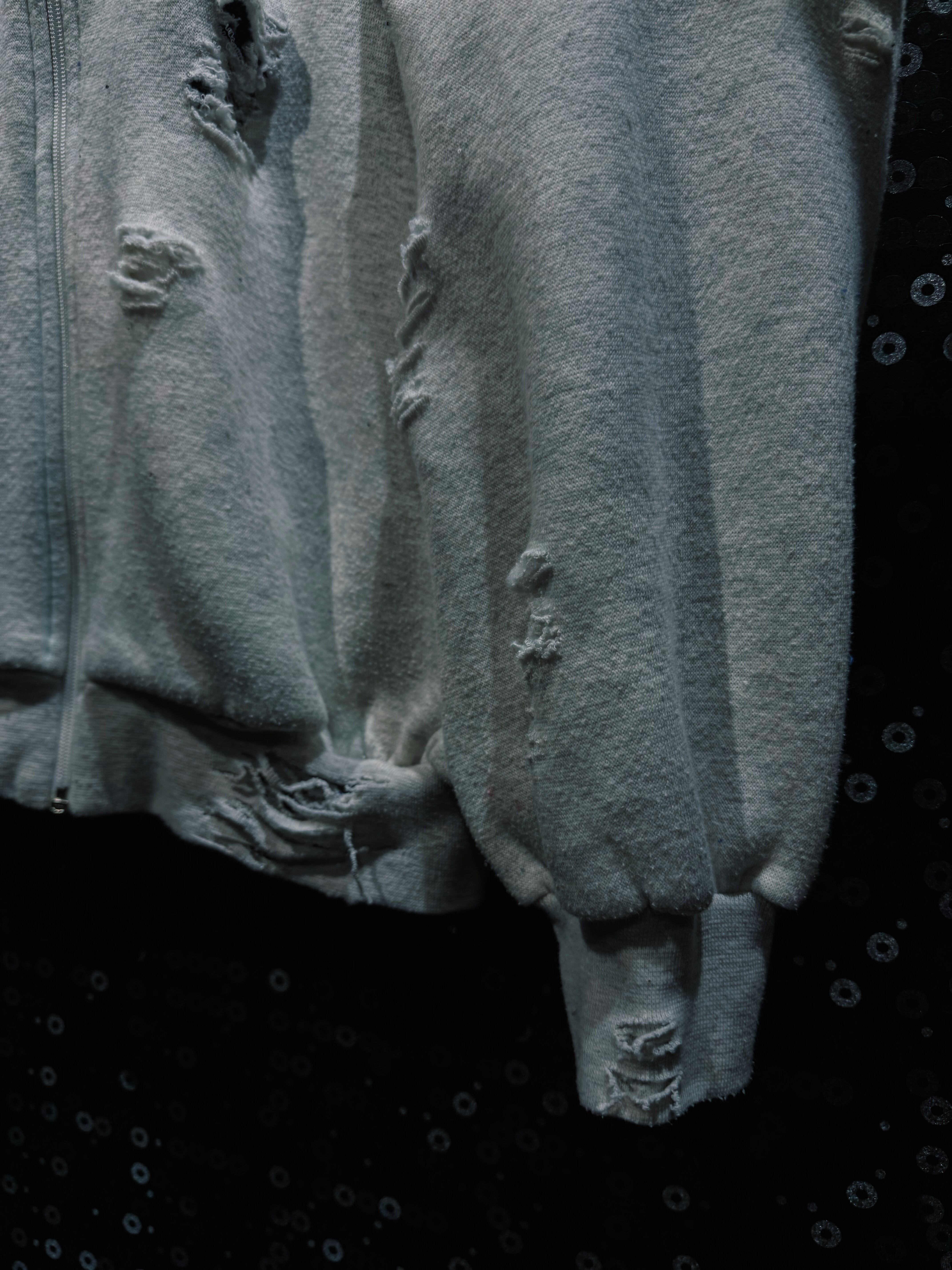 ライトグレー×グリーンのツートーンをベースに、全体へ荒々しいクラッシュを刻み込んだフルジップモデル。クリーンな配色と破壊的な加工のコントラストが際立つ一着。