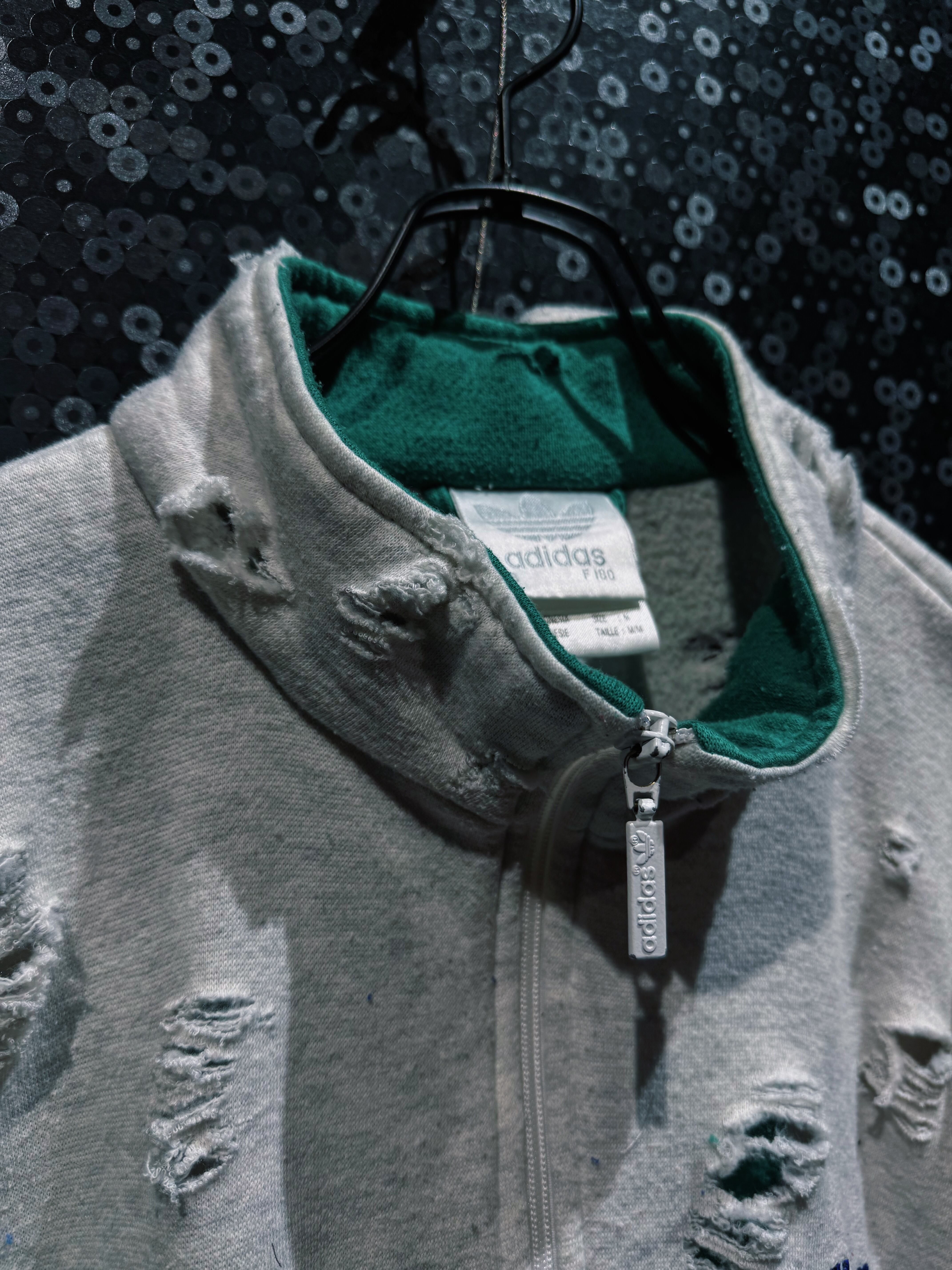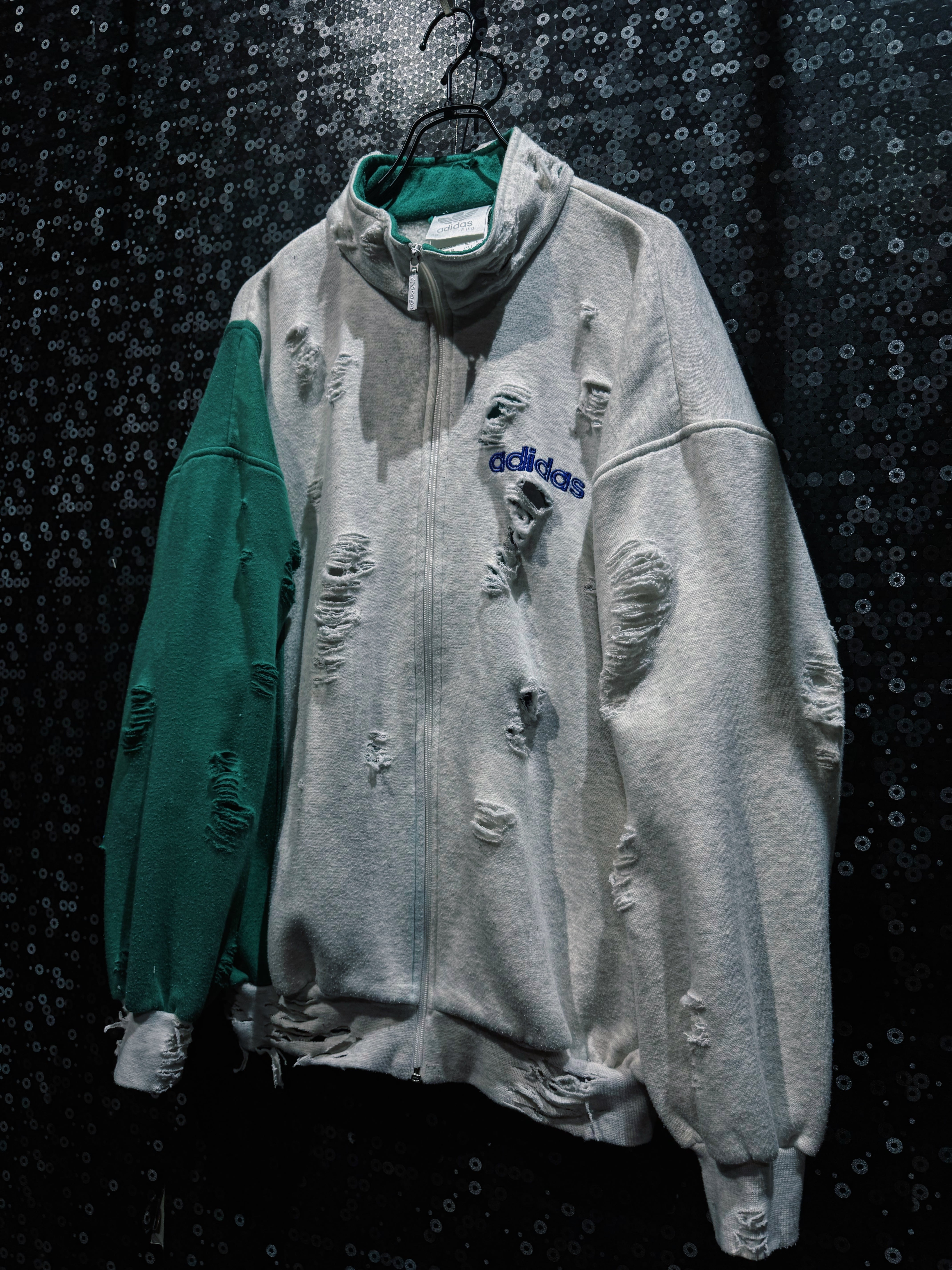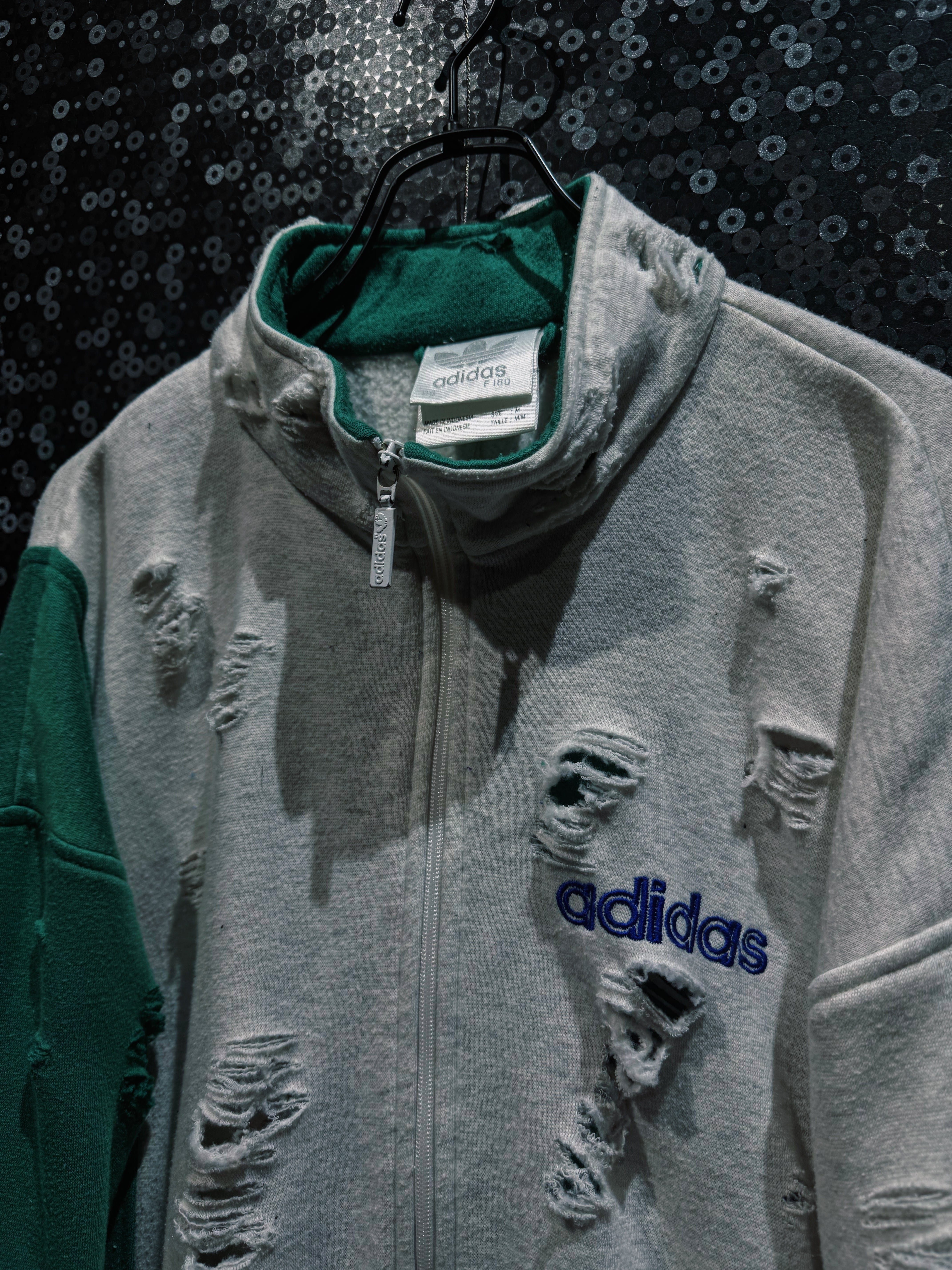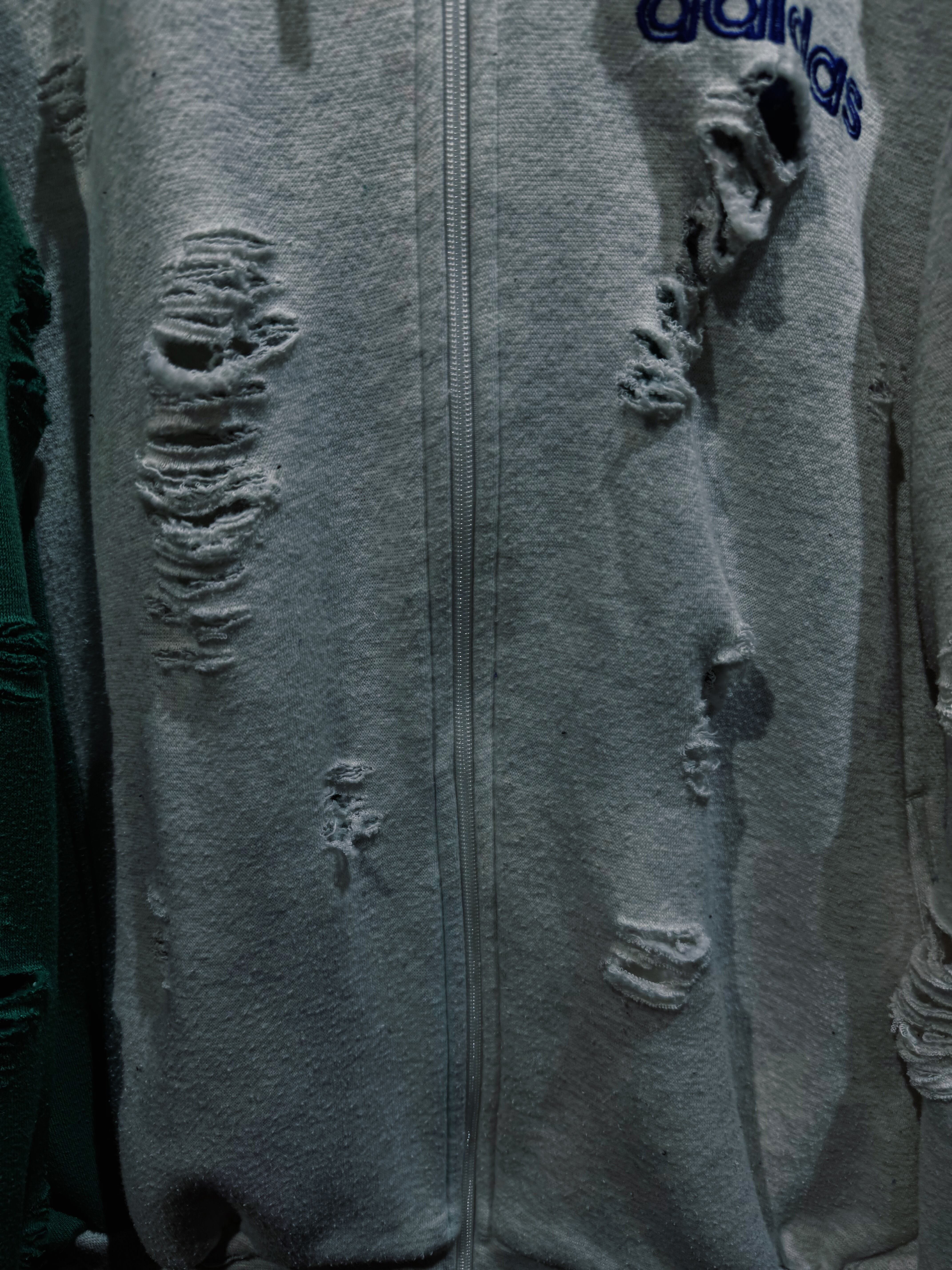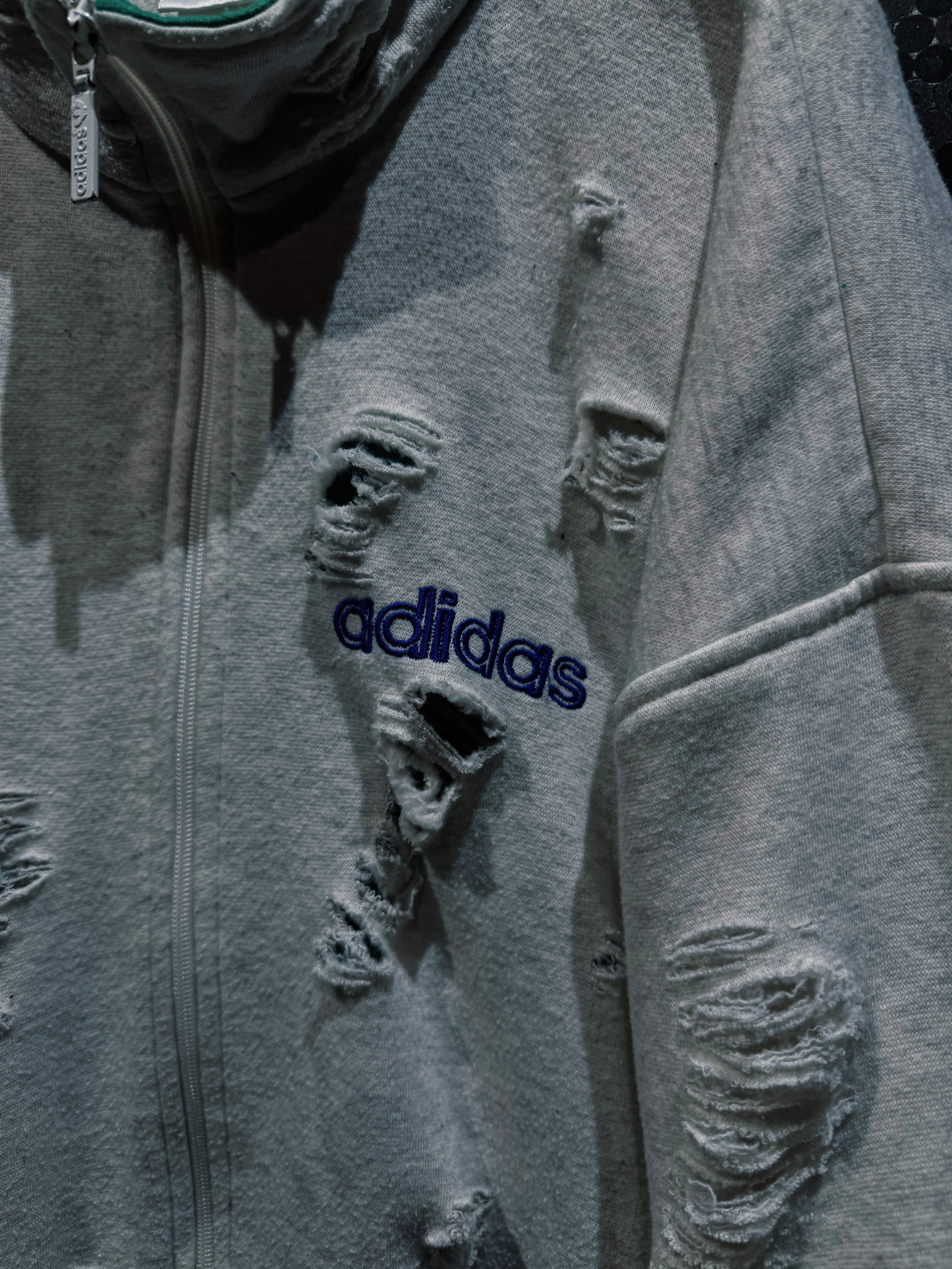 フロントはシンプルなジップ仕様。胸にはブルー刺繍のadidasロゴ。だがその周囲には大胆なダメージ。ロゴを守るように、あるいは侵食するように走る裂けが、この服のストーリーを物語る。