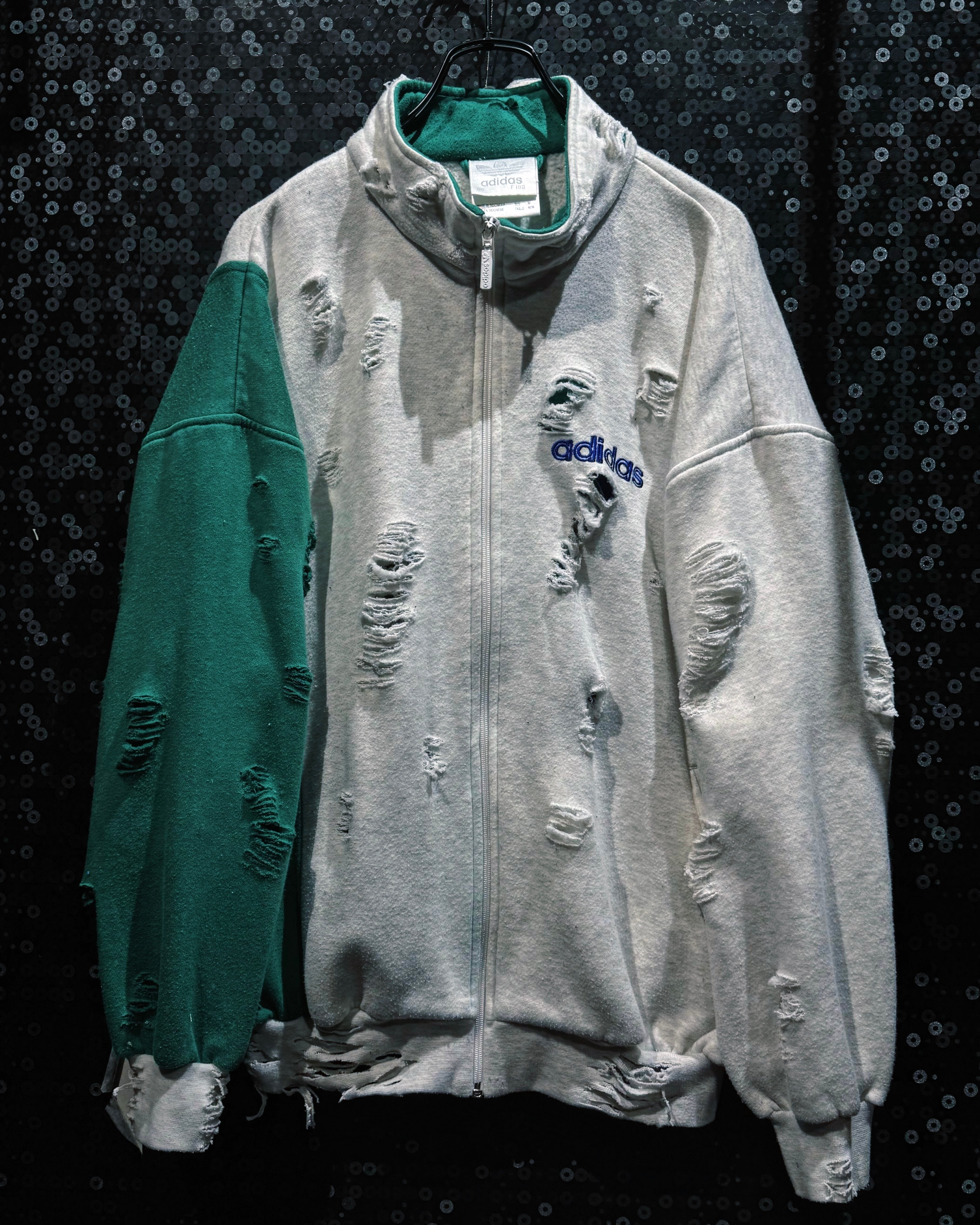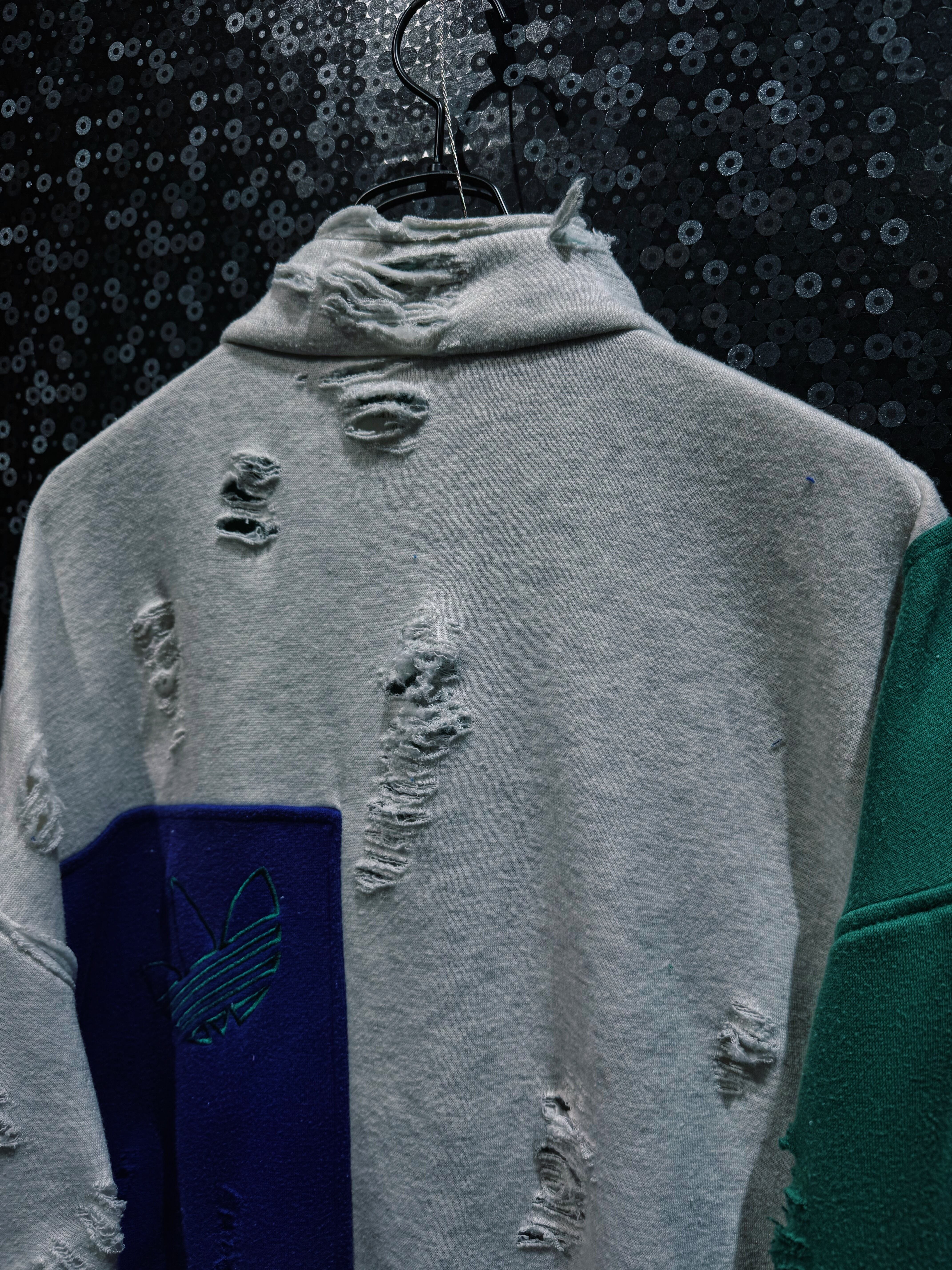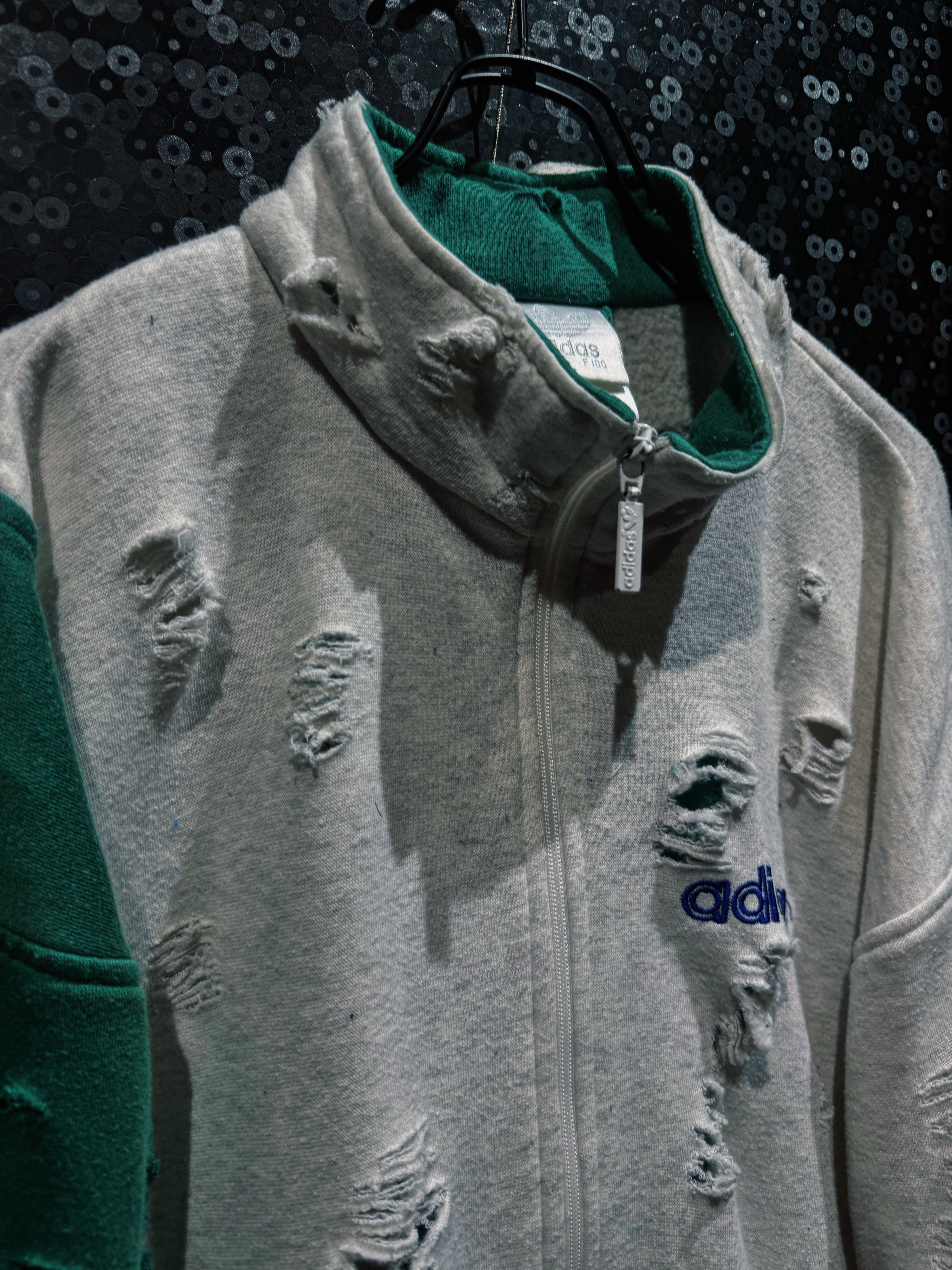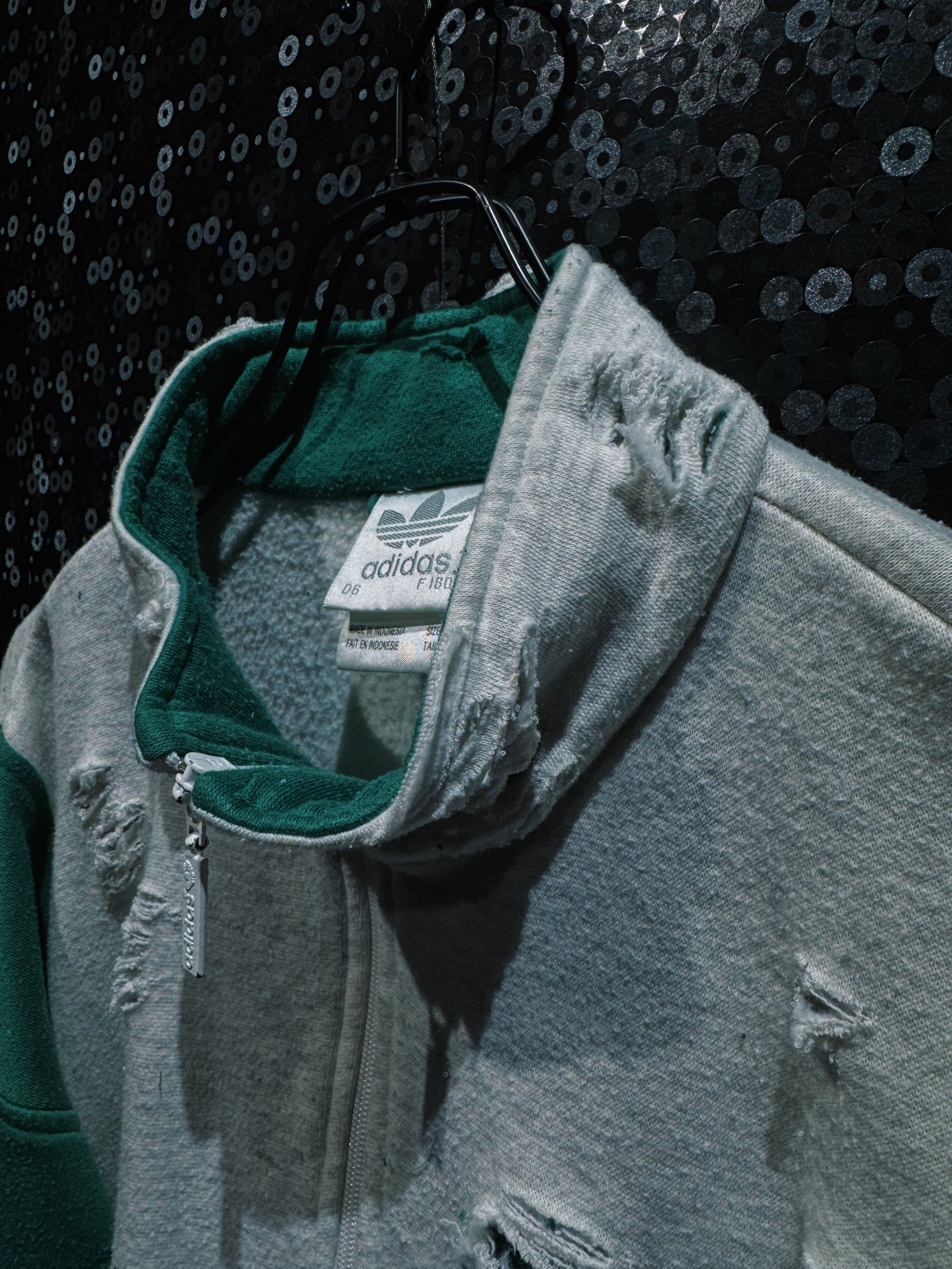 フロントはシンプルなジップ仕様。胸にはブルー刺繍のadidasロゴ。だがその周囲には大胆なダメージ。ロゴを守るように、あるいは侵食するように走る裂けが、この服のストーリーを物語る。
