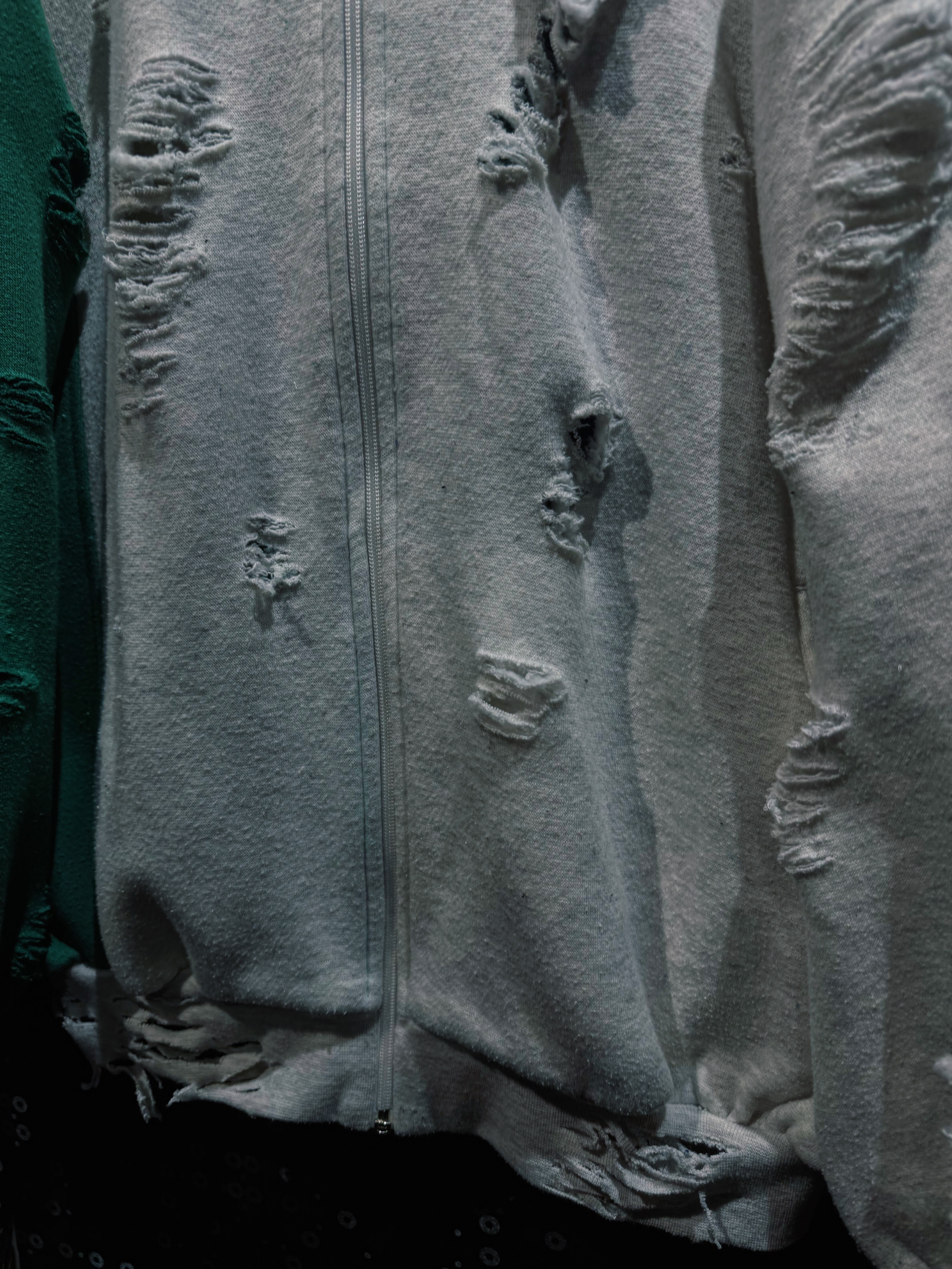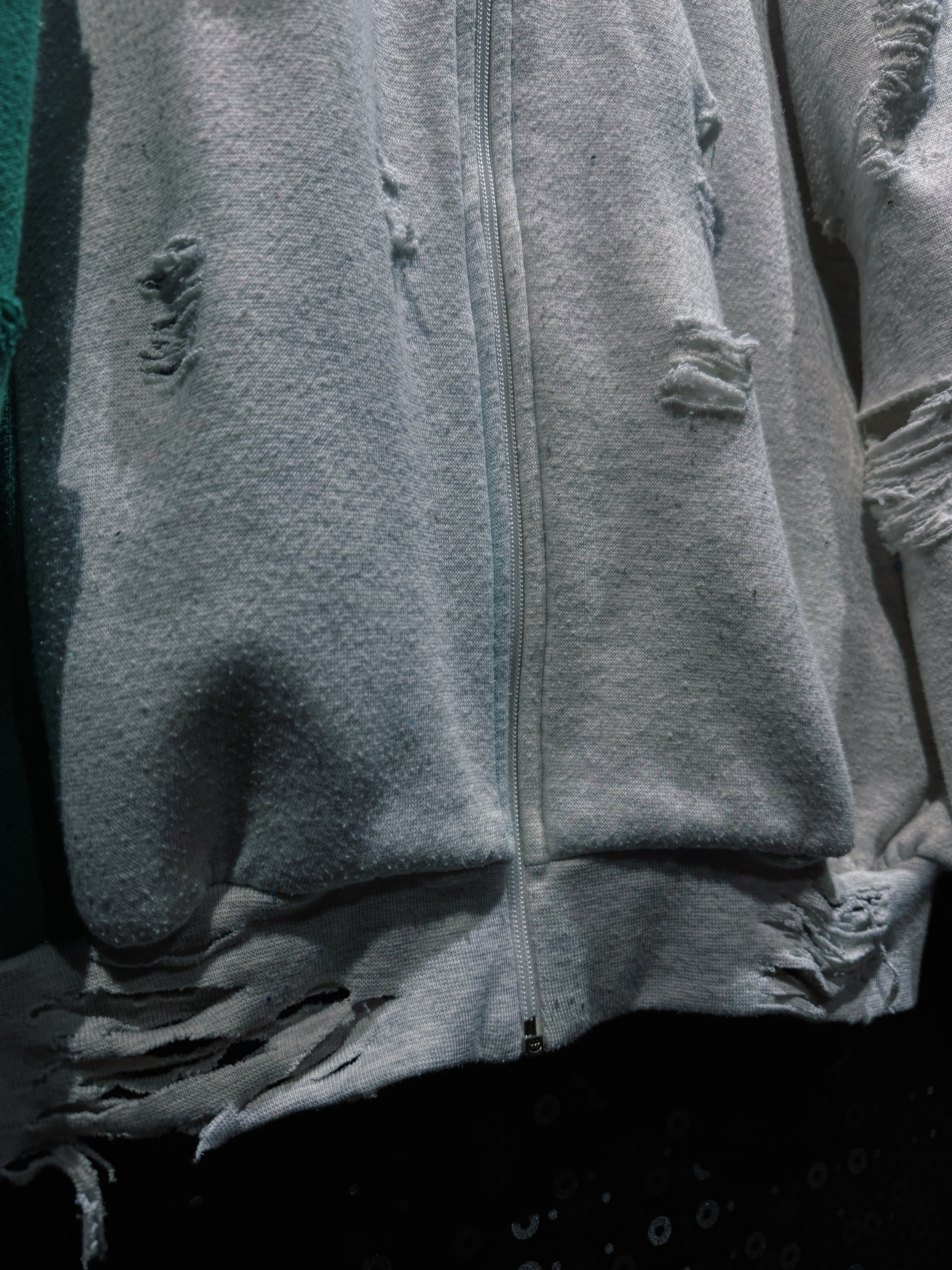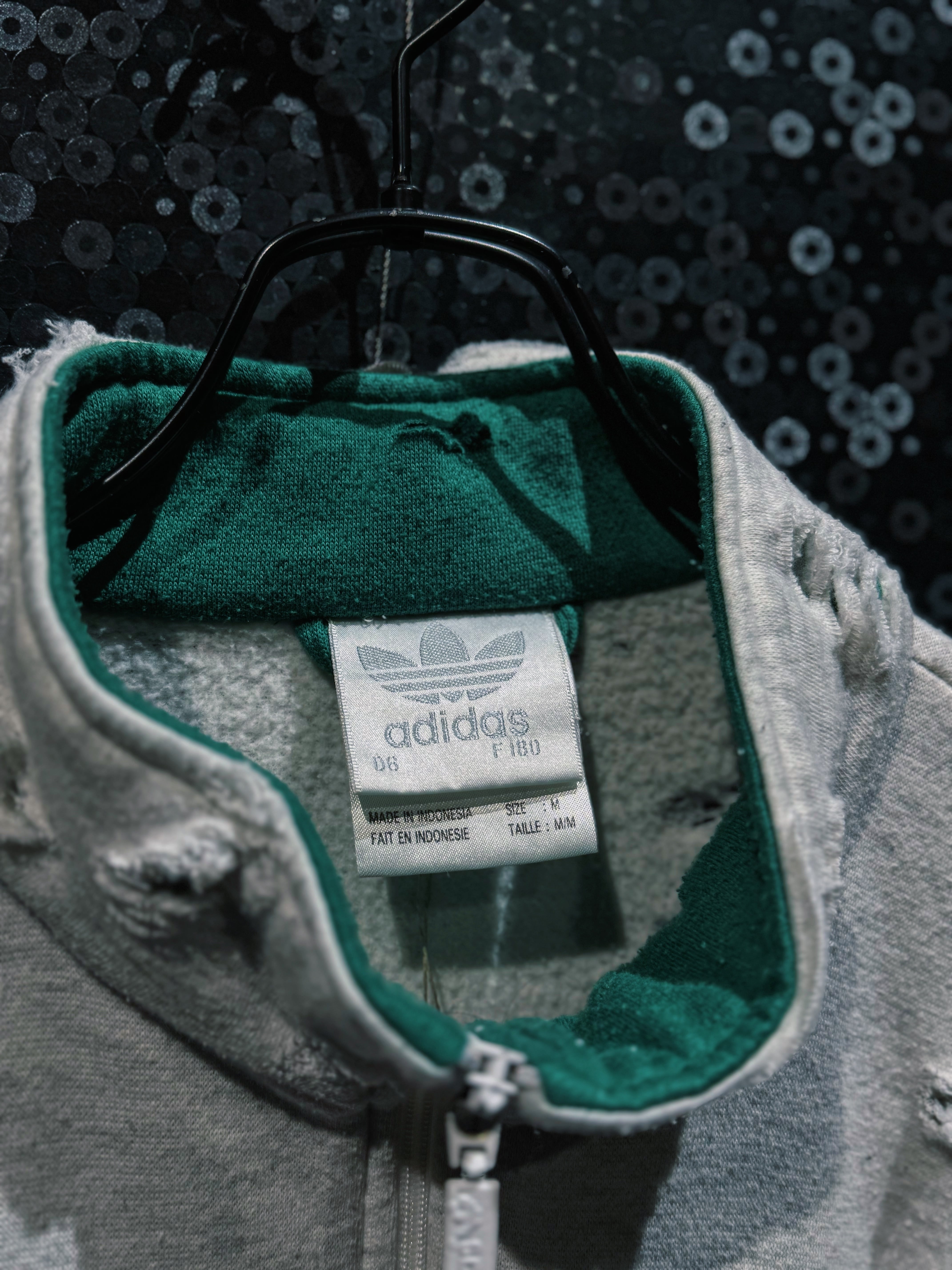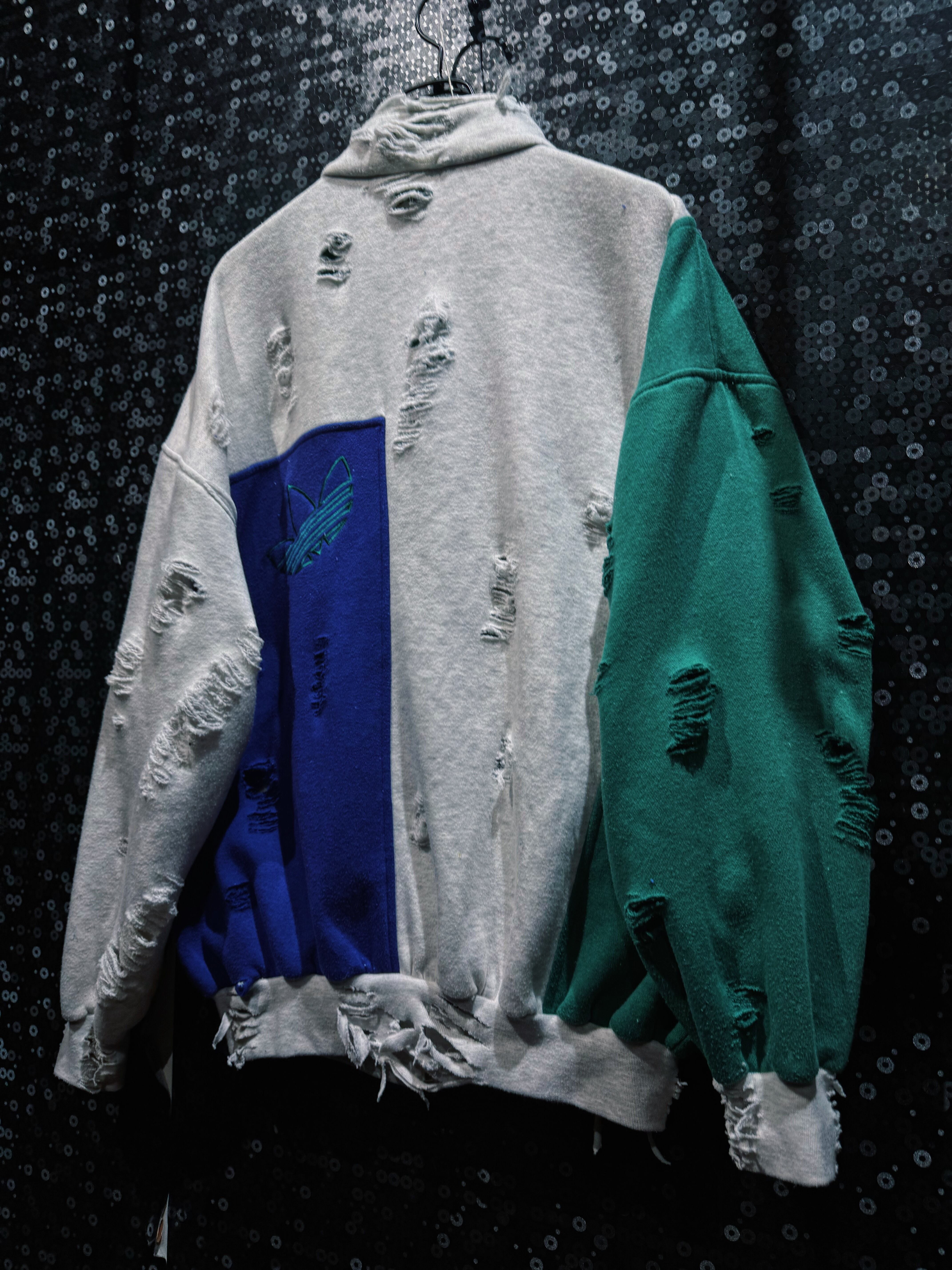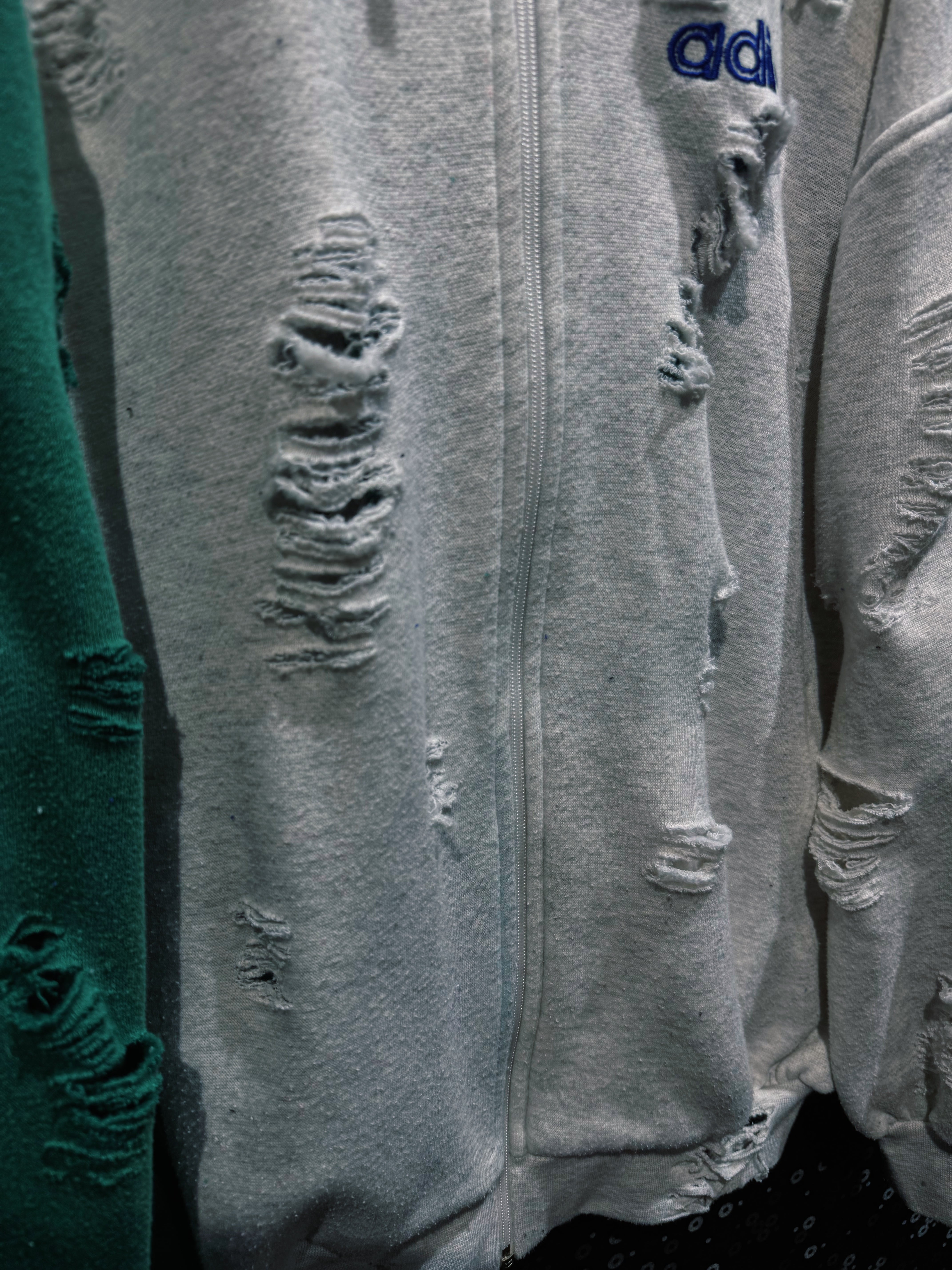 フロントはシンプルなジップ仕様。胸にはブルー刺繍のadidasロゴ。だがその周囲には大胆なダメージ。ロゴを守るように、あるいは侵食するように走る裂けが、この服のストーリーを物語る。