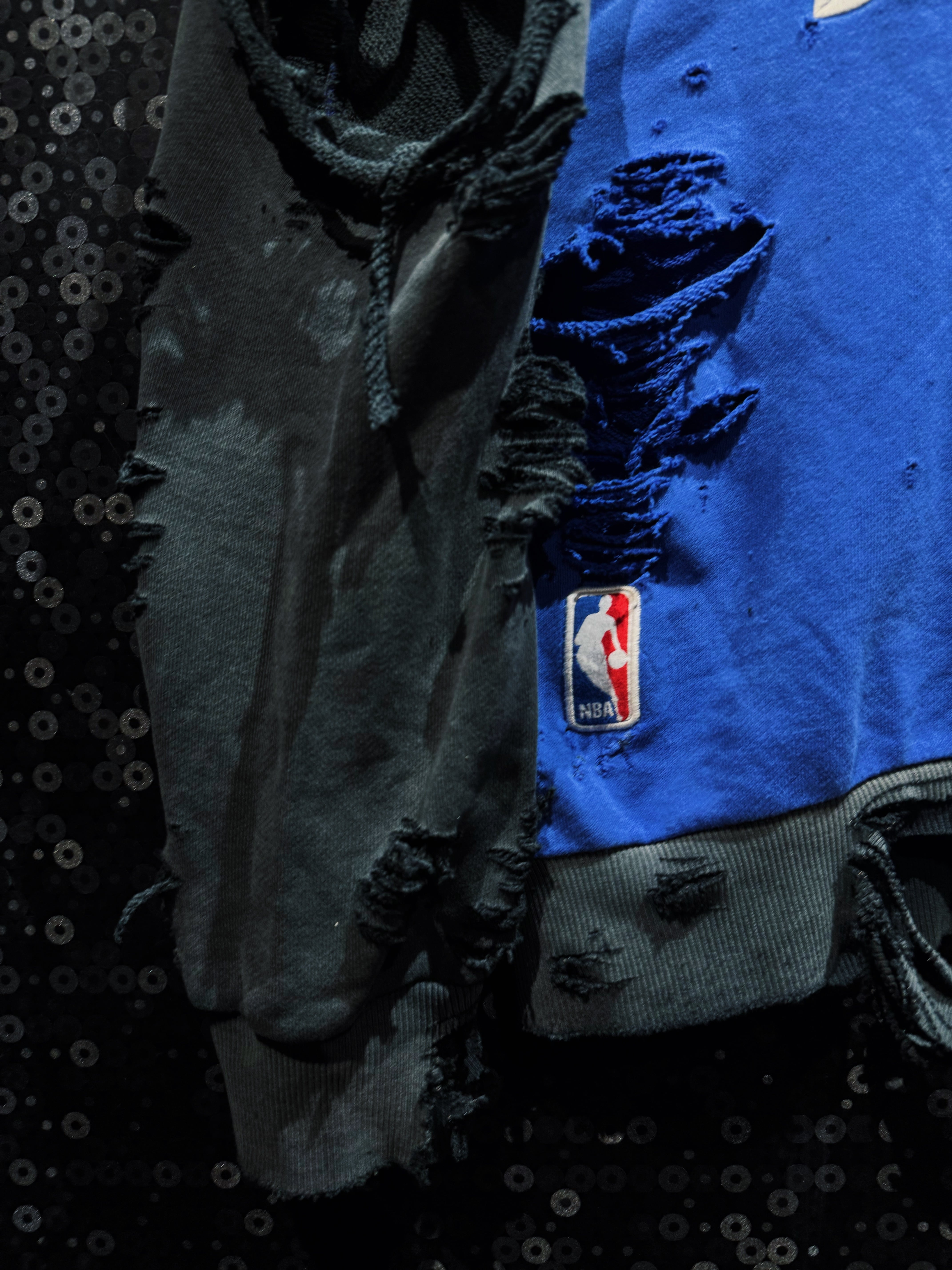 adidasトレフォイルのハーフジップボディをベースに、NBA“Denver Nuggets”のパネルを大胆にドッキング。スポーツカルチャー同士を衝突させ、さらにボロで崩した、AEIEMらしい再構築モデル。