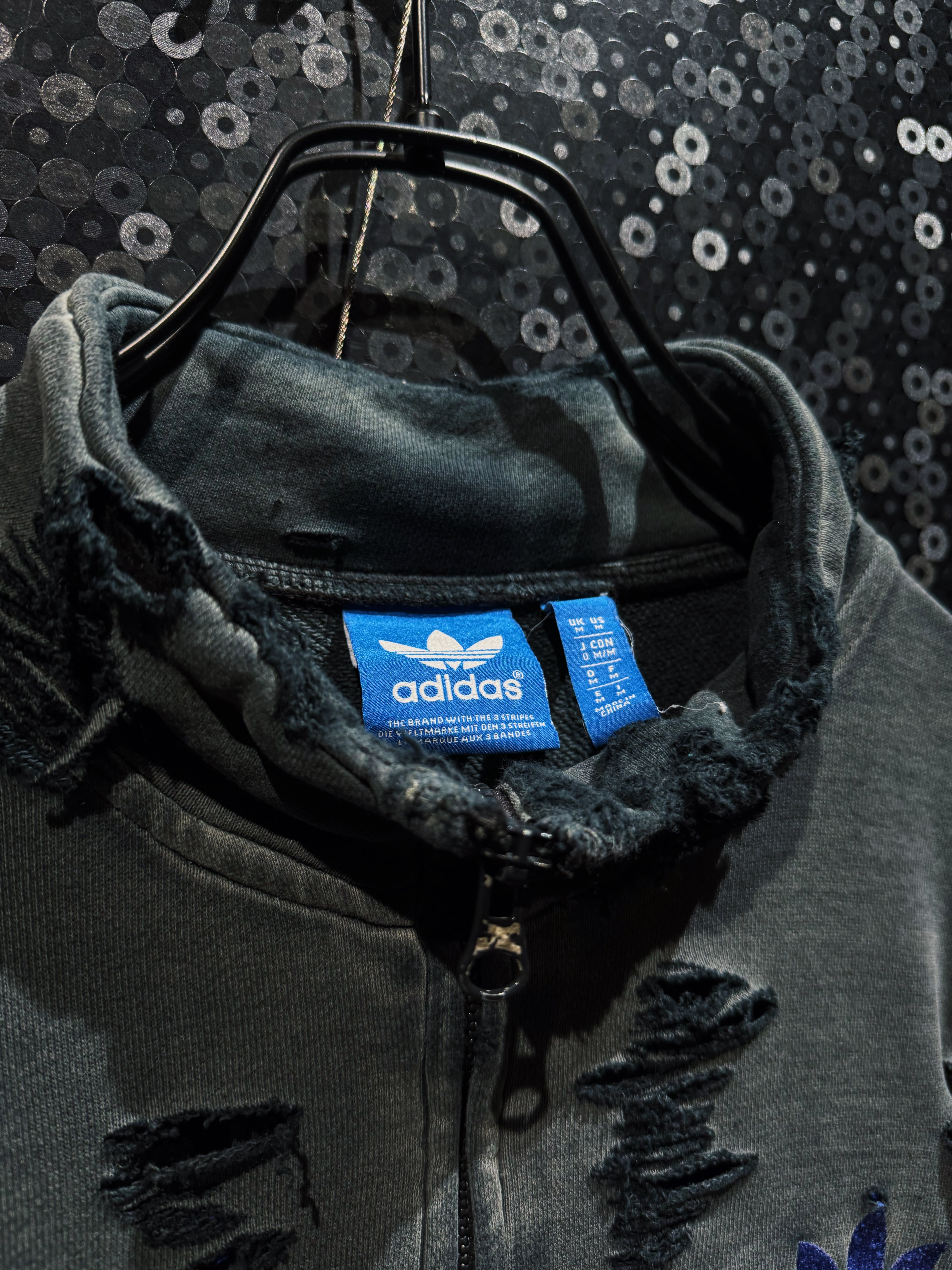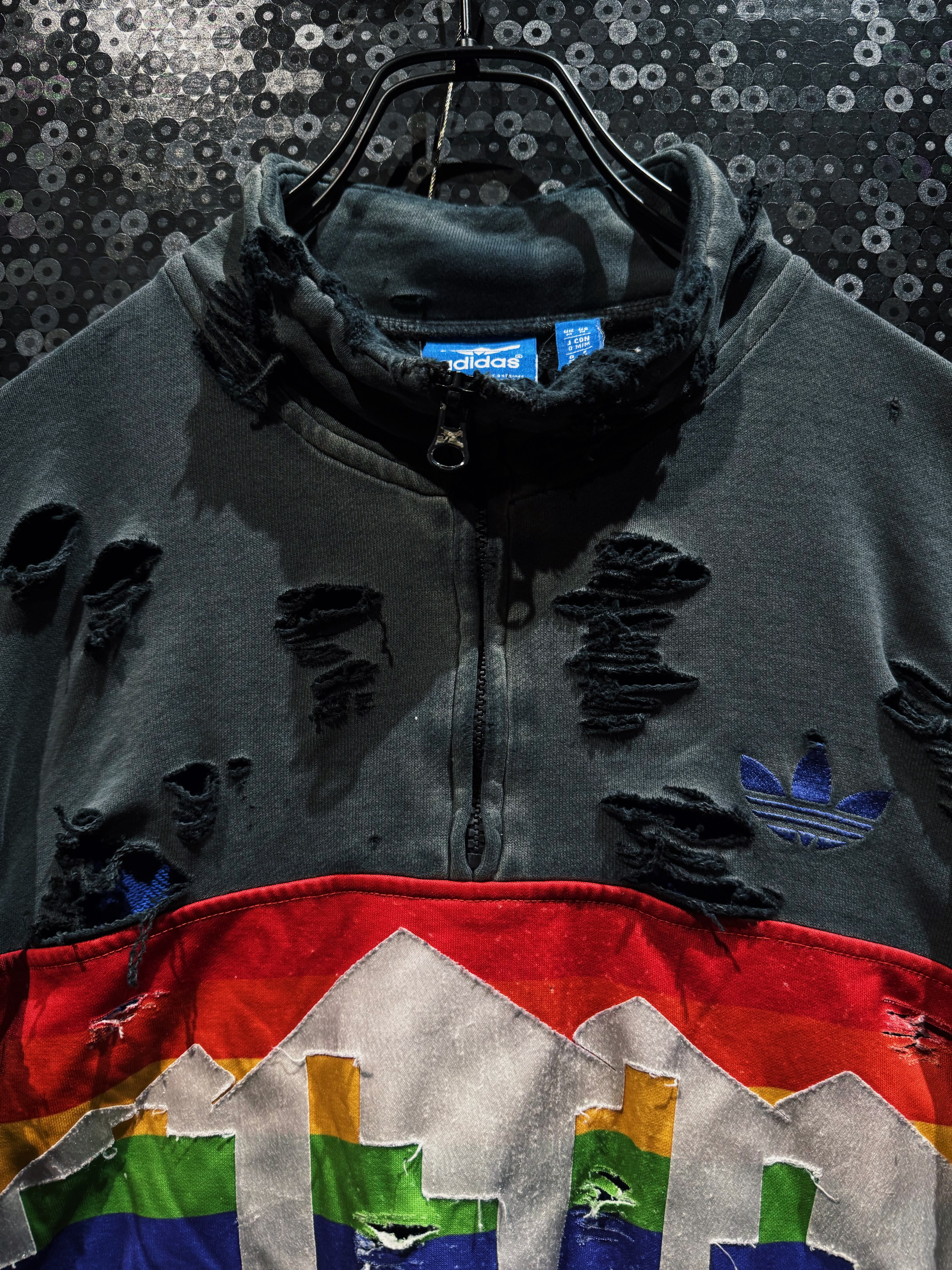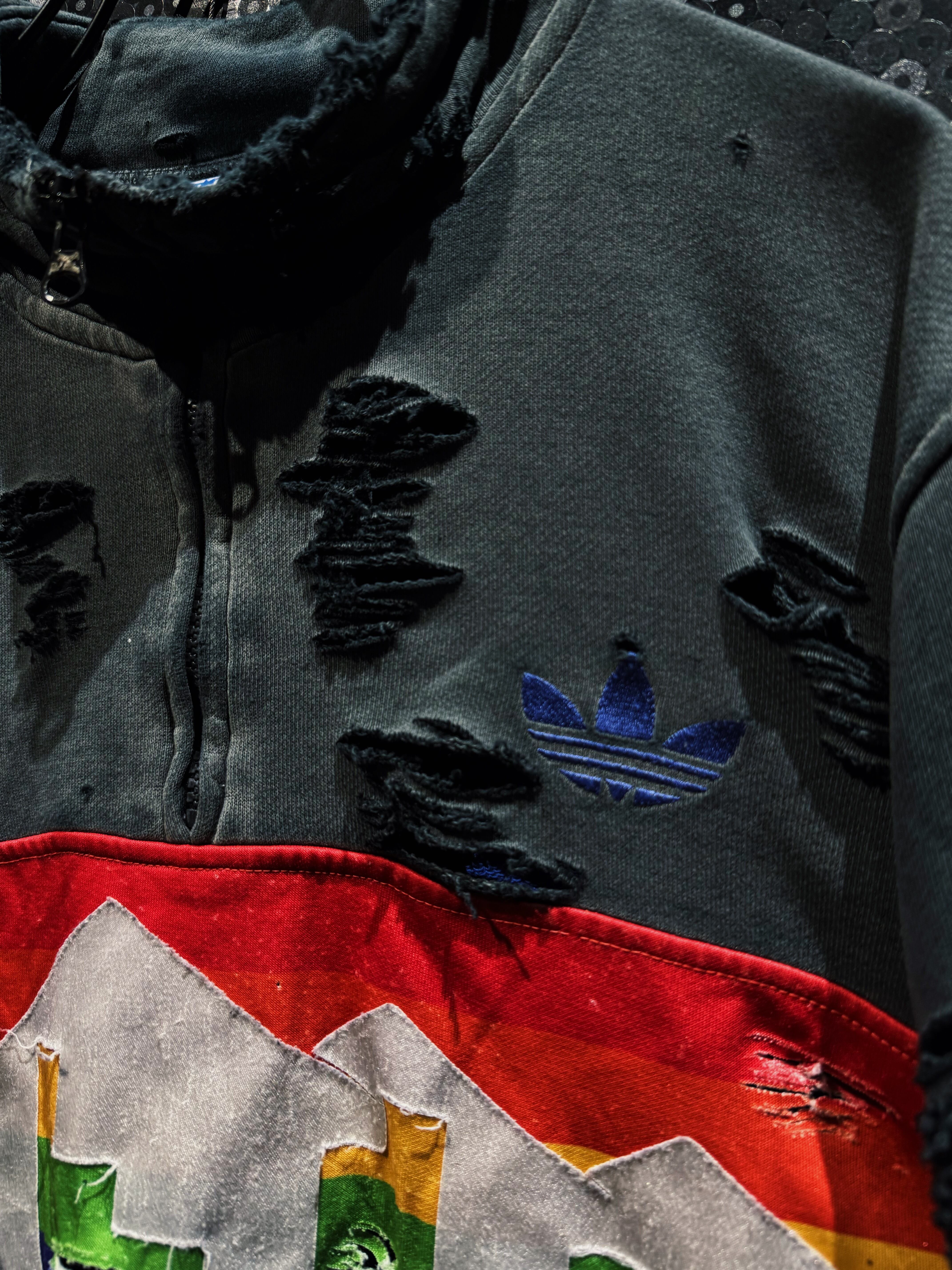 上部はフェードしたダークトーンのadidasハーフジップ。ネック周りは断ち切りで荒々しく処理し、フード縁や襟元に立体的なクラッシュを形成。胸元にはブルーのトレフォイル刺繍が残り、ブランドのアイデンティティを静かに主張する。