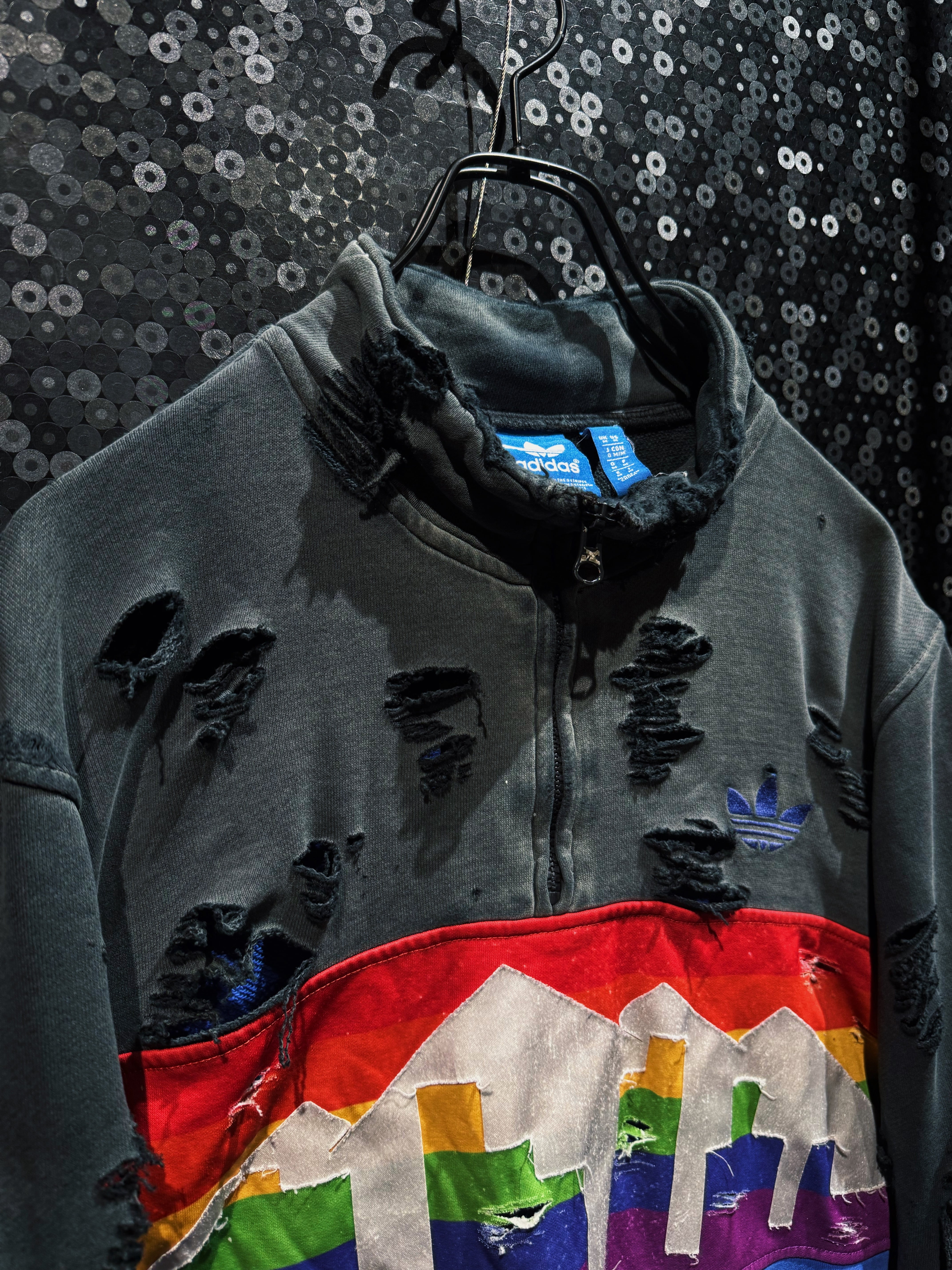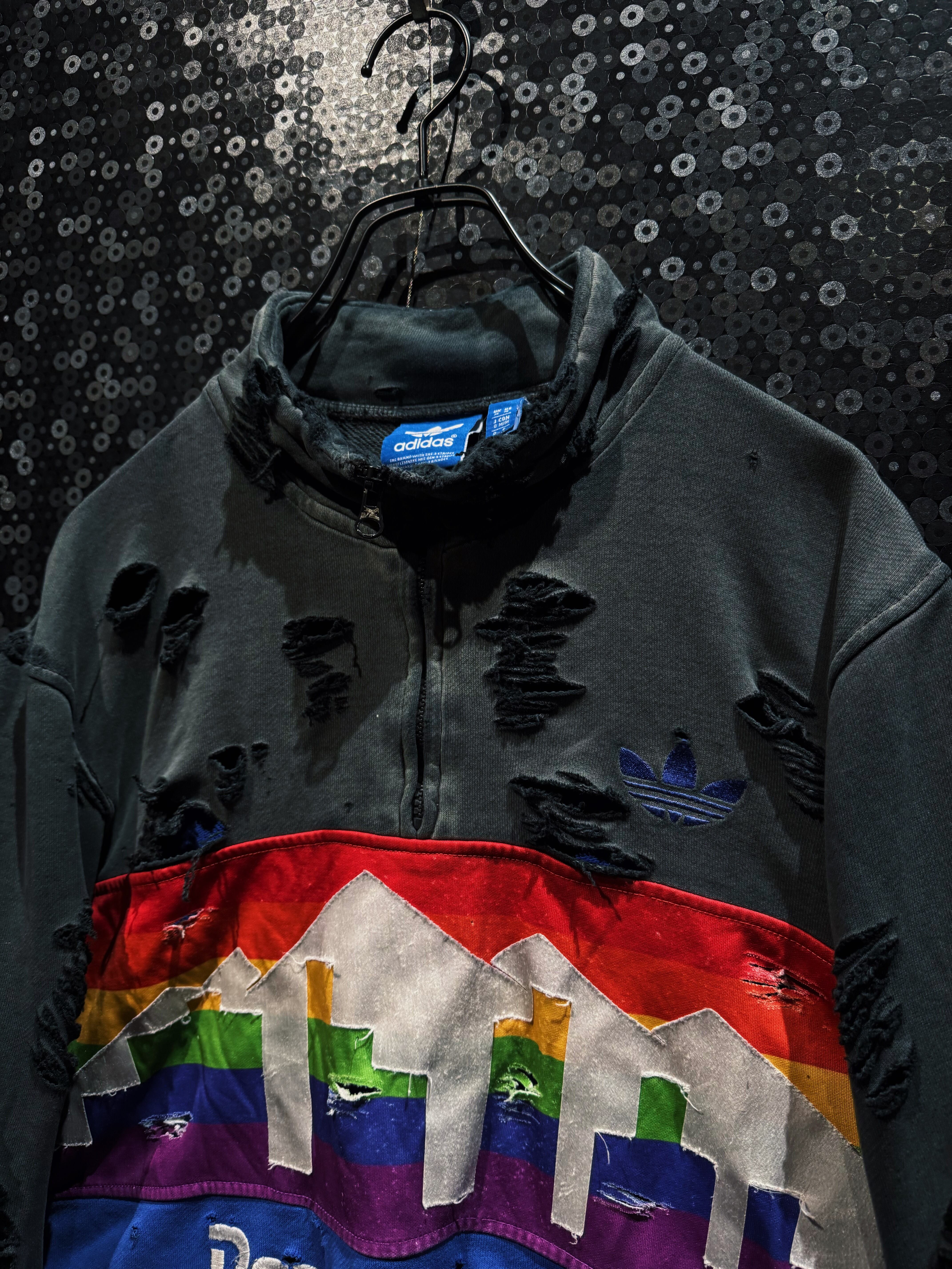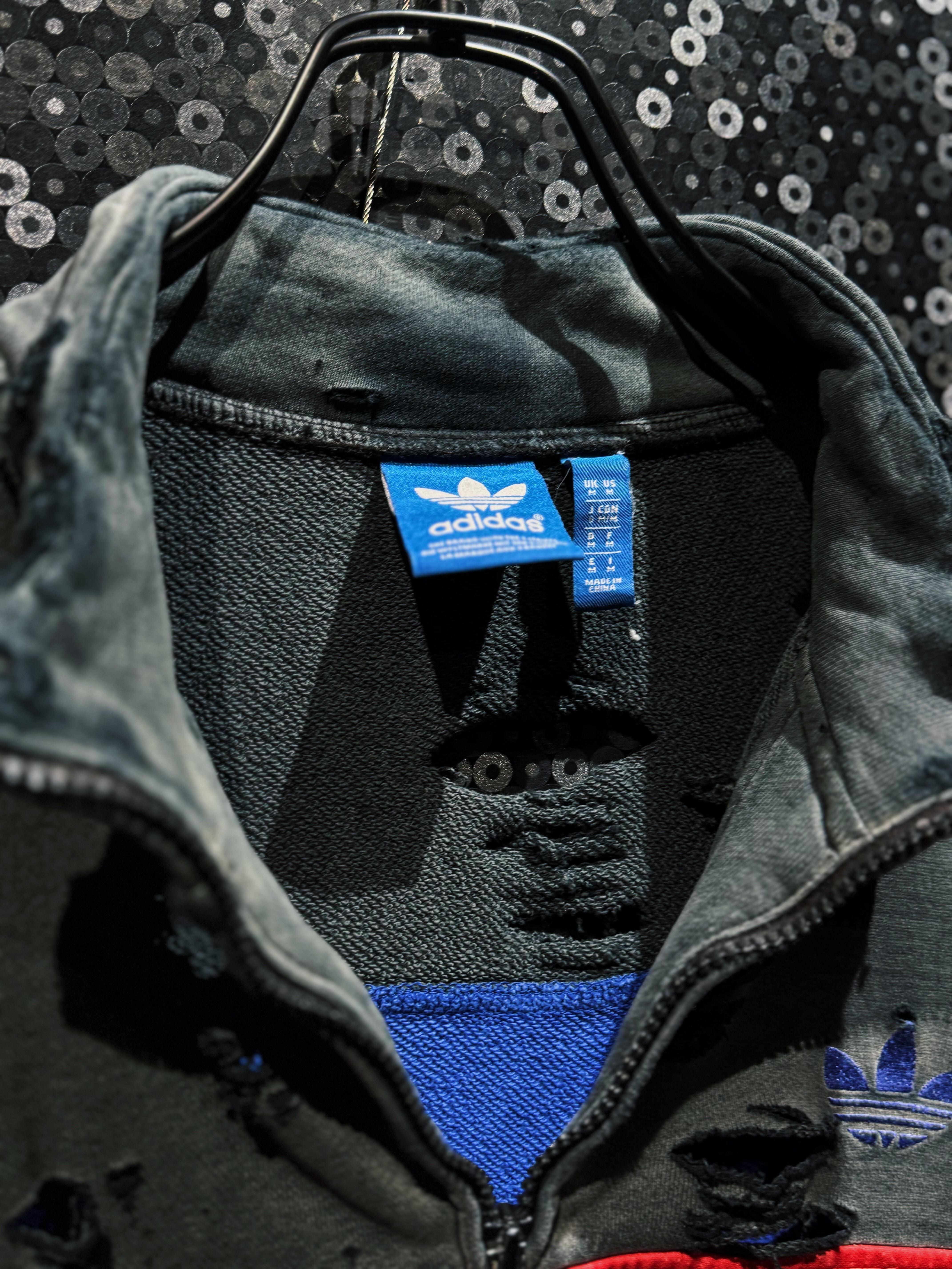 上部はフェードしたダークトーンのadidasハーフジップ。ネック周りは断ち切りで荒々しく処理し、フード縁や襟元に立体的なクラッシュを形成。胸元にはブルーのトレフォイル刺繍が残り、ブランドのアイデンティティを静かに主張する。