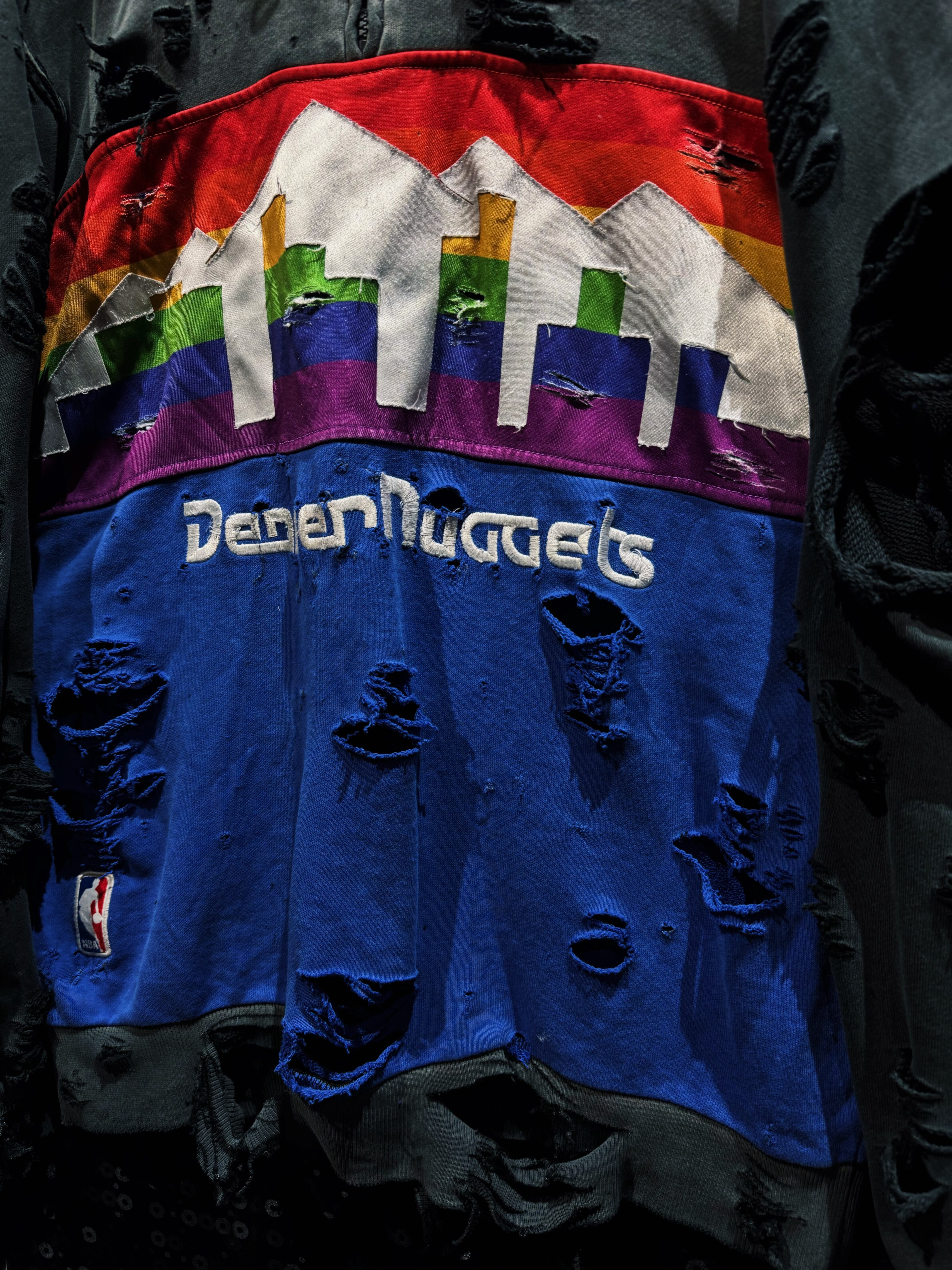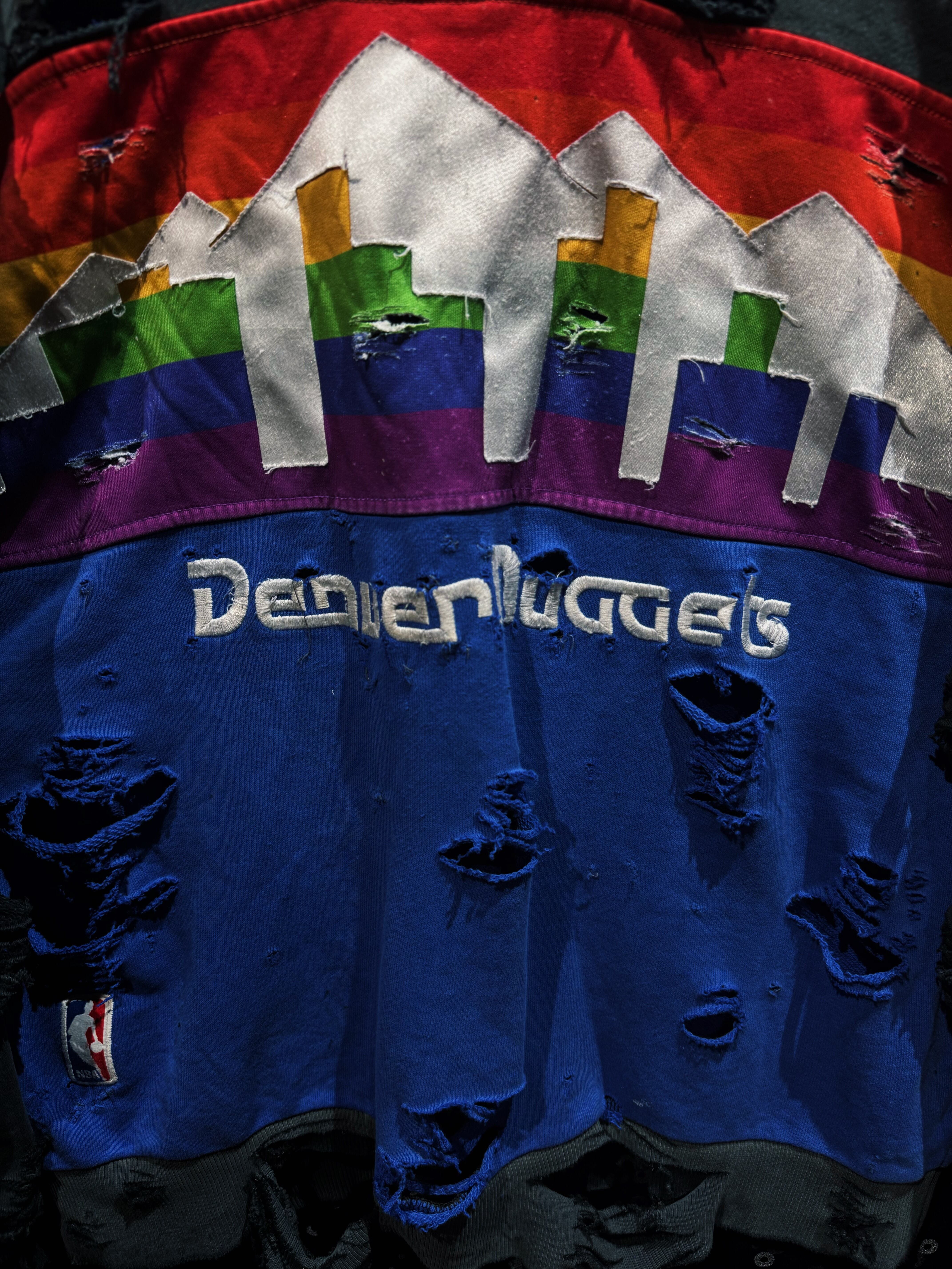 そこへ重ねられたのが、カラフルなデンバー・ナゲッツのグラフィックパネル。レインボーカラーの山岳モチーフと“Denver Nuggets”ロゴが強烈なコントラストを生む。あえて縫い付け感を残し、境界線を強調することで、ドッキングそのものをデザインに昇華。