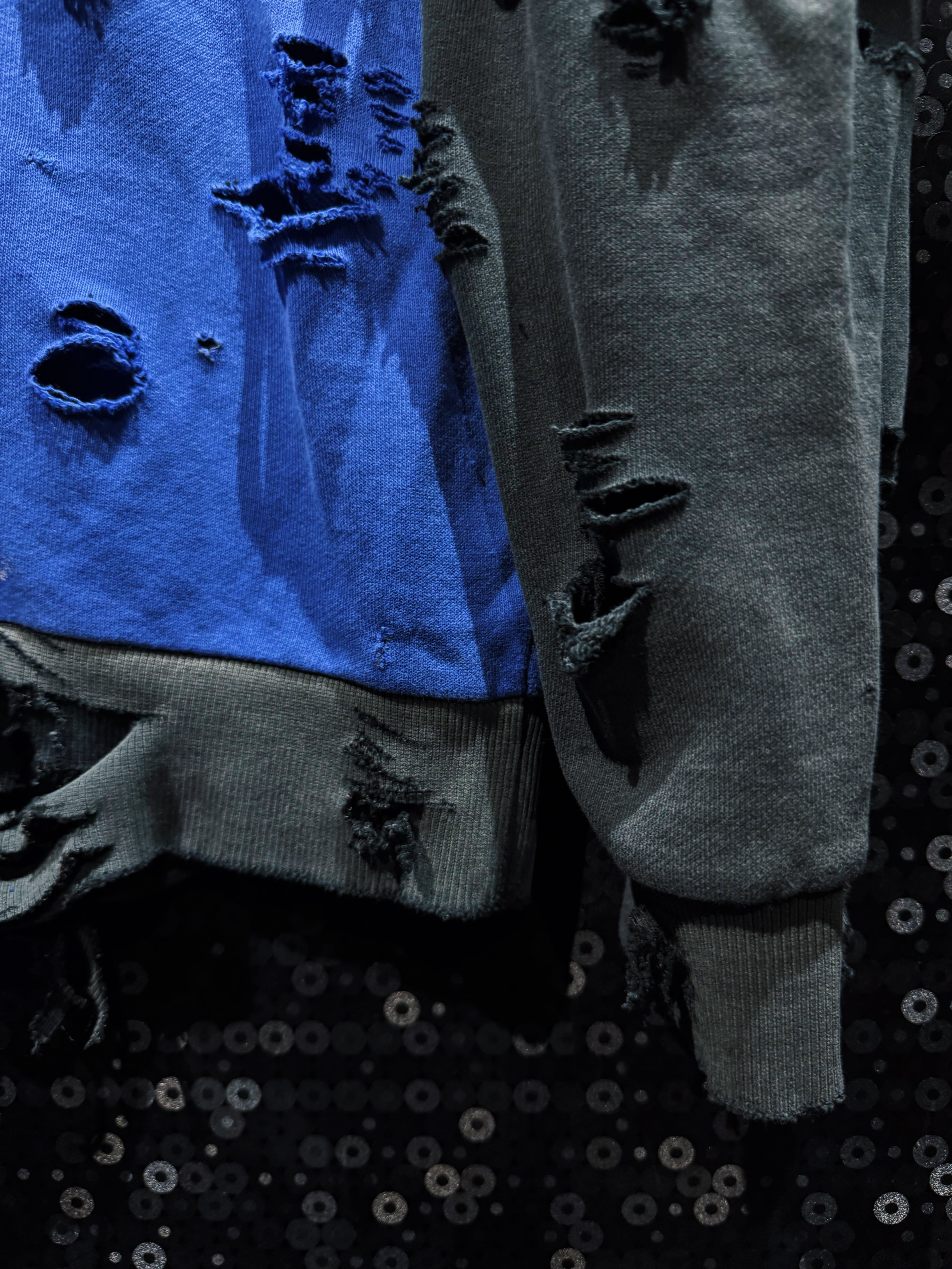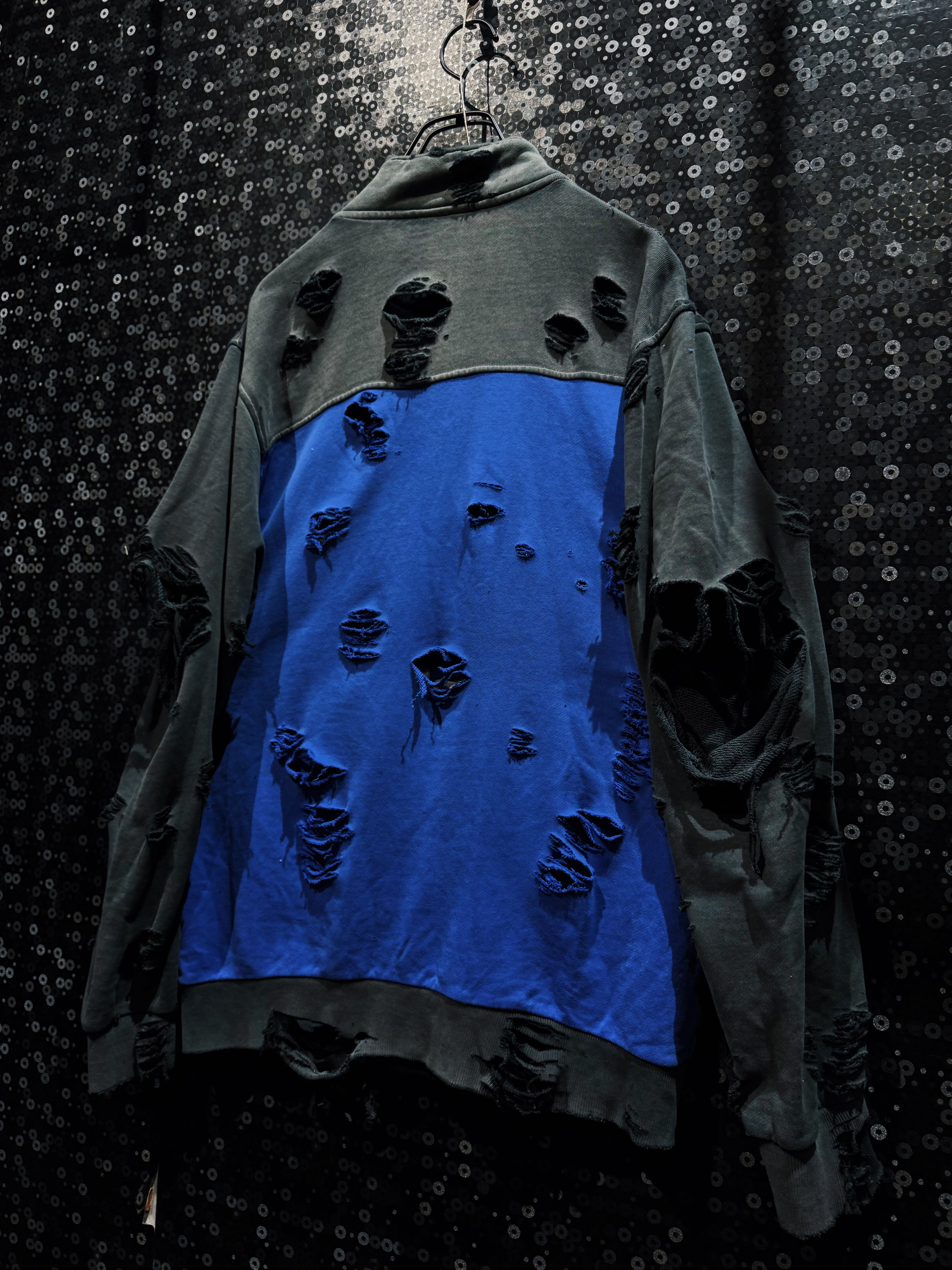 全体には容赦ないボロ加工。ブラック部分だけでなく、ブルーパネルやグラフィック部分にもクラッシュを施し、綺麗なスポーツウェアでは終わらせない徹底ぶり。裾にも大きく裂けを入れ、完成された均整を崩壊させている。