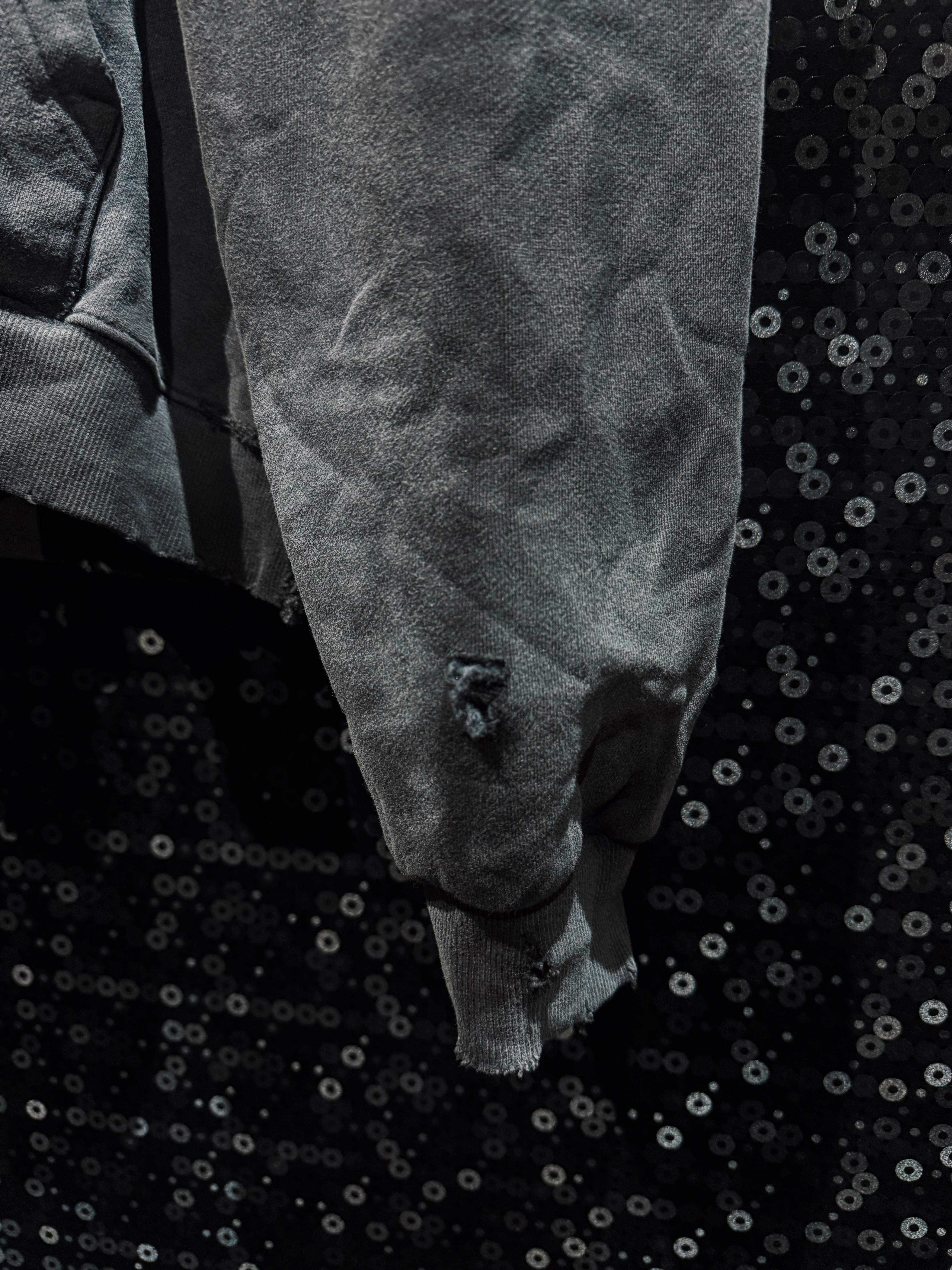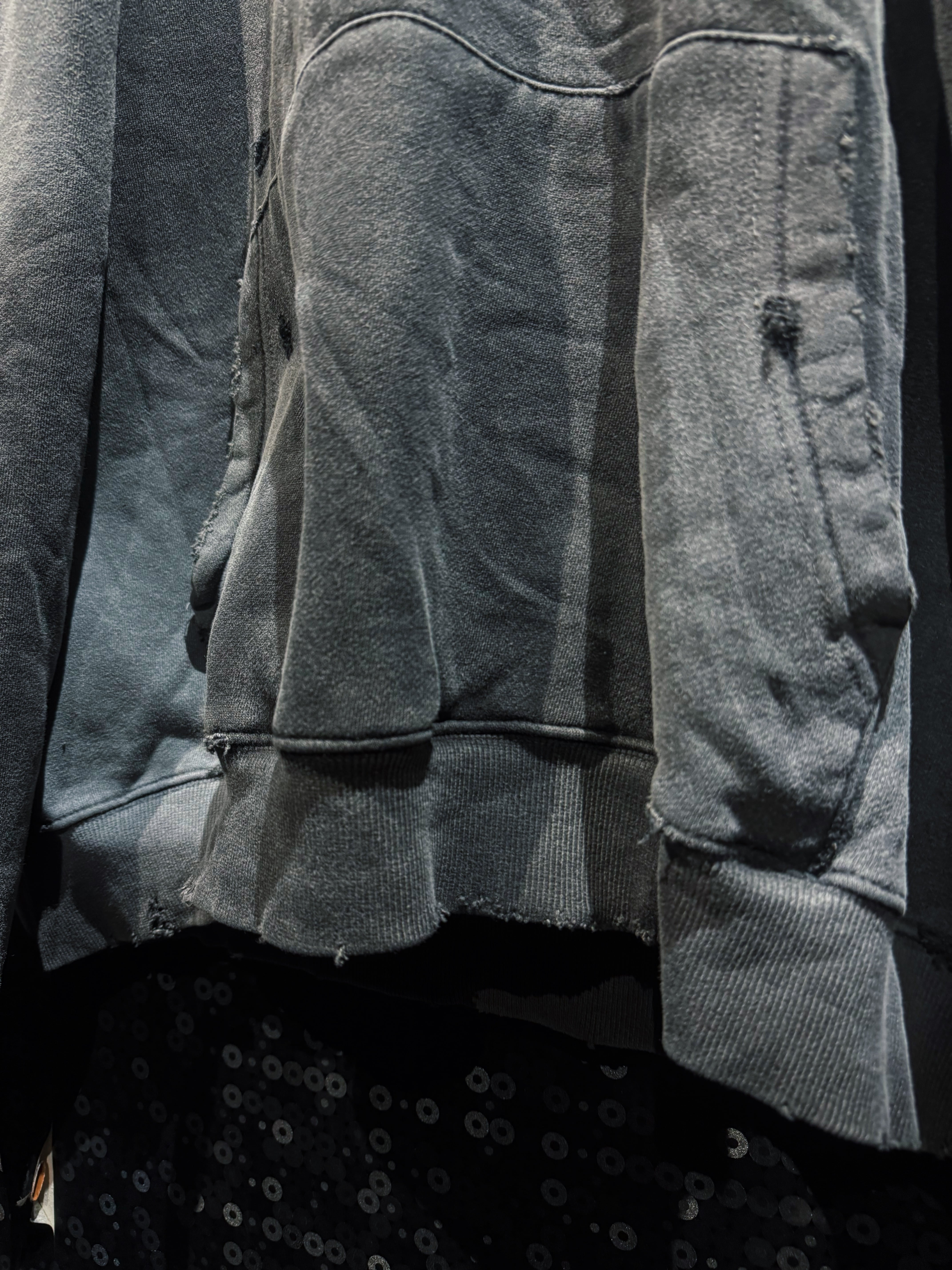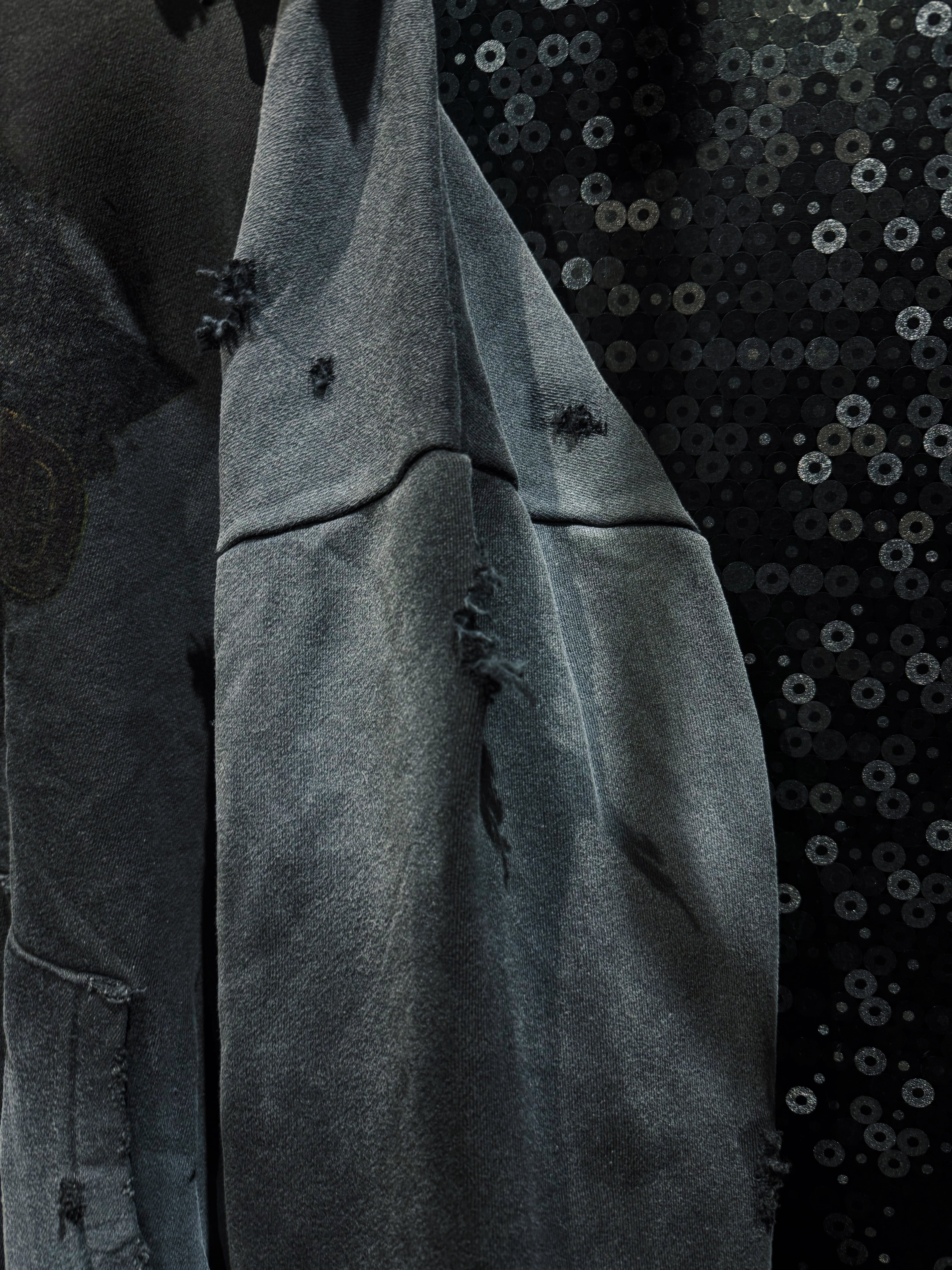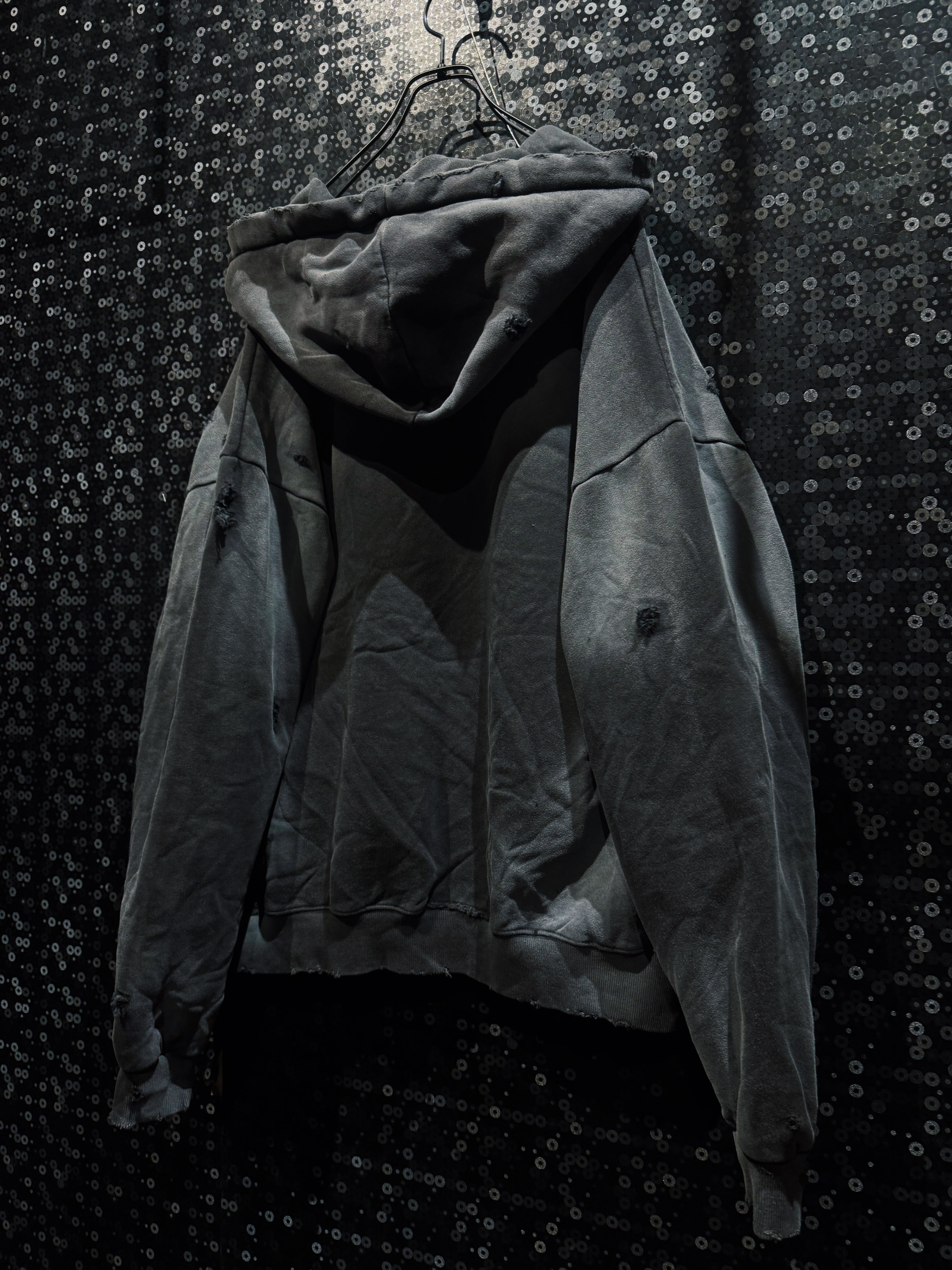 フード縁は大胆に断ち切り、ほつれを隠さずそのままデザインへ昇華。ネック周りのクラッシュが生む無骨な空気感は、新品では絶対に出せない表情。全体にはランダムなダメージを散らし、単なるグランジではなく“計算された崩壊”を演出している。