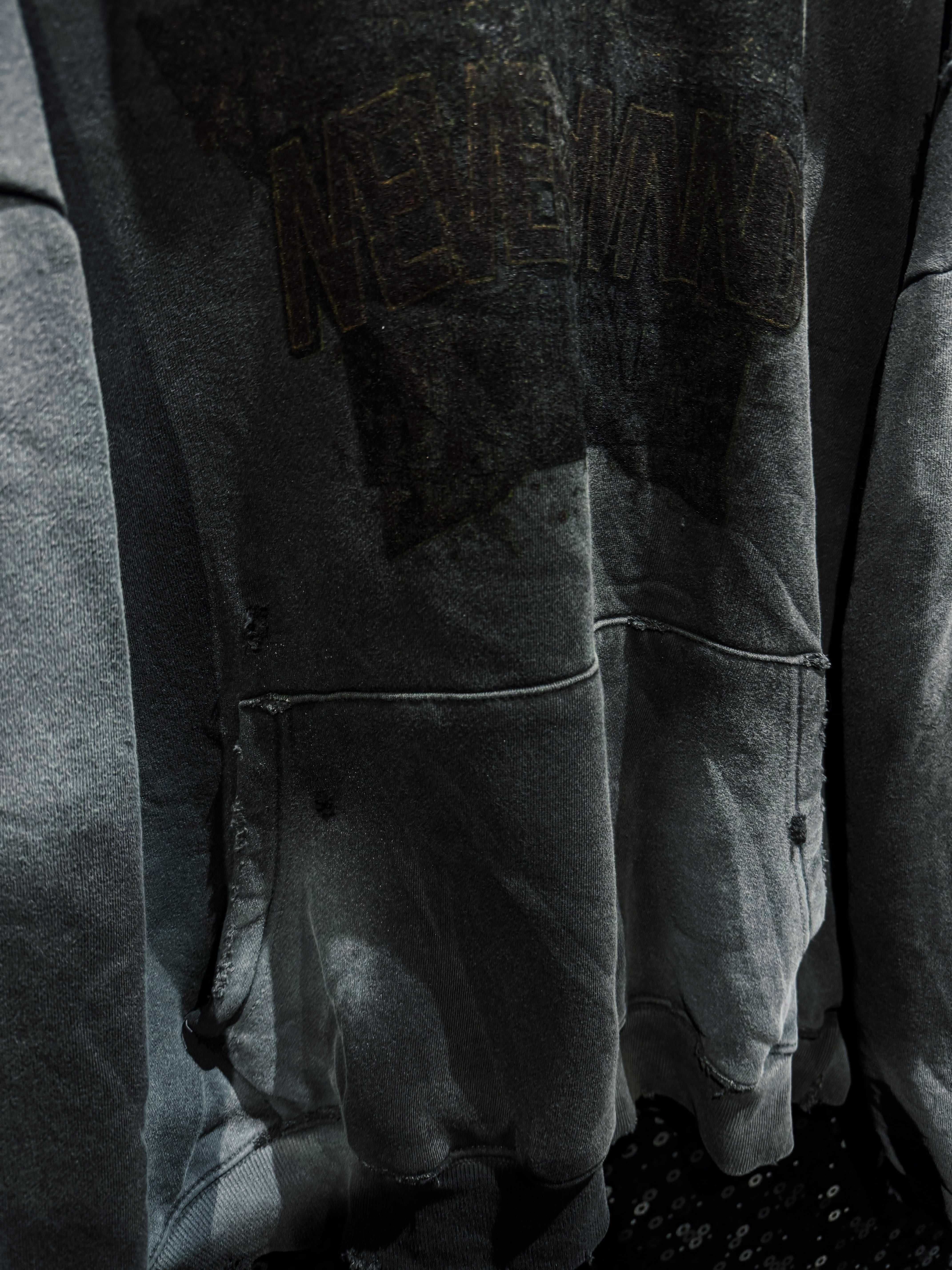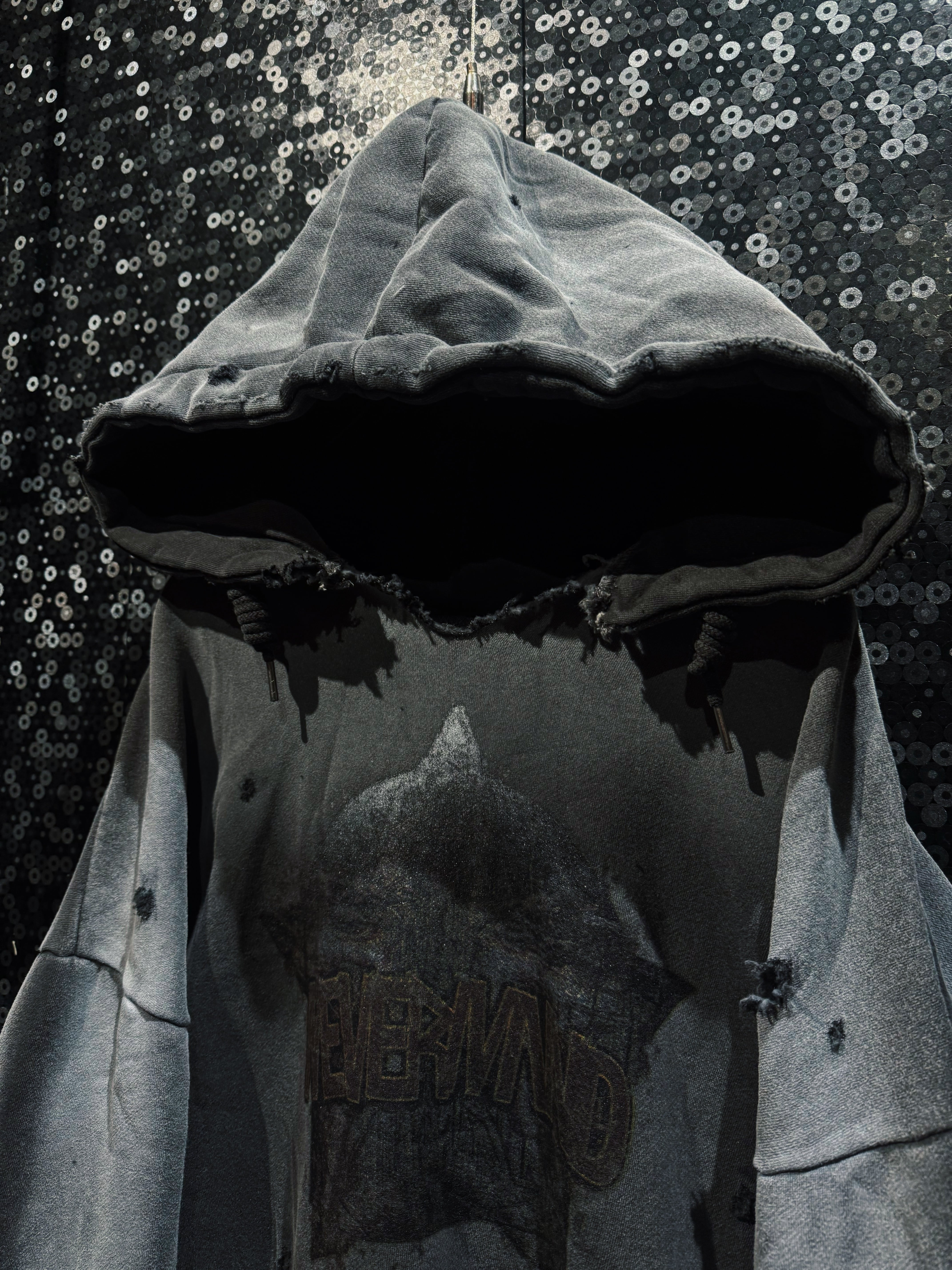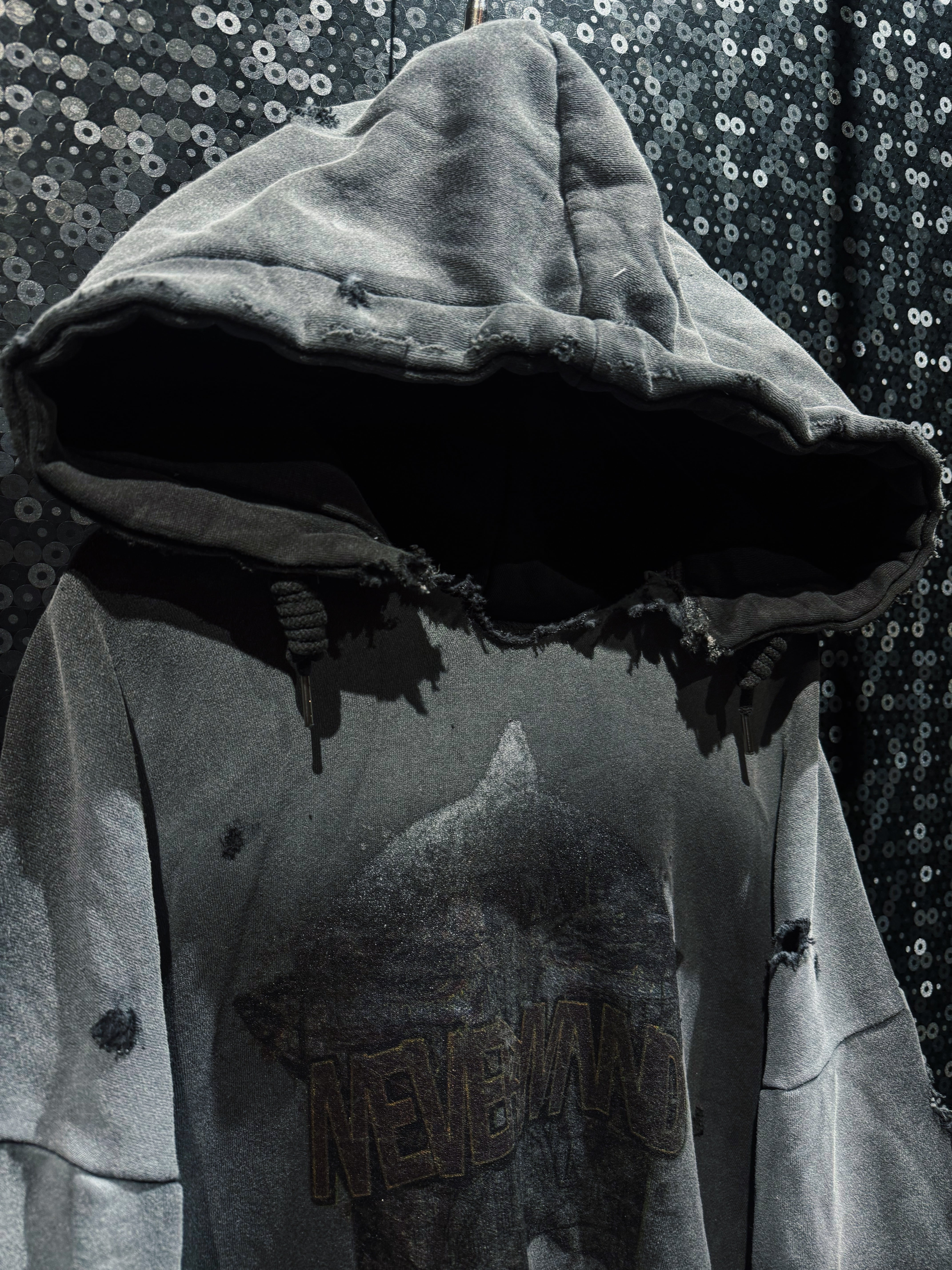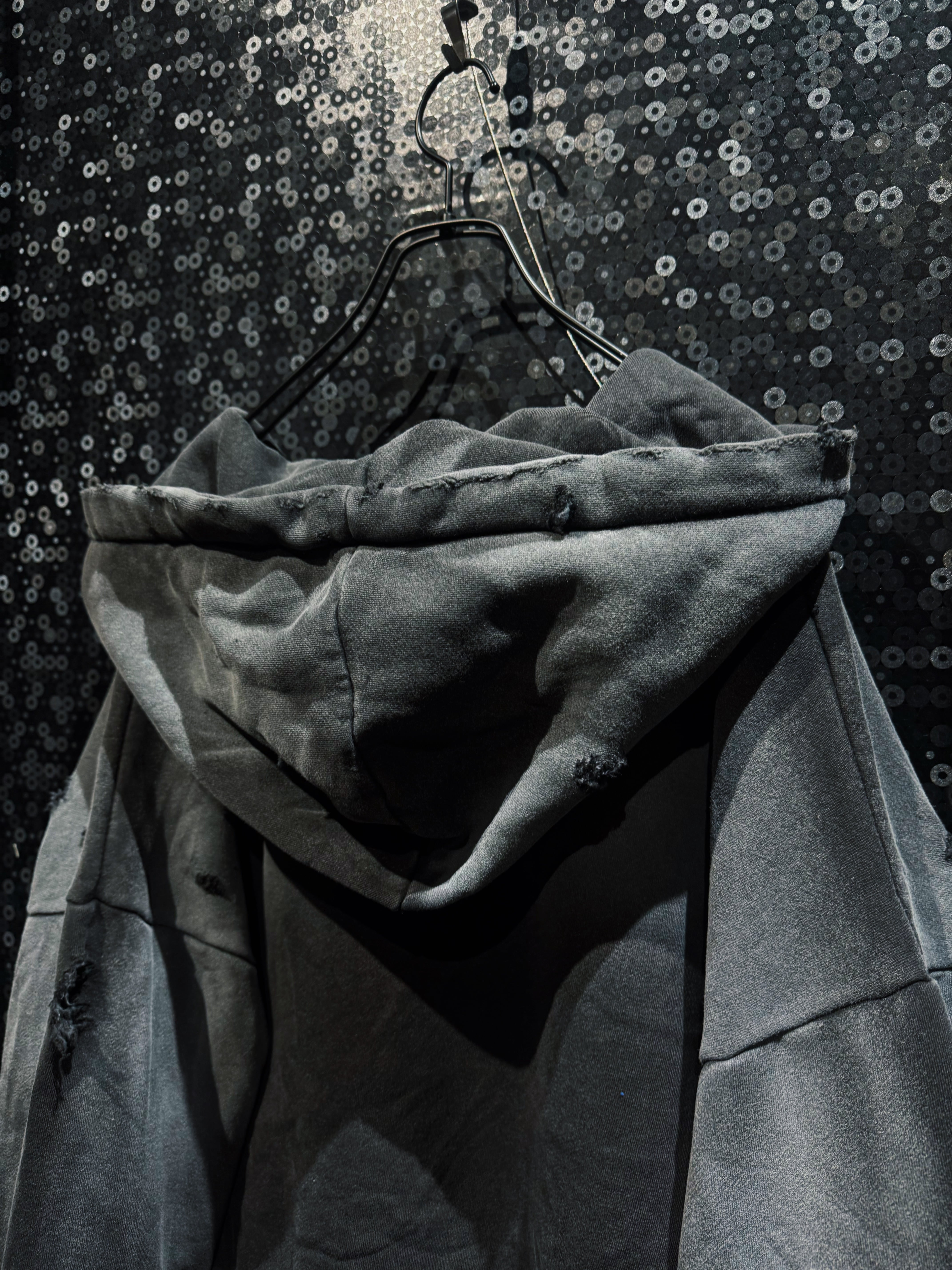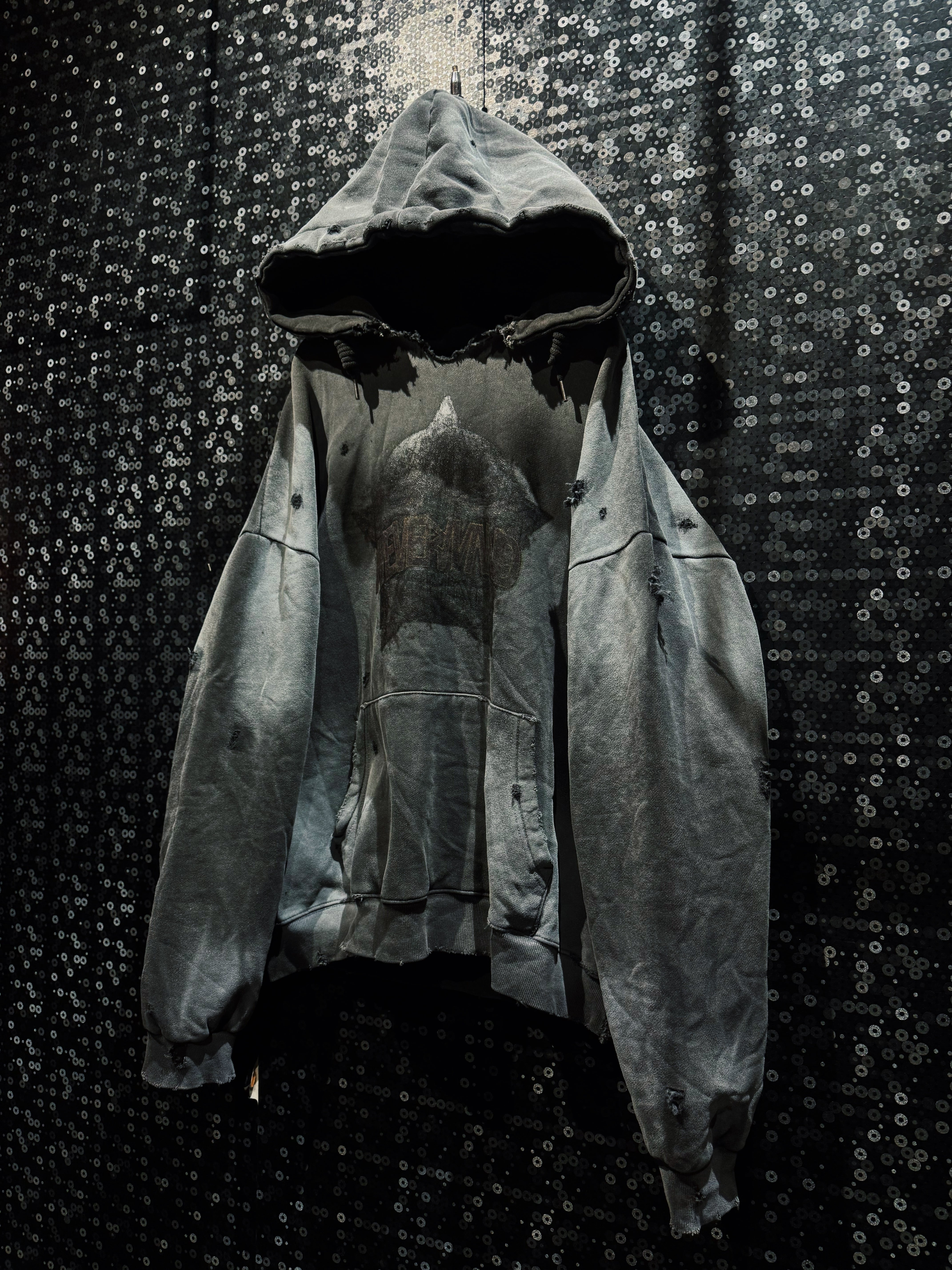 フード縁は大胆に断ち切り、ほつれを隠さずそのままデザインへ昇華。ネック周りのクラッシュが生む無骨な空気感は、新品では絶対に出せない表情。全体にはランダムなダメージを散らし、単なるグランジではなく“計算された崩壊”を演出している。