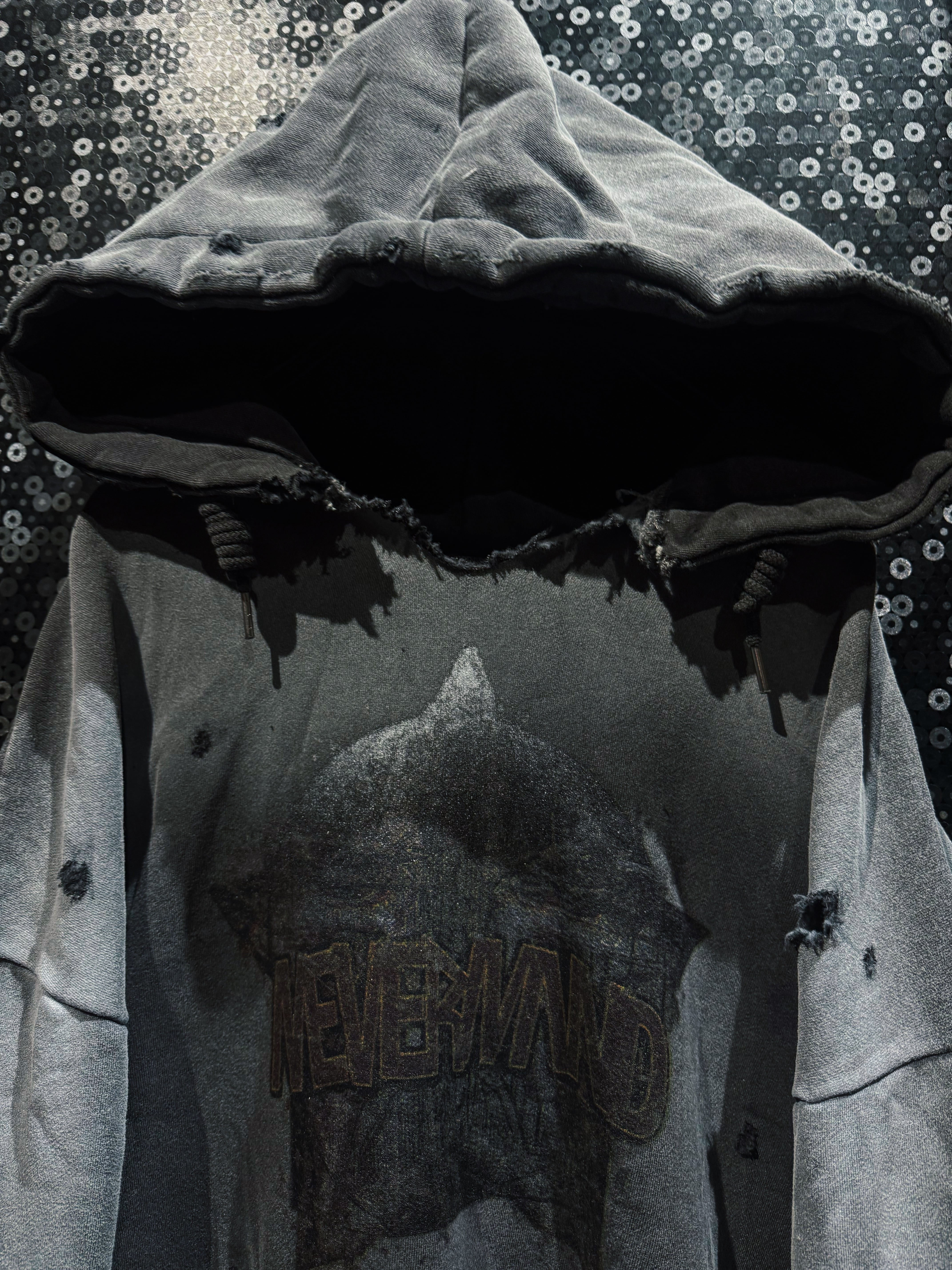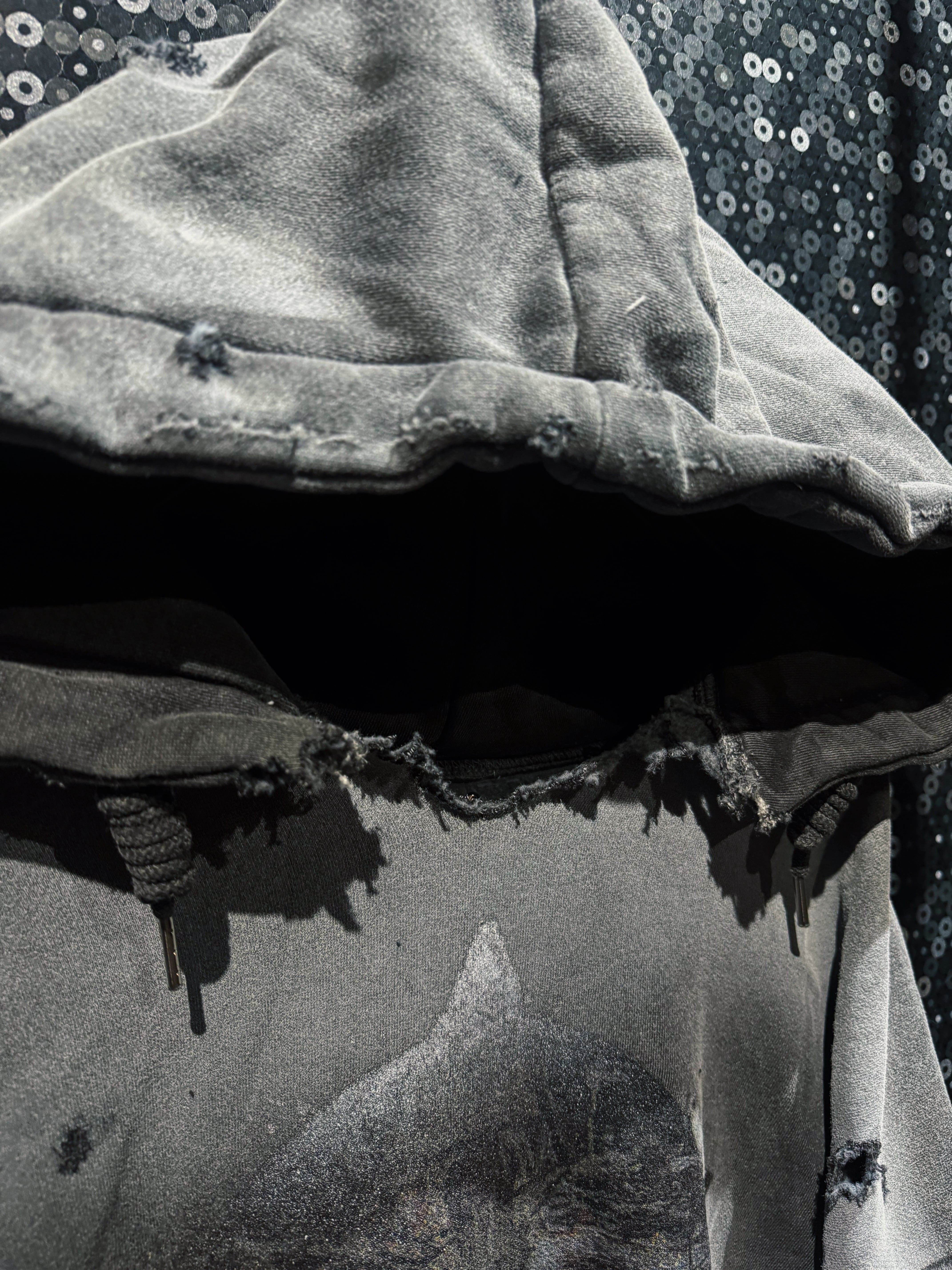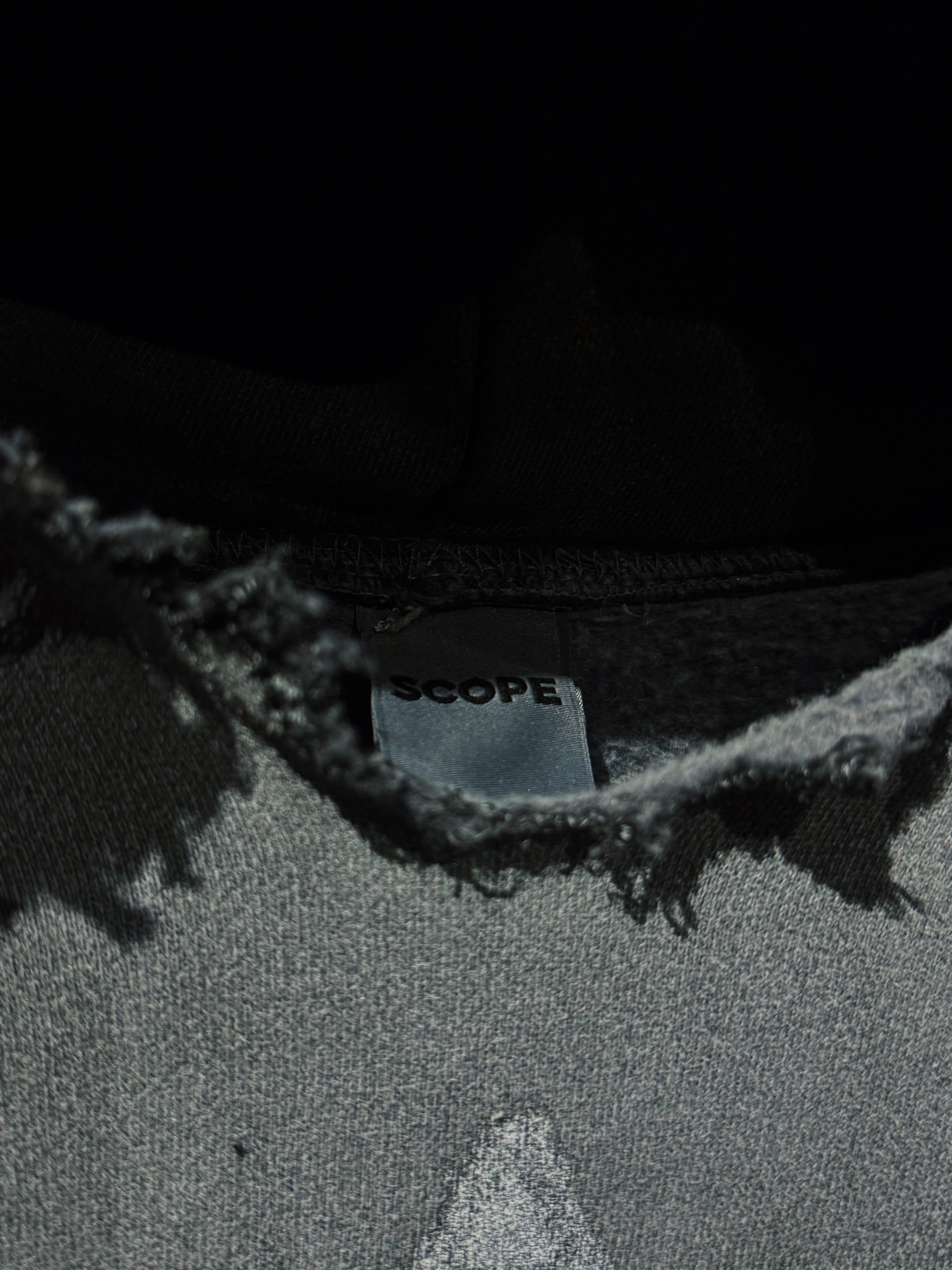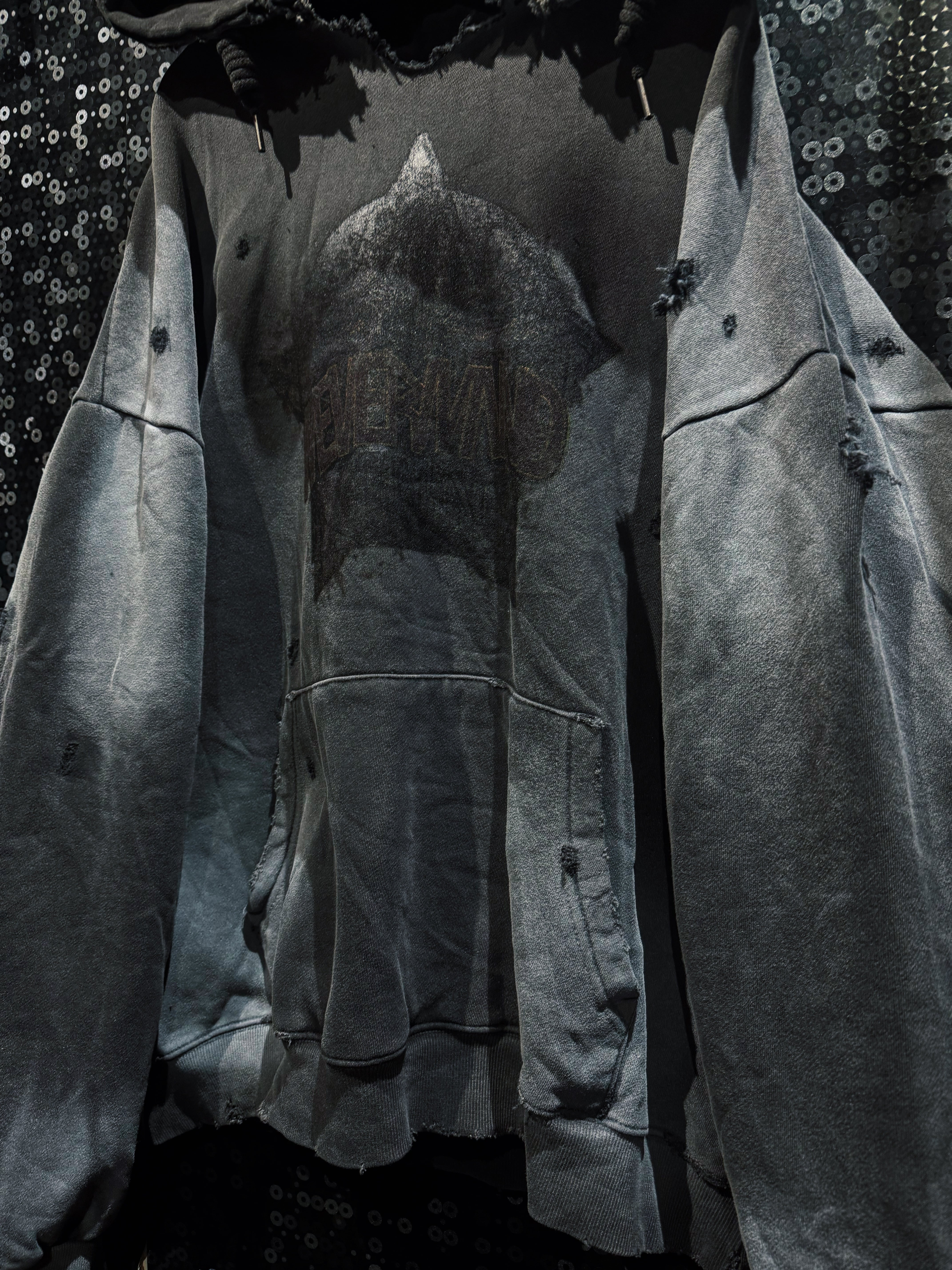 フード縁は大胆に断ち切り、ほつれを隠さずそのままデザインへ昇華。ネック周りのクラッシュが生む無骨な空気感は、新品では絶対に出せない表情。全体にはランダムなダメージを散らし、単なるグランジではなく“計算された崩壊”を演出している。