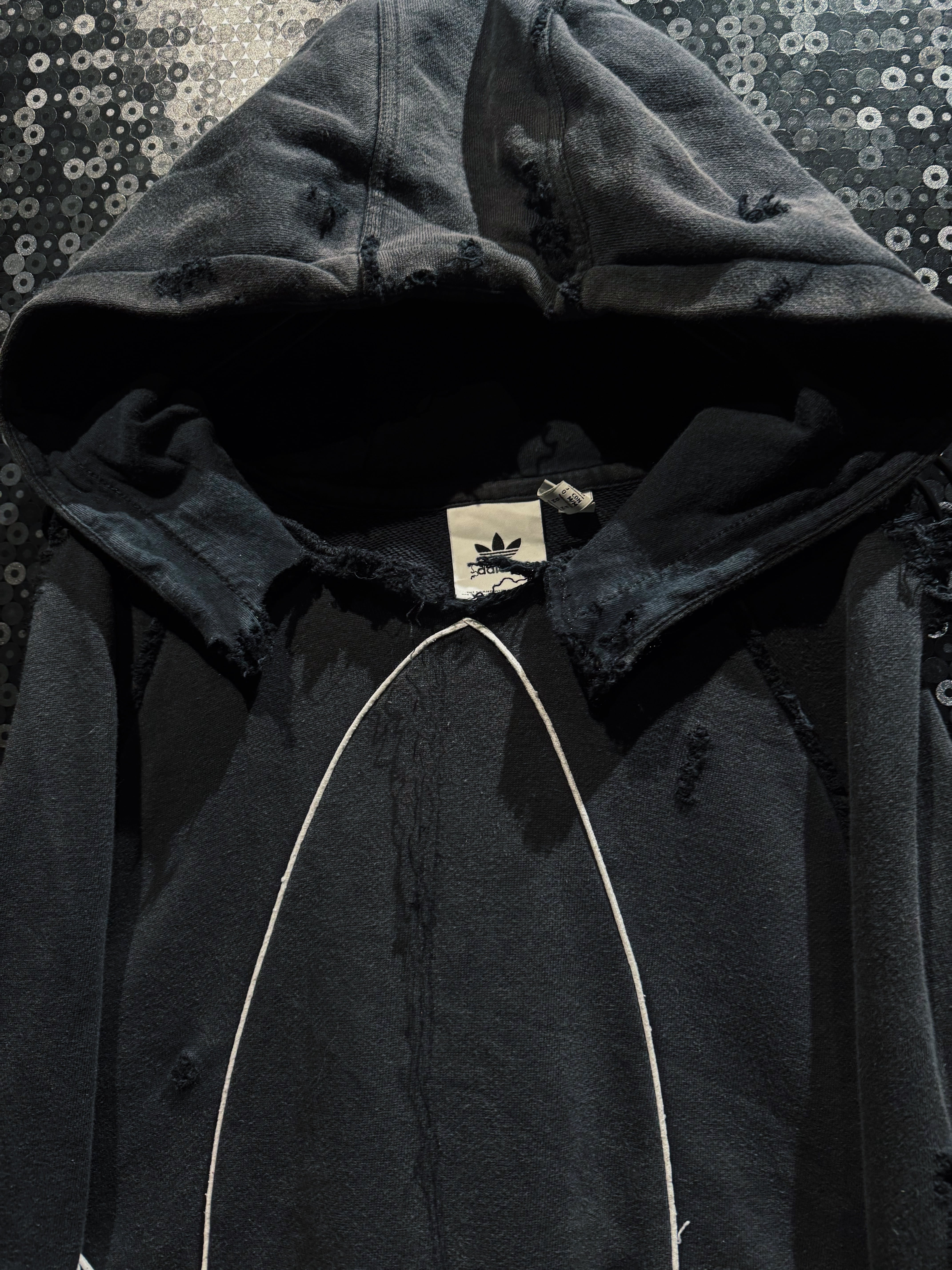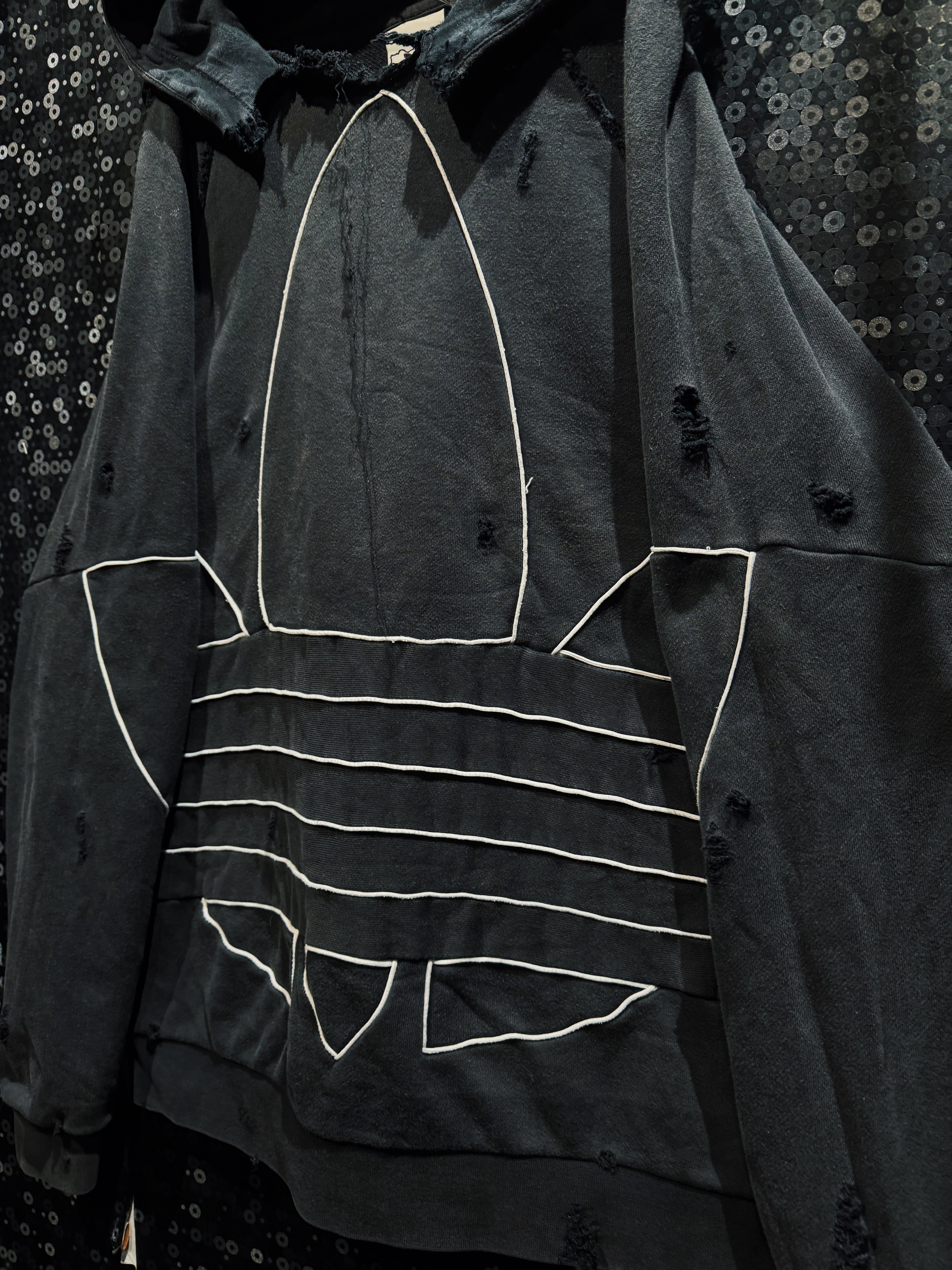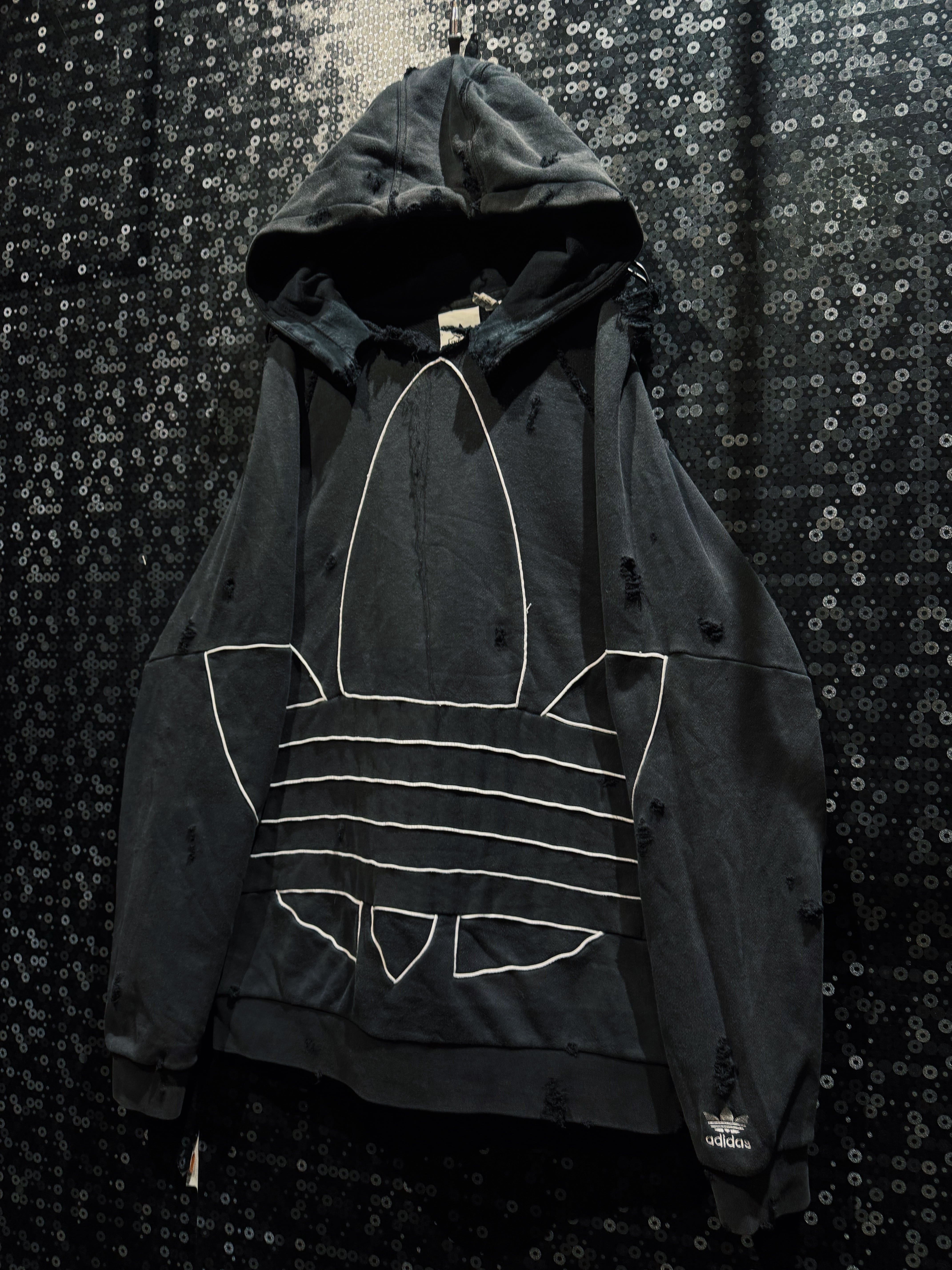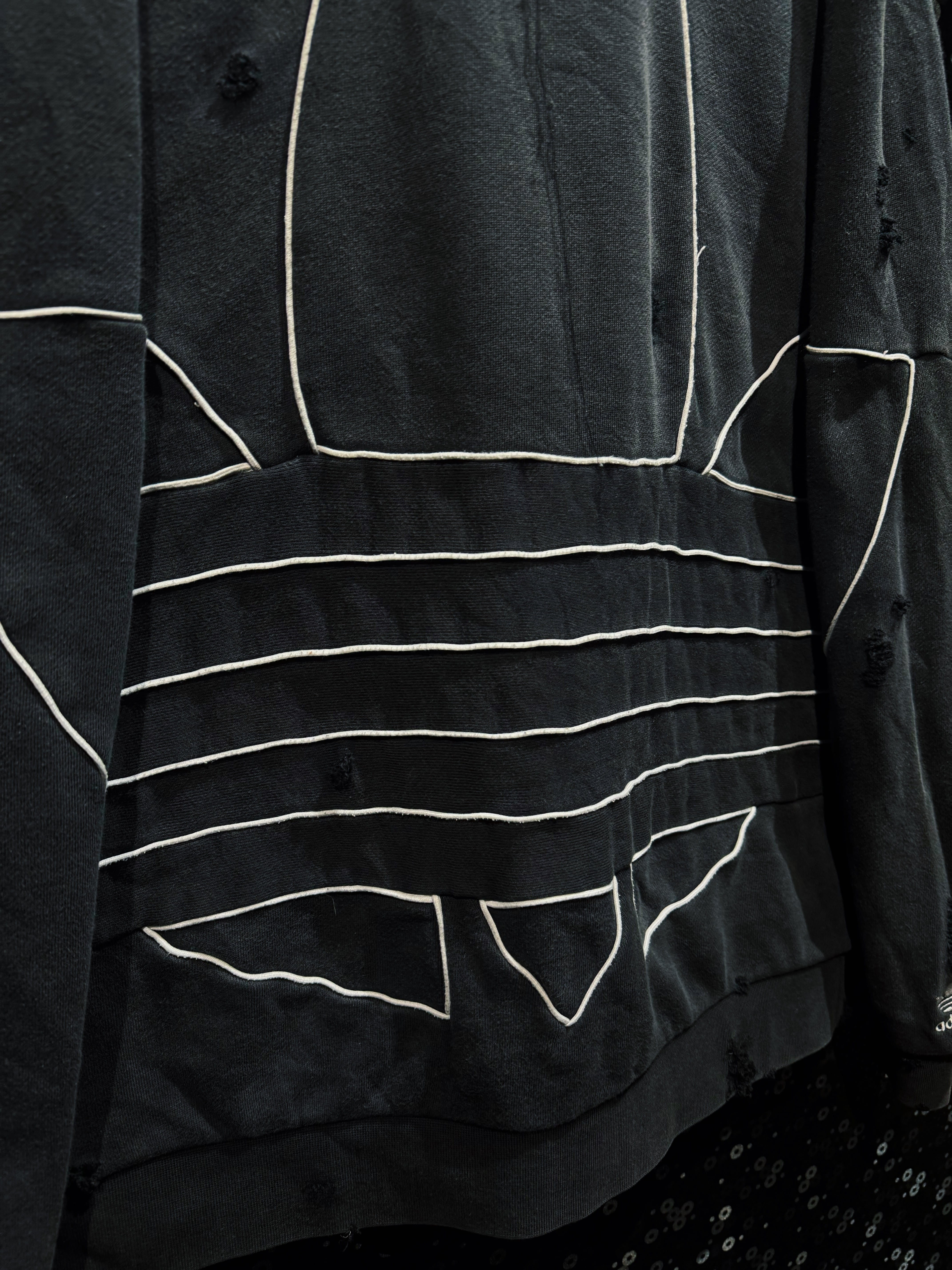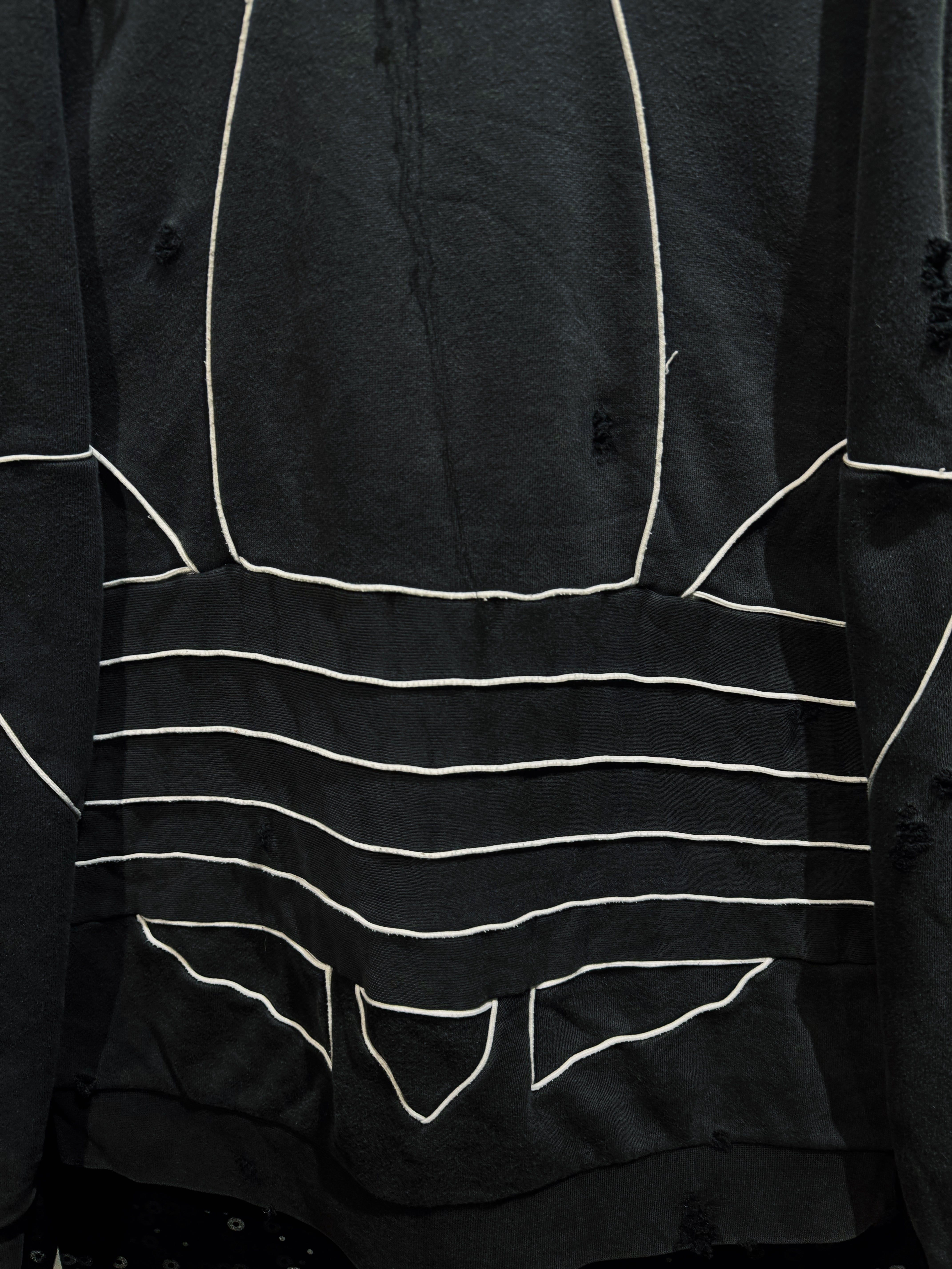 漆黒のボディに浮かび上がる、巨大なトレフォイルのアウトライン。通常はプリントや刺繍で表現されるロゴを、あえてホワイトのパイピングで縁取り、立体的な構築として再解釈した一着。ベースはadidasのフーディー。そこにAEIEMの解体・再構築思想を落とし込み、全体へランダムかつ計算されたボロ加工を施している。