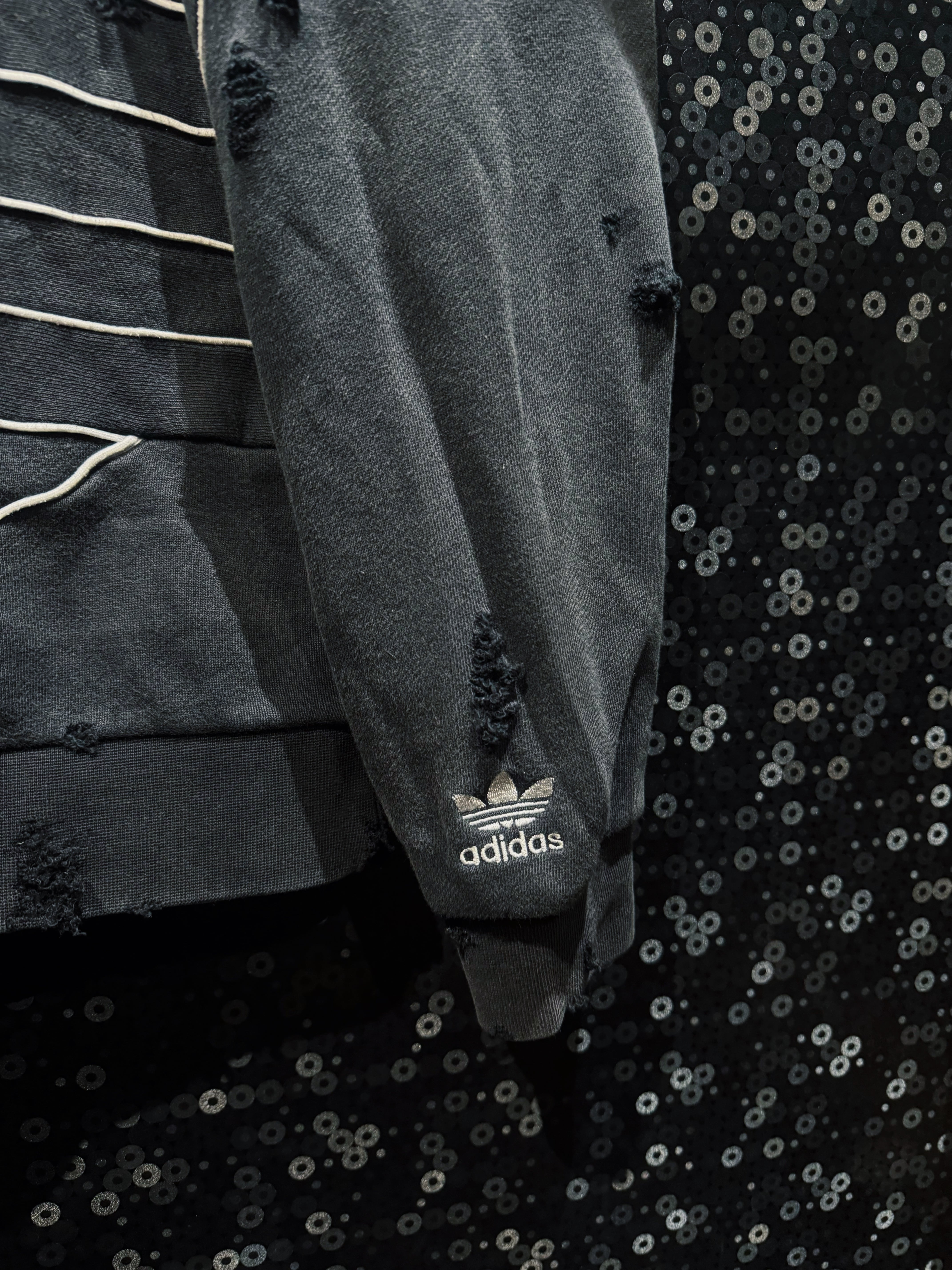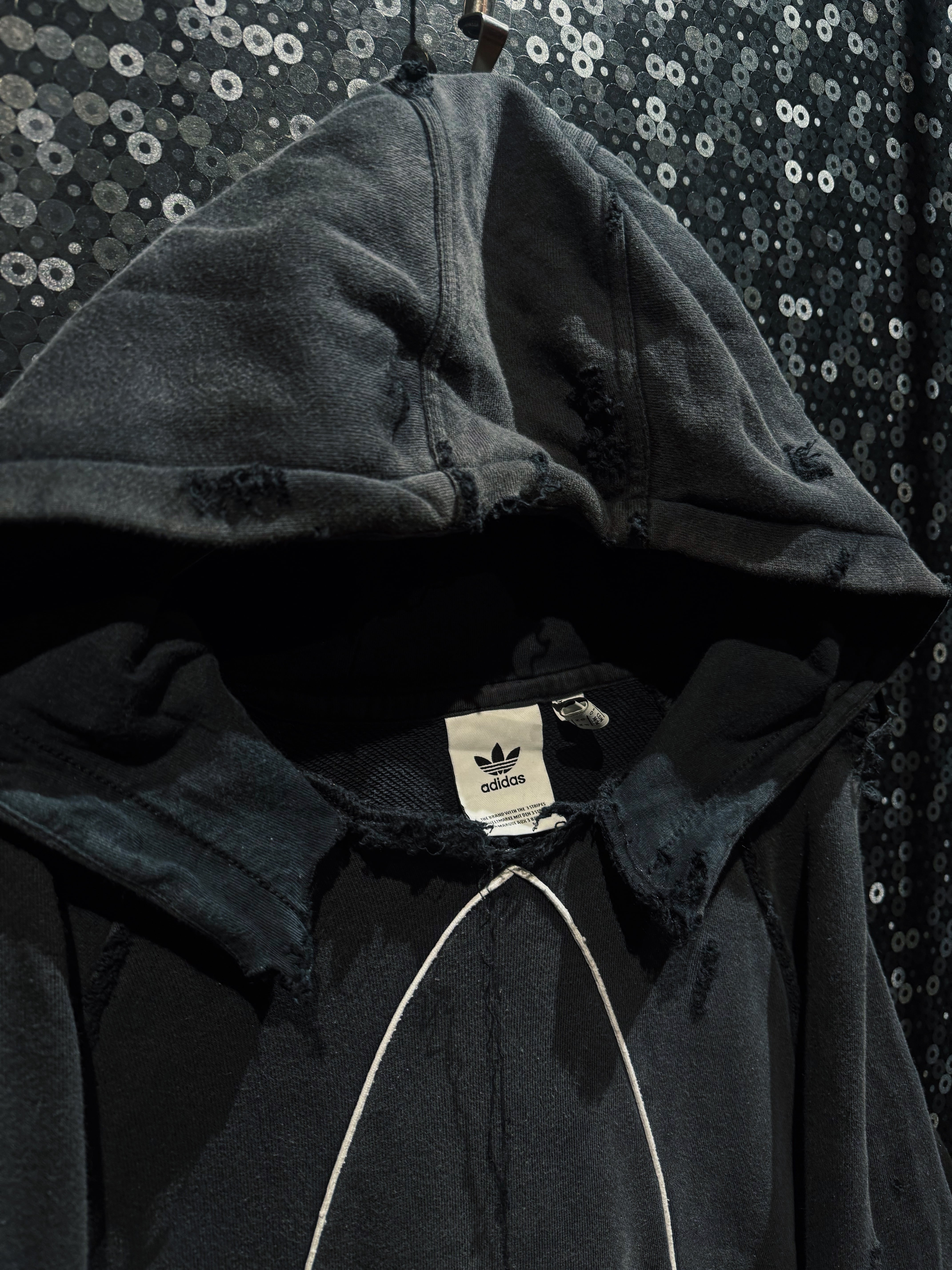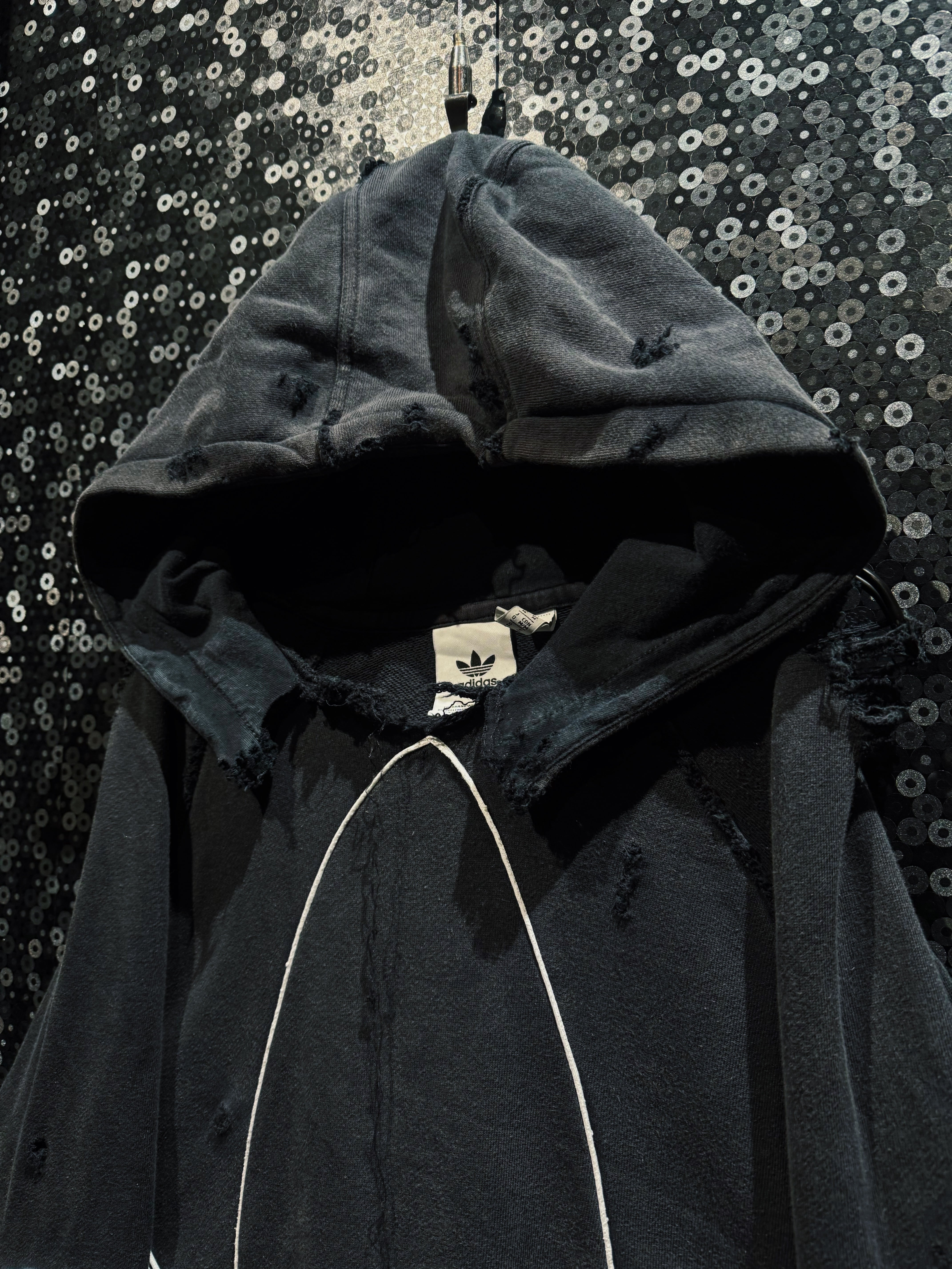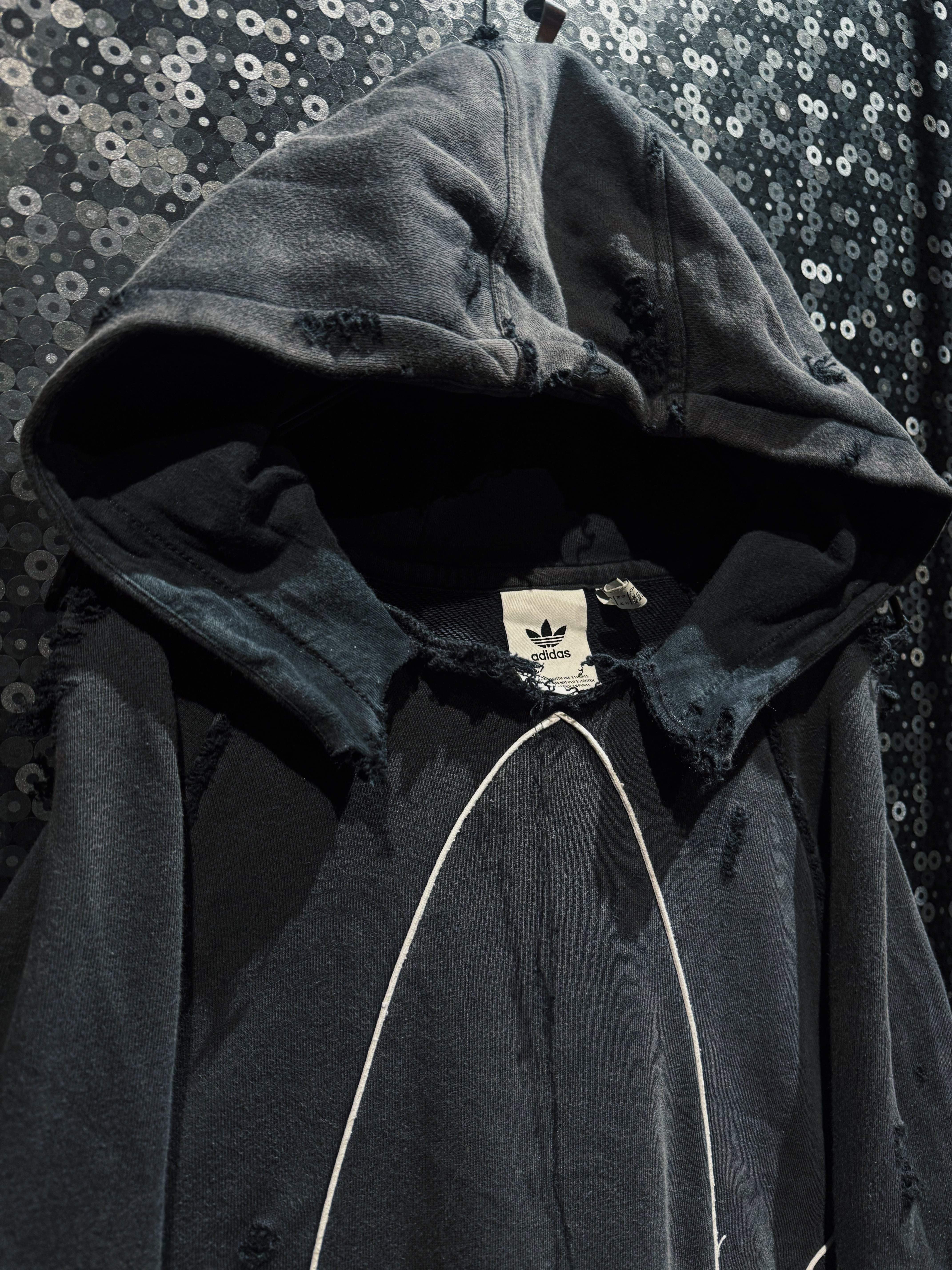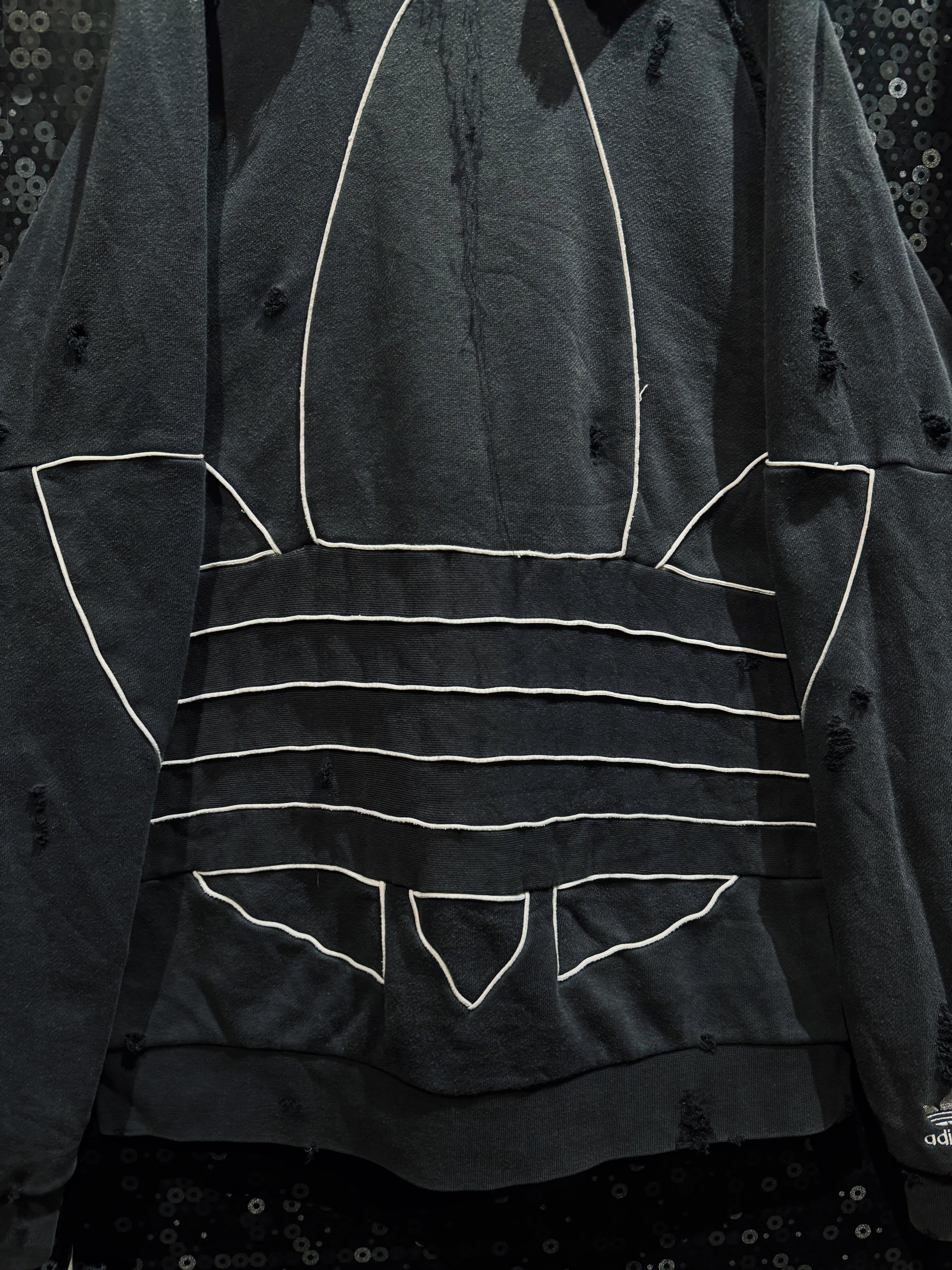 漆黒のボディに浮かび上がる、巨大なトレフォイルのアウトライン。通常はプリントや刺繍で表現されるロゴを、あえてホワイトのパイピングで縁取り、立体的な構築として再解釈した一着。ベースはadidasのフーディー。そこにAEIEMの解体・再構築思想を落とし込み、全体へランダムかつ計算されたボロ加工を施している。