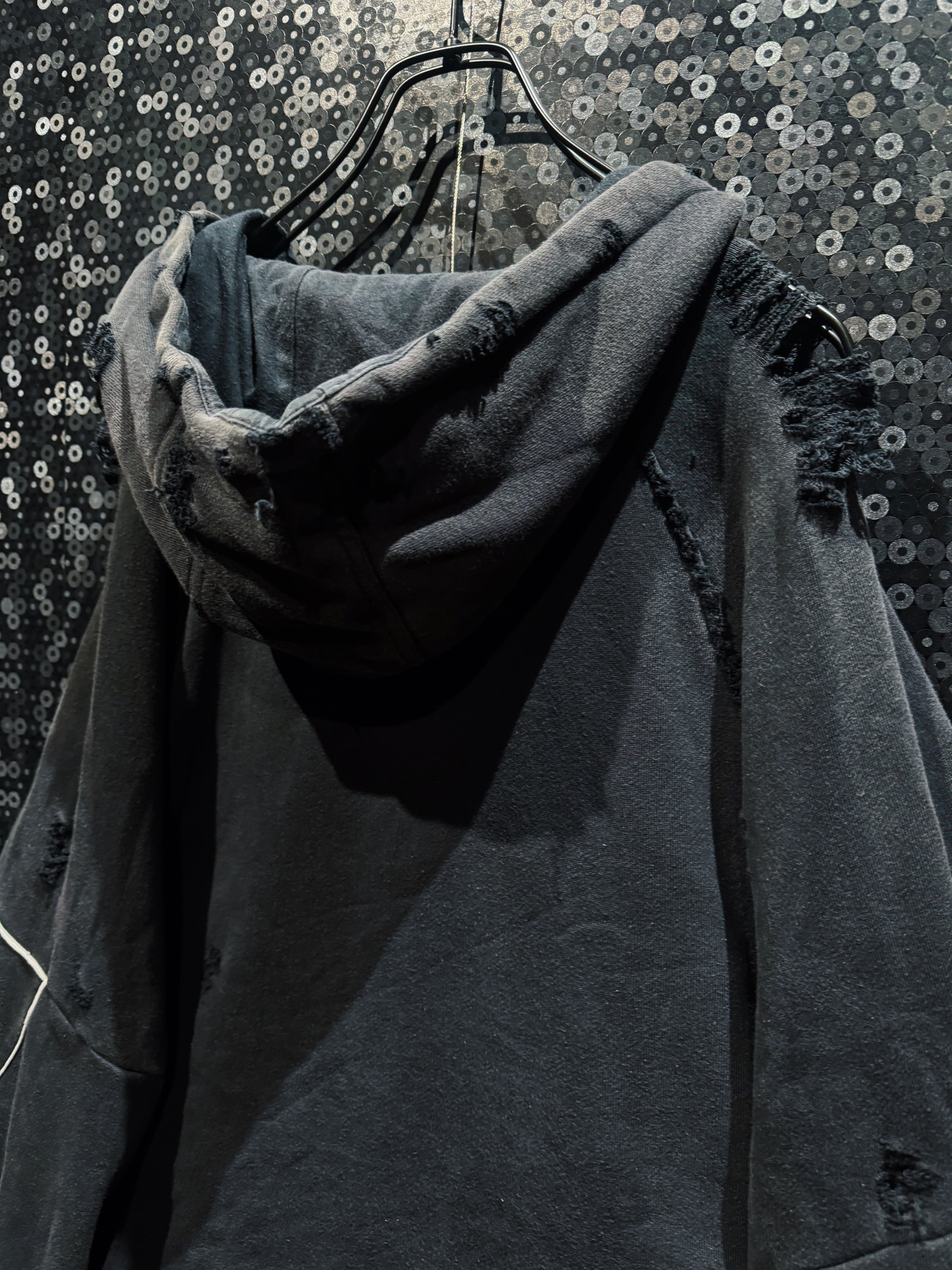 フード周りには断ち切りのディテールを強めに残し、あえて荒れた縁を見せることで、着古されたヴィンテージのような空気感を演出。身頃や袖に散らしたクラッシュは一点一点表情が異なり、量産にはない“不均衡の美”を体現している。ブラックのフェード感とダメージの陰影が重なり、光の当たり方によって立体感が強調されるのも特徴だ。