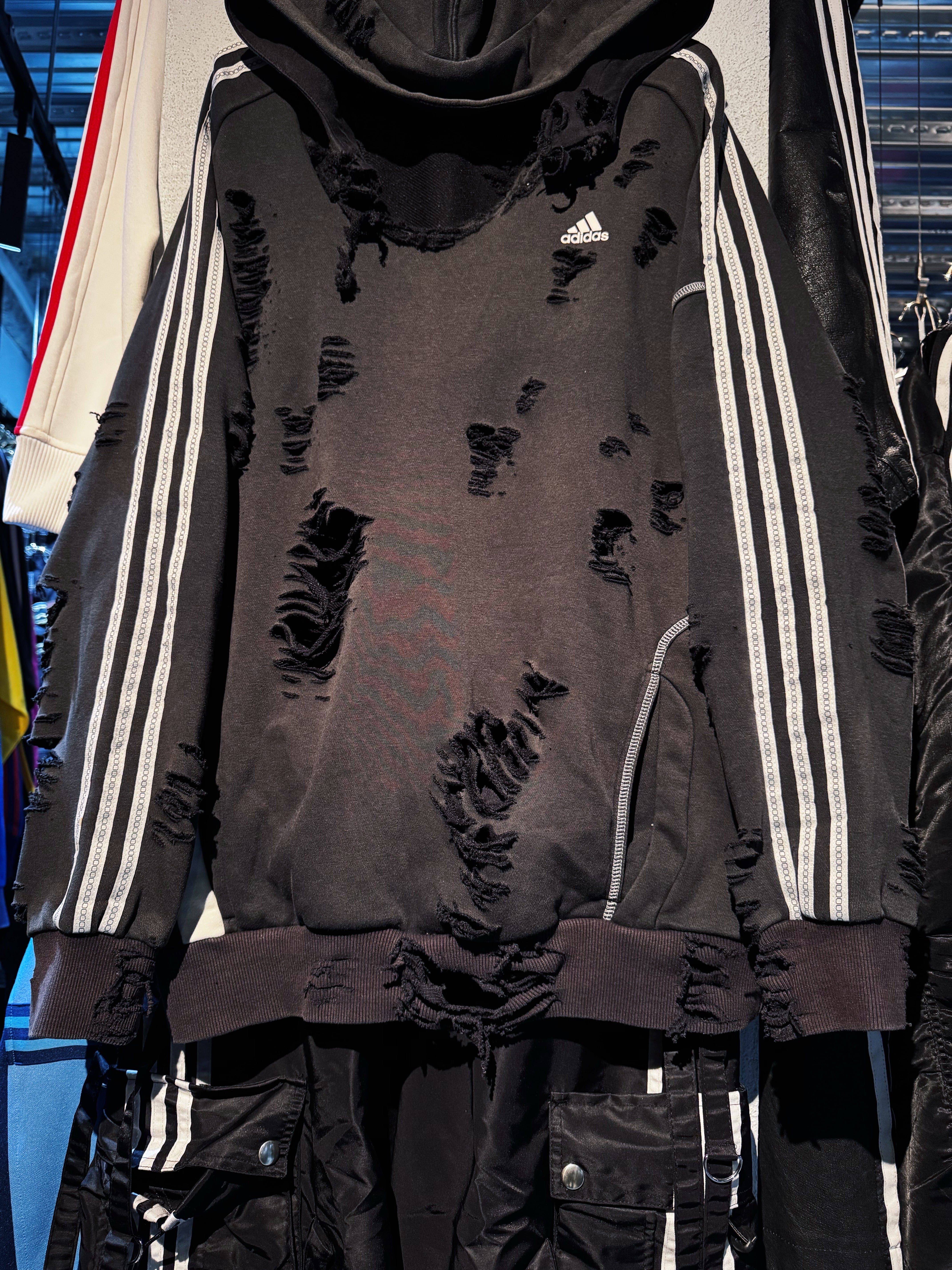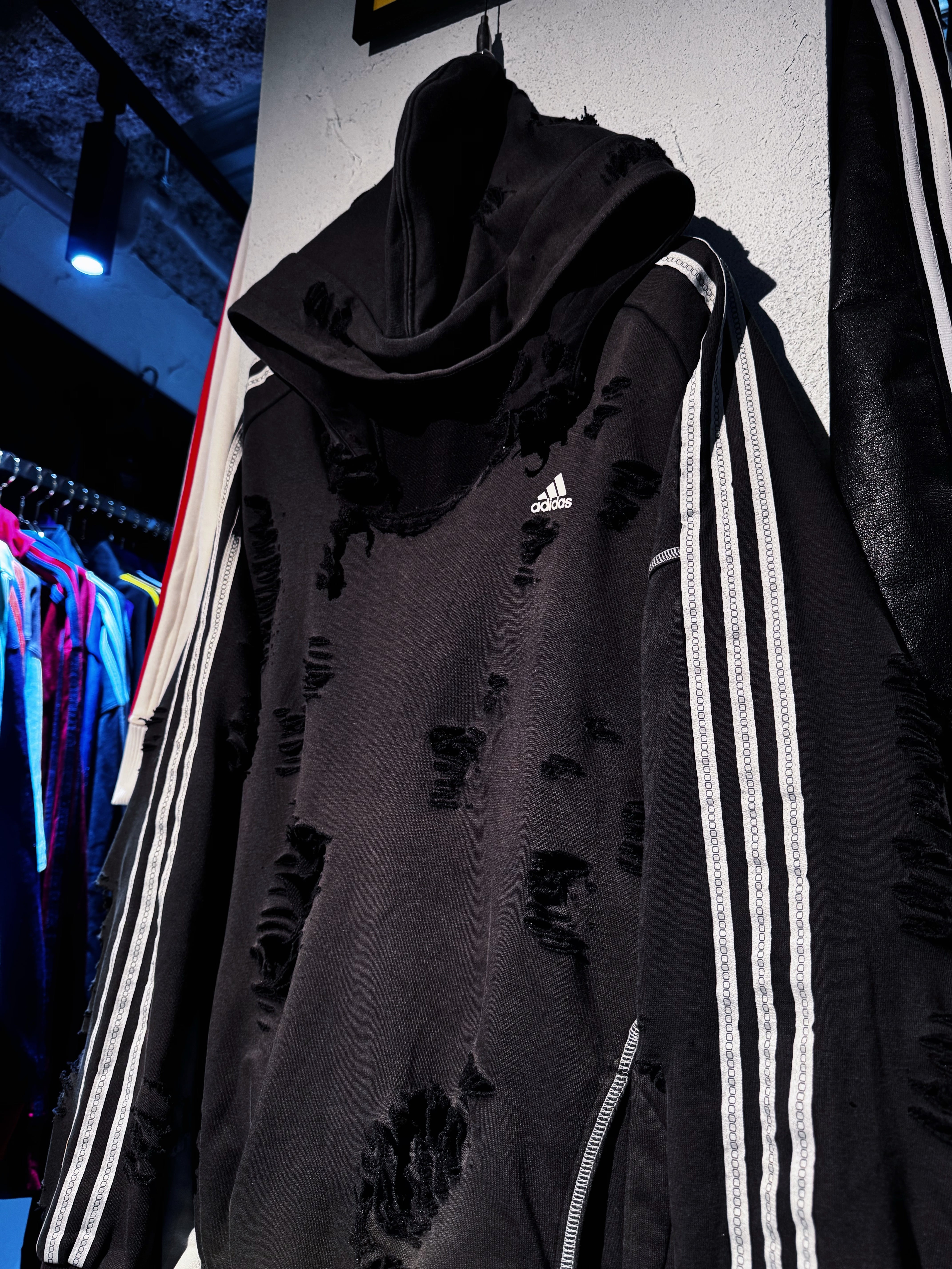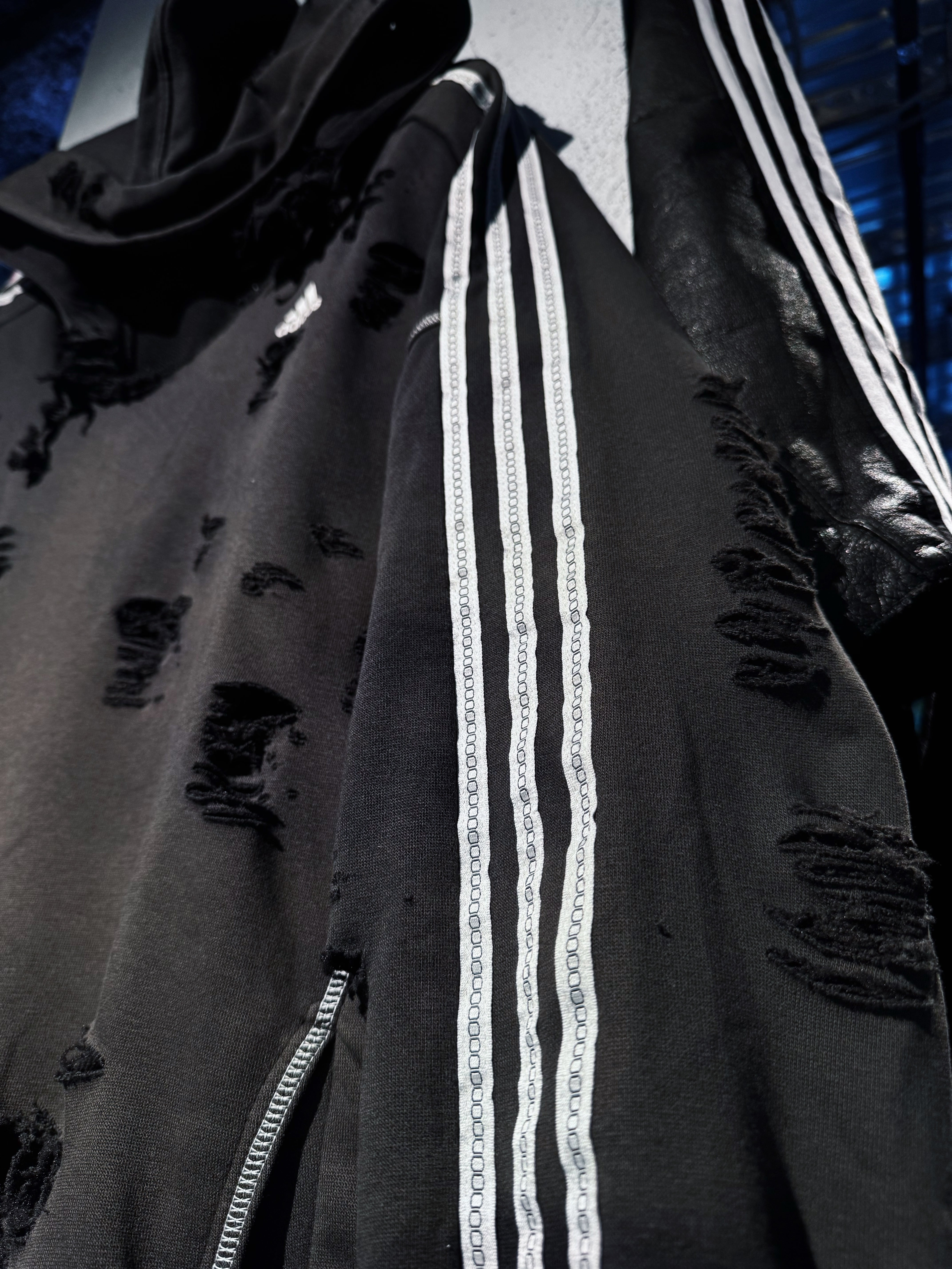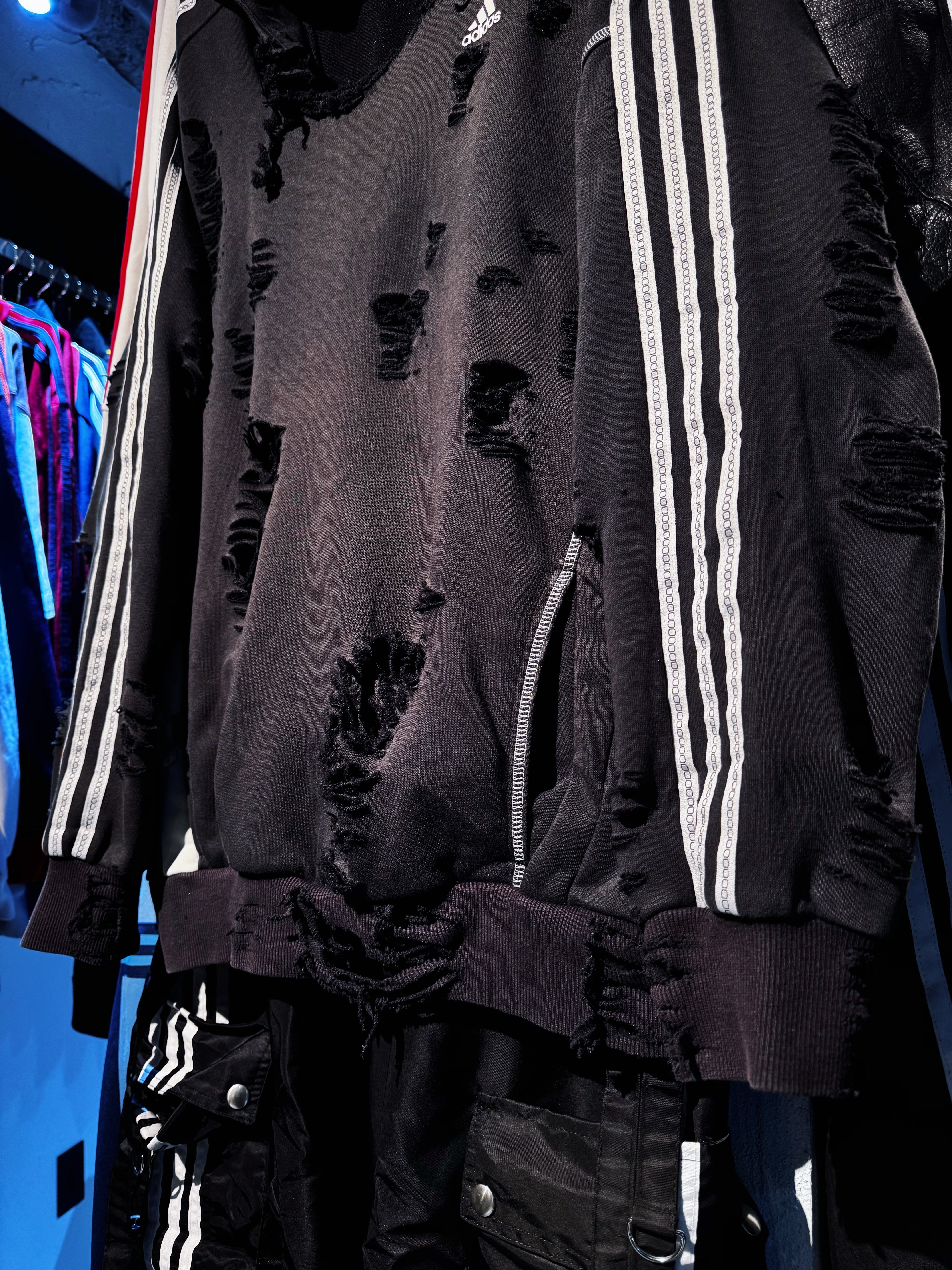 当店十八番のボロリメイクの中でもかなり人気の高い"ADIDAS"を贅沢にボロカスタムした一枚。”ADIDAS”の代名詞でもあるパフォーマンスロゴをフロントに、3ストライプスを袖に、重厚感のあるブラックカラーでボディも一級品。
