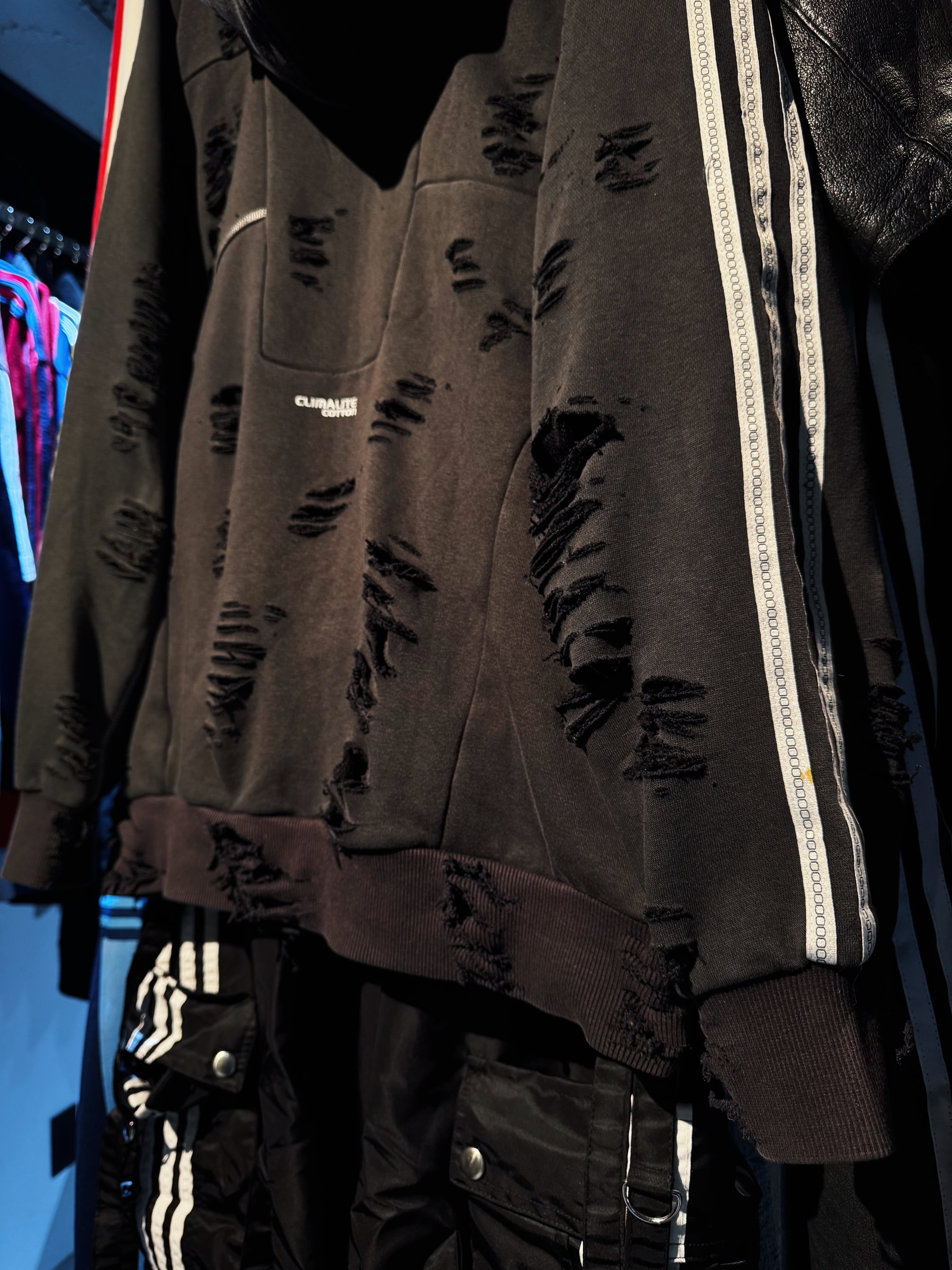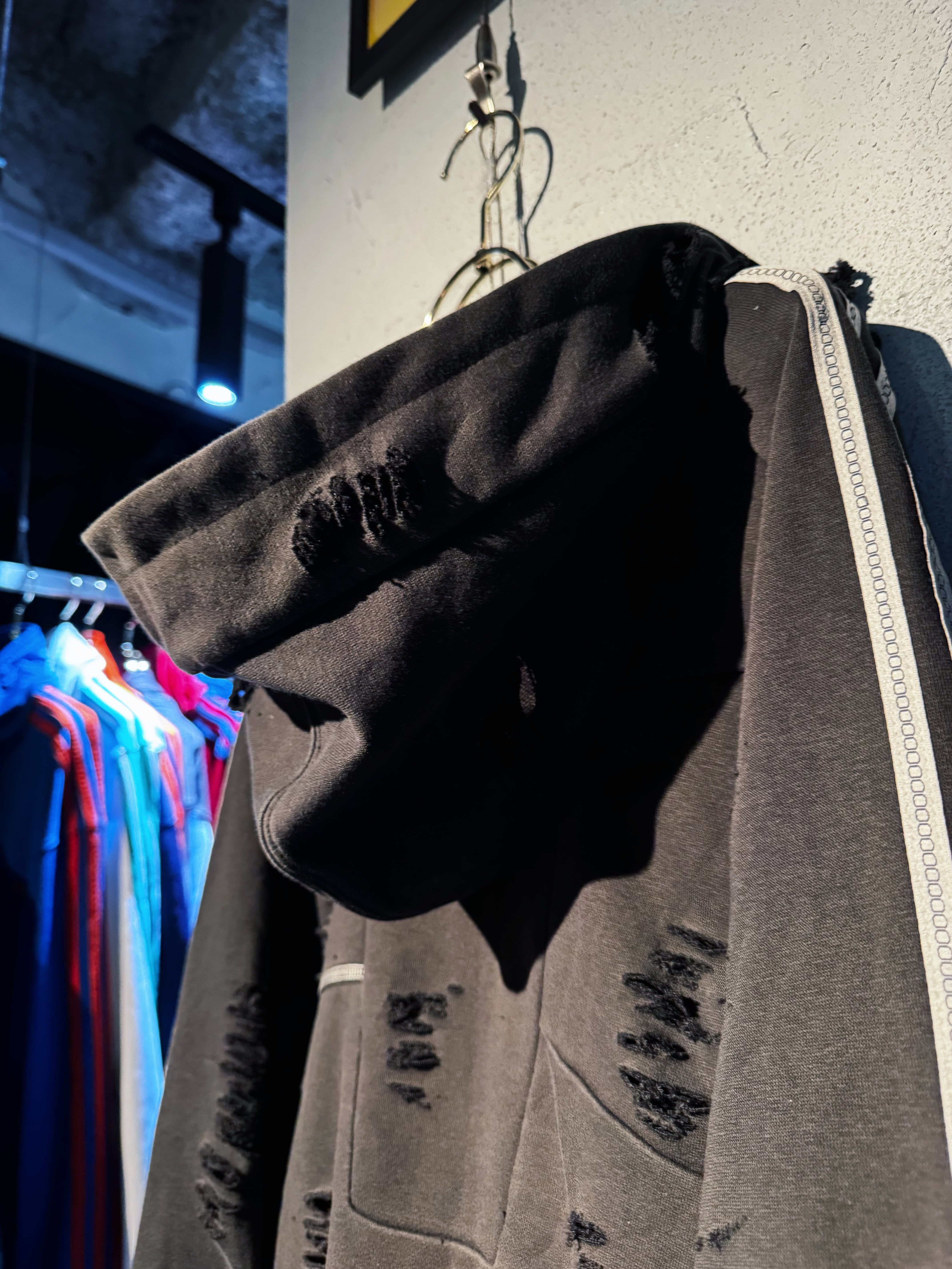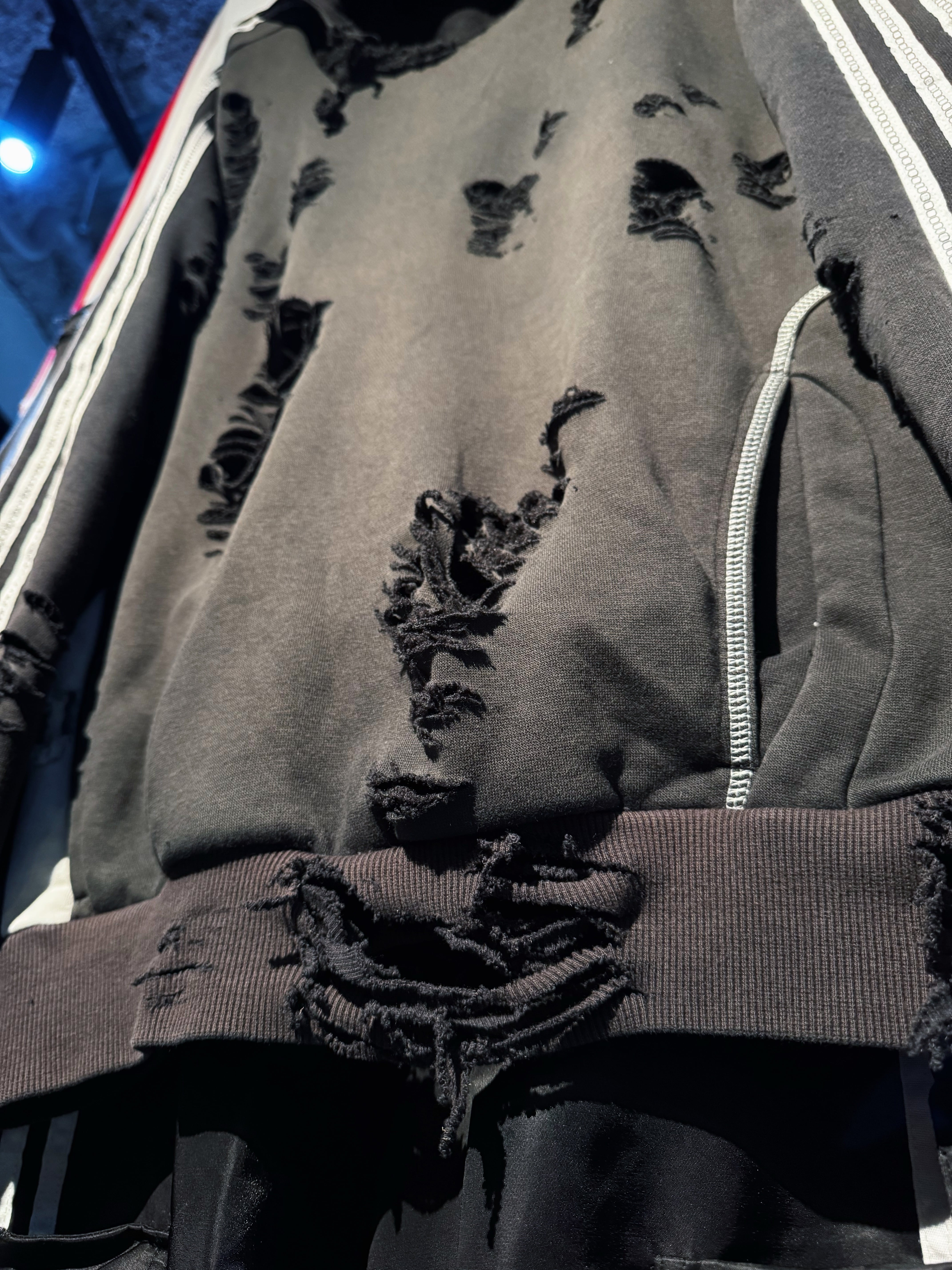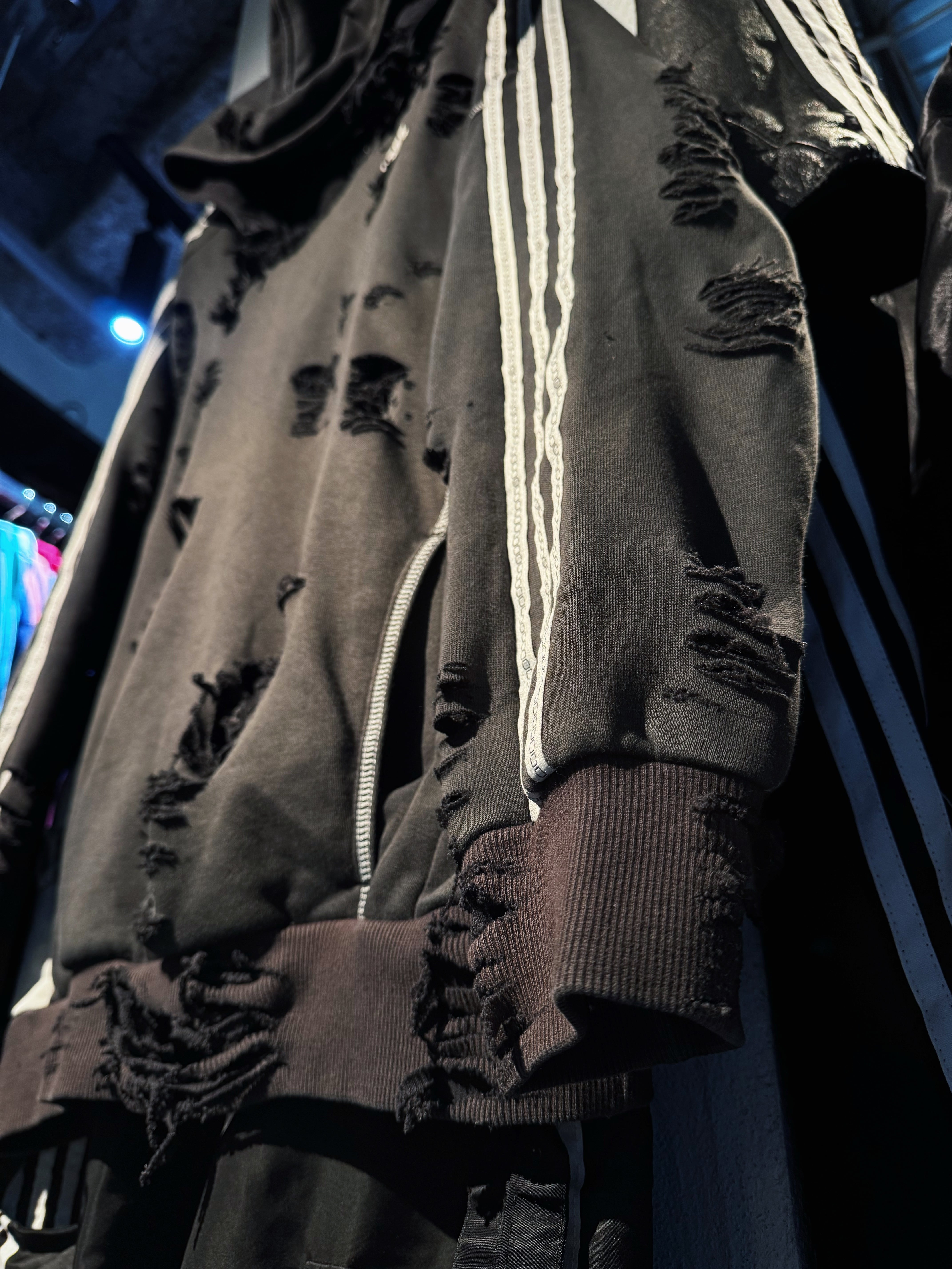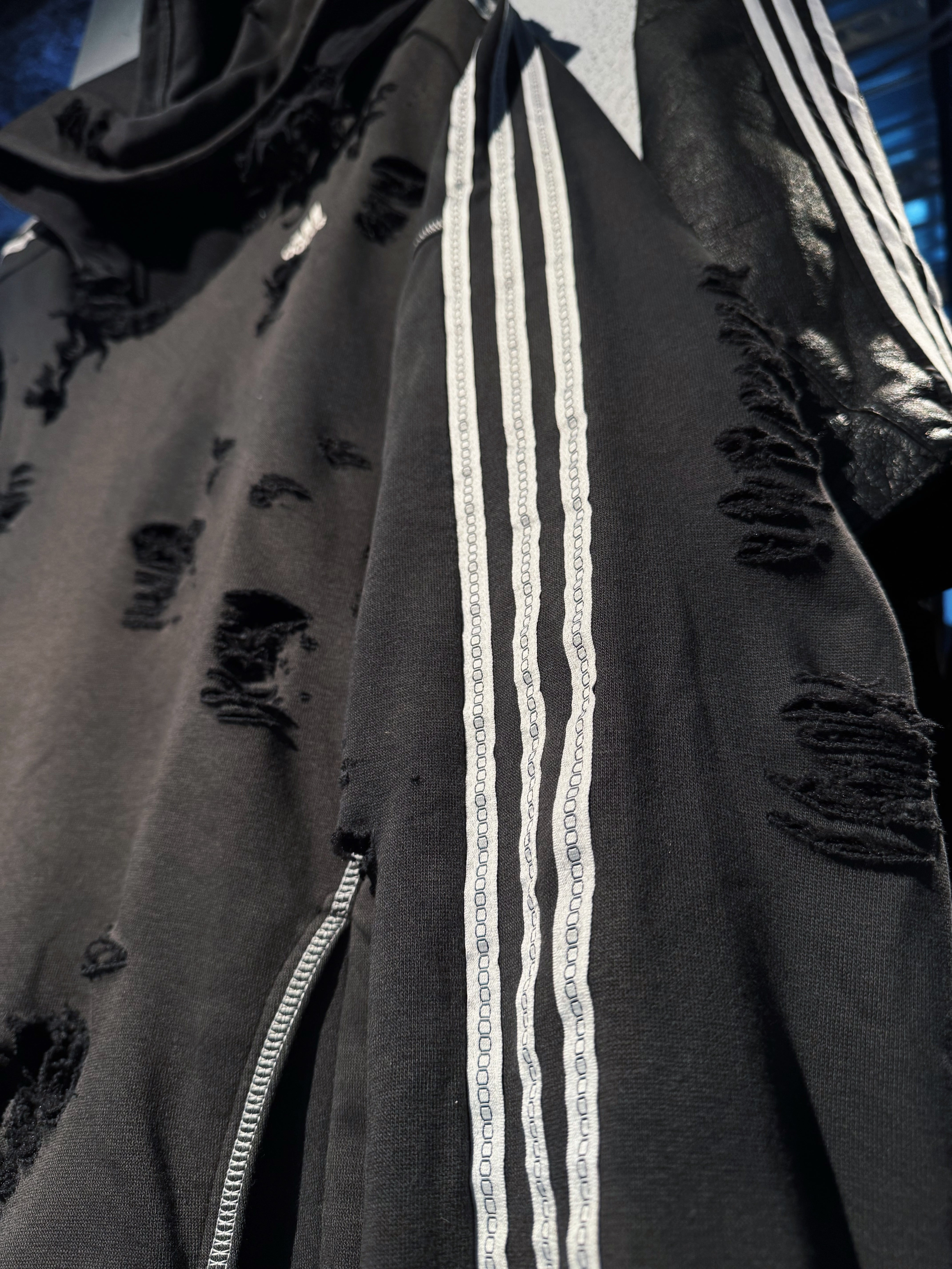 当店十八番のボロリメイクの中でもかなり人気の高い"ADIDAS"を贅沢にボロカスタムした一枚。”ADIDAS”の代名詞でもあるパフォーマンスロゴをフロントに、3ストライプスを袖に、重厚感のあるブラックカラーでボディも一級品。