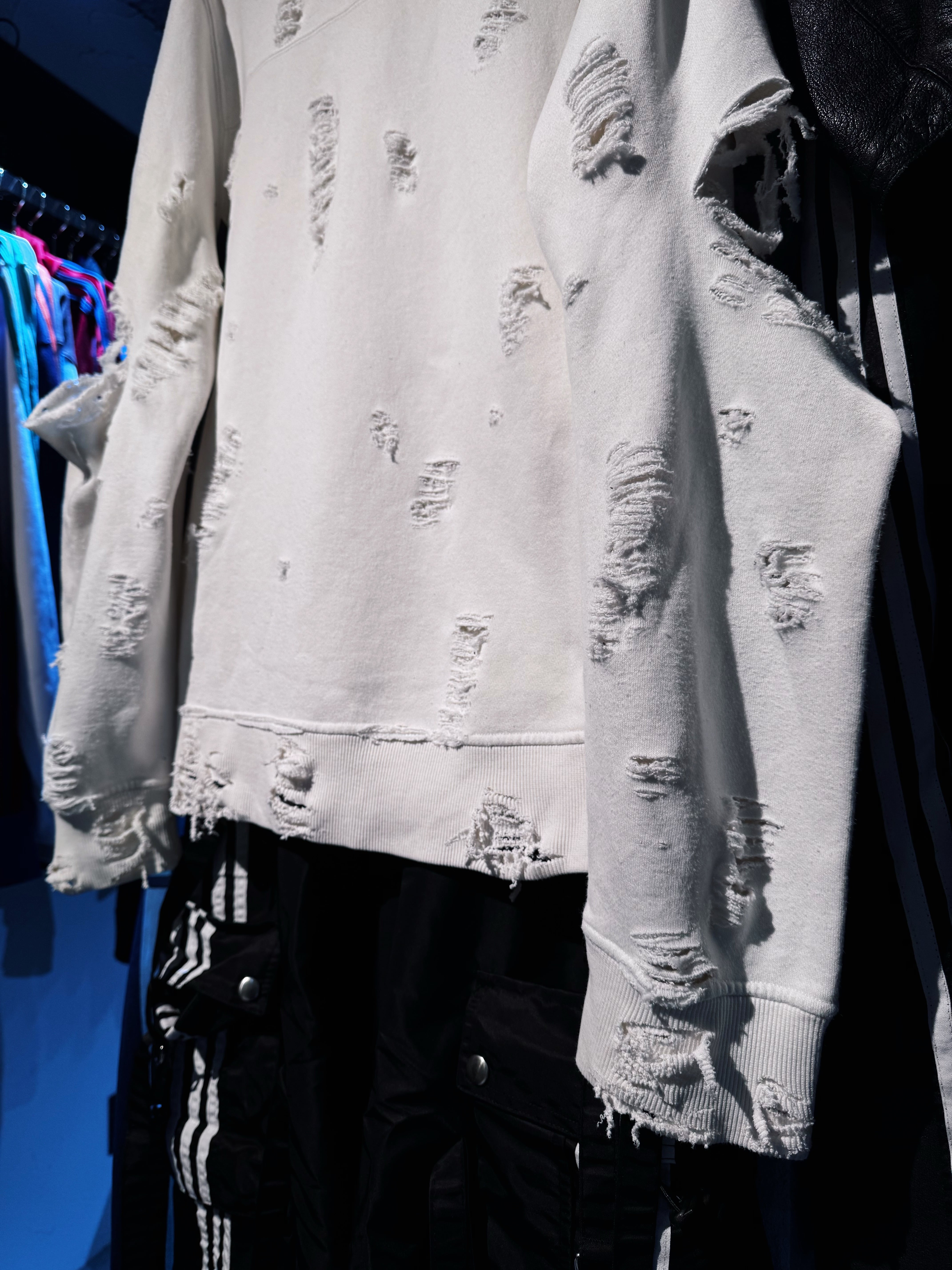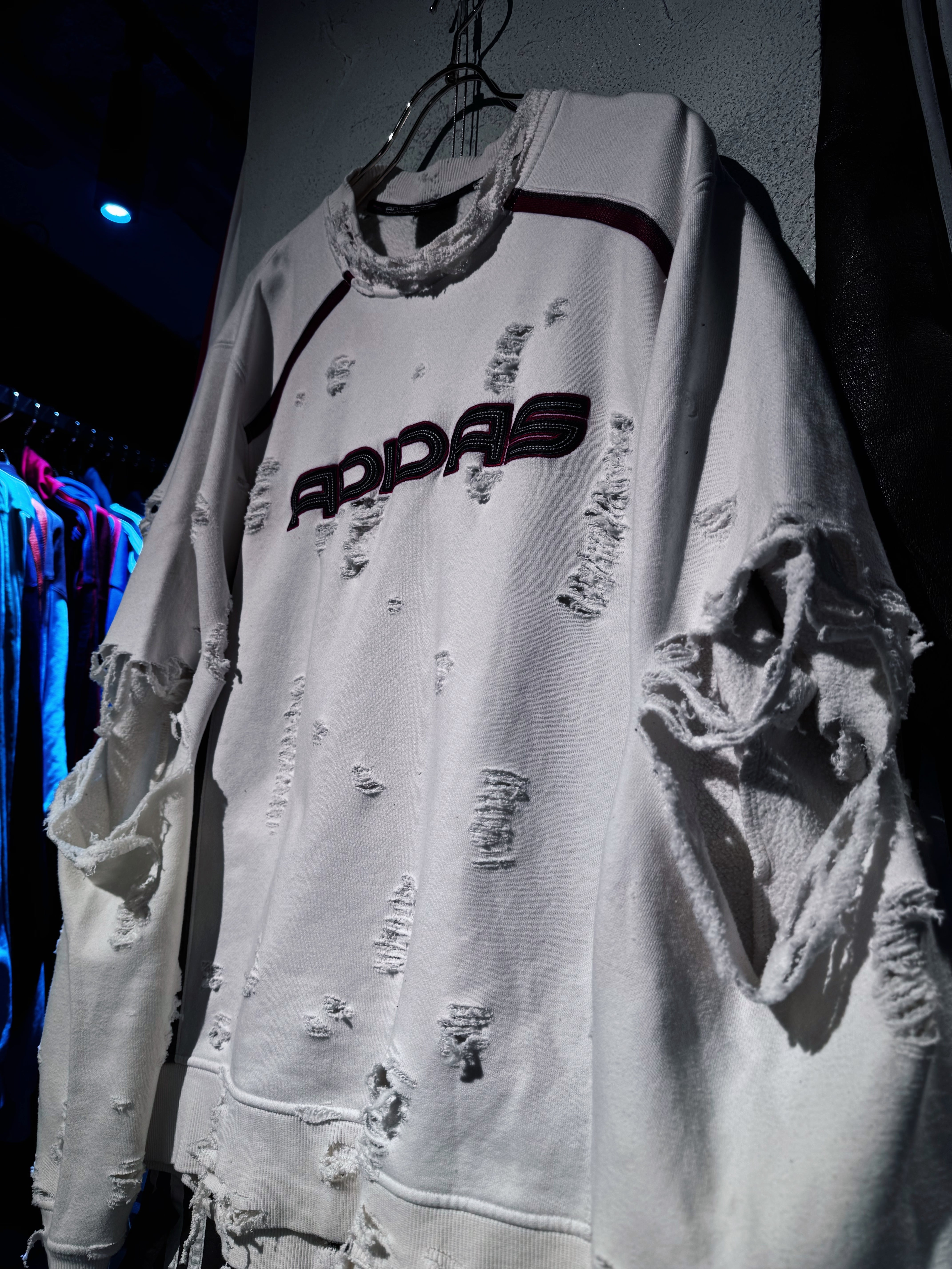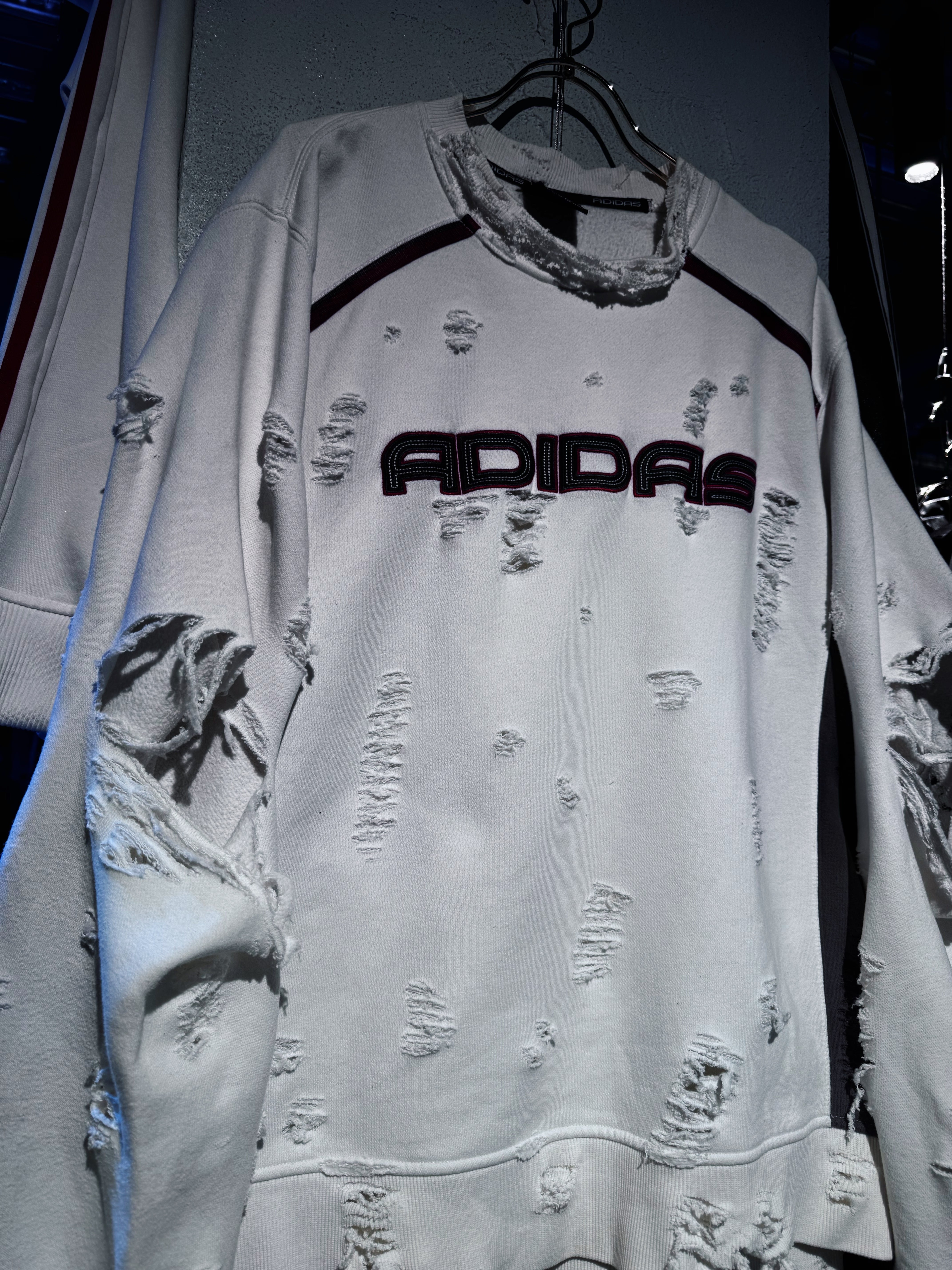 "ADIDAS"のボディを贅沢に採用したボロスウェット。デザイナーズブランドでもダメージアイテムが近年増えてきていますが、それに引けを取らない精密なダメージ技術は間違いなく一流。